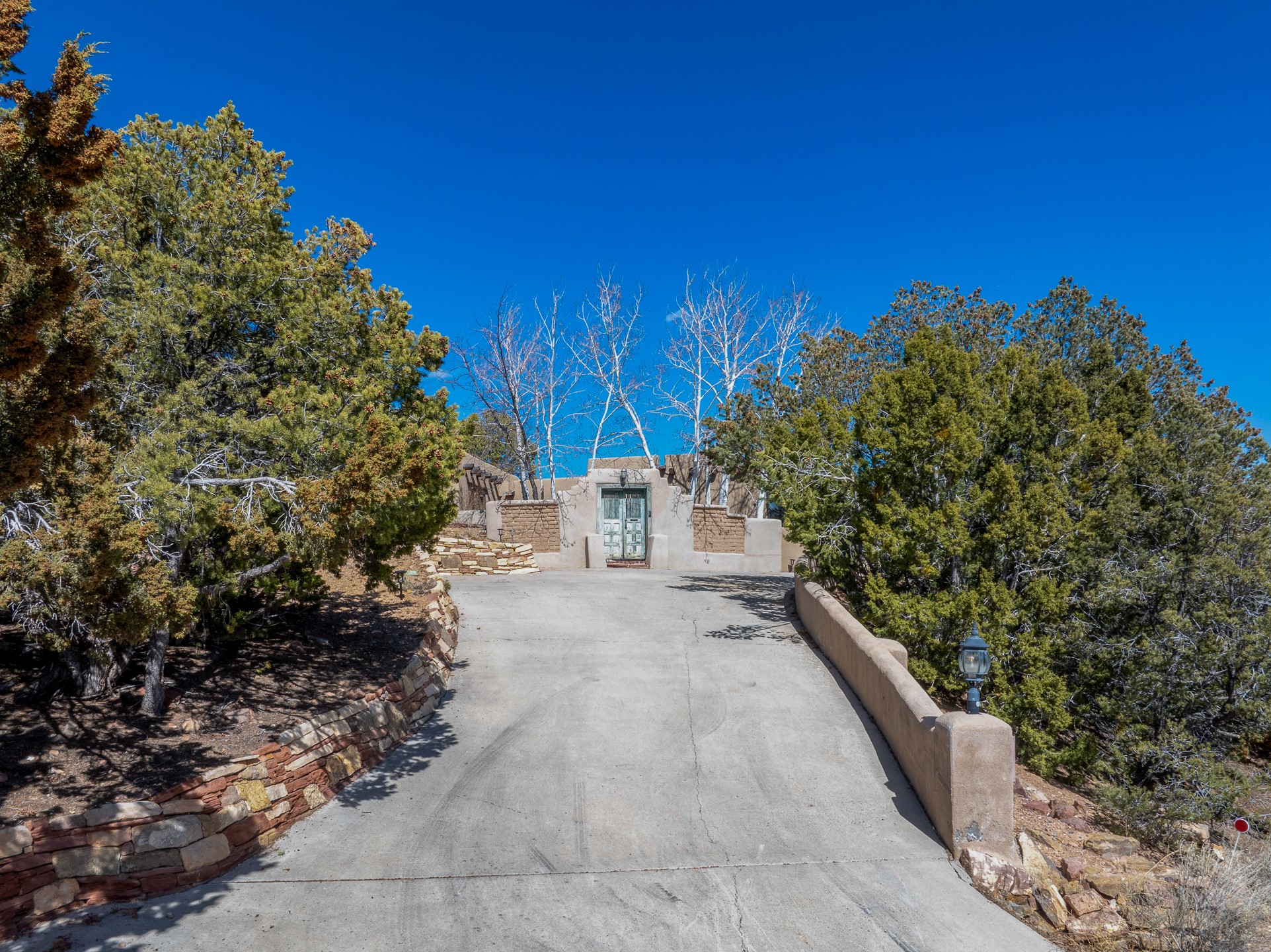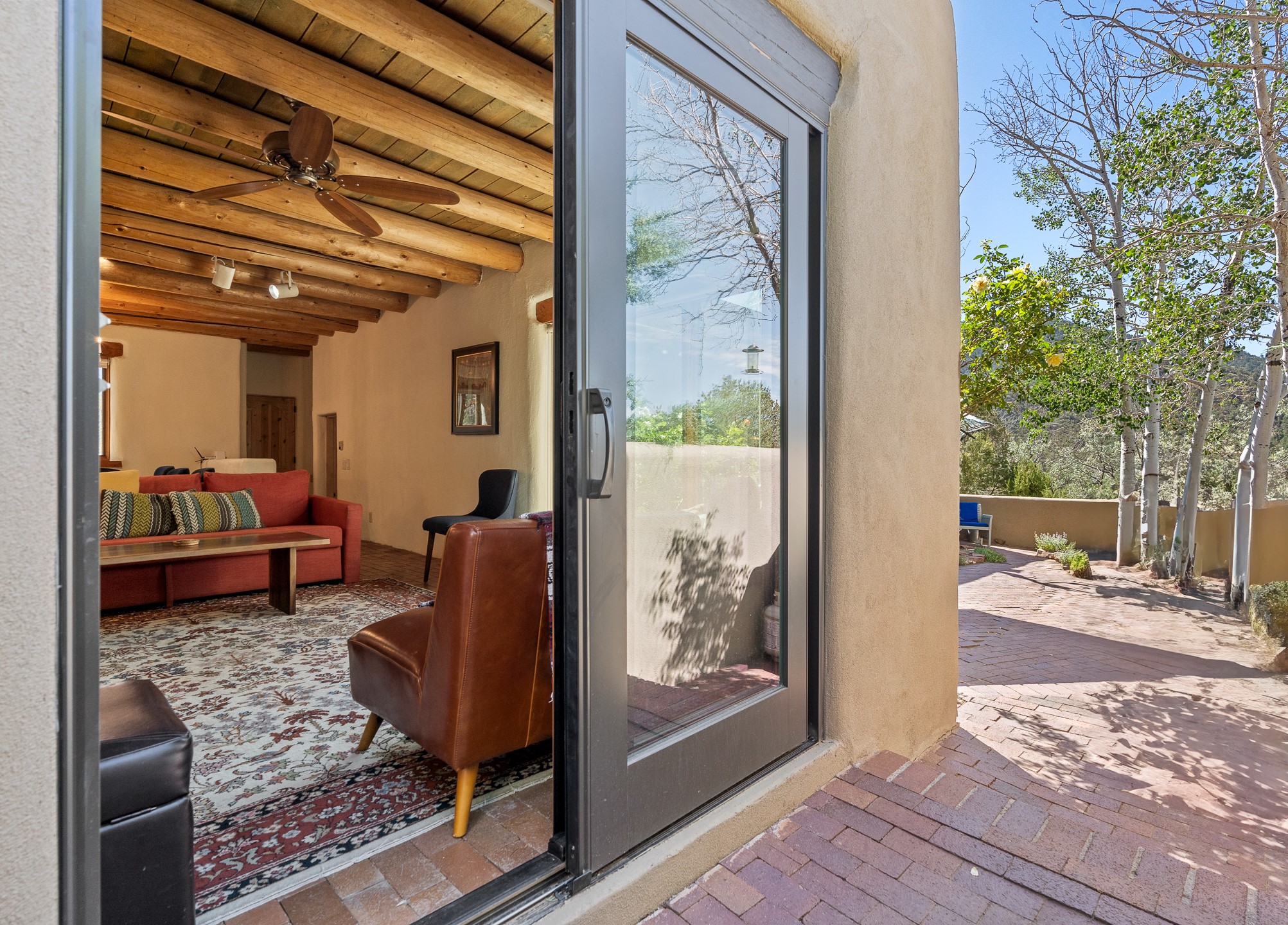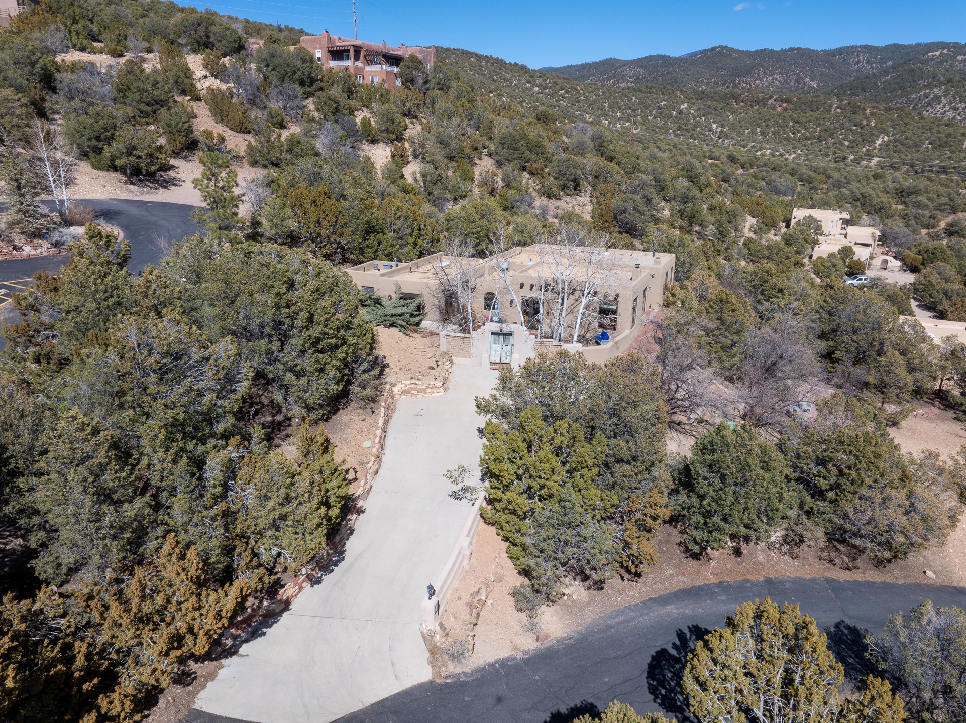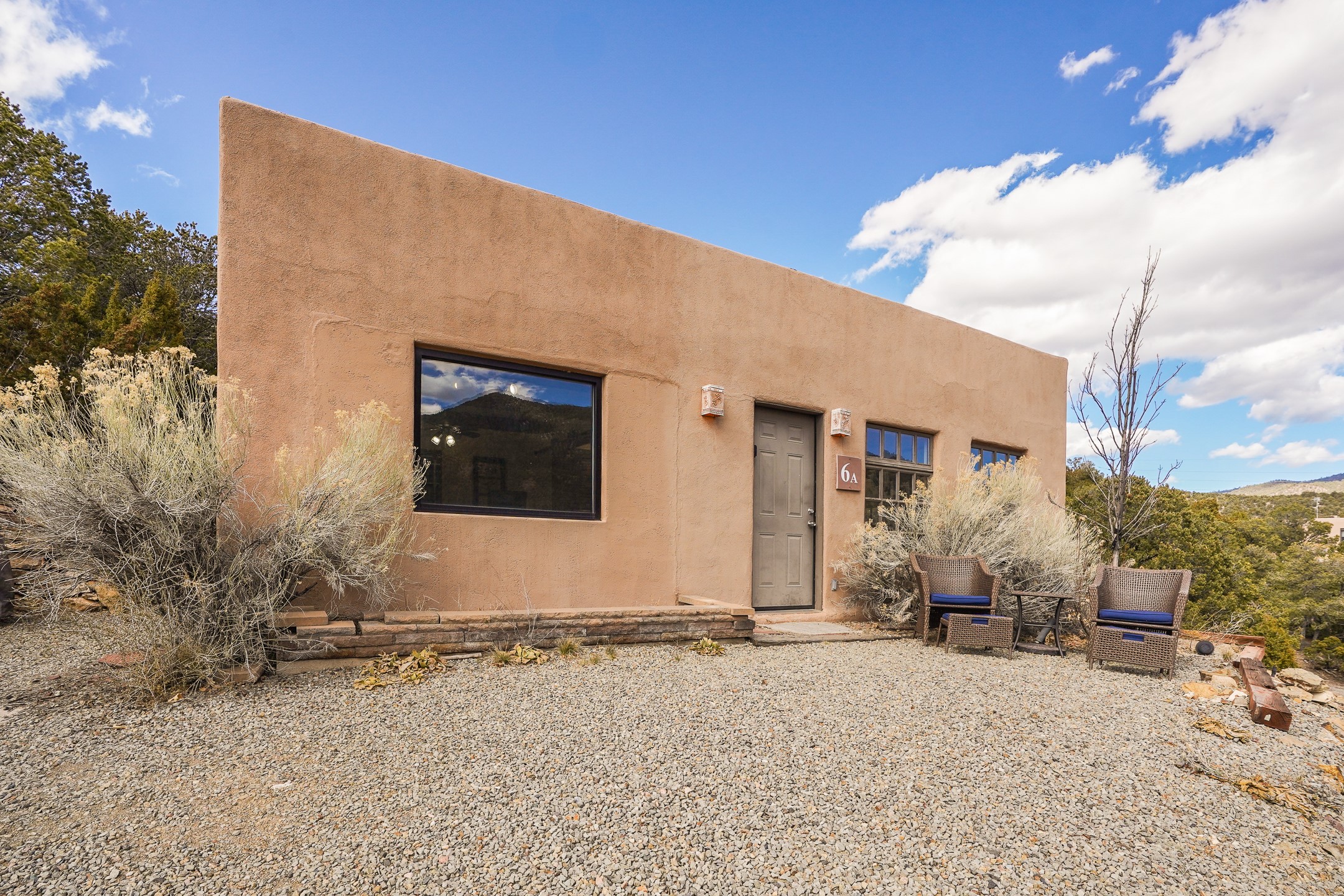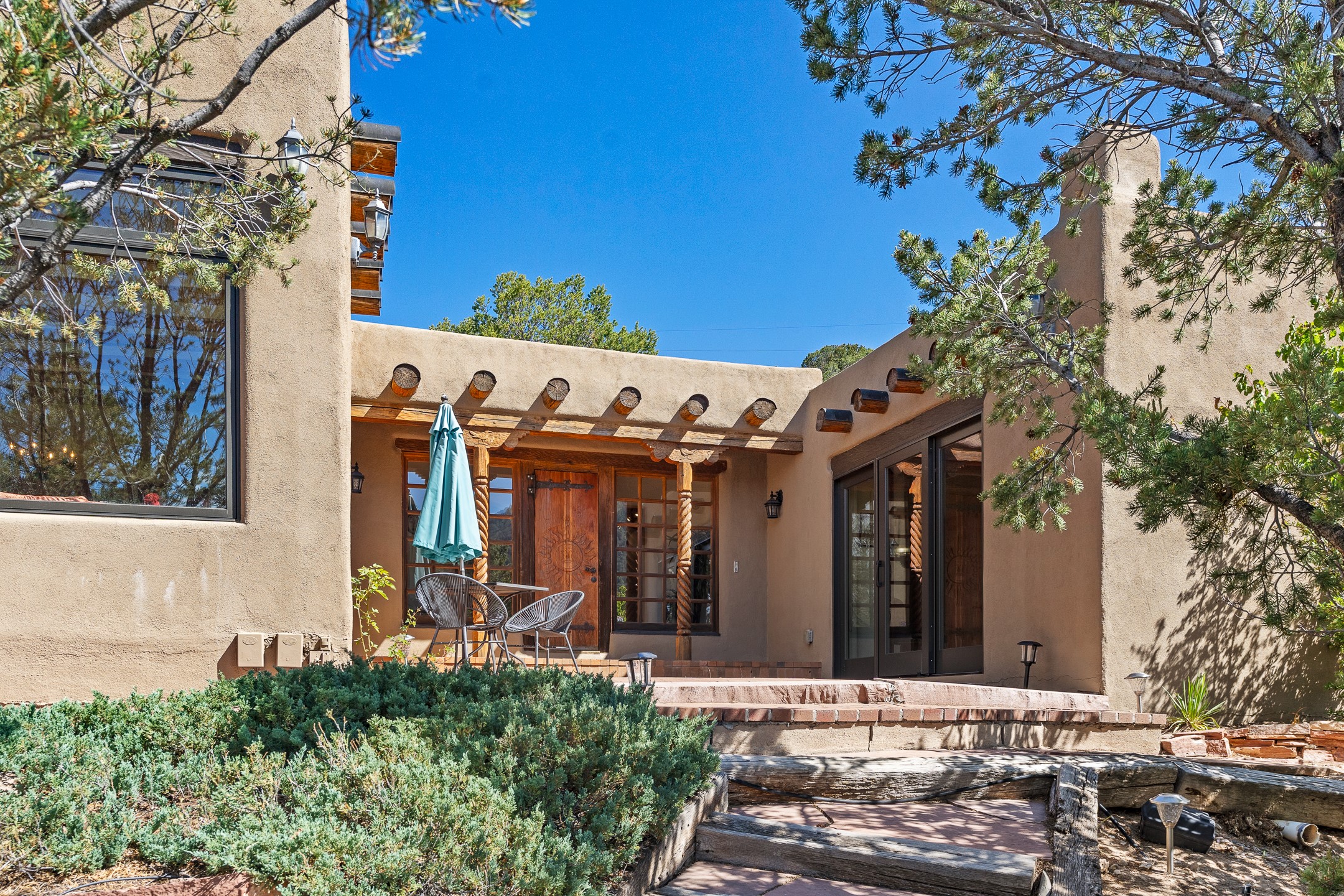 Nestled in the foothills of the Sangre de Cristos Mountains, this property offers a rareblend of serenity and convenience-just minutes from Santa Fe's historic Plaza. Set on over an acre ofbeautifully treed land, the walled courtyard welcomes you to the entry of this light filled 3 bedroom3 bath (2384 sq ft)home full of unique architectural details. The 1 bedroom 1 bath (768 sq ft) guest house is equipped with a full kitchen and mini split offering year round comfort. This property presents a rare chance to own close to town as well as many hiking/biking trails that are right out your front door. Its perfect for the active lifestyle.