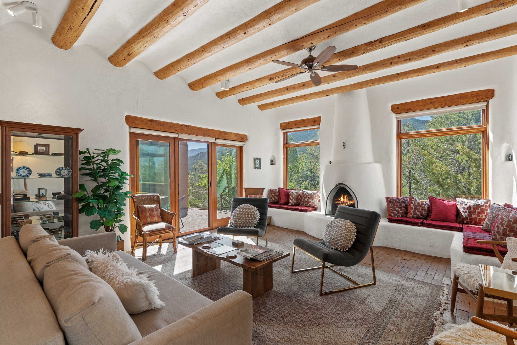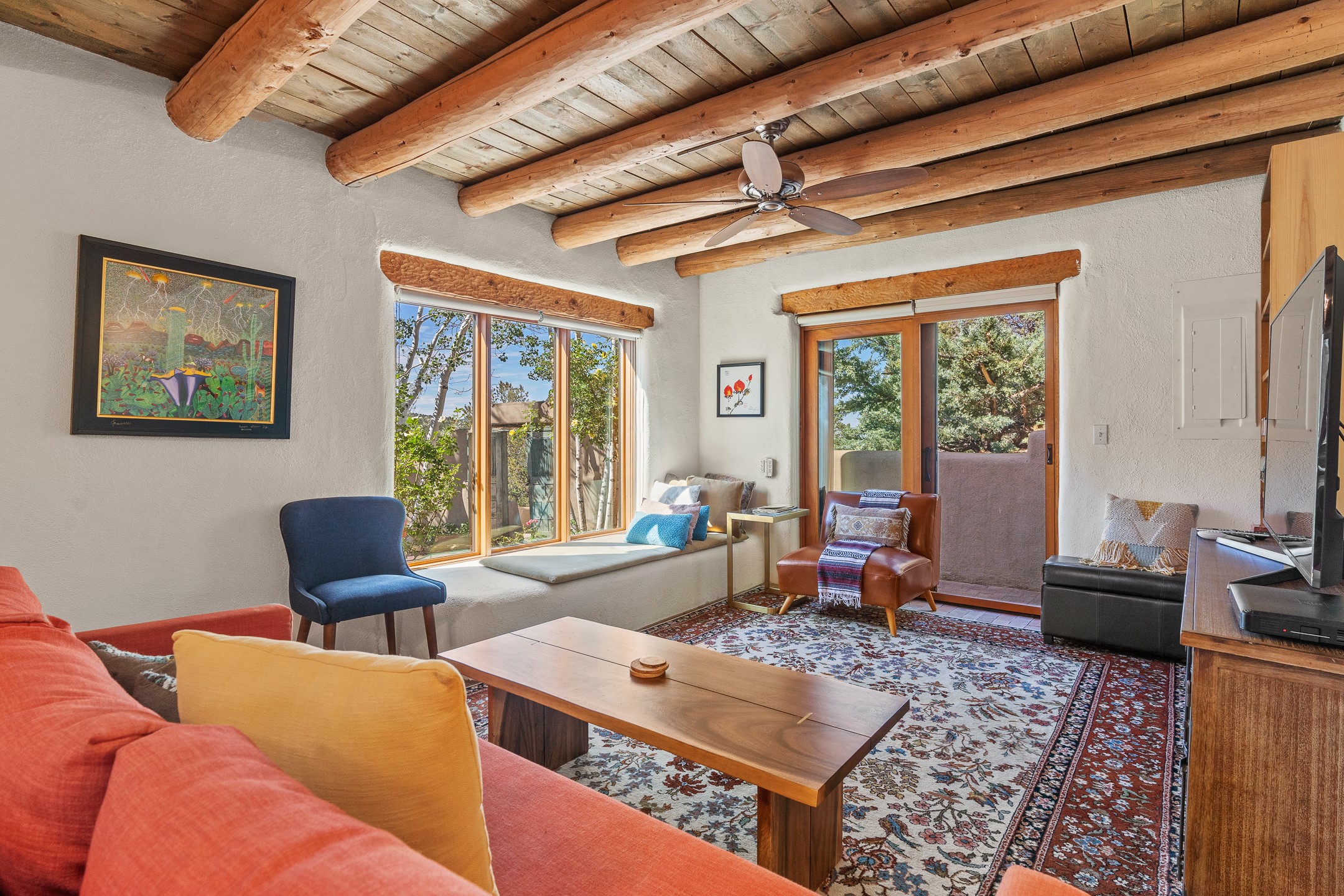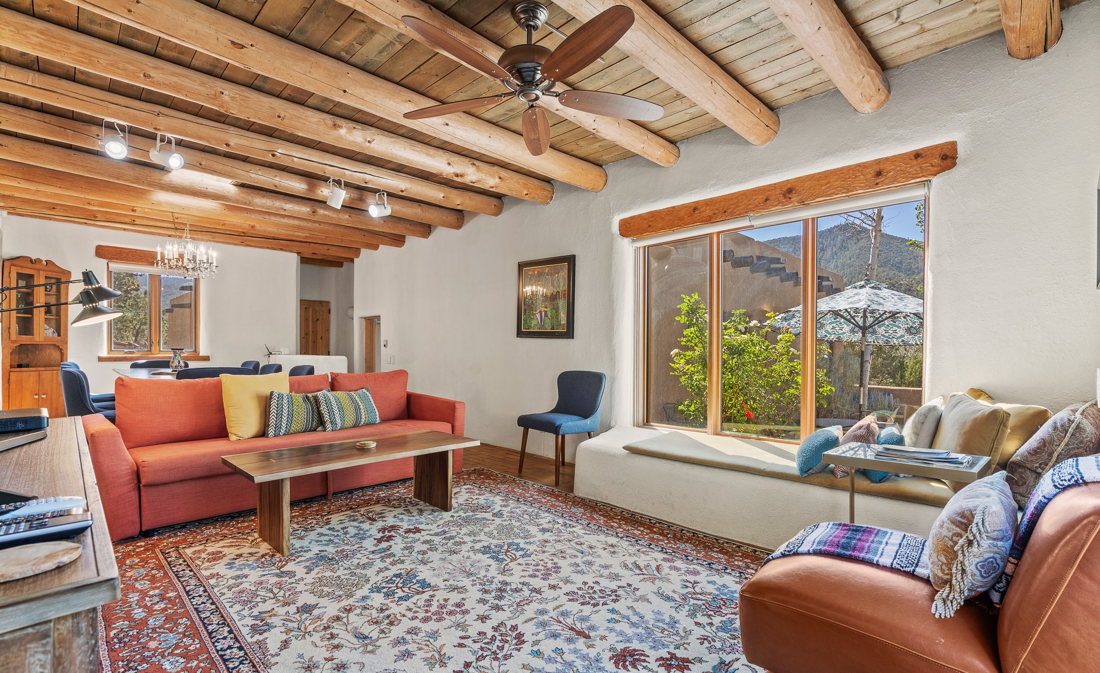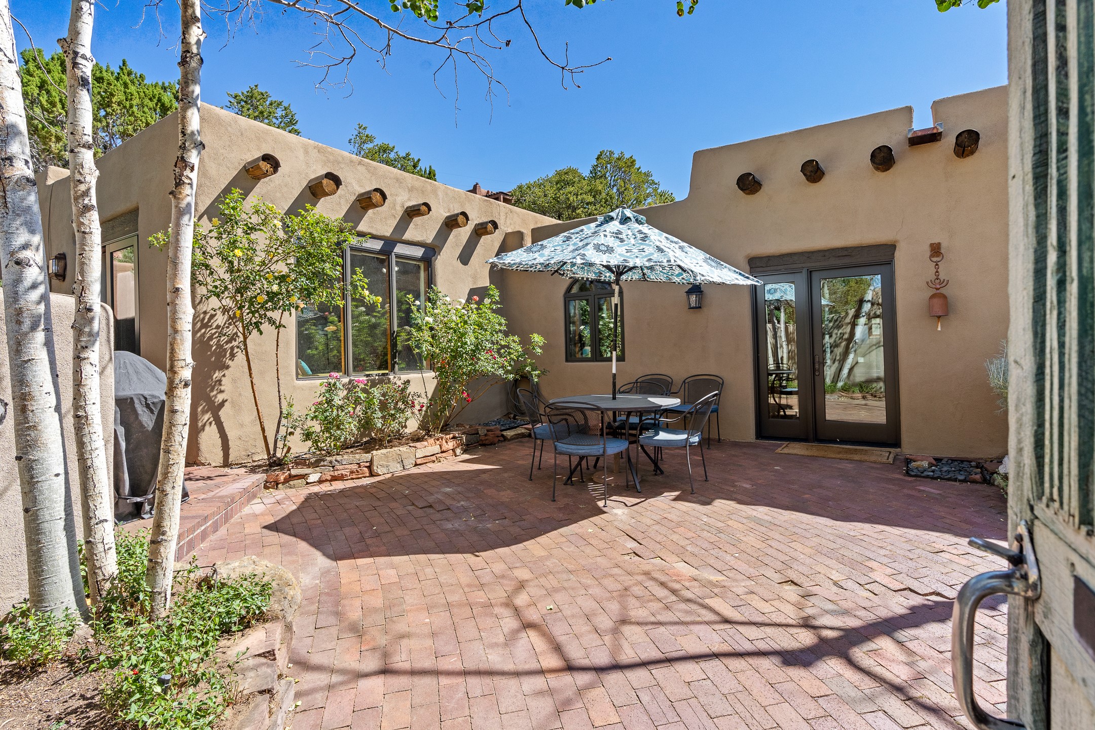Nestled in the foothills of the Sangre de Cristos Mountains, this property offers a rareblend of serenity and convenience-just minutes from Santa Fe's historic Plaza. Set on over an acre ofbeautifully treed land, the walled courtyard welcomes you to the entry of this light filled 3 bedroom3 bath (2384 sq ft)home full of unique architectural details. The 1 bedroom 1 bath (768 sq ft) guest house is equipped with a full kitchen and mini split offering year round comfort. This property presents a rare chance to own close to town as well as many hiking/biking trails that are right out your front door. Its perfect for the active lifestyle.