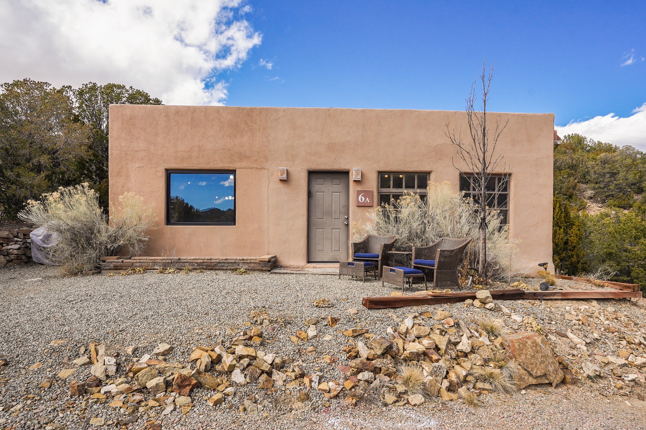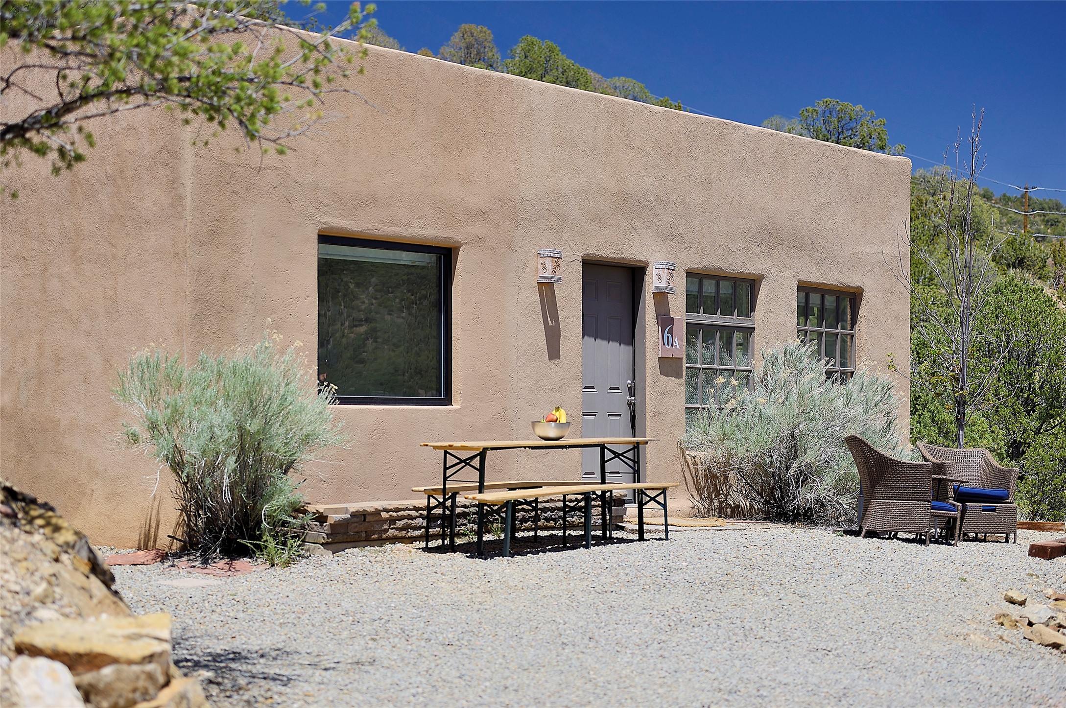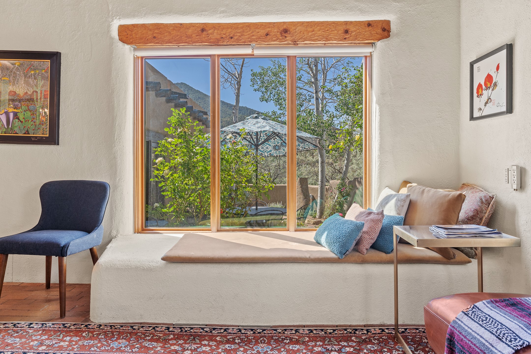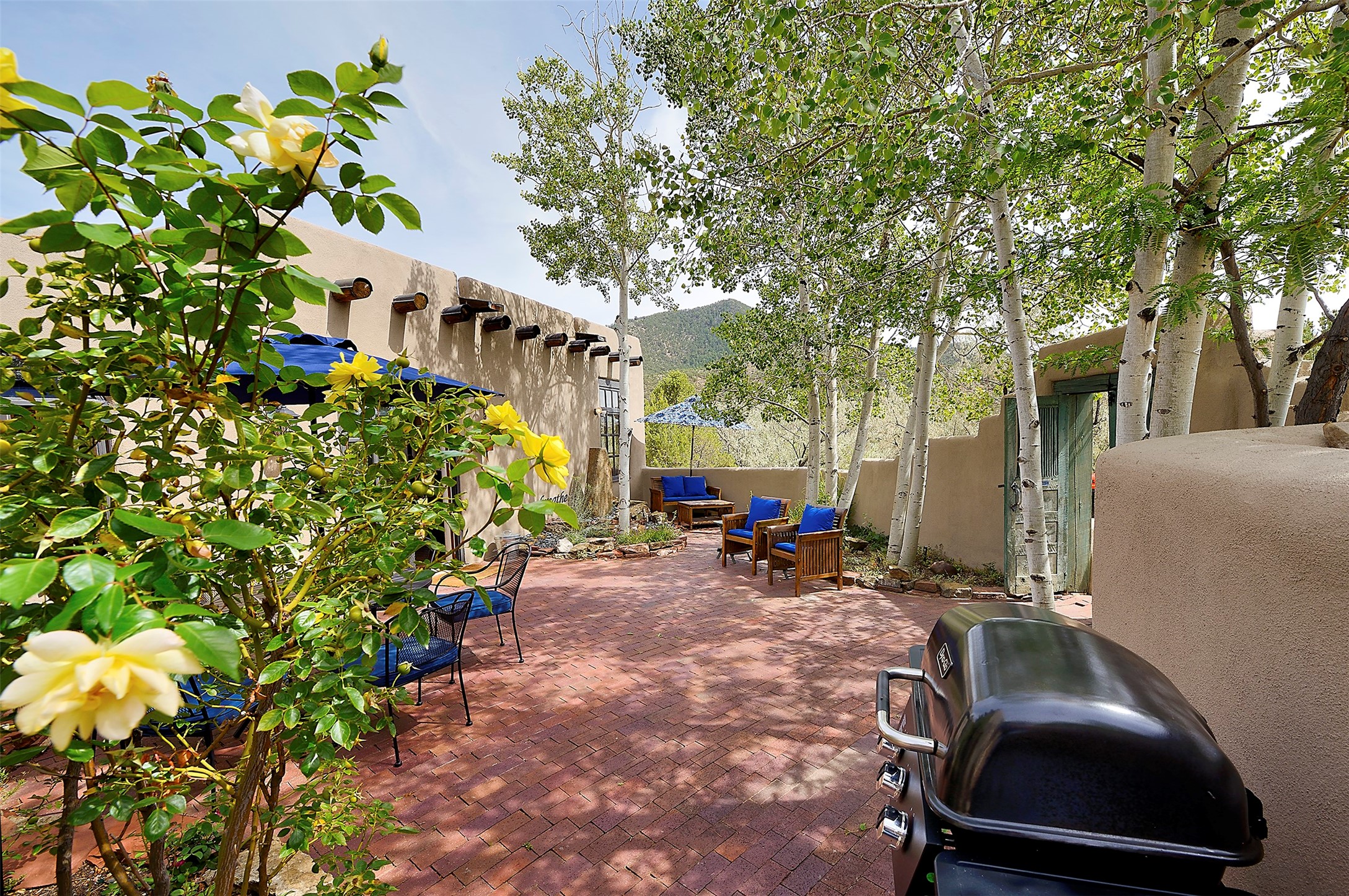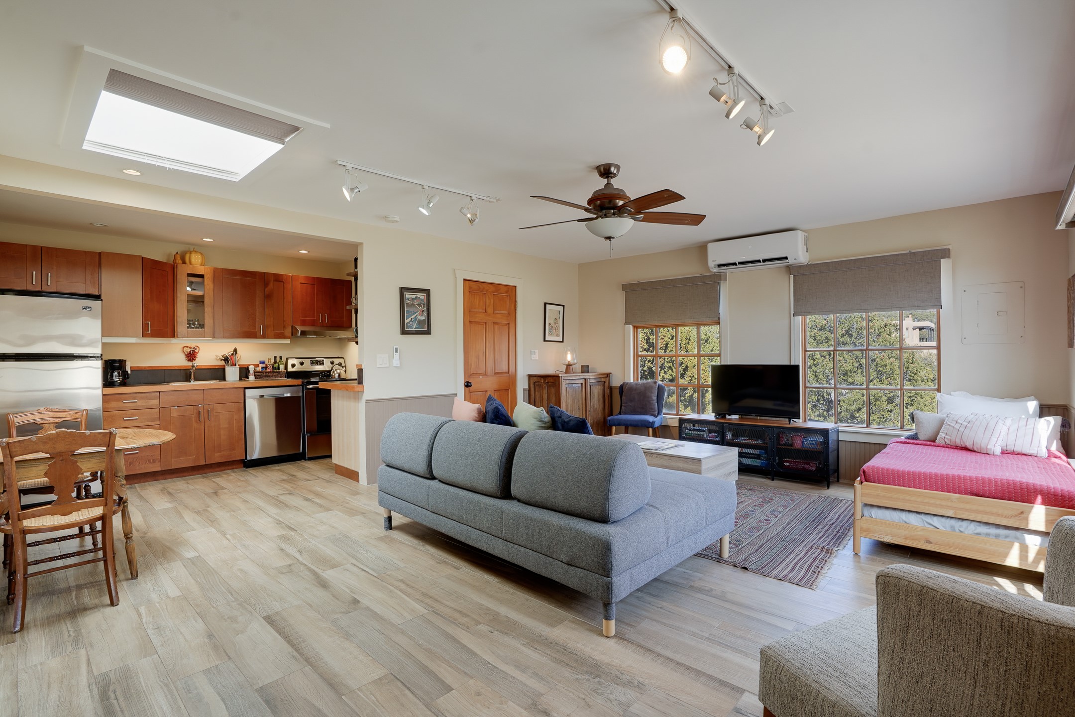 Nestled in the foothills of the Sangre de Cristos Mountains, this property offers a rareblend of serenity and convenience-just minutes from Santa Fe's historic Plaza. Set on over an acre ofbeautifully treed land, the walled courtyard welcomes you to the entry of this light filled 3 bedroom3 bath (2384 sq ft)home full of unique architectural details. The 1 bedroom 1 bath (768 sq ft) guest house is equipped with a full kitchen and mini split offering year round comfort. This property presents a rare chance to own close to town as well as many hiking/biking trails that are right out your front door. Its perfect for the active lifestyle.