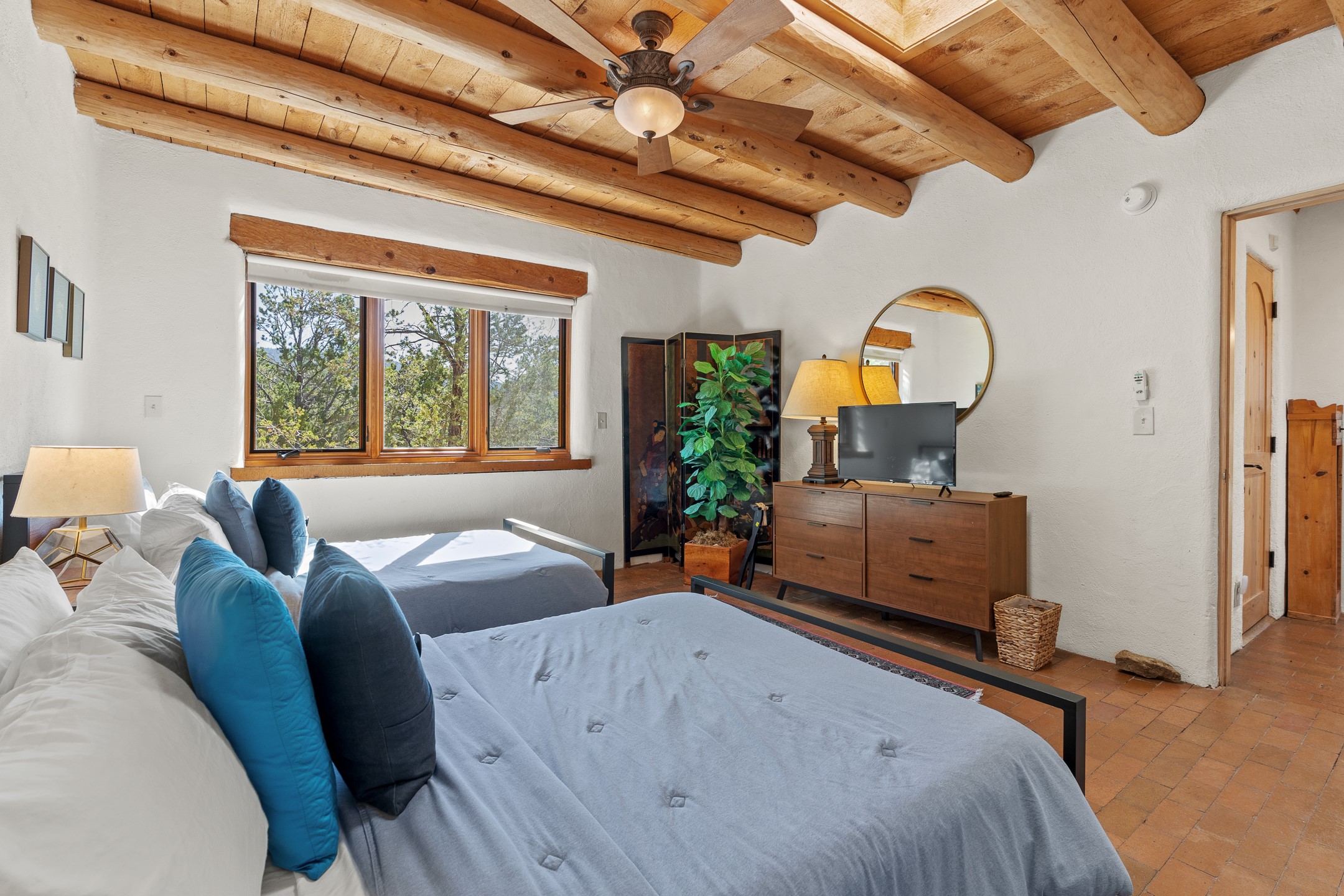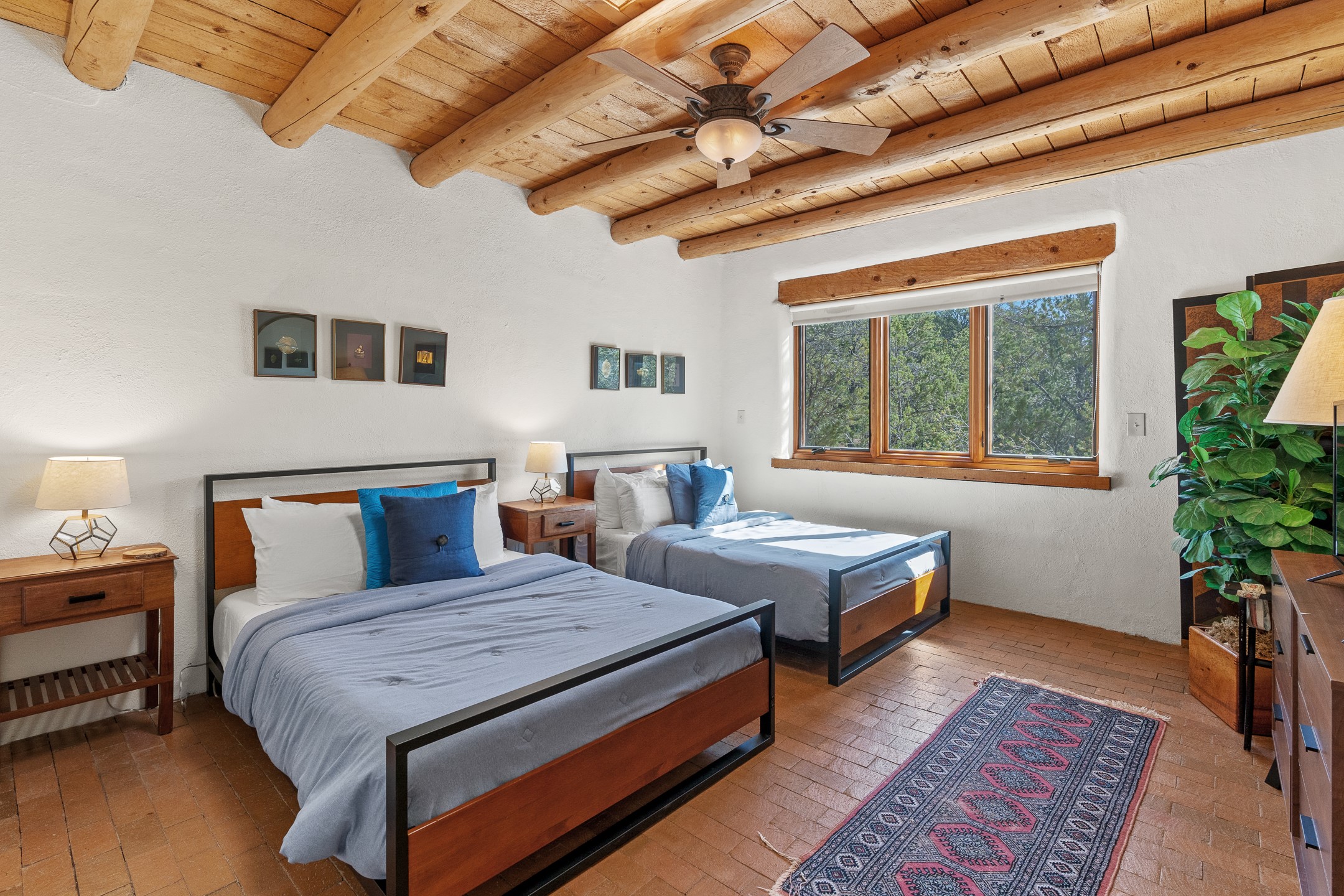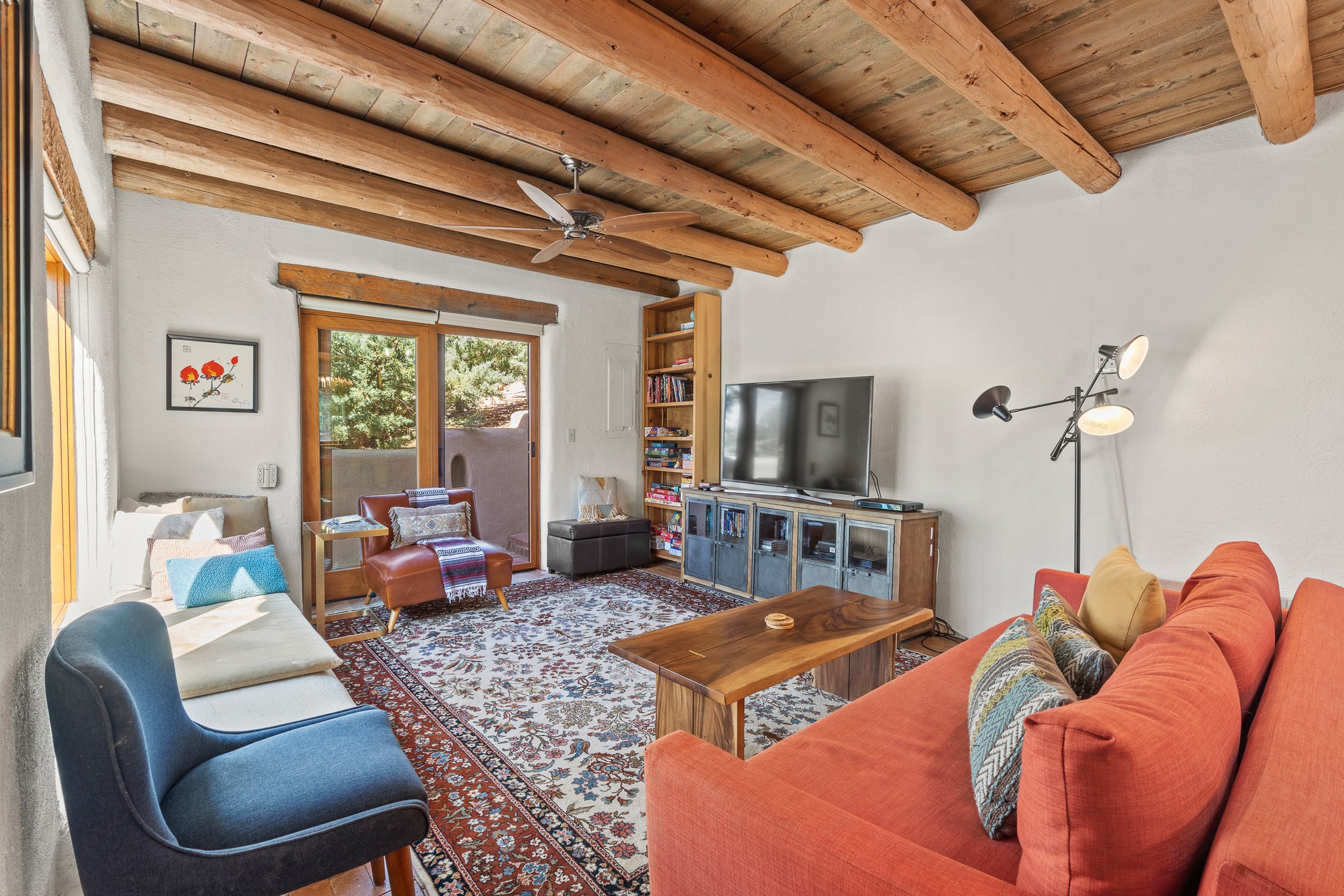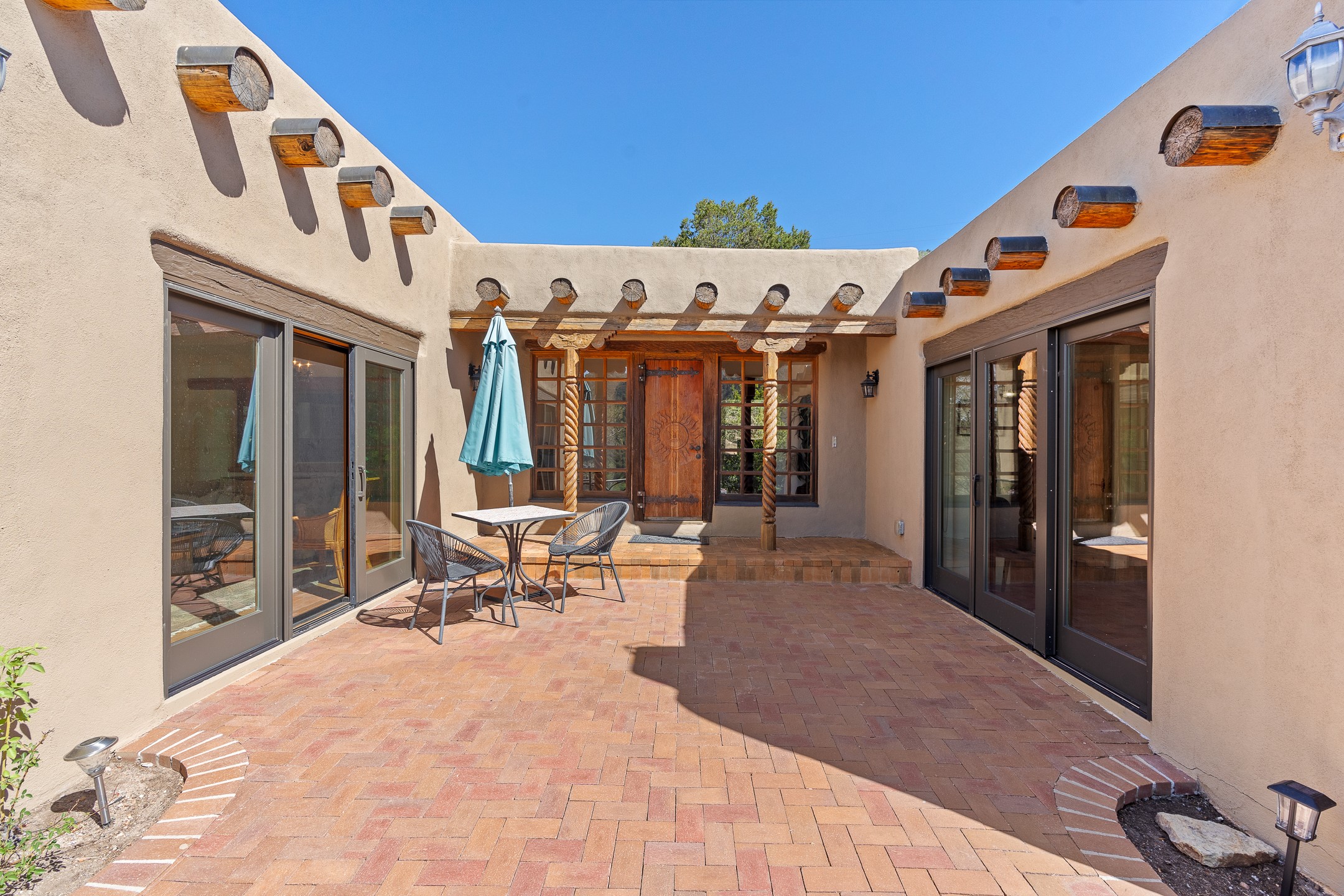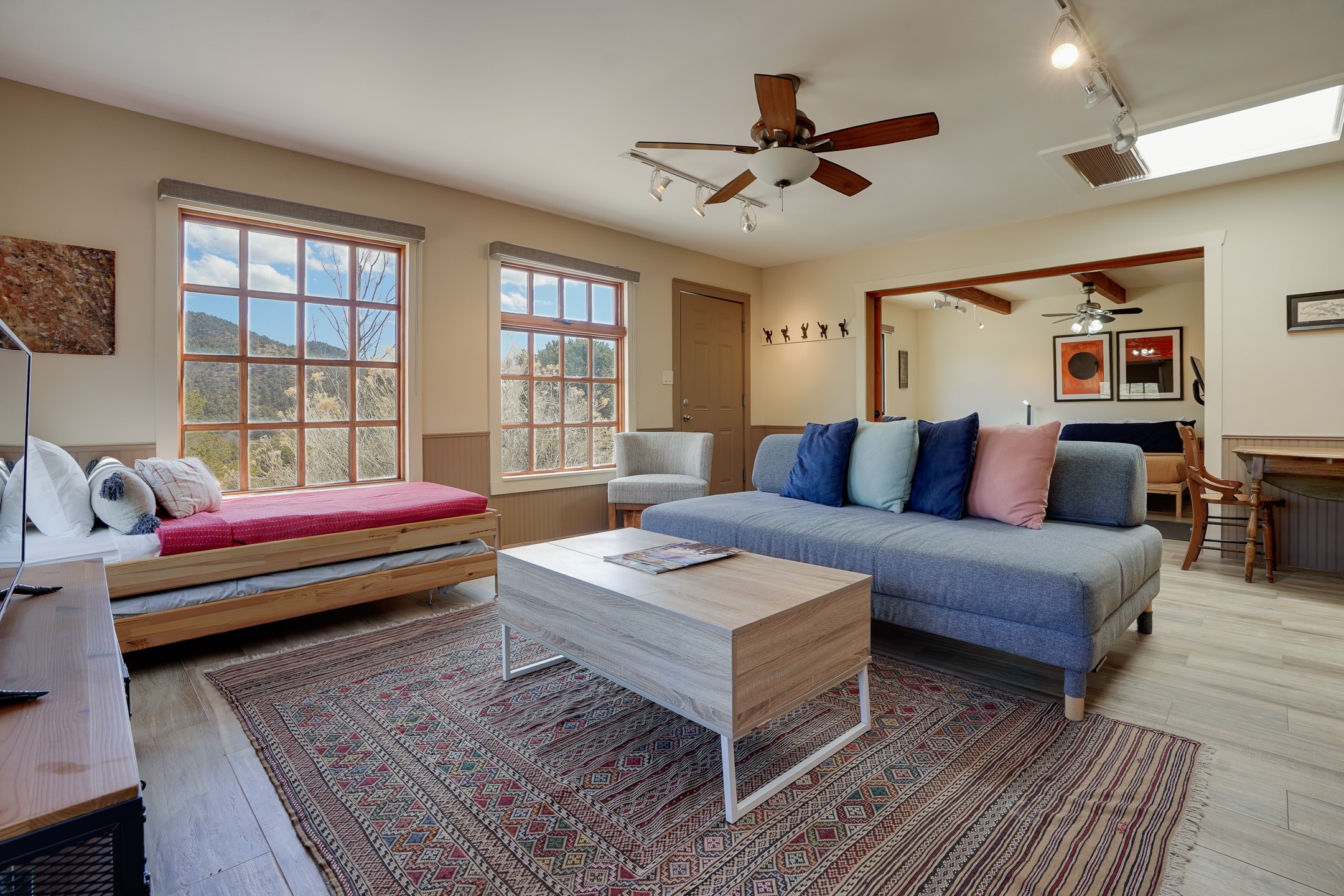 Nestled in the foothills of the Sangre de Cristos Mountains, this property offers a rareblend of serenity and convenience-just minutes from Santa Fe's historic Plaza. Set on over an acre ofbeautifully treed land, the walled courtyard welcomes you to the entry of this light filled 3 bedroom3 bath (2384 sq ft)home full of unique architectural details. The 1 bedroom 1 bath (768 sq ft) guest house is equipped with a full kitchen and mini split offering year round comfort. This property presents a rare chance to own close to town as well as many hiking/biking trails that are right out your front door. Its perfect for the active lifestyle.