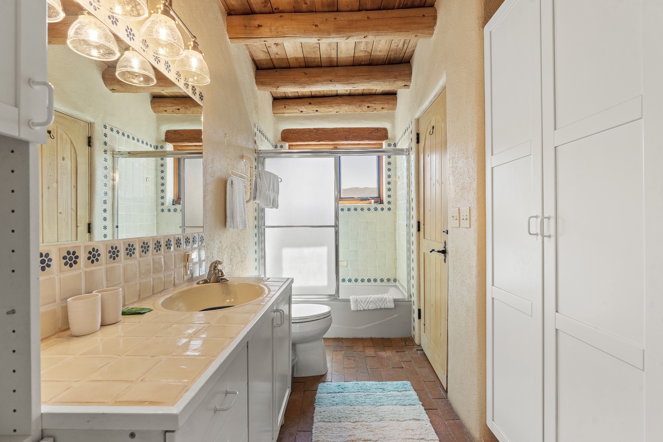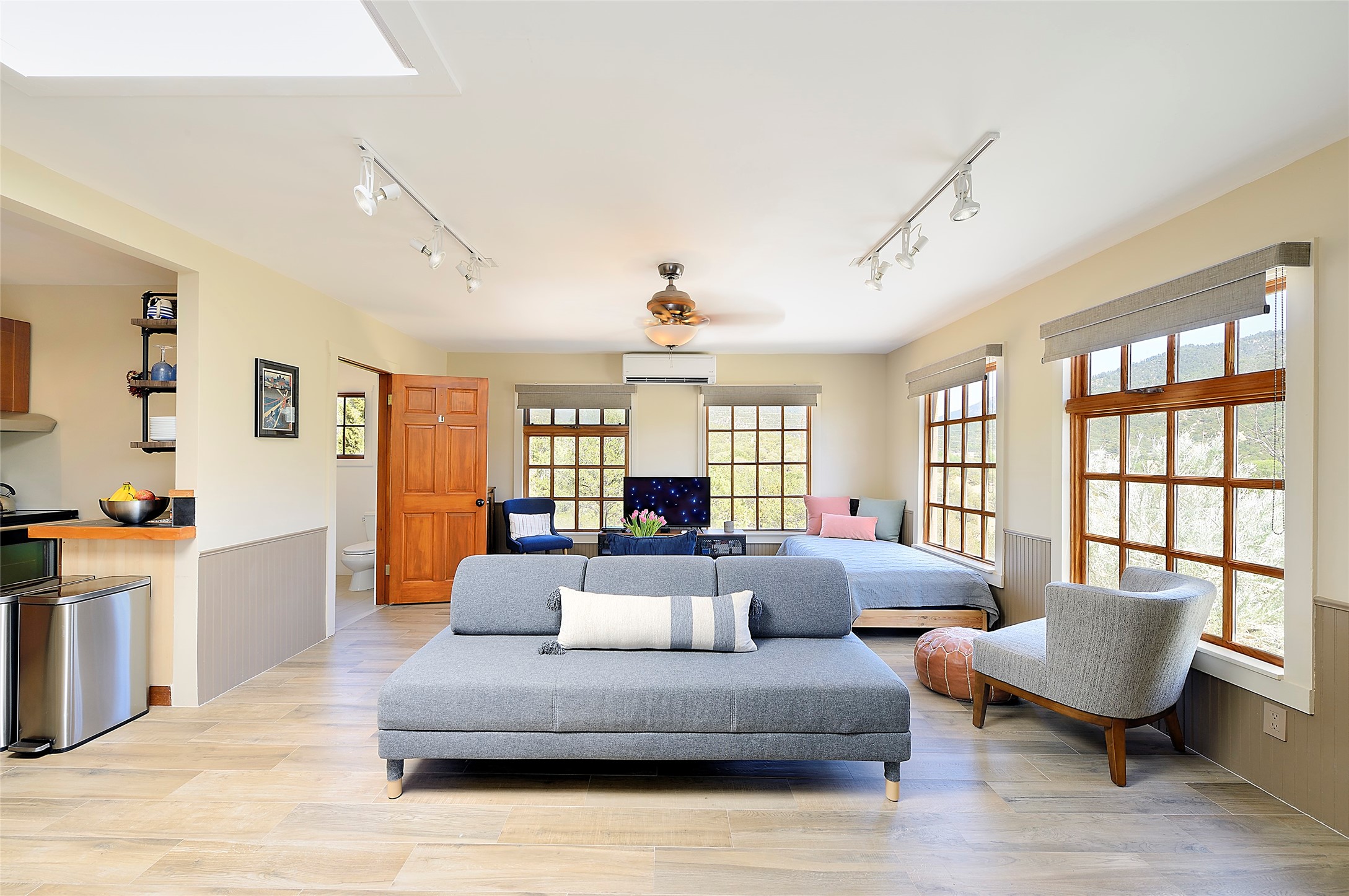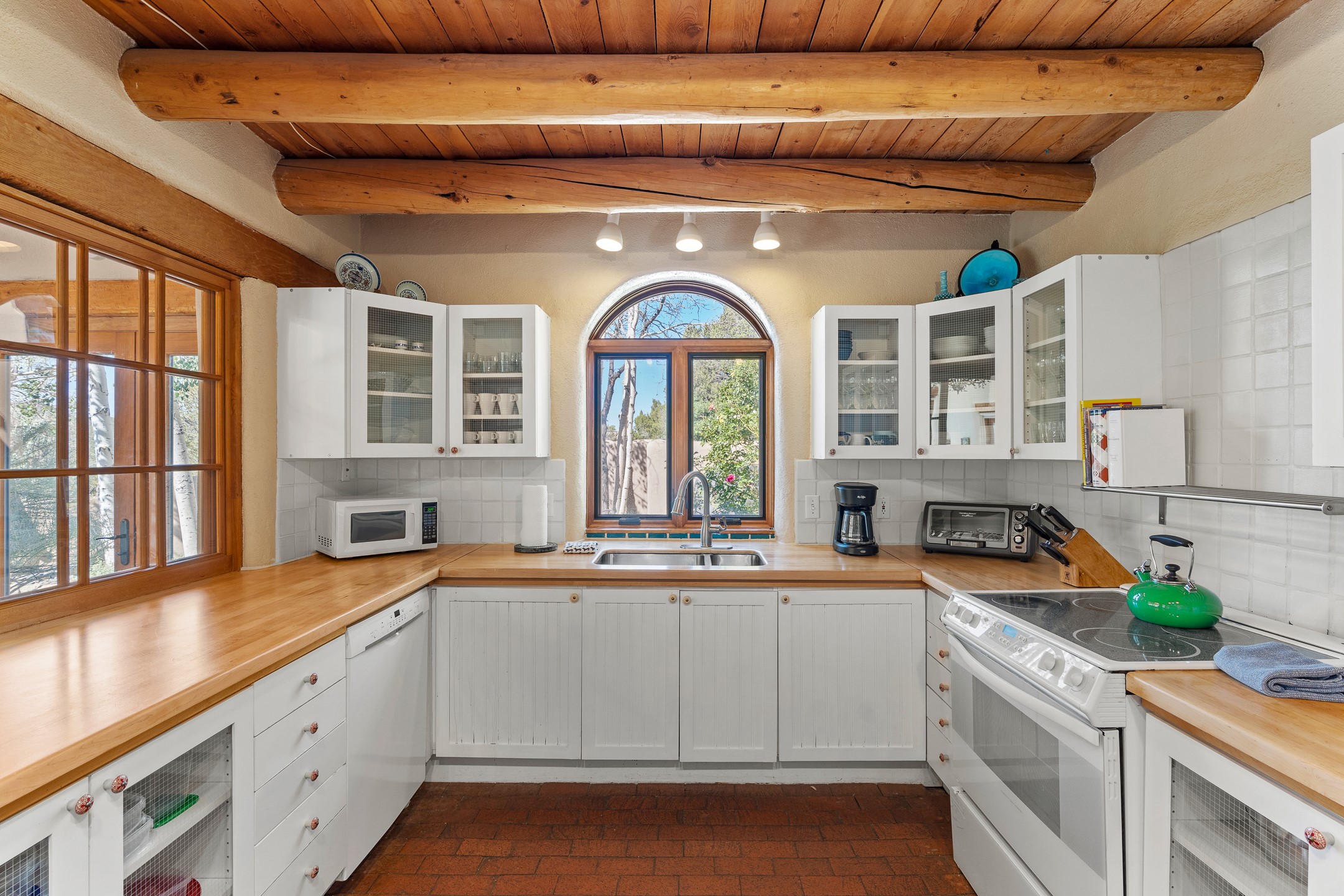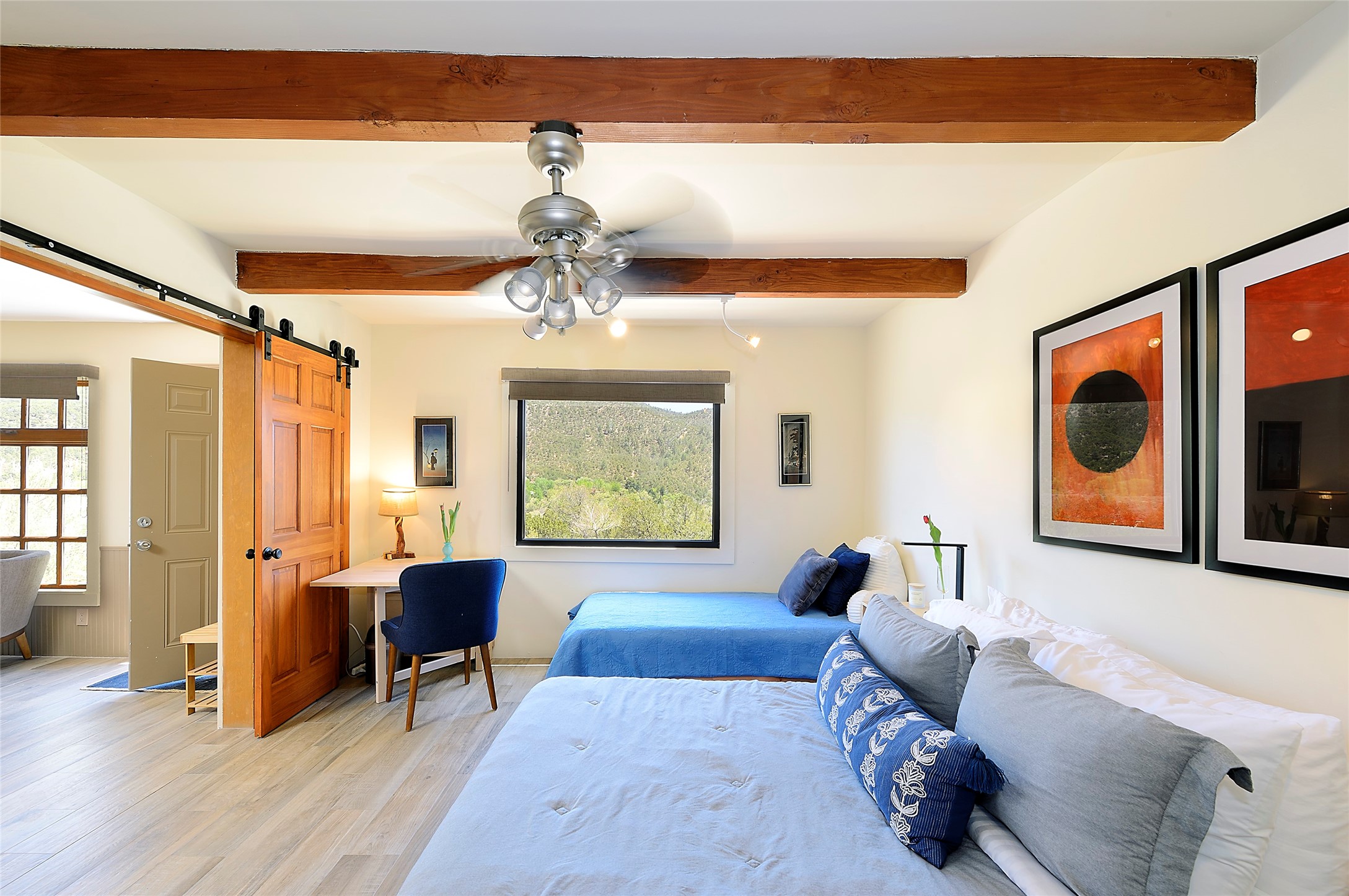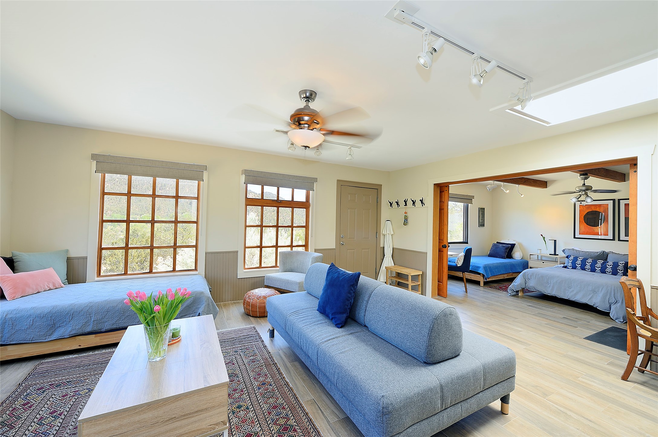 Nestled in the foothills of the Sangre de Cristos Mountains, this property offers a rareblend of serenity and convenience-just minutes from Santa Fe's historic Plaza. Set on over an acre ofbeautifully treed land, the walled courtyard welcomes you to the entry of this light filled 3 bedroom3 bath (2384 sq ft)home full of unique architectural details. The 1 bedroom 1 bath (768 sq ft) guest house is equipped with a full kitchen and mini split offering year round comfort. This property presents a rare chance to own close to town as well as many hiking/biking trails that are right out your front door. Its perfect for the active lifestyle.