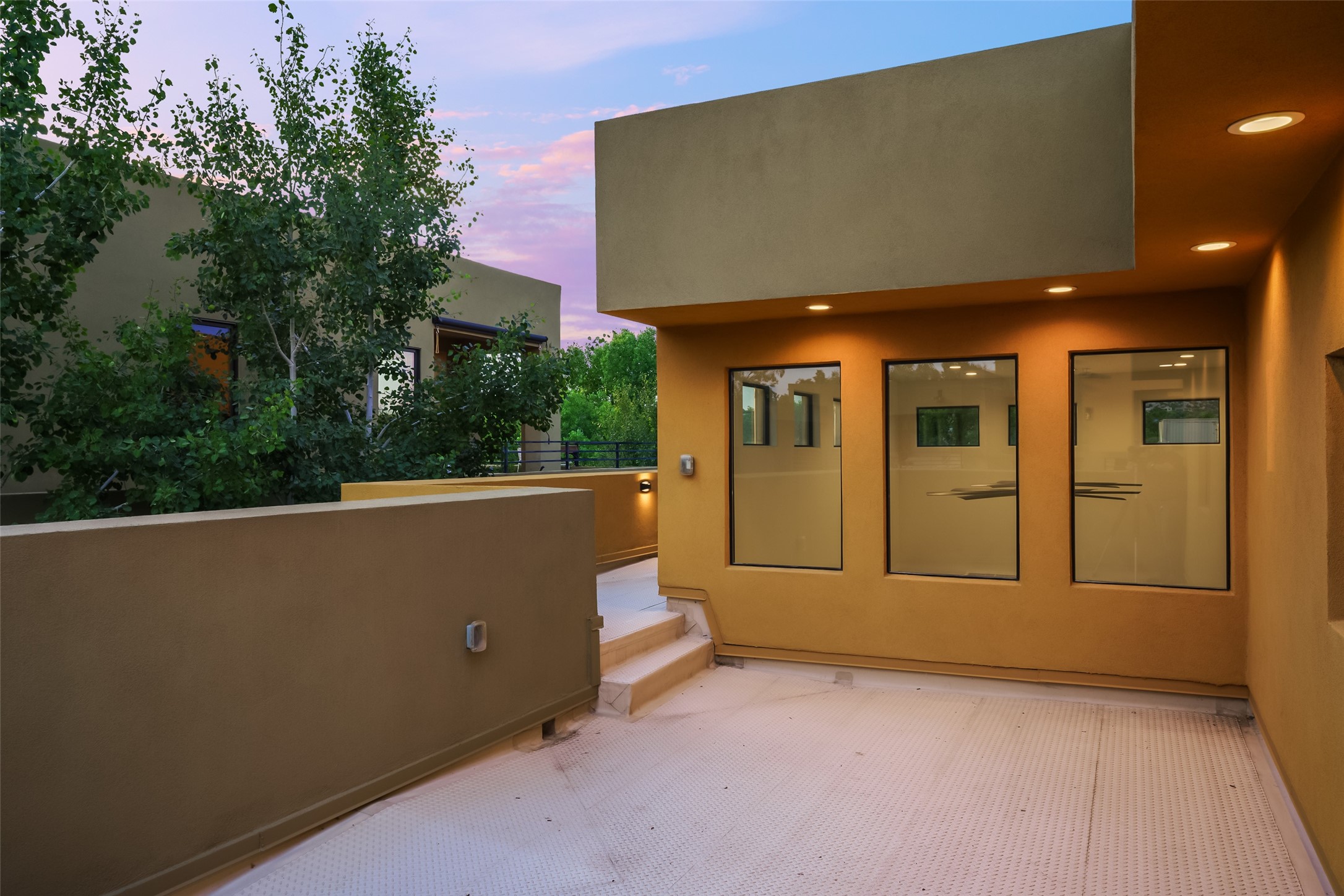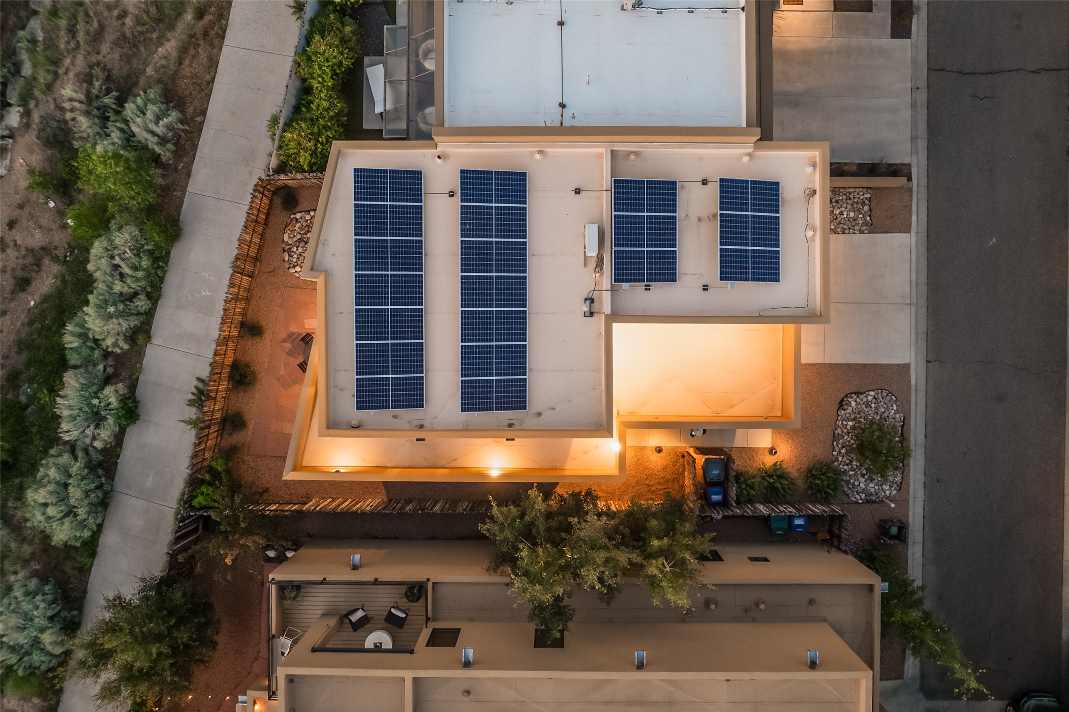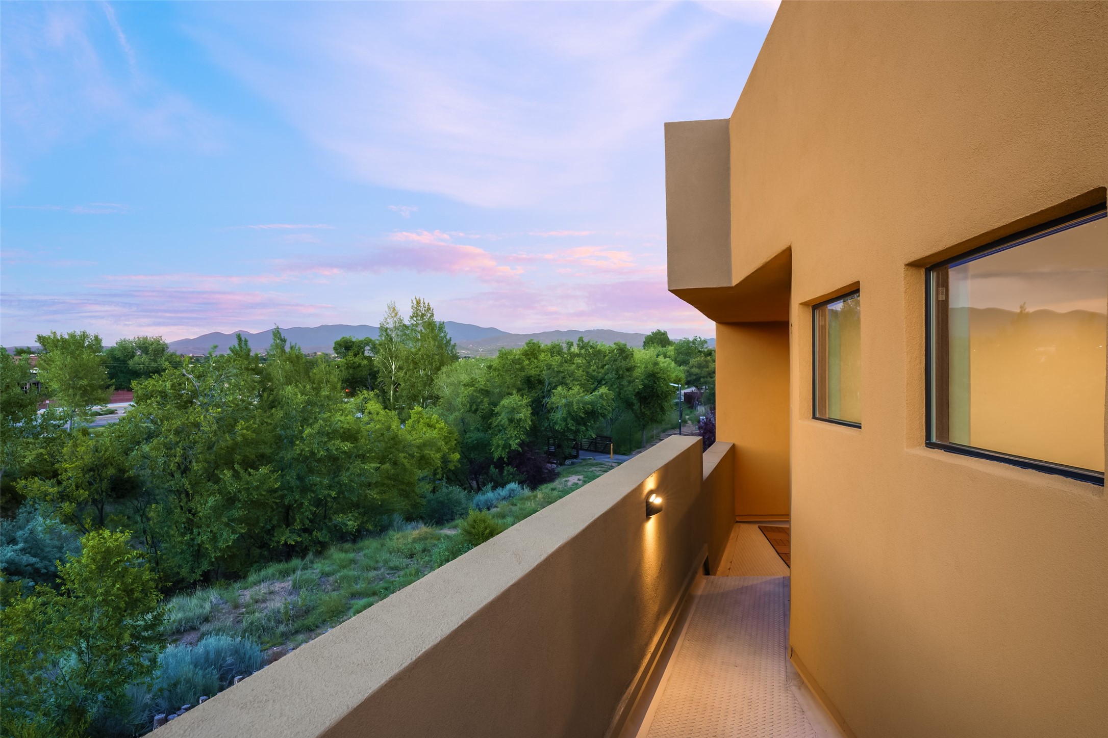 Tucked away at the end of a private drive alongside the Santa Fe River Trail, this expertly designed condominium offers both privacy and proximity to the Plaza. Crafted as an all-electric home with an Emerald Green Certification, the highest level attainable including owned solar equaling zero electricity bills. Inside, the main living area features double height ceilings with architectural clerestory windows and seamless indoor-outdoor flow to the rear patio. The downstairs bedroom offers flexibility as a guest space or private office, while the upstairs primary suite feels like a retreat with a sense of quiet separation. Plus a covered portal with stunning mountain views. Located just one mile from the Plaza along the river trail and less than a mile from the Santa Fe Railyard & Farmers Market this unique property is perfectly positioned for convenience. In-floor radiant heating throughout including the garage and mini splits offer year round comfort. Low maintenance landscaping and smart home features offer the ability to lock and leave without worry. A rare contemporary offering near the Plaza!
