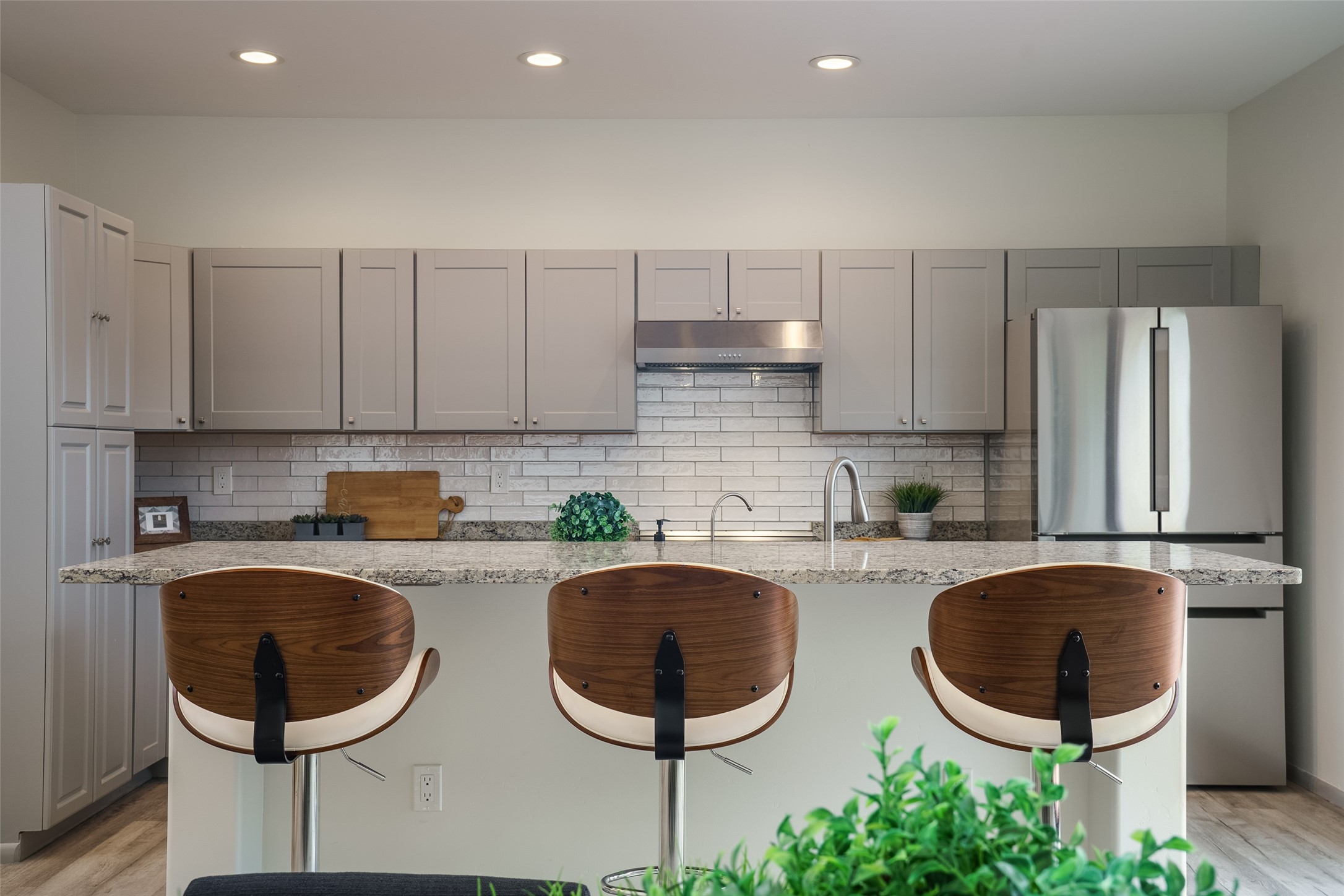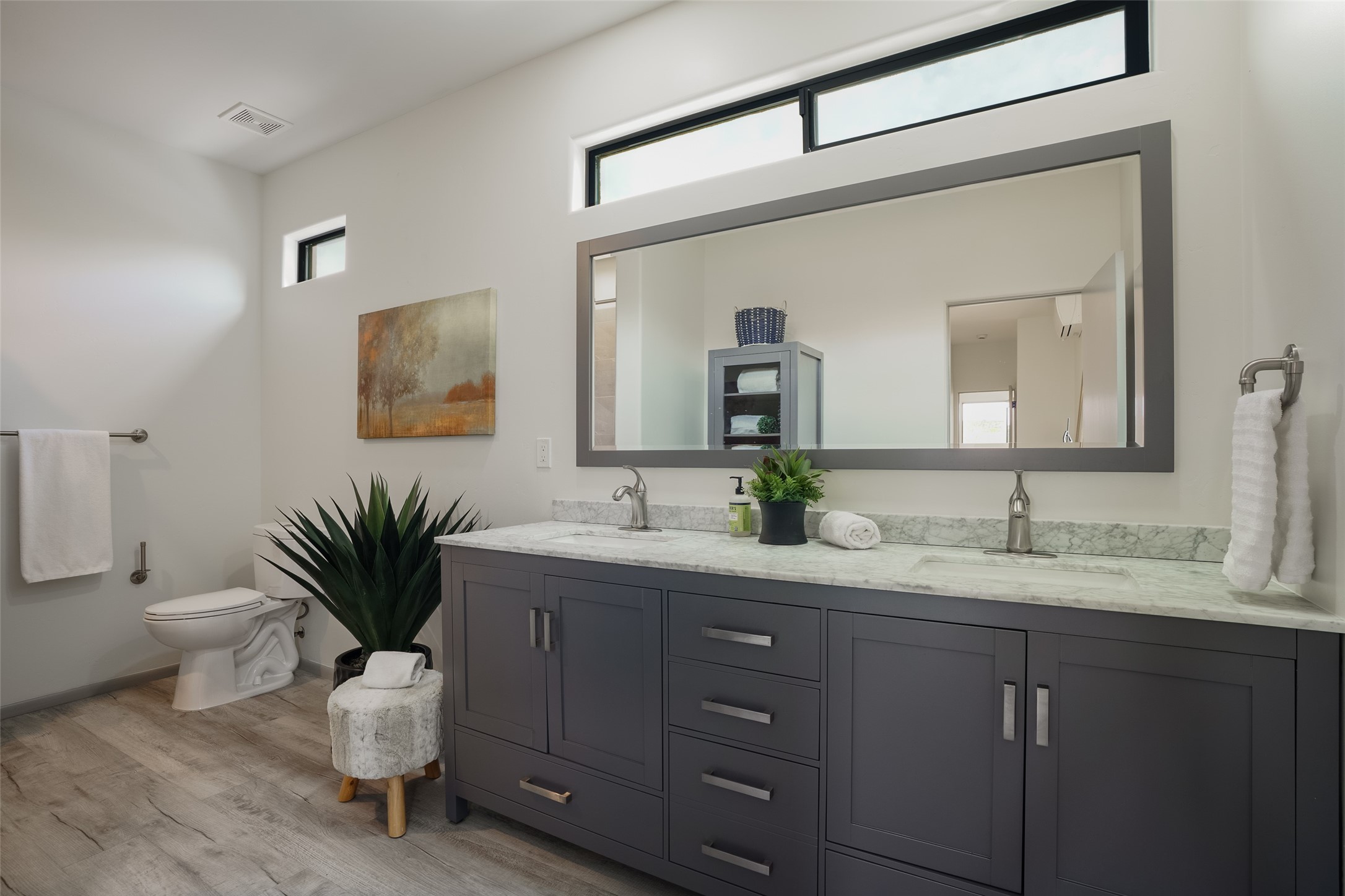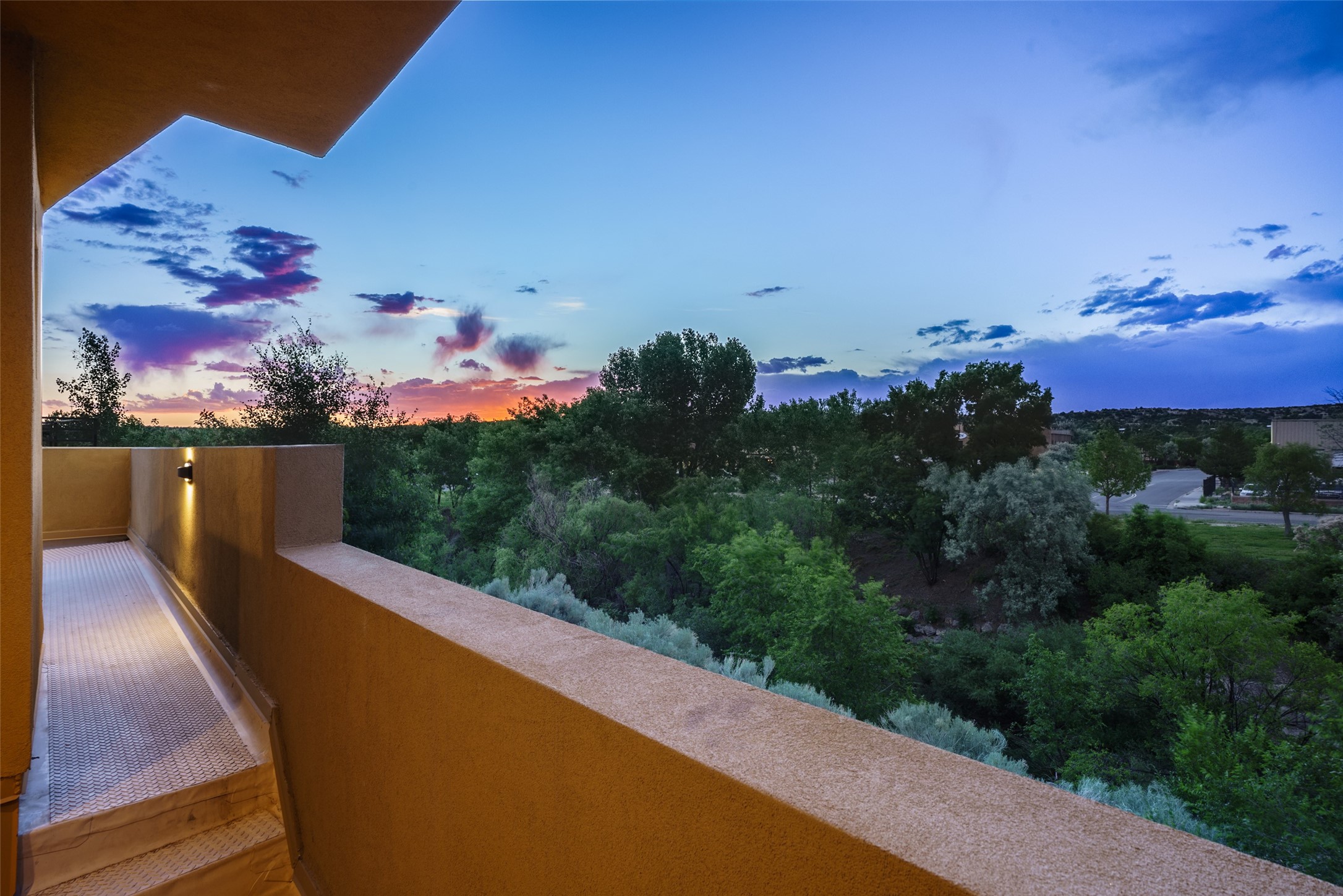 Tucked away at the end of a private drive alongside the Santa Fe River Trail, this expertly designed condominium offers both privacy and proximity to the Plaza. Crafted as an all-electric home with an Emerald Green Certification, the highest level attainable including owned solar equaling zero electricity bills. Inside, the main living area features double height ceilings with architectural clerestory windows and seamless indoor-outdoor flow to the rear patio. The downstairs bedroom offers flexibility as a guest space or private office, while the upstairs primary suite feels like a retreat with a sense of quiet separation. Plus a covered portal with stunning mountain views. Located just one mile from the Plaza along the river trail and less than a mile from the Santa Fe Railyard & Farmers Market this unique property is perfectly positioned for convenience. In-floor radiant heating throughout including the garage and mini splits offer year round comfort. Low maintenance landscaping and smart home features offer the ability to lock and leave without worry. A rare contemporary offering near the Plaza!