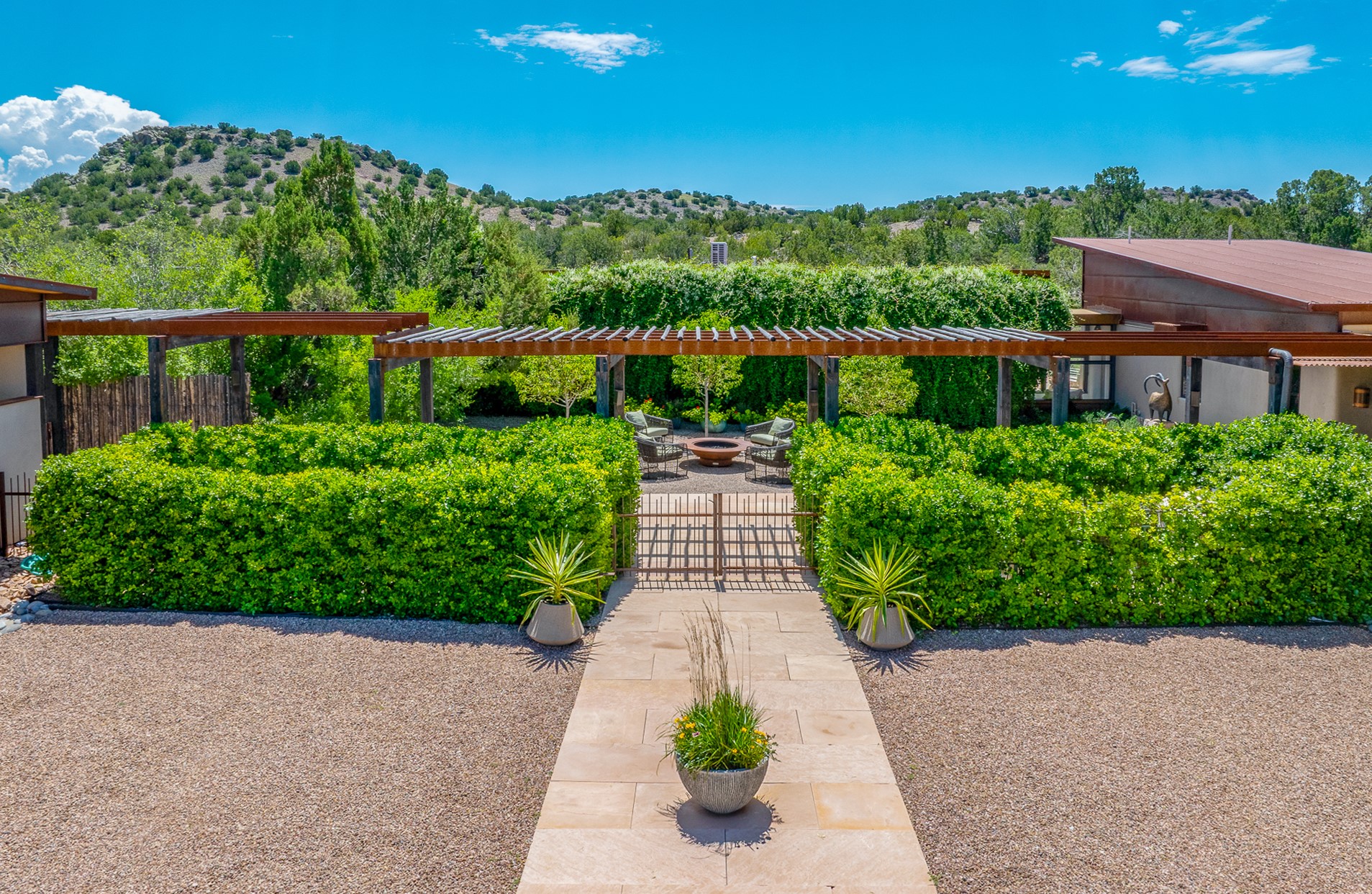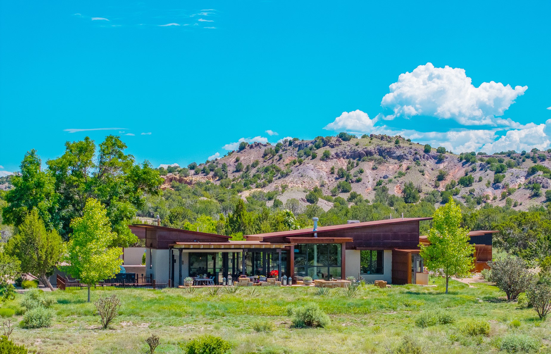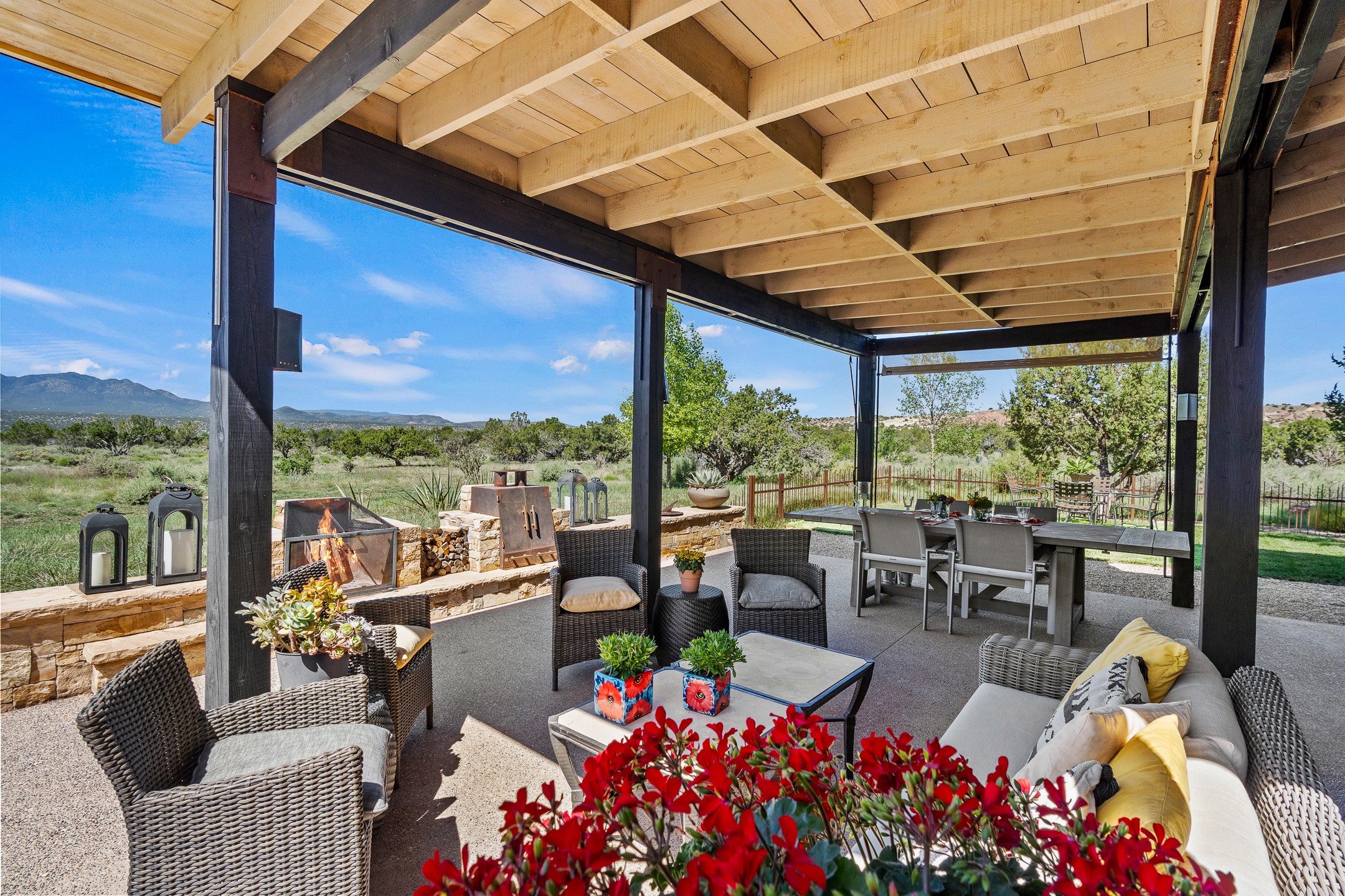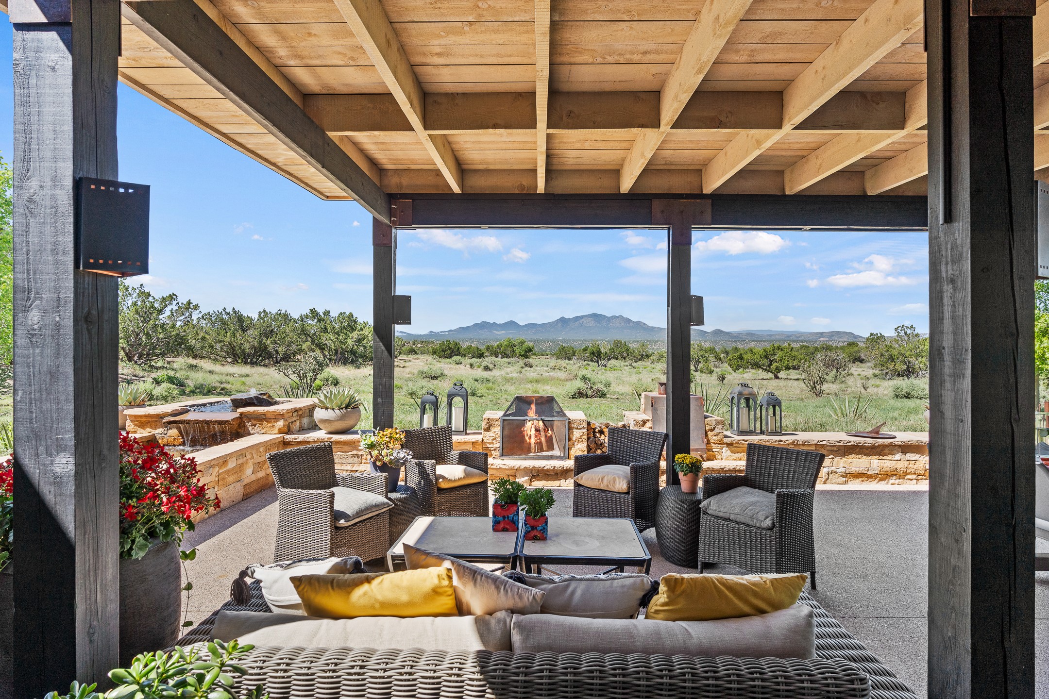 Architect-Designed Sanctuary on 44 Acres with Sweeping Ortiz Mountain ViewsSet on 44 pristine acres in the heart of Garden of the Gods rock formations, this architect-designed home is a striking fusion of form, function, and landscape. Completed in 2019 by its architect-owners, the residence reflects a deep sensitivity to place - modern in its lines, yet timeless in its connection to the land and its mesmerizing views of the Ortiz Mountains.The layout offers both simplicity and flexibility, with two bedrooms and a third space perfectly suited for a guest suite, office, or creative studio. Every detail is intentional--custom built-ins and integrated storage maintain clean lines without sacrificing utility. Expansive ceilings and precisely placed windows draw in natural light and frame breathtaking panoramas from nearly every room. The chef's kitchen is a showpiece of design and performance, anchored by a La Cornue range, Sub-Zero refrigerator and freezer, and Miele dishwasher. Raked German oak cabinetry and honed Taj Mahal marble countertops offer a warm, sculptural backdrop for both cooking and gathering. The primary suite is a peaceful retreat, complete with a spa-like bath featuring a Caldara salt-water hot tub, a custom walnut vanity with black Caesarstone counters, and a beautifully crafted walk-in shower. Seamless indoor-outdoor living defines the home. A welcoming entry courtyard, stone patios and covered areas extend the living space, perfectly oriented for sunrise coffee and sunset gatherings. A custom water feature adds a meditative element and is fed by a 12,000 gallon rain-catchment system that also supports the landscaping and garden irrigation. A 52-inch propane firepit, built-in pizza oven, and drought-tolerant yet lush landscaping complete the inviting feel of the exterior spaces. A 21 gal/min private well ensures abundant, high-quality water. A fenced and irrigated raised-bed vegetable garden/orchard and equipment/tractor workshop are adjacent to the 2 car carport (with EV car charger). The perimeter of the acreage is fenced and offers a perfect setting for equestrian facilities, including over two miles of scenic private riding/hiking trails that wind through rolling high desert terrain. An adjacent 20 acre parcel is also available for those seeking even more space and privacy. Rarely does a property of this architectural caliber and ecological sensitivity come to market. This is an extraordinary opportunity to own a soulful, design-forward retreat in one of Northern New Mexico's most scenic and serene settings. Only 10 minutes to Madrid and 20 minutes to Santa Fe.