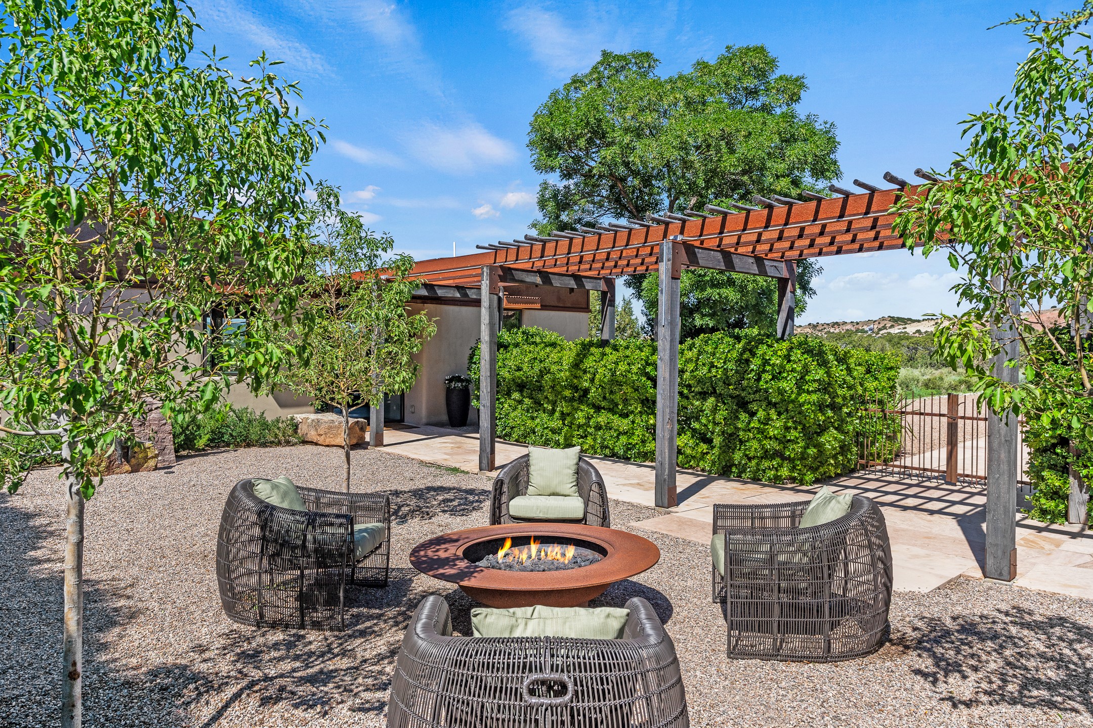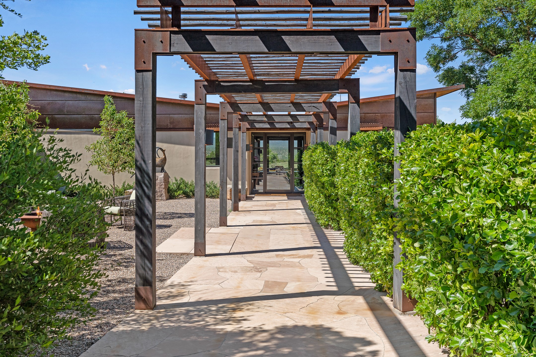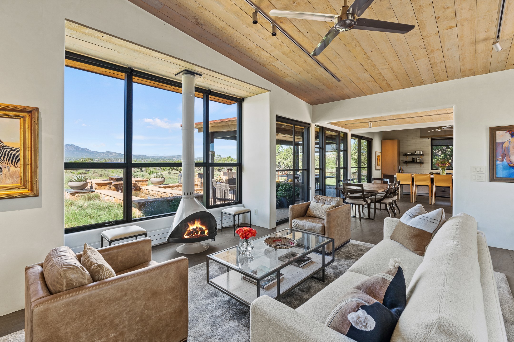 Architect-Designed Sanctuary on 44 Acres with Sweeping Ortiz Mountain ViewsSet on 44 pristine acres in the heart of Garden of the Gods rock formations, this architect-designed home is a striking fusion of form, function, and landscape. Completed in 2019 by its architect-owners, the residence reflects a deep sensitivity to place - modern in its lines, yet timeless in its connection to the land and its mesmerizing views of the Ortiz Mountains.The layout offers both simplicity and flexibility, with two bedrooms and a third space perfectly suited for a guest suite, office, or creative studio. Every detail is intentional--custom built-ins and integrated storage maintain clean lines without sacrificing utility. Expansive ceilings and precisely placed windows draw in natural light and frame breathtaking panoramas from nearly every room. The chef's kitchen is a showpiece of design and performance, anchored by a La Cornue range, Sub-Zero refrigerator and freezer, and Miele dishwasher. Raked German oak cabinetry and honed Taj Mahal marble countertops offer a warm, sculptural backdrop for both cooking and gathering. The primary suite is a peaceful retreat, complete with a spa-like bath featuring a Caldara salt-water hot tub, a custom walnut vanity with black Caesarstone counters, and a beautifully crafted walk-in shower. Seamless indoor-outdoor living defines the home. A welcoming entry courtyard, stone patios and covered areas extend the living space, perfectly oriented for sunrise coffee and sunset gatherings. A custom water feature adds a meditative element and is fed by a 12,000 gallon rain-catchment system that also supports the landscaping and garden irrigation. A 52-inch propane firepit, built-in pizza oven, and drought-tolerant yet lush landscaping complete the inviting feel of the exterior spaces. A 21 gal/min private well ensures abundant, high-quality water. A fenced and irrigated raised-bed vegetable garden/orchard and equipment/tractor workshop are adjacent to the 2 car carport (with EV car charger). The perimeter of the acreage is fenced and offers a perfect setting for equestrian facilities, including over two miles of scenic private riding/hiking trails that wind through rolling high desert terrain. An adjacent 20 acre parcel is also available for those seeking even more space and privacy. Rarely does a property of this architectural caliber and ecological sensitivity come to market. This is an extraordinary opportunity to own a soulful, design-forward retreat in one of Northern New Mexico's most scenic and serene settings. Only 10 minutes to Madrid and 20 minutes to Santa Fe.
