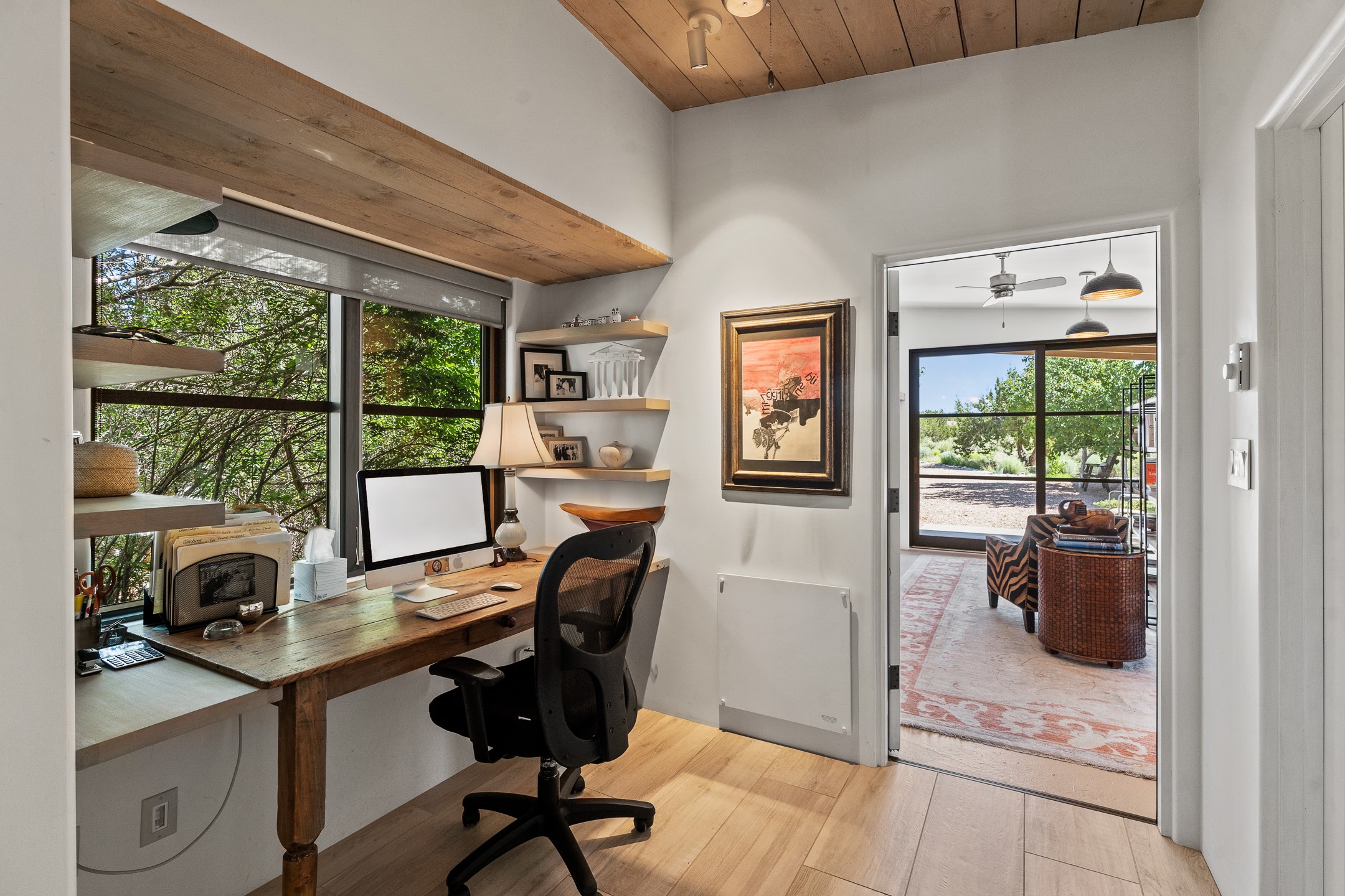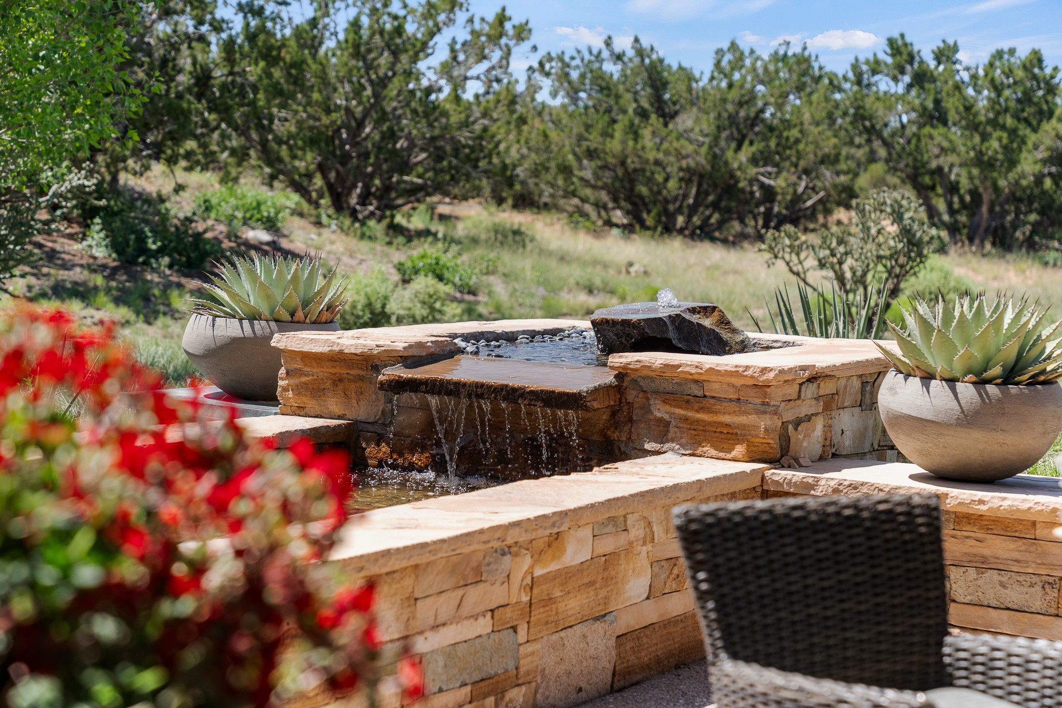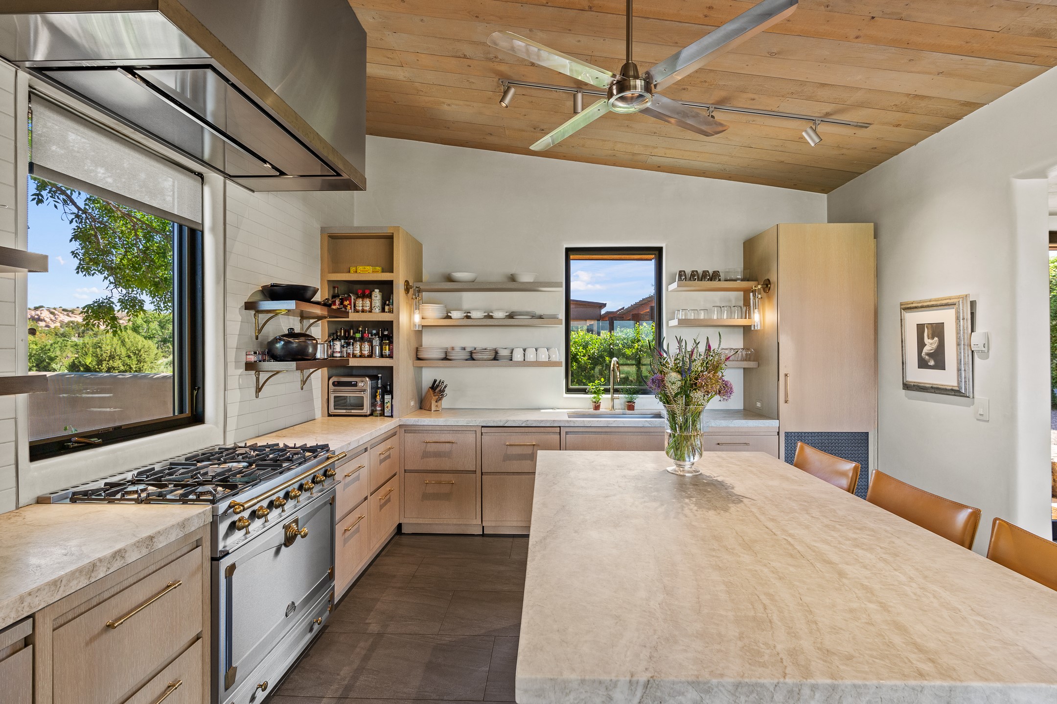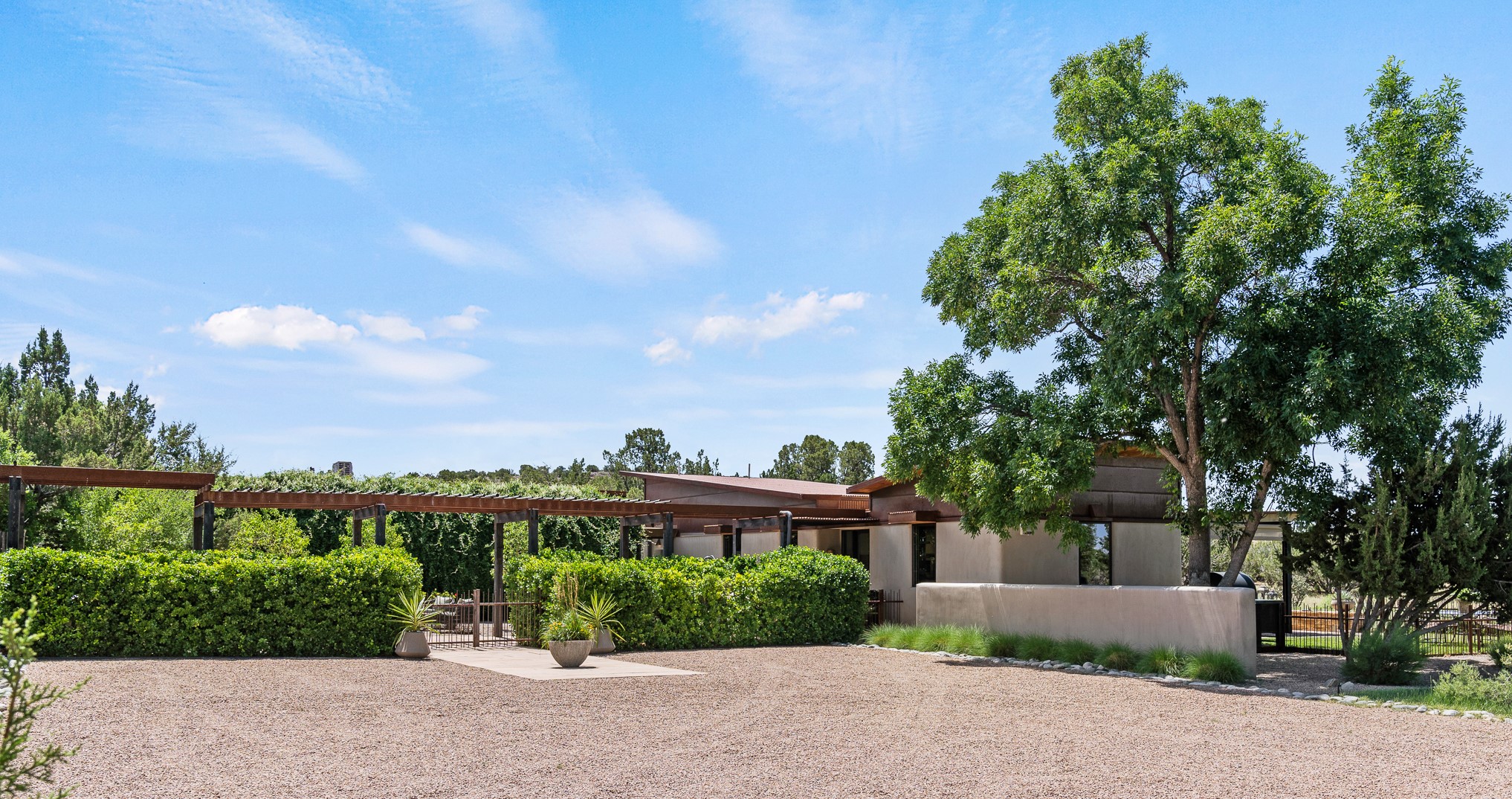 Architect-Designed Sanctuary on 44 Acres with Sweeping Ortiz Mountain ViewsSet on 44 pristine acres in the heart of Garden of the Gods rock formations, this architect-designed home is a striking fusion of form, function, and landscape. Completed in 2019 by its architect-owners, the residence reflects a deep sensitivity to place - modern in its lines, yet timeless in its connection to the land and its mesmerizing views of the Ortiz Mountains.The layout offers both simplicity and flexibility, with two bedrooms and a third space perfectly suited for a guest suite, office, or creative studio. Every detail is intentional--custom built-ins and integrated storage maintain clean lines without sacrificing utility. Expansive ceilings and precisely placed windows draw in natural light and frame breathtaking panoramas from nearly every room. The chef's kitchen is a showpiece of design and performance, anchored by a La Cornue range, Sub-Zero refrigerator and freezer, and Miele dishwasher. Raked German oak cabinetry and honed Taj Mahal marble countertops offer a warm, sculptural backdrop for both cooking and gathering. The primary suite is a peaceful retreat, complete with a spa-like bath featuring a Caldara salt-water hot tub, a custom walnut vanity with black Caesarstone counters, and a beautifully crafted walk-in shower. Seamless indoor-outdoor living defines the home. A welcoming entry courtyard, stone patios and covered areas extend the living space, perfectly oriented for sunrise coffee and sunset gatherings. A custom water feature adds a meditative element and is fed by a 12,000 gallon rain-catchment system that also supports the landscaping and garden irrigation. A 52-inch propane firepit, built-in pizza oven, and drought-tolerant yet lush landscaping complete the inviting feel of the exterior spaces. A 21 gal/min private well ensures abundant, high-quality water. A fenced and irrigated raised-bed vegetable garden/orchard and equipment/tractor workshop are adjacent to the 2 car carport (with EV car charger). The perimeter of the acreage is fenced and offers a perfect setting for equestrian facilities, including over two miles of scenic private riding/hiking trails that wind through rolling high desert terrain. An adjacent 20 acre parcel is also available for those seeking even more space and privacy. Rarely does a property of this architectural caliber and ecological sensitivity come to market. This is an extraordinary opportunity to own a soulful, design-forward retreat in one of Northern New Mexico's most scenic and serene settings. Only 10 minutes to Madrid and 20 minutes to Santa Fe.
