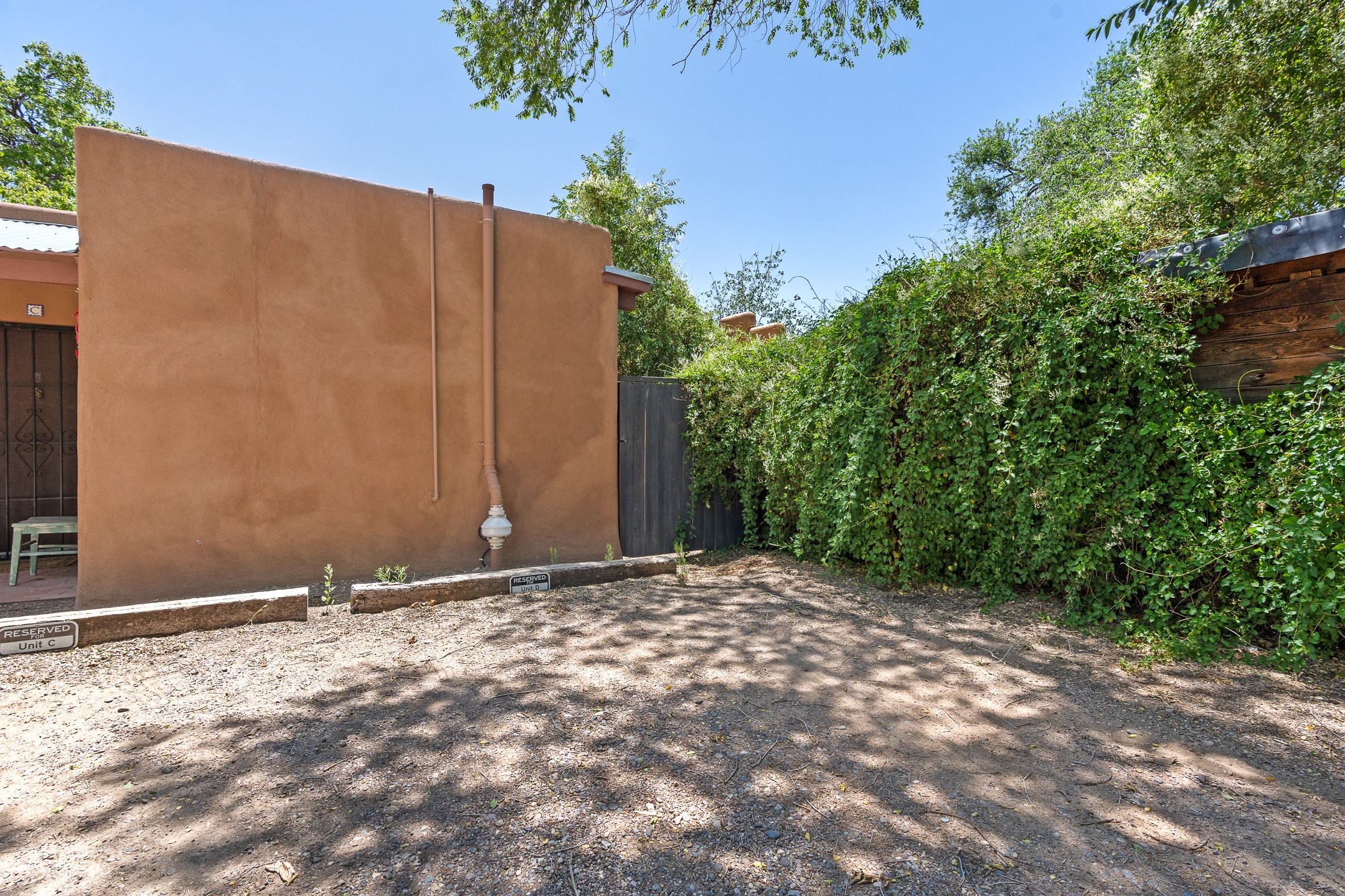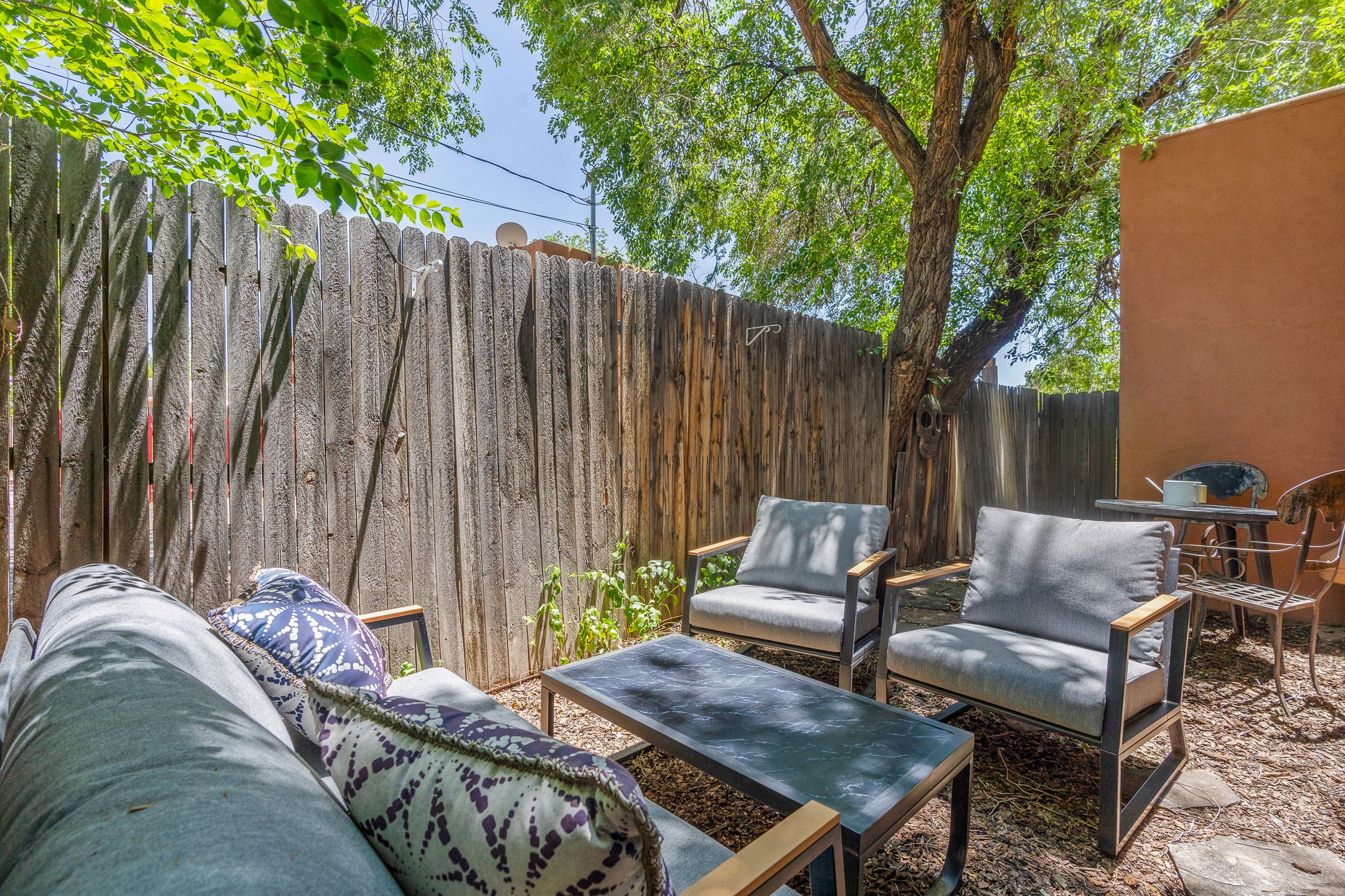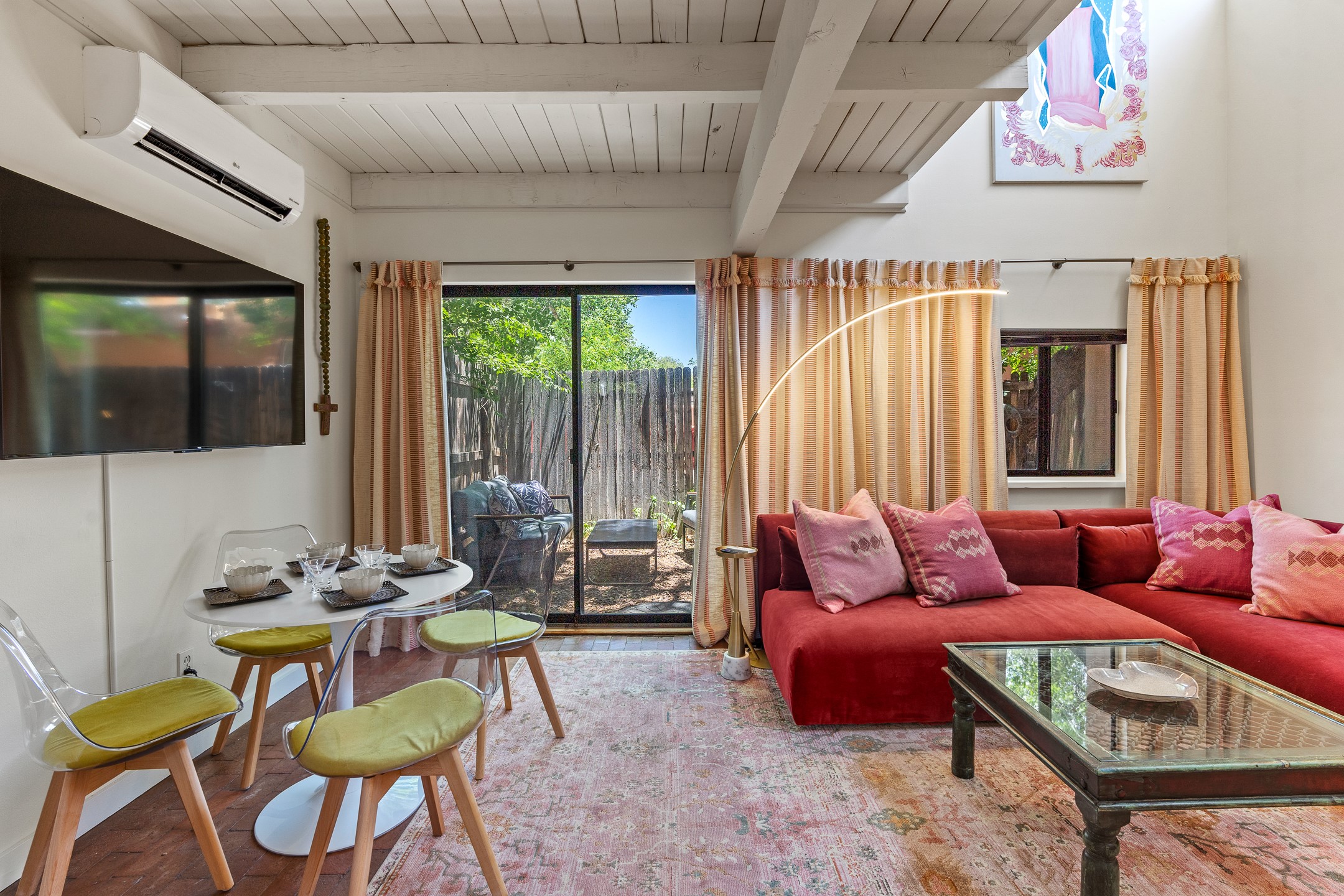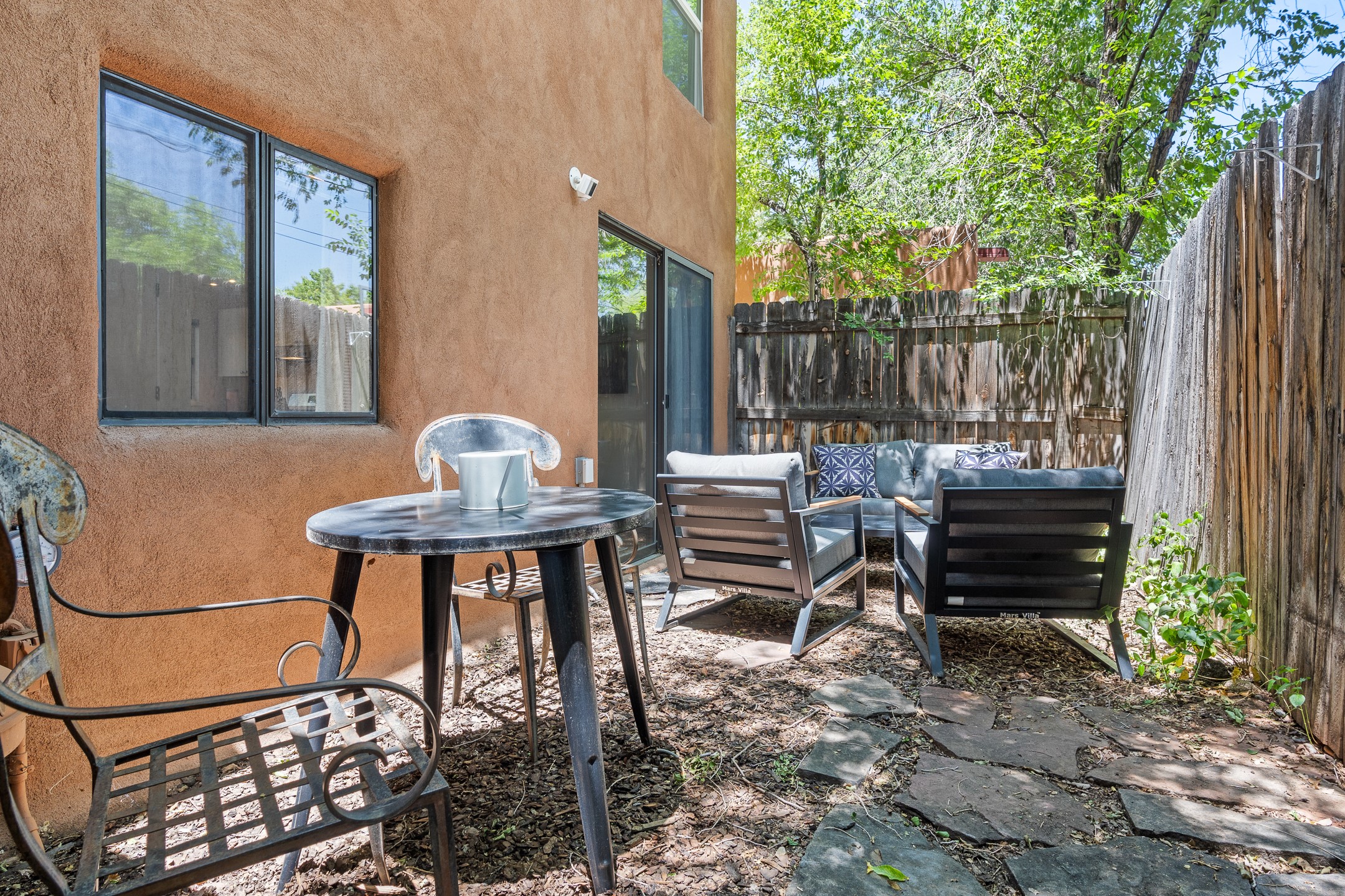Welcome to this charming and thoughtfully updated 1-bedroom, 1-bath loft-style condo with approximately 588 square feet of light and bright living space. Ideally located in central Santa Fe, this sweet home is just minutes from Trader Joe's, restaurants, shopping, parks, and schools. Soaring ceilings and warm brick floors create an inviting atmosphere in the main living area, while the updated kitchen features sleek stainless steel appliances, quartz countertops, and a washer and dryer for added convenience. Minisplit systems upstairs and down provide efficient heating and cooling year-round. Upstairs, the cozy loft bedroom offers privacy and character with whitewashed wood ceilings and an ensuite bath adorned with playful and cheerful aesthetic. Step outside to your private backyard patio--perfect for morning coffee, evening drinks, or casual barbecues with friends. Additional highlights include a designated parking space and a low-maintenance lifestyle in a cozy condo community. Whether you're looking for a starter home, a pied--terre, or a charming investment property, this gem checks all the boxes.