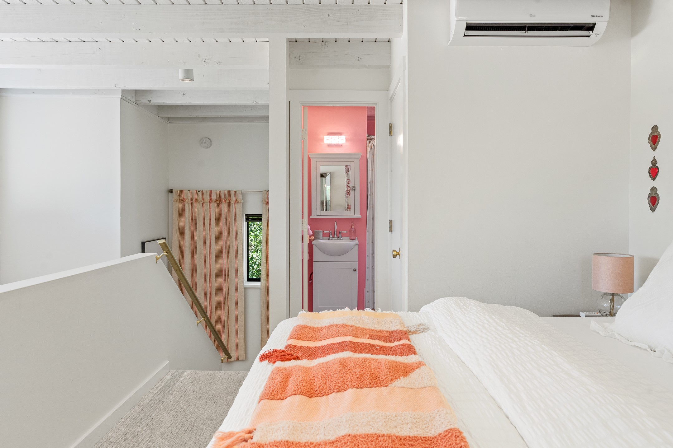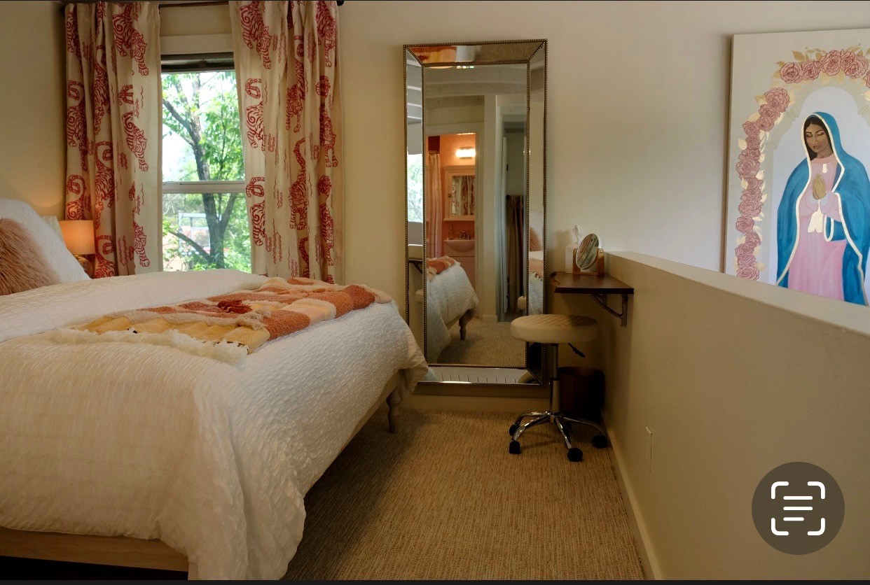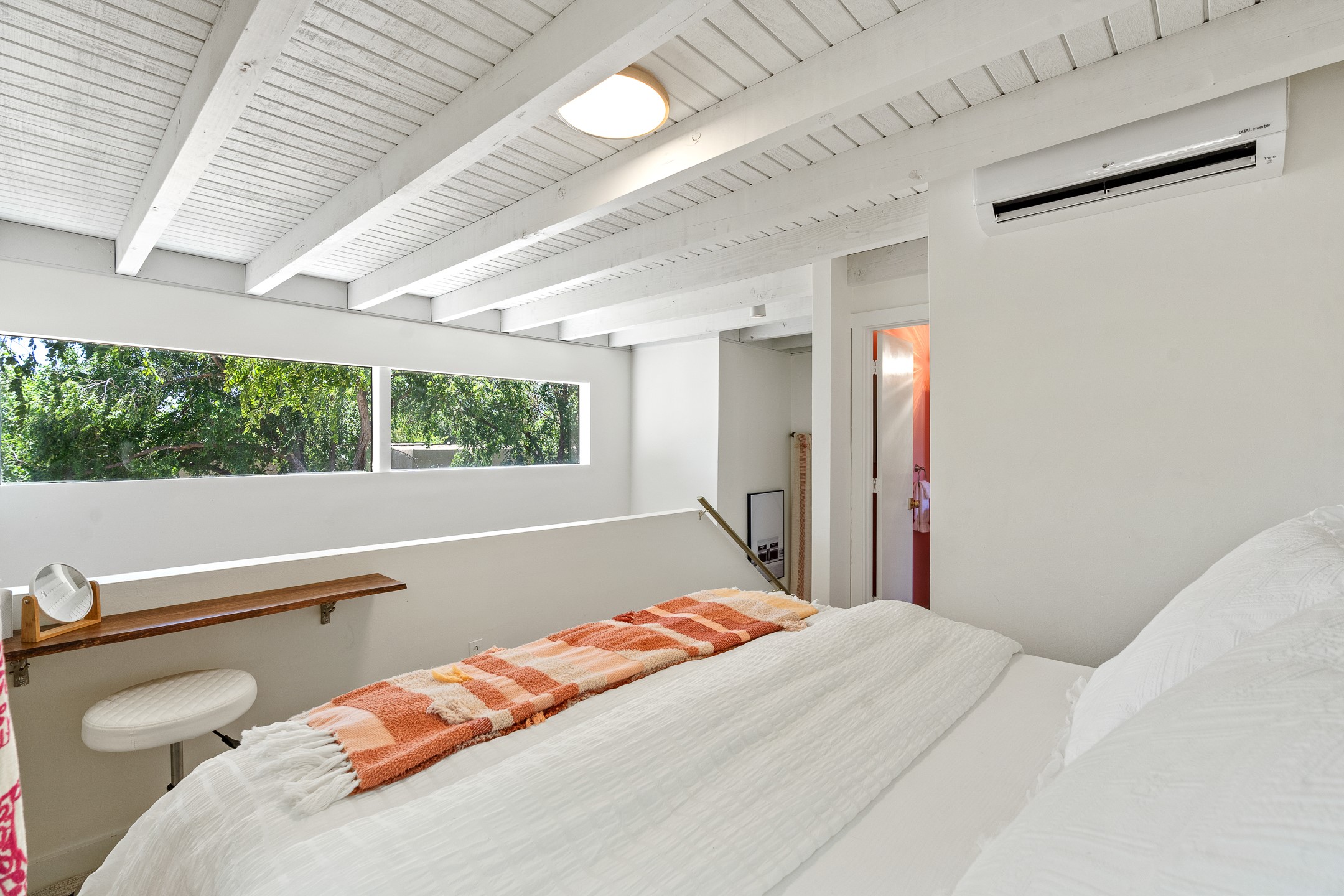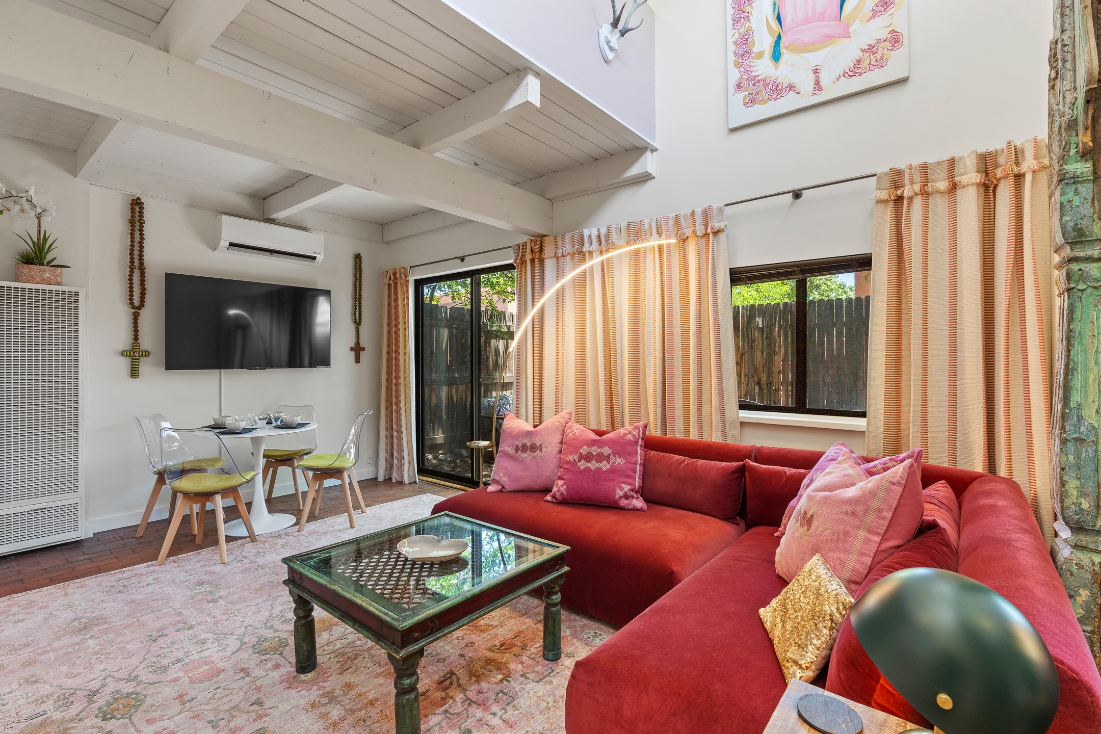 Welcome to this charming and thoughtfully updated 1-bedroom, 1-bath loft-style condo with approximately 588 square feet of light and bright living space. Ideally located in central Santa Fe, this sweet home is just minutes from Trader Joe's, restaurants, shopping, parks, and schools. Soaring ceilings and warm brick floors create an inviting atmosphere in the main living area, while the updated kitchen features sleek stainless steel appliances, quartz countertops, and a washer and dryer for added convenience. Minisplit systems upstairs and down provide efficient heating and cooling year-round. Upstairs, the cozy loft bedroom offers privacy and character with whitewashed wood ceilings and an ensuite bath adorned with playful and cheerful aesthetic. Step outside to your private backyard patio--perfect for morning coffee, evening drinks, or casual barbecues with friends. Additional highlights include a designated parking space and a low-maintenance lifestyle in a cozy condo community. Whether you're looking for a starter home, a pied--terre, or a charming investment property, this gem checks all the boxes.
