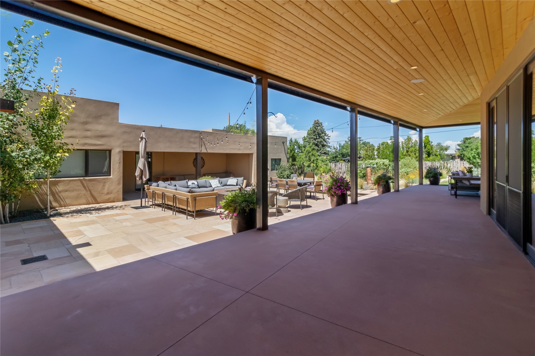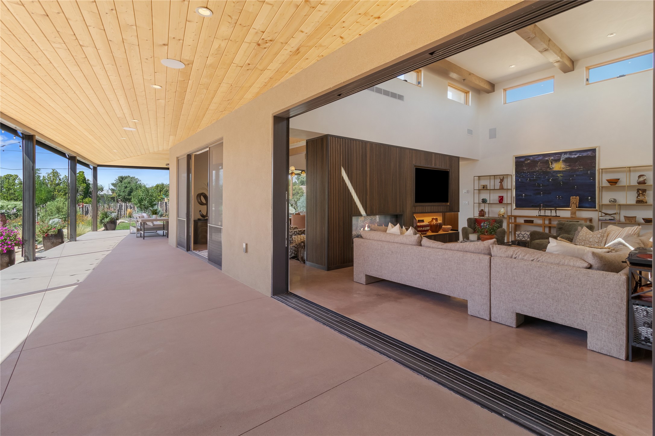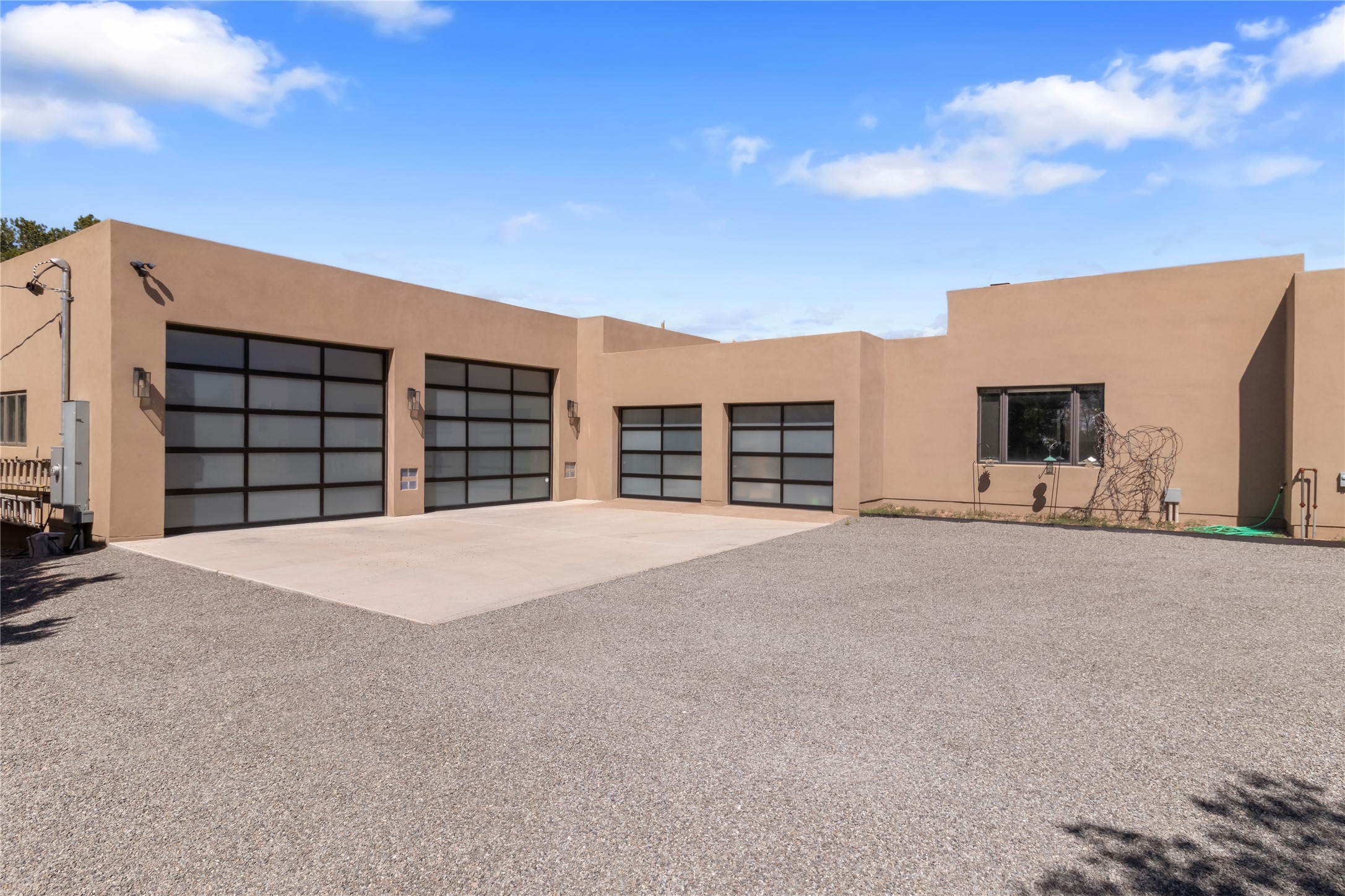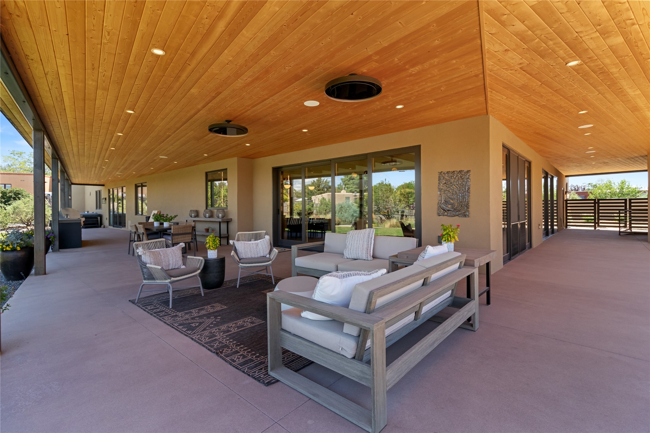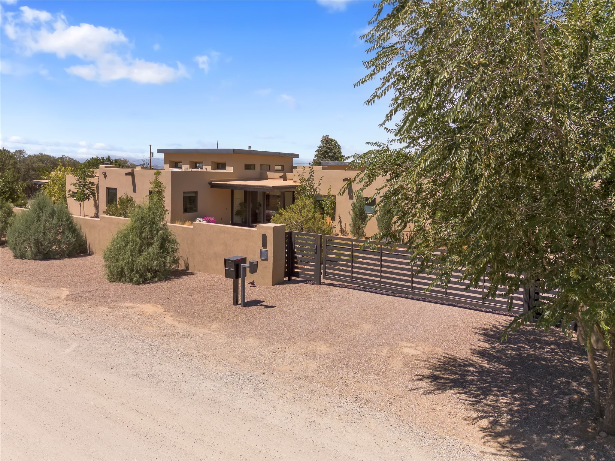 This exquisite 1-acre gated compound that's centrally located & just 2 miles from the historic Santa Fe Plaza features a masterfully designed main residence, spacious guest home, and 6 garage bays for collectors or creatives. The main home offers ~3,875 sq. ft. of refined living with Venetian plaster walls in public areas, custom cabinetry throughout, and 8-ft interior doors. The living and dining rooms feature an impressive dual aspect Ortal fireplace. Soaring ceilings and a wet bar with beverage drawers complete the living room, which opens to a ~1,700 sq. ft. covered patio. Multi-slide door systems open to this impressive patio, that includes built-in Bromic heaters and a 42 inch Wolf grill. The chef's kitchen is anchored by a Lacanche 7-burner stove, pot filler, Sub-Zero refrigerator and freezer, Wolf steam oven, Cove dishwasher and hot/cold tap. The butler's pantry has an abundance of storage, undermount lighting and Red/White EuroCave wine refrigerators. A serene primary suite includes a steam shower, soaking tub, room sized walk-in closet with island, and patio access. Smart touches include Sonos surround system, California Closets, electric patio shades, and a whole-house water filtration system. The guest house (~1,460 sq. ft.) offers generous privacy with a large living area, bedroom, and its own designer fireplace. An attached garage/storage wing (~1,853 sq. ft.) includes a standard 2-car bay plus an oversized 2+ bay garage with 10'x12' doors--ideal for small RVs, boats, or a home gym/studio. Both main and guest garages include EV hookup capabilities. Outdoors, enjoy lush landscaping by McCumber Fine Gardens, fruit trees, raised garden beds, a custom firepit and water feature, and ample space for entertaining--easily accommodating up to 100 guests. Additional highlights include steel electric gates, frosted glass garage doors, radiant heat in main home, and the most luxurious laundry/craft room you will find. This gated retreat is a one-of-a-kind compound.