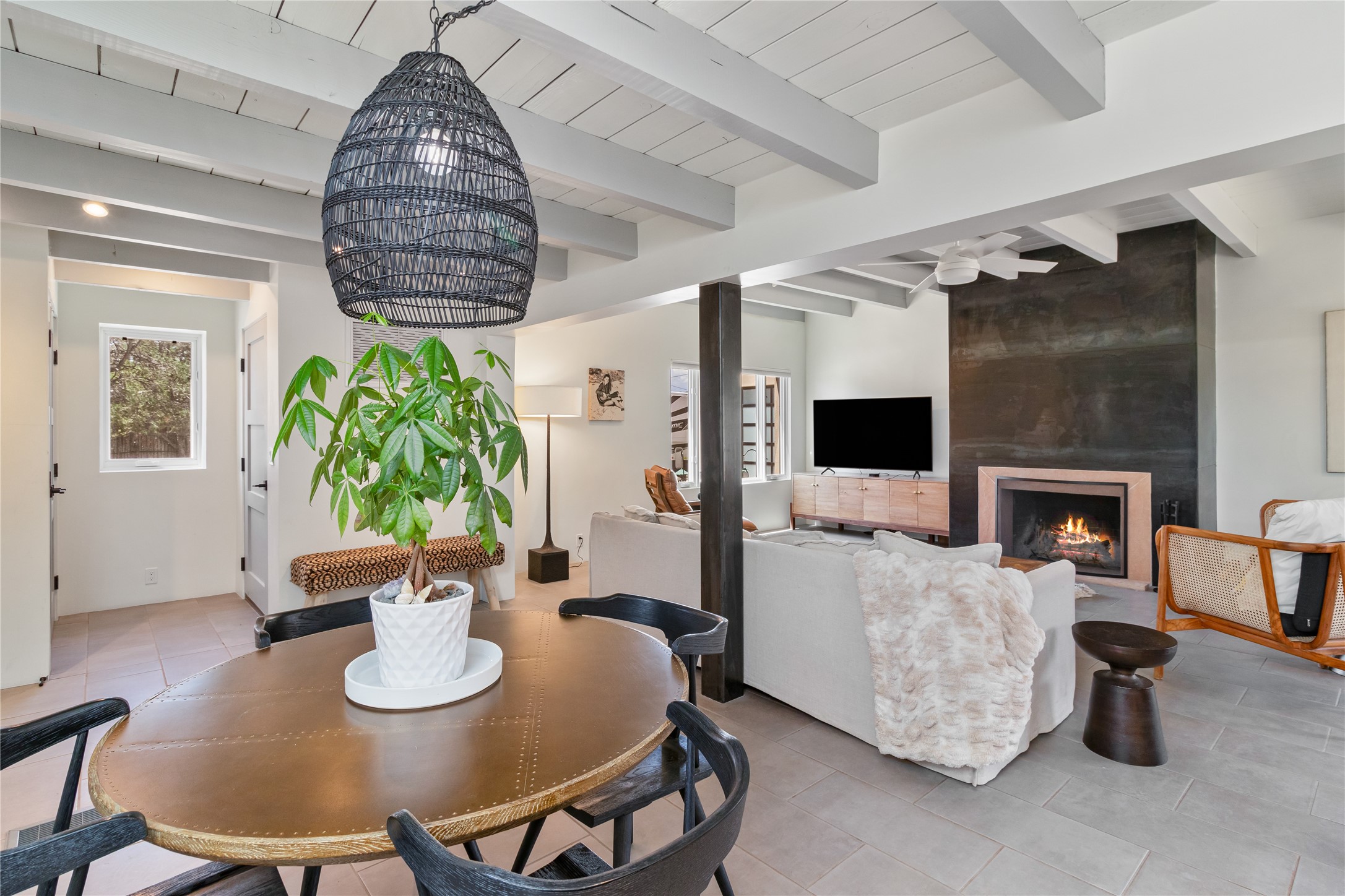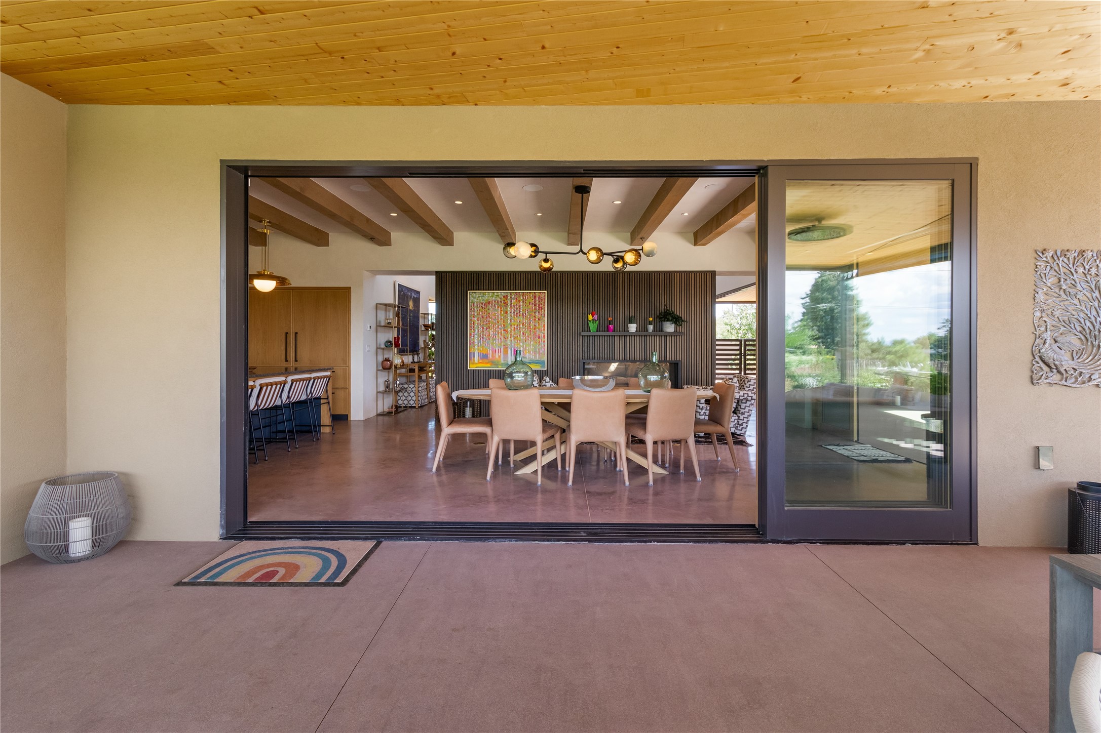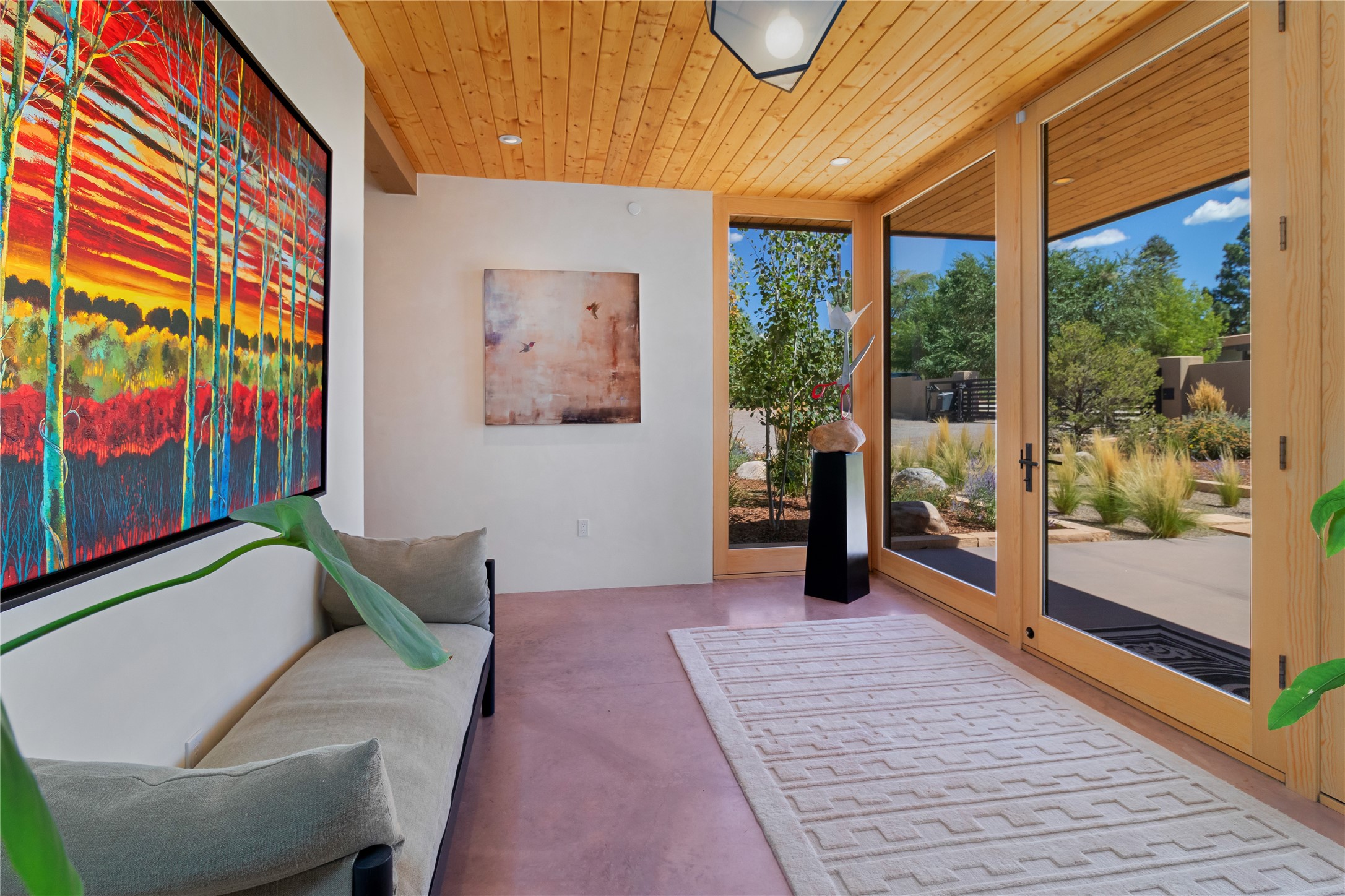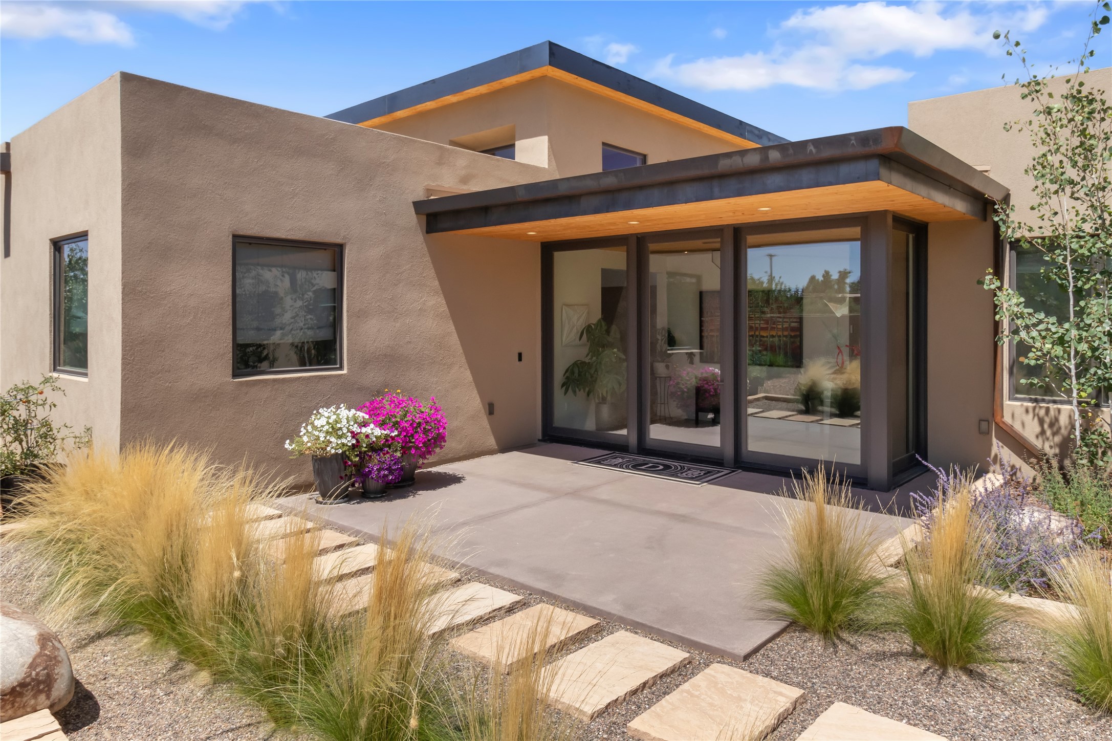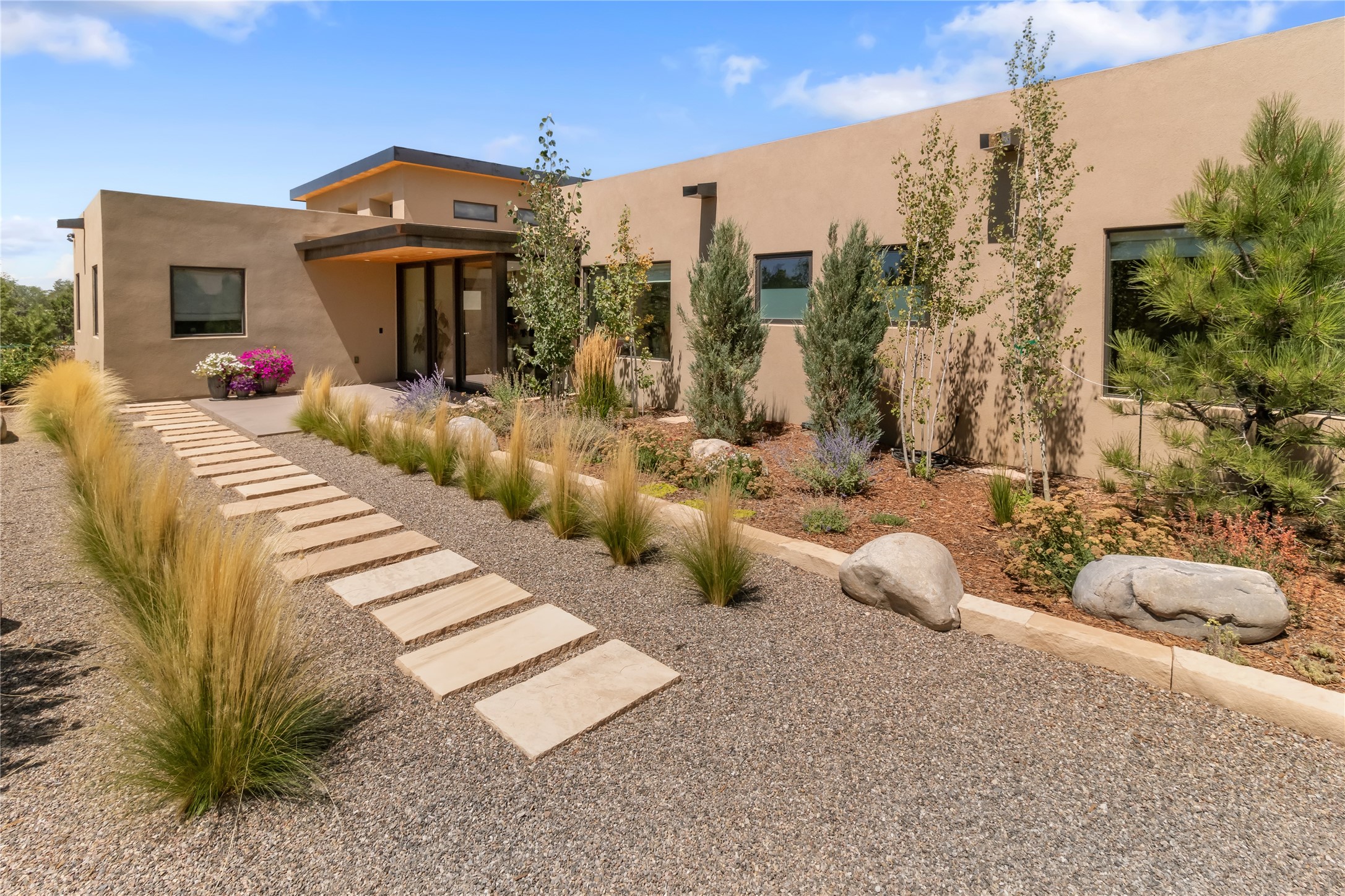This exquisite 1-acre gated compound that's centrally located & just 2 miles from the historic Santa Fe Plaza features a masterfully designed main residence, spacious guest home, and 6 garage bays for collectors or creatives. The main home offers ~3,875 sq. ft. of refined living with Venetian plaster walls in public areas, custom cabinetry throughout, and 8-ft interior doors. The living and dining rooms feature an impressive dual aspect Ortal fireplace. Soaring ceilings and a wet bar with beverage drawers complete the living room, which opens to a ~1,700 sq. ft. covered patio. Multi-slide door systems open to this impressive patio, that includes built-in Bromic heaters and a 42 inch Wolf grill. The chef's kitchen is anchored by a Lacanche 7-burner stove, pot filler, Sub-Zero refrigerator and freezer, Wolf steam oven, Cove dishwasher and hot/cold tap. The butler's pantry has an abundance of storage, undermount lighting and Red/White EuroCave wine refrigerators. A serene primary suite includes a steam shower, soaking tub, room sized walk-in closet with island, and patio access. Smart touches include Sonos surround system, California Closets, electric patio shades, and a whole-house water filtration system. The guest house (~1,460 sq. ft.) offers generous privacy with a large living area, bedroom, and its own designer fireplace. An attached garage/storage wing (~1,853 sq. ft.) includes a standard 2-car bay plus an oversized 2+ bay garage with 10'x12' doors--ideal for small RVs, boats, or a home gym/studio. Both main and guest garages include EV hookup capabilities. Outdoors, enjoy lush landscaping by McCumber Fine Gardens, fruit trees, raised garden beds, a custom firepit and water feature, and ample space for entertaining--easily accommodating up to 100 guests. Additional highlights include steel electric gates, frosted glass garage doors, radiant heat in main home, and the most luxurious laundry/craft room you will find. This gated retreat is a one-of-a-kind compound.