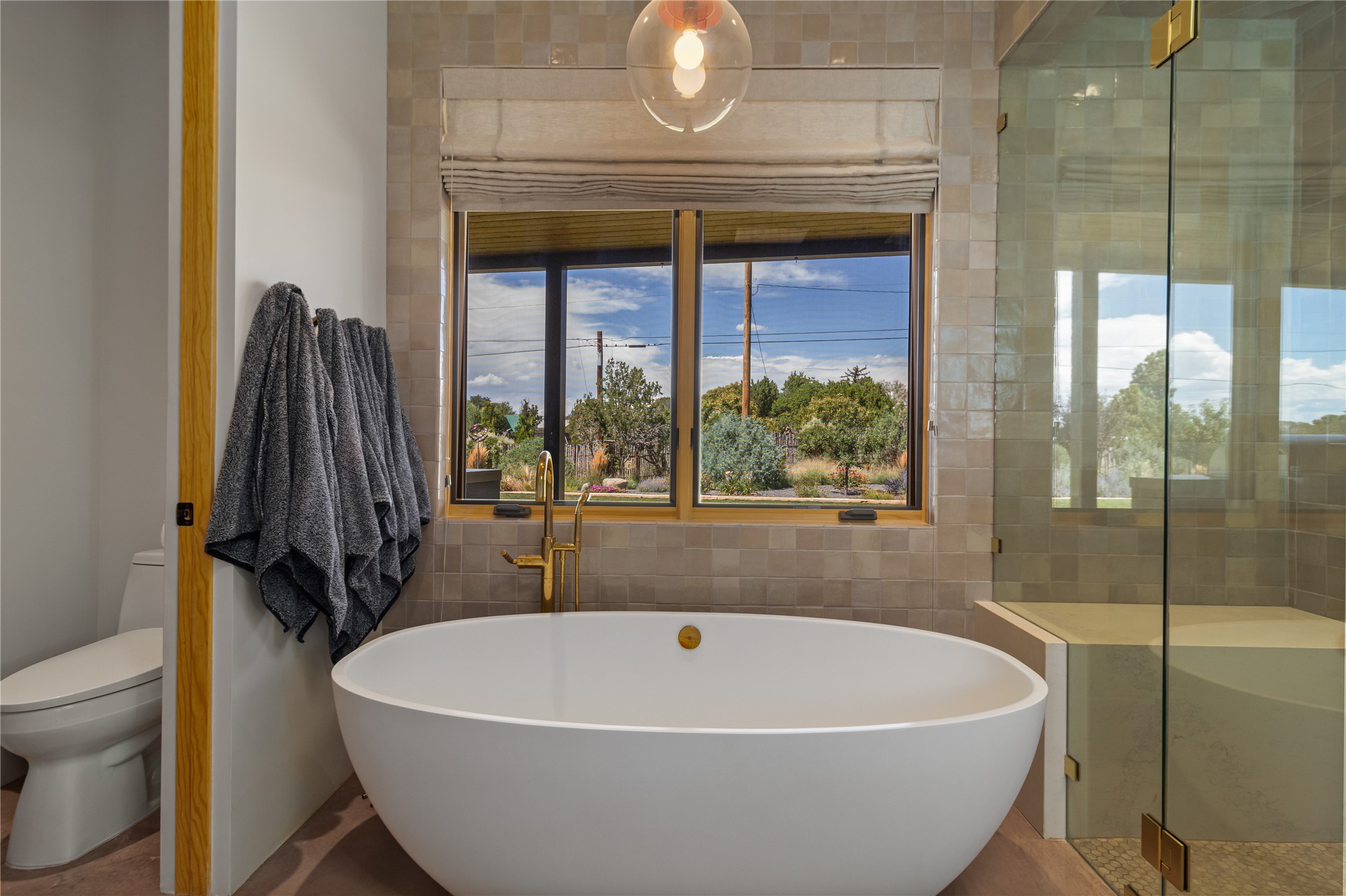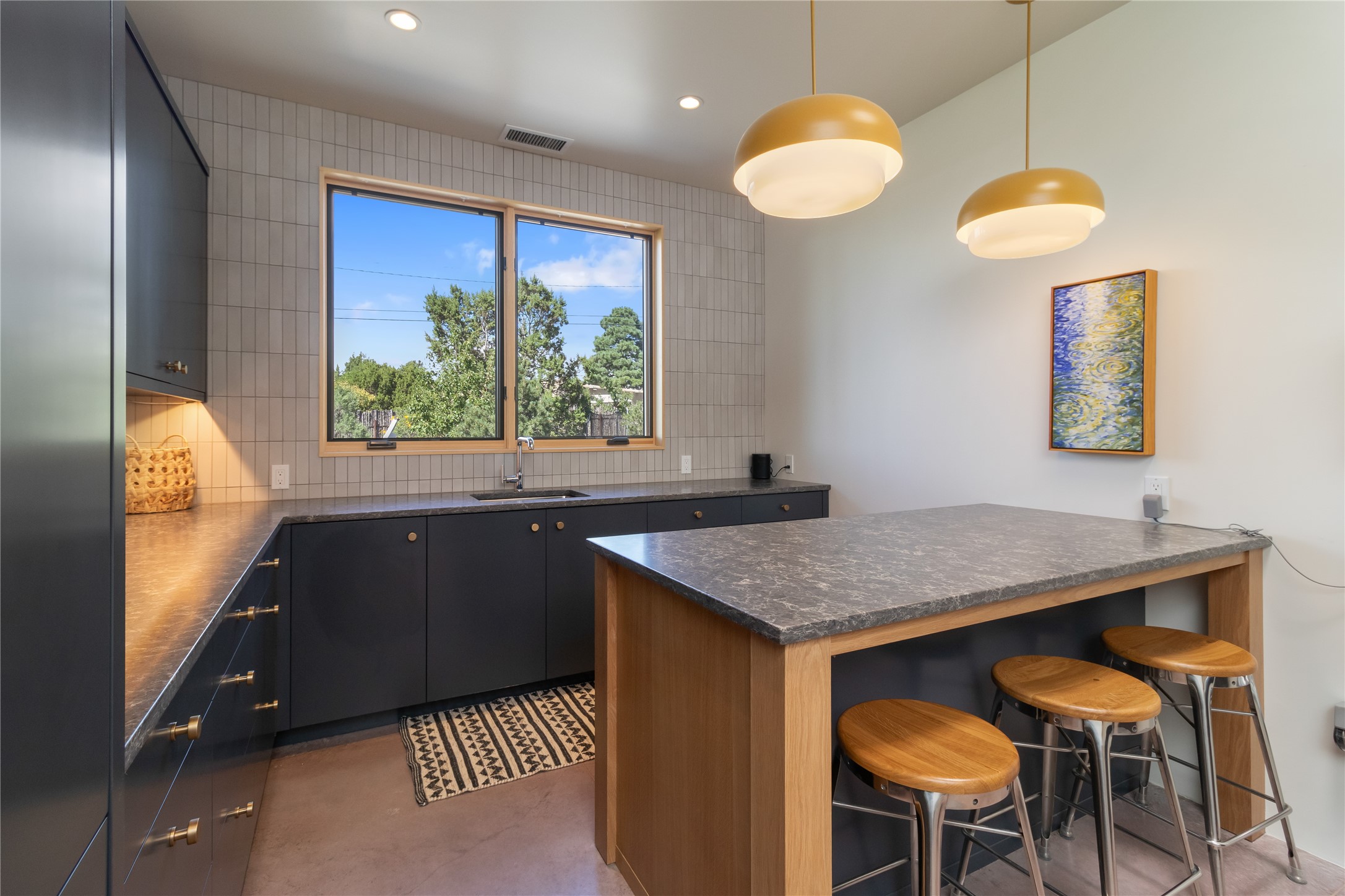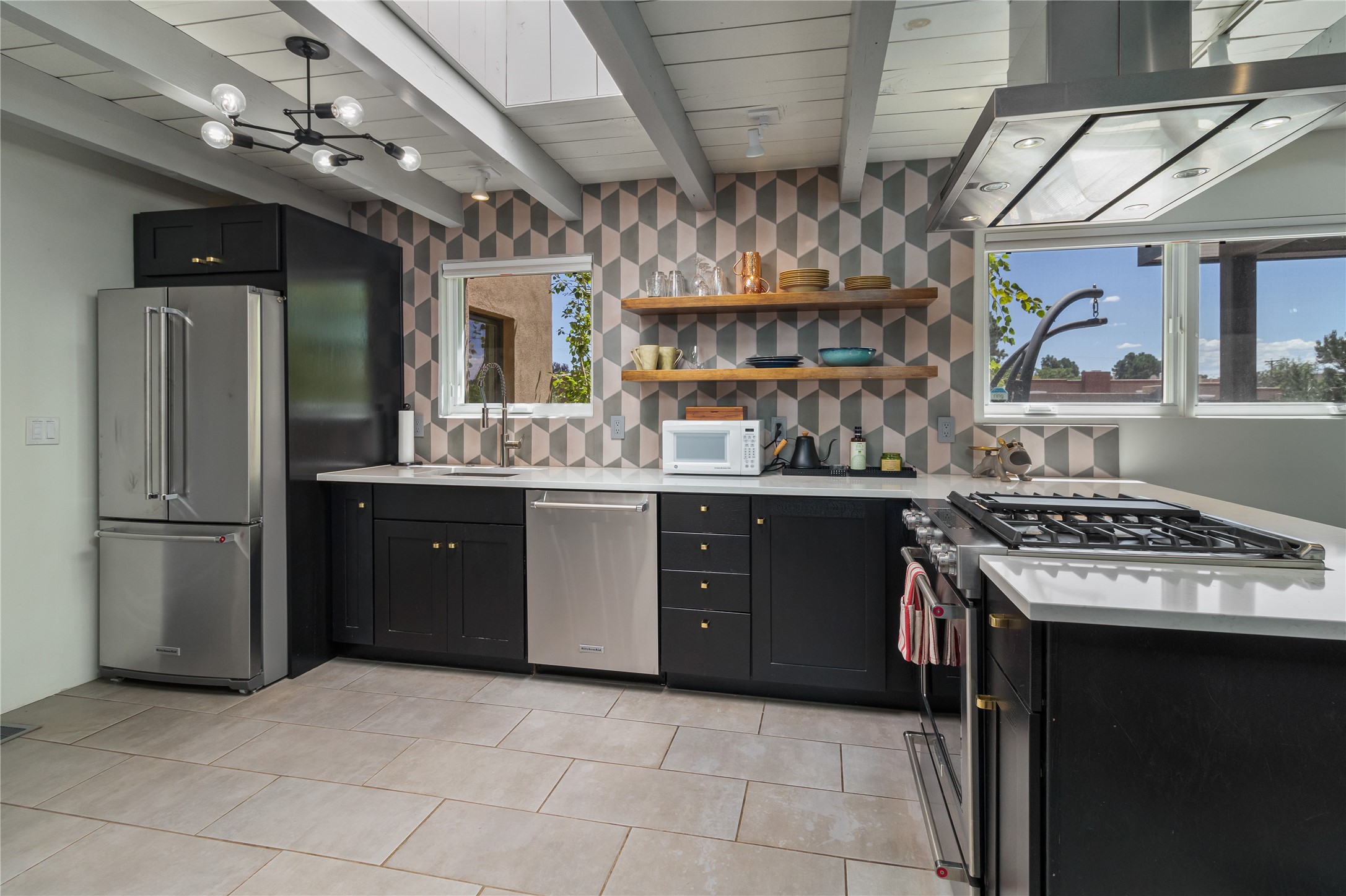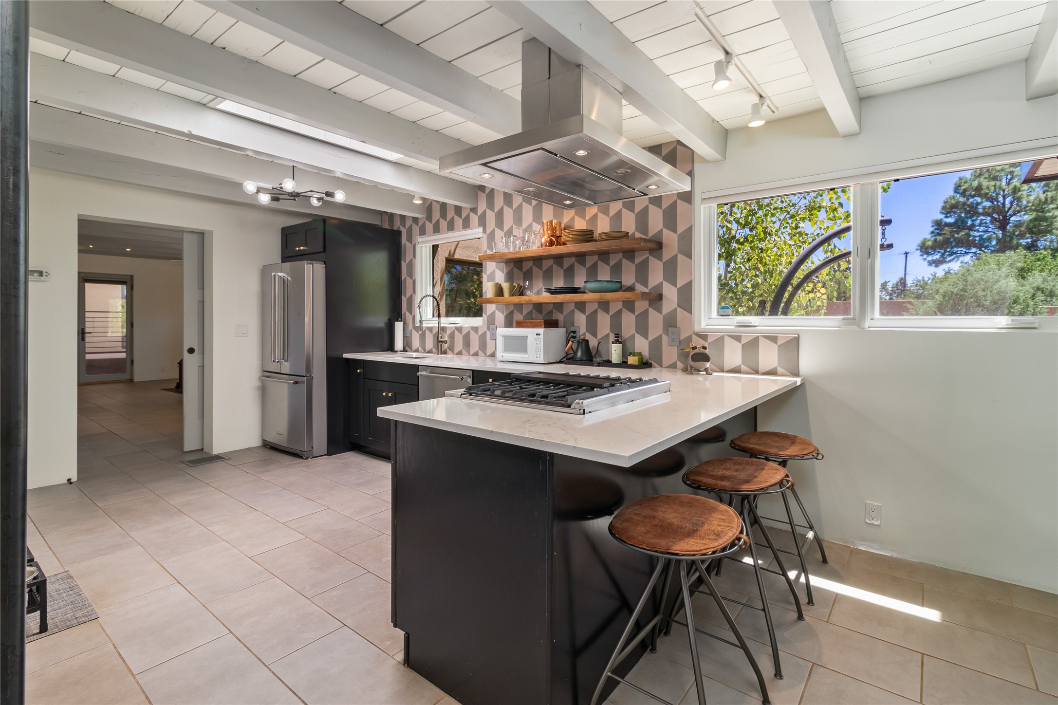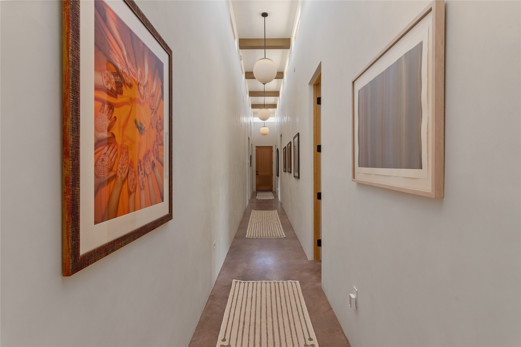 This exquisite 1-acre gated compound that's centrally located & just 2 miles from the historic Santa Fe Plaza features a masterfully designed main residence, spacious guest home, and 6 garage bays for collectors or creatives. The main home offers ~3,875 sq. ft. of refined living with Venetian plaster walls in public areas, custom cabinetry throughout, and 8-ft interior doors. The living and dining rooms feature an impressive dual aspect Ortal fireplace. Soaring ceilings and a wet bar with beverage drawers complete the living room, which opens to a ~1,700 sq. ft. covered patio. Multi-slide door systems open to this impressive patio, that includes built-in Bromic heaters and a 42 inch Wolf grill. The chef's kitchen is anchored by a Lacanche 7-burner stove, pot filler, Sub-Zero refrigerator and freezer, Wolf steam oven, Cove dishwasher and hot/cold tap. The butler's pantry has an abundance of storage, undermount lighting and Red/White EuroCave wine refrigerators. A serene primary suite includes a steam shower, soaking tub, room sized walk-in closet with island, and patio access. Smart touches include Sonos surround system, California Closets, electric patio shades, and a whole-house water filtration system. The guest house (~1,460 sq. ft.) offers generous privacy with a large living area, bedroom, and its own designer fireplace. An attached garage/storage wing (~1,853 sq. ft.) includes a standard 2-car bay plus an oversized 2+ bay garage with 10'x12' doors--ideal for small RVs, boats, or a home gym/studio. Both main and guest garages include EV hookup capabilities. Outdoors, enjoy lush landscaping by McCumber Fine Gardens, fruit trees, raised garden beds, a custom firepit and water feature, and ample space for entertaining--easily accommodating up to 100 guests. Additional highlights include steel electric gates, frosted glass garage doors, radiant heat in main home, and the most luxurious laundry/craft room you will find. This gated retreat is a one-of-a-kind compound.