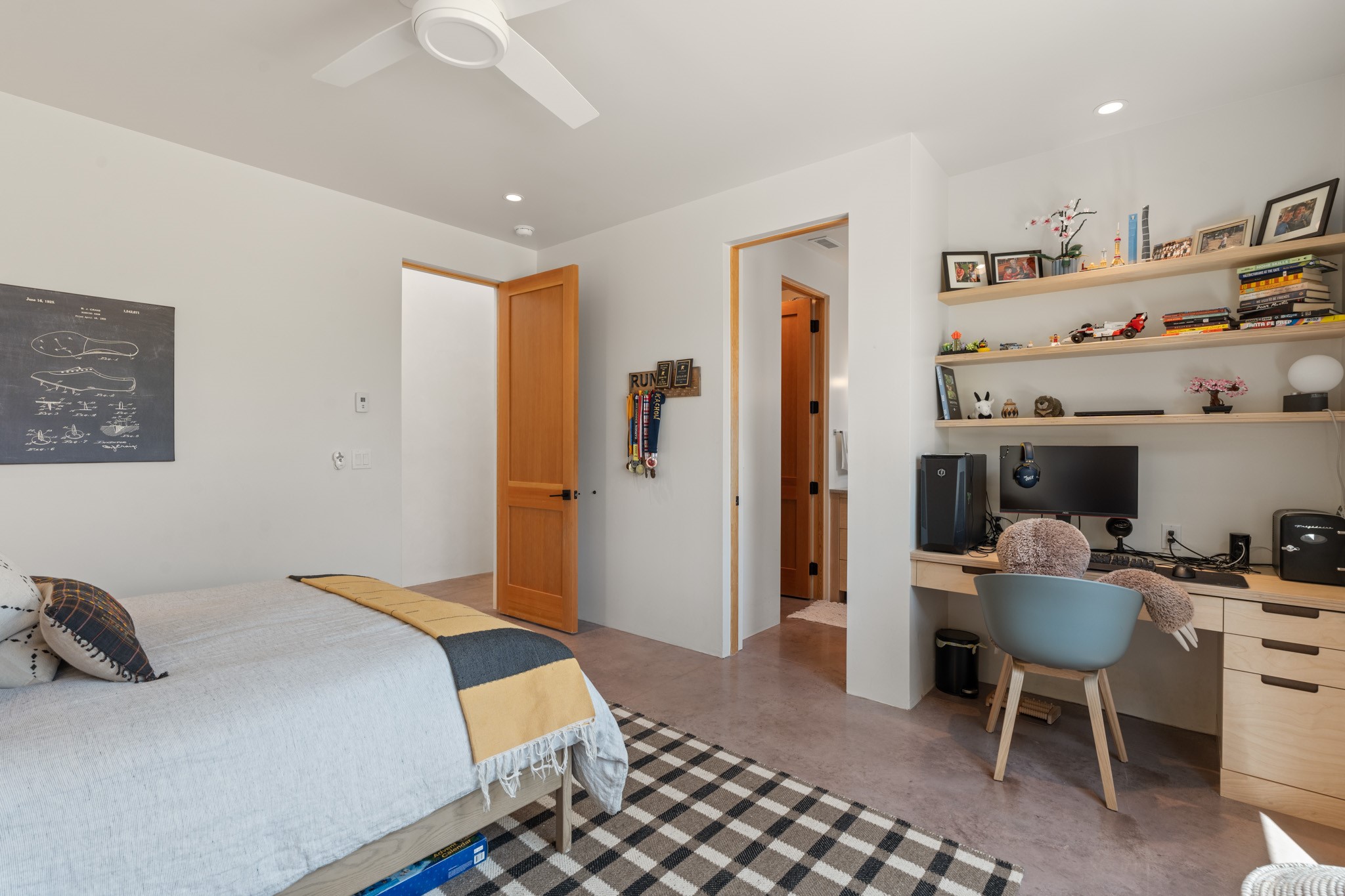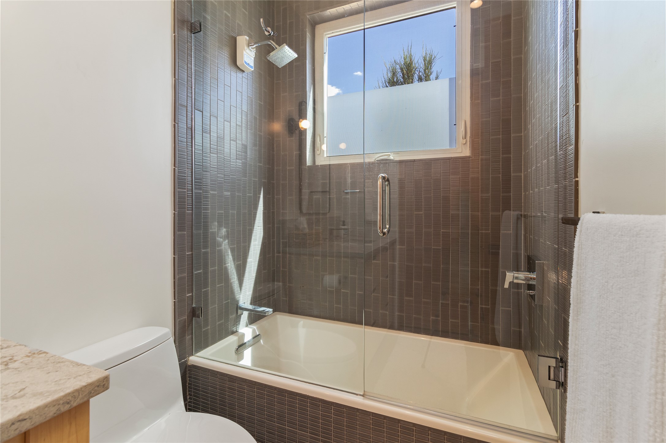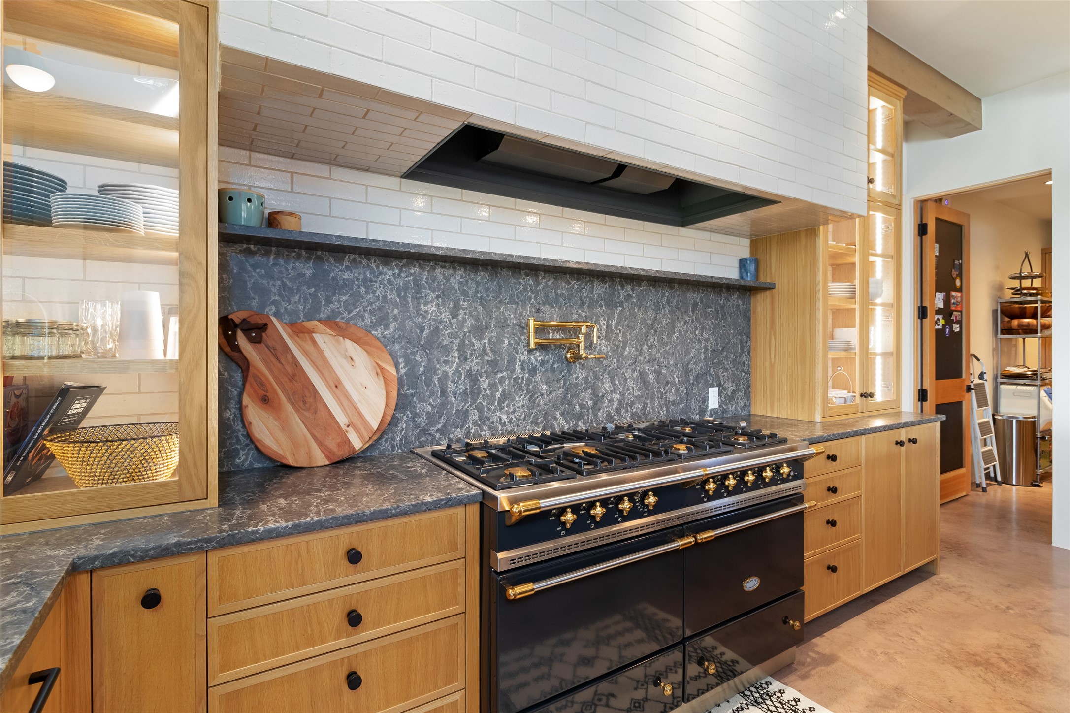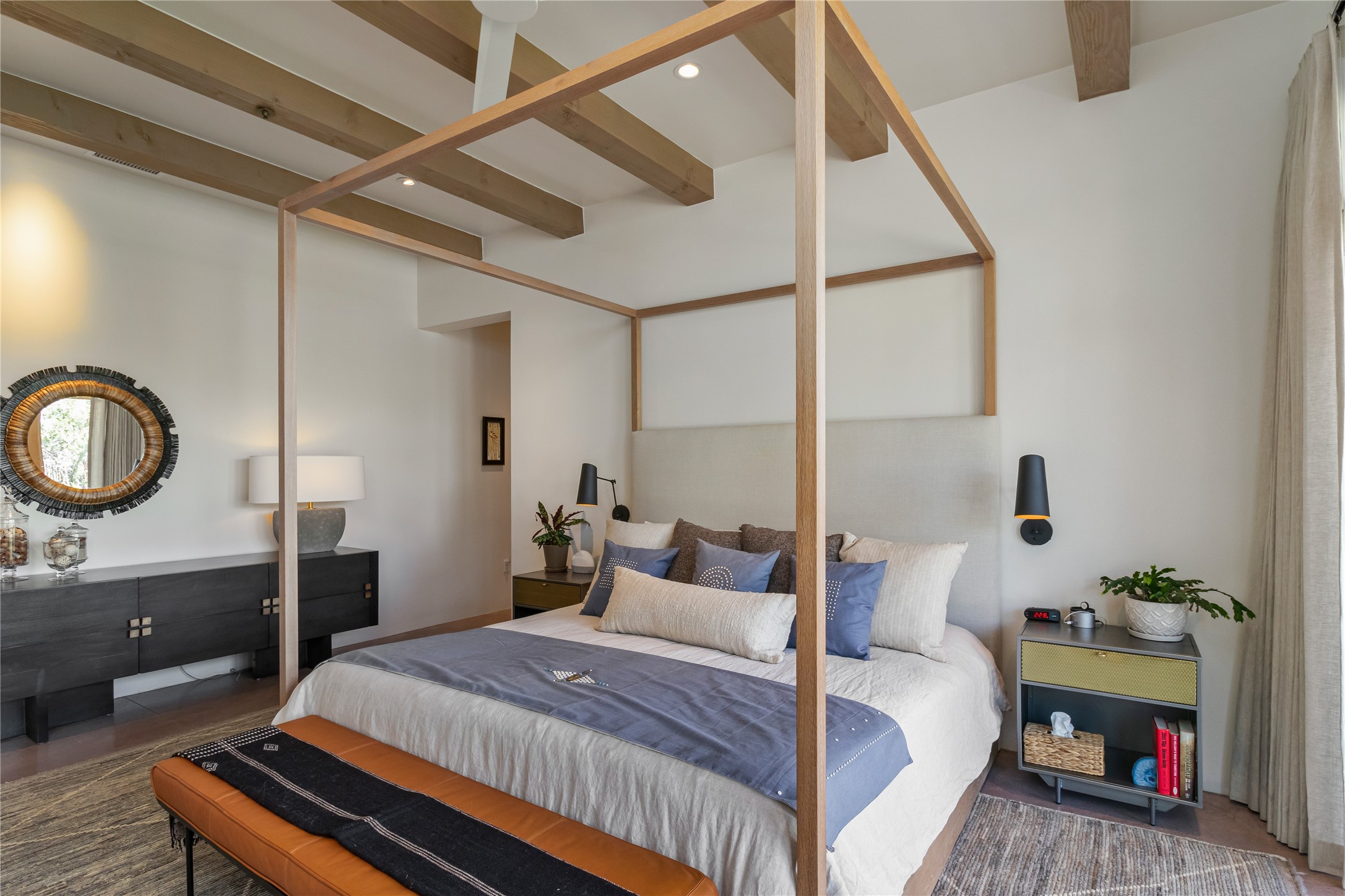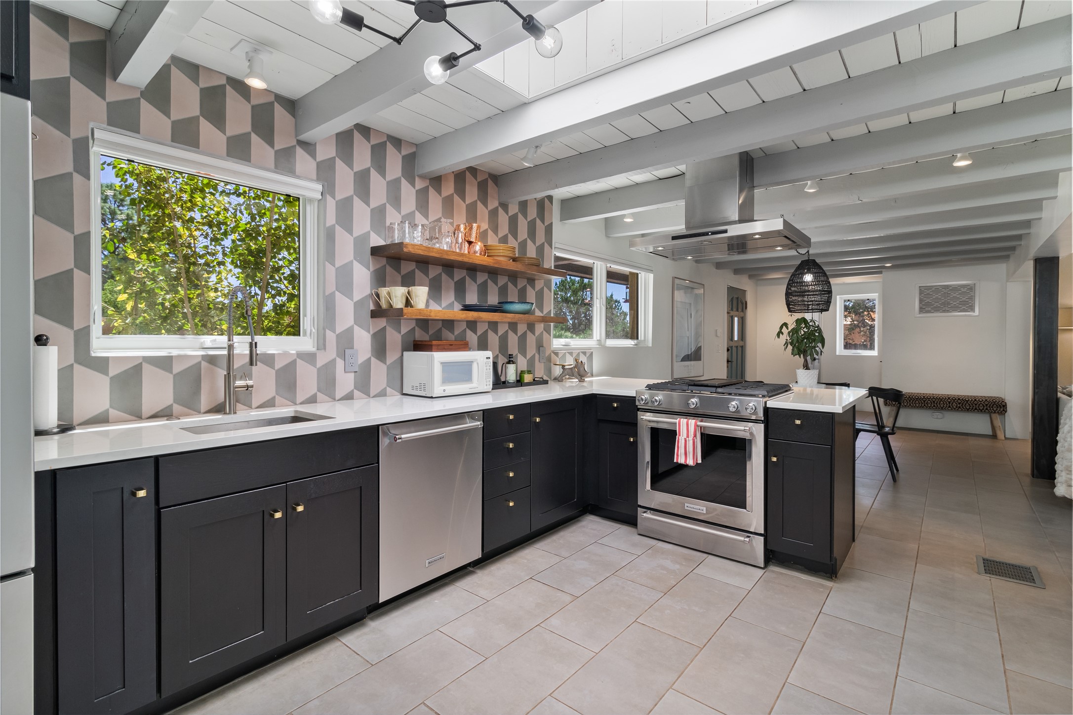 This exquisite 1-acre gated compound that's centrally located & just 2 miles from the historic Santa Fe Plaza features a masterfully designed main residence, spacious guest home, and 6 garage bays for collectors or creatives. The main home offers ~3,875 sq. ft. of refined living with Venetian plaster walls in public areas, custom cabinetry throughout, and 8-ft interior doors. The living and dining rooms feature an impressive dual aspect Ortal fireplace. Soaring ceilings and a wet bar with beverage drawers complete the living room, which opens to a ~1,700 sq. ft. covered patio. Multi-slide door systems open to this impressive patio, that includes built-in Bromic heaters and a 42 inch Wolf grill. The chef's kitchen is anchored by a Lacanche 7-burner stove, pot filler, Sub-Zero refrigerator and freezer, Wolf steam oven, Cove dishwasher and hot/cold tap. The butler's pantry has an abundance of storage, undermount lighting and Red/White EuroCave wine refrigerators. A serene primary suite includes a steam shower, soaking tub, room sized walk-in closet with island, and patio access. Smart touches include Sonos surround system, California Closets, electric patio shades, and a whole-house water filtration system. The guest house (~1,460 sq. ft.) offers generous privacy with a large living area, bedroom, and its own designer fireplace. An attached garage/storage wing (~1,853 sq. ft.) includes a standard 2-car bay plus an oversized 2+ bay garage with 10'x12' doors--ideal for small RVs, boats, or a home gym/studio. Both main and guest garages include EV hookup capabilities. Outdoors, enjoy lush landscaping by McCumber Fine Gardens, fruit trees, raised garden beds, a custom firepit and water feature, and ample space for entertaining--easily accommodating up to 100 guests. Additional highlights include steel electric gates, frosted glass garage doors, radiant heat in main home, and the most luxurious laundry/craft room you will find. This gated retreat is a one-of-a-kind compound.