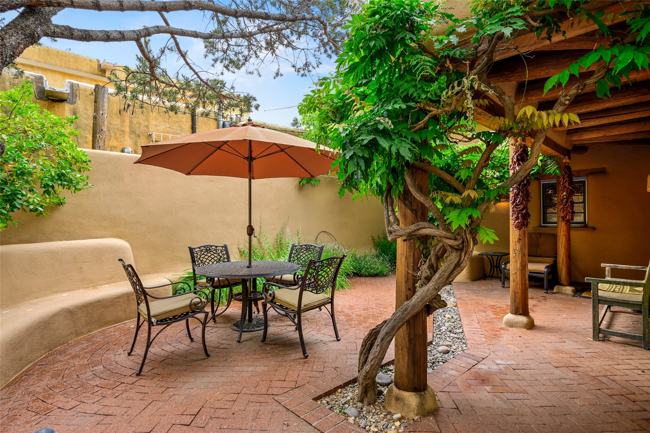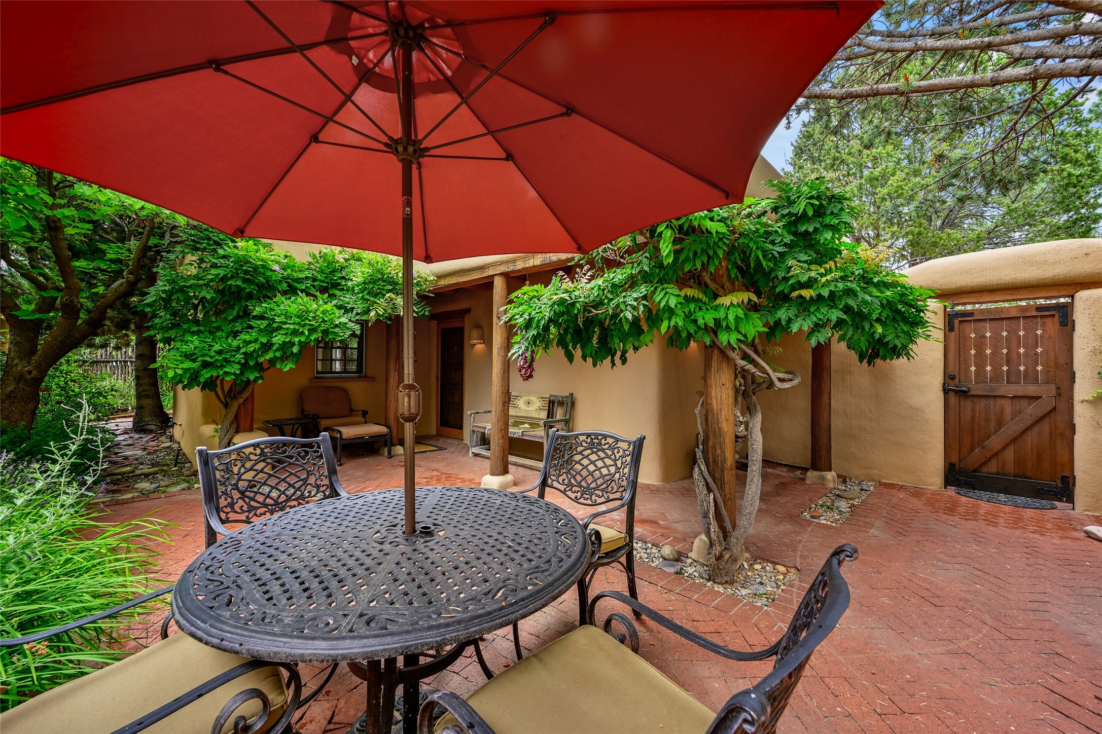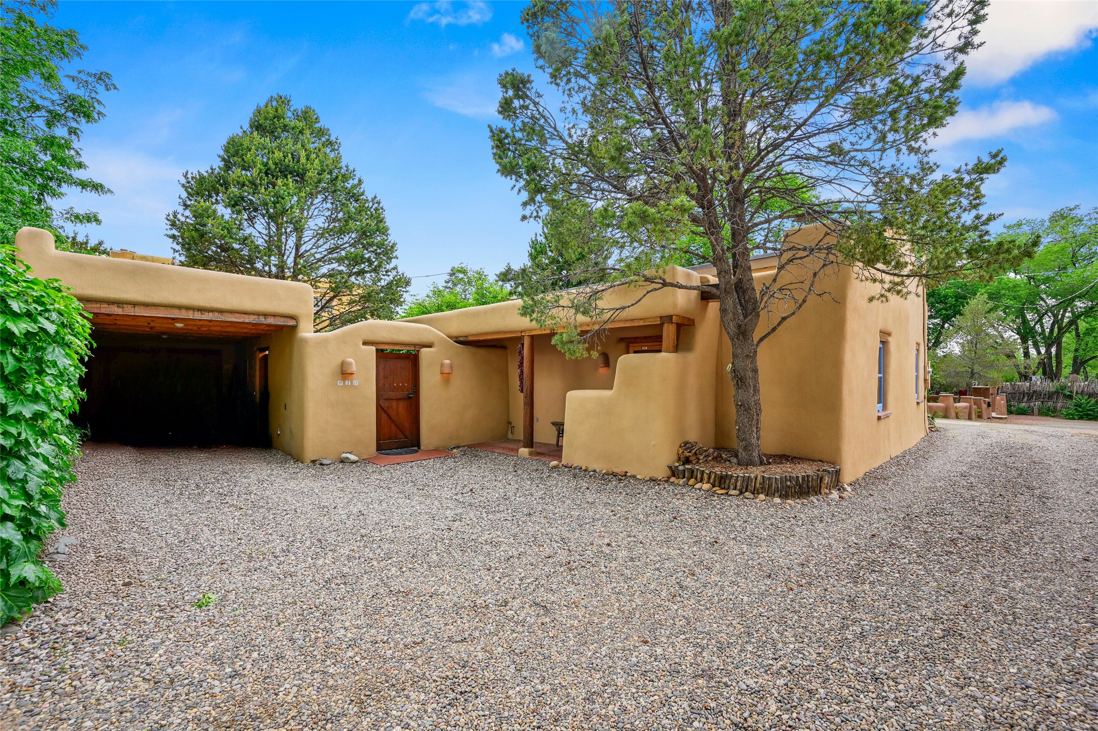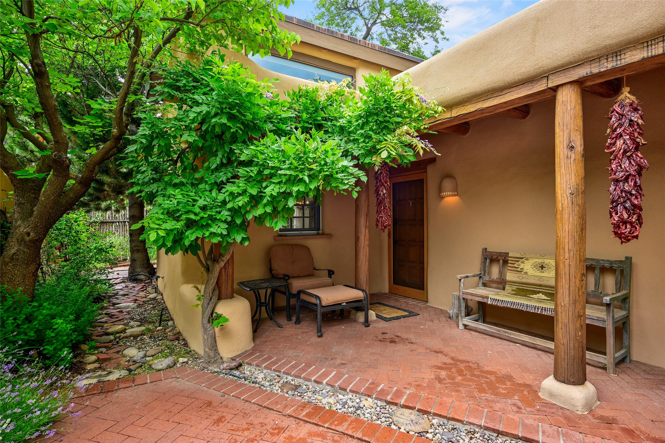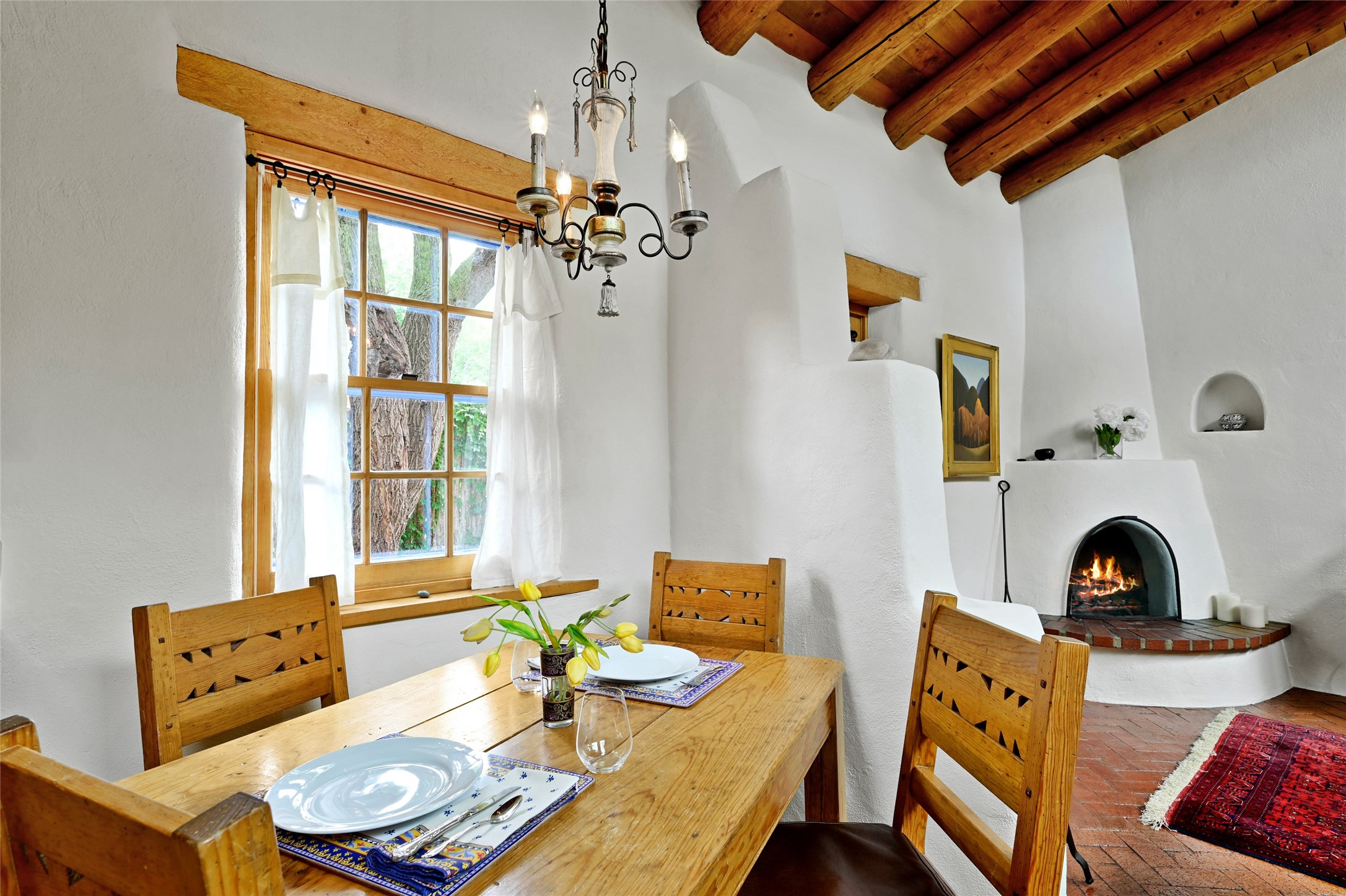 Authentic adobe and serene gardens tucked away on one of Santa Fe's most historic Eastside lanes. This private 2 bed / 1 bath home features classic territorial details--brick floors, high viga ceilings, and two traditional kiva fireplaces. The open living area includes a cozy sitting room, dining area, and warm kitchen. One bedroom has exterior access and a second kiva; the second offers flexible use. A full bath with adjacent laundry serves both rooms. A half-lite door leads to a landscaped courtyard with a beautiful, mature apricot tree and drip irrigation--ideal for outdoor living or gardening. Front courtyard with portal and dining area connects home to a 1-car carport with storage. On-demand boiler for radiant heat and domestic water. Single-level, no interior steps. Minutes to Canyon Road and the Plaza. A true Eastside gem offering history, privacy, and timeless charm.