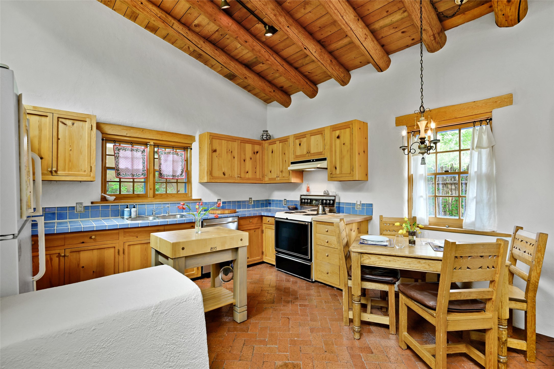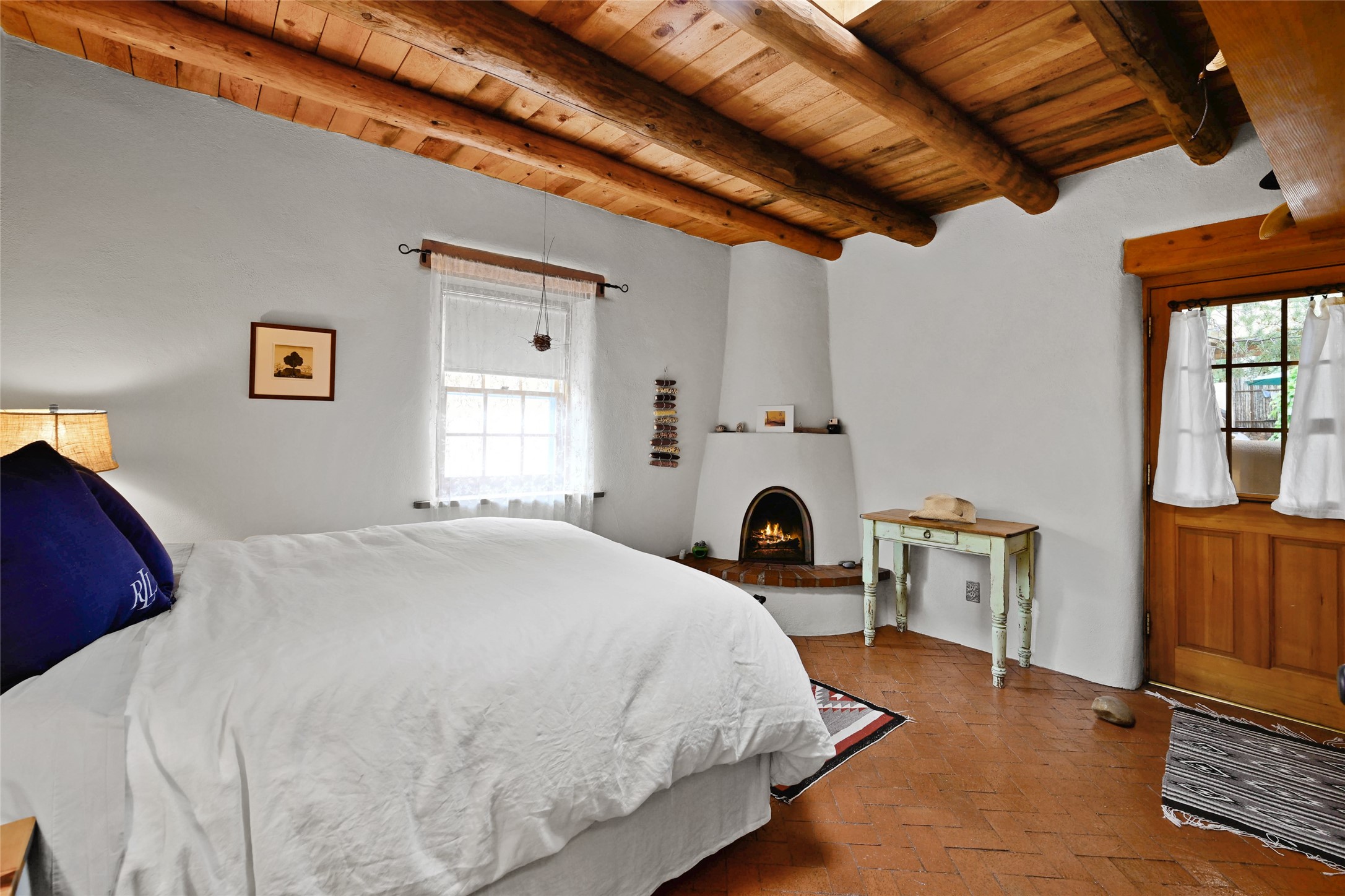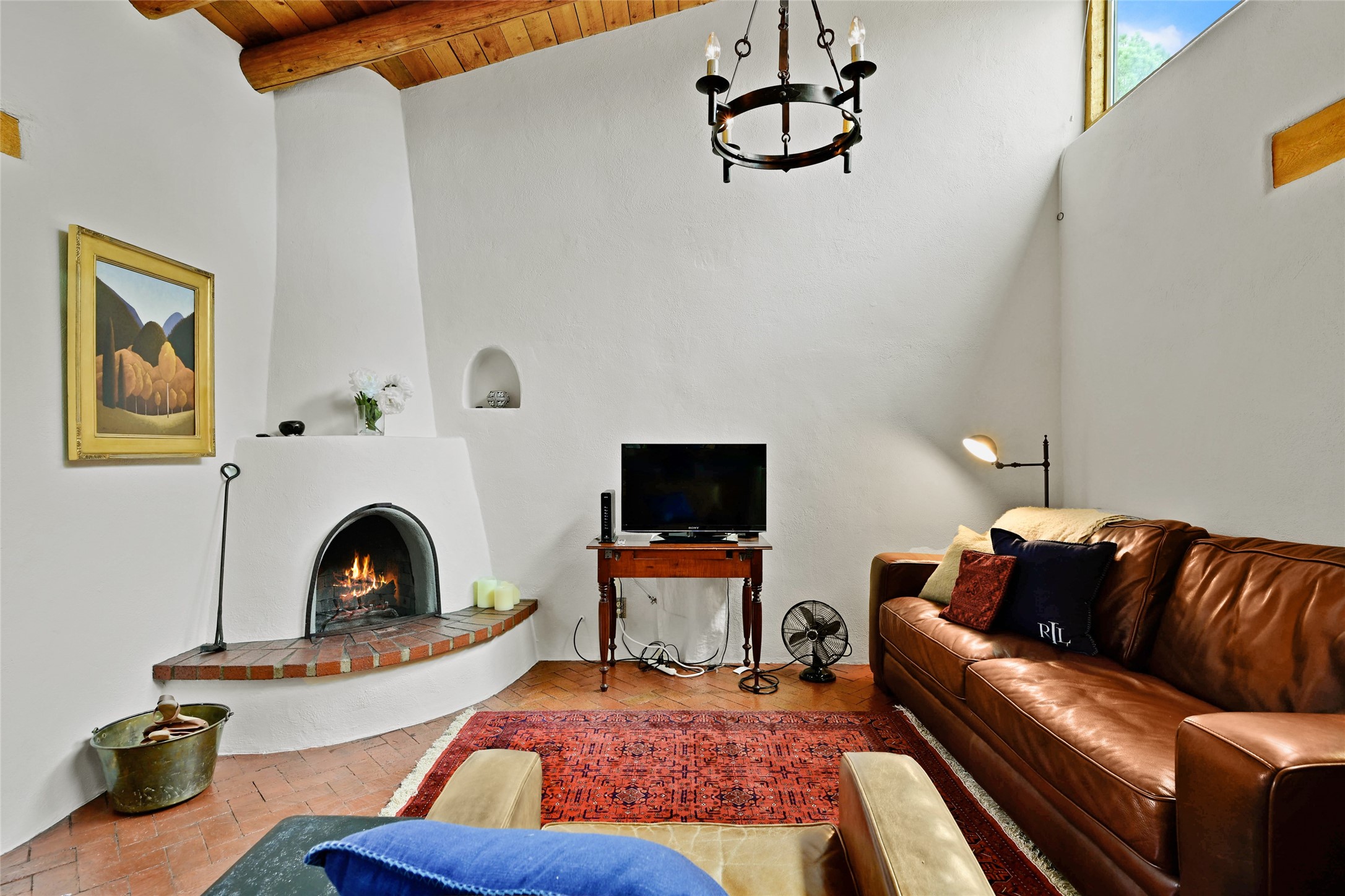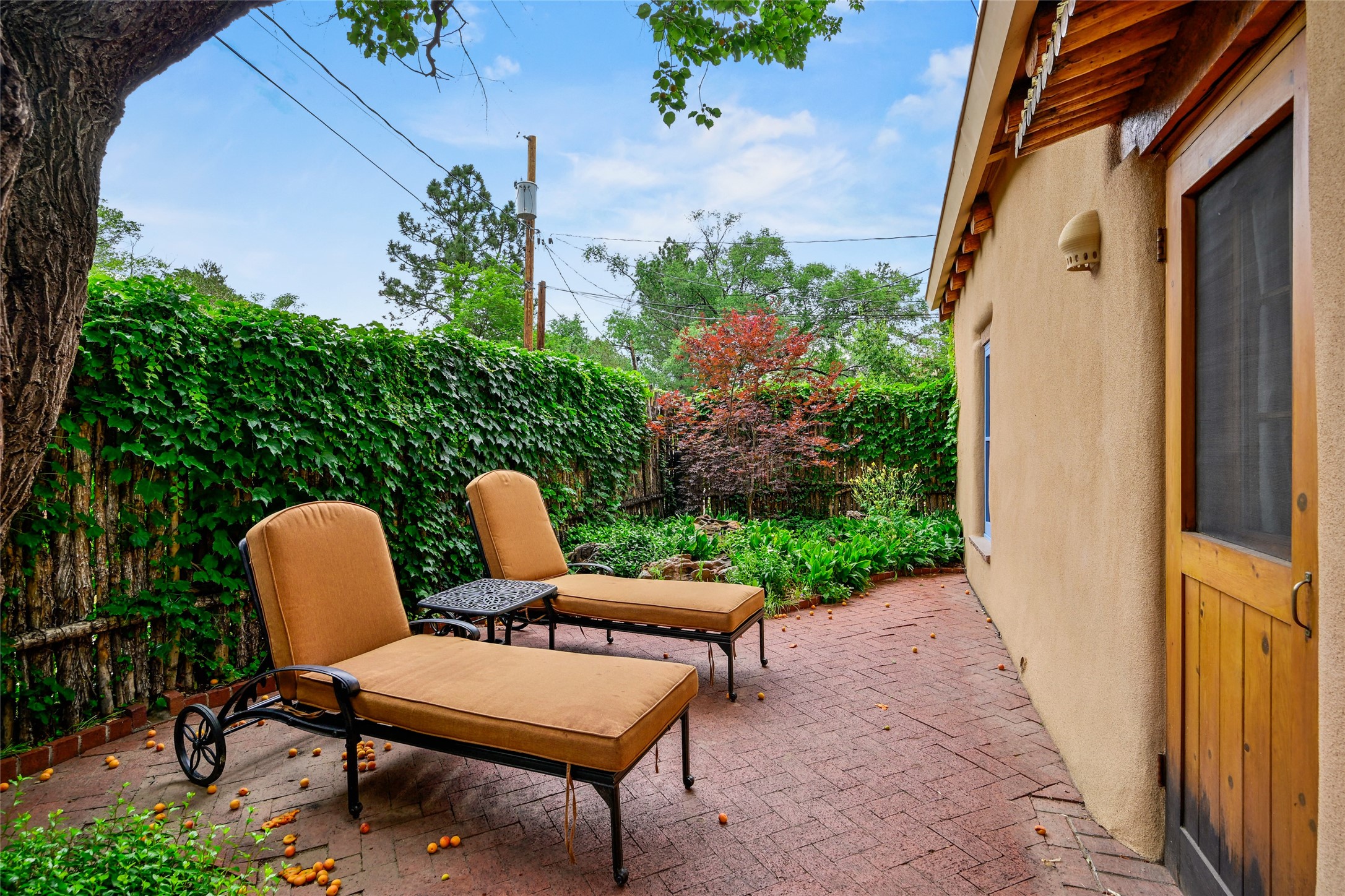 Authentic adobe and serene gardens tucked away on one of Santa Fe's most historic Eastside lanes. This private 2 bed / 1 bath home features classic territorial details--brick floors, high viga ceilings, and two traditional kiva fireplaces. The open living area includes a cozy sitting room, dining area, and warm kitchen. One bedroom has exterior access and a second kiva; the second offers flexible use. A full bath with adjacent laundry serves both rooms. A half-lite door leads to a landscaped courtyard with a beautiful, mature apricot tree and drip irrigation--ideal for outdoor living or gardening. Front courtyard with portal and dining area connects home to a 1-car carport with storage. On-demand boiler for radiant heat and domestic water. Single-level, no interior steps. Minutes to Canyon Road and the Plaza. A true Eastside gem offering history, privacy, and timeless charm.