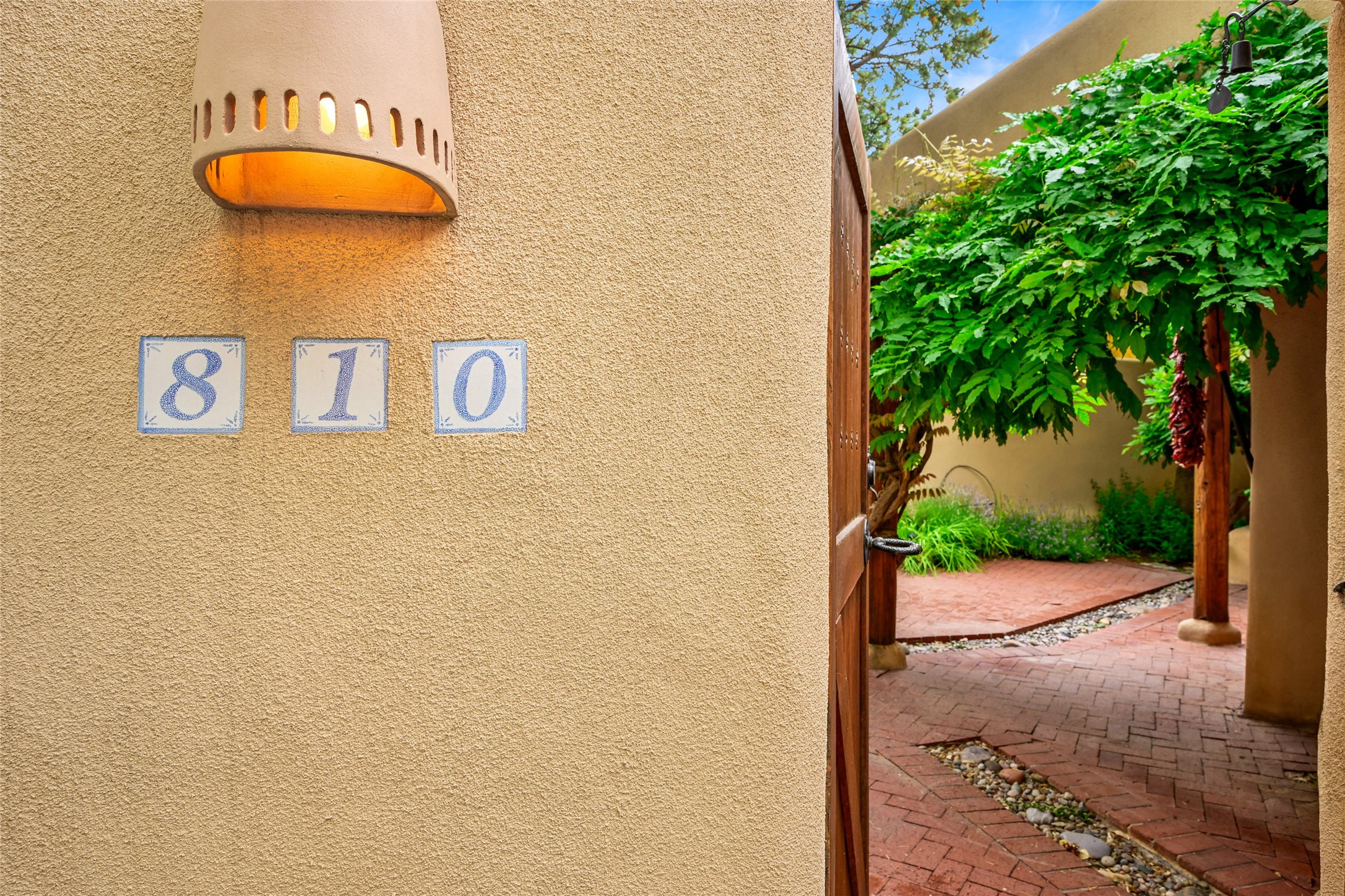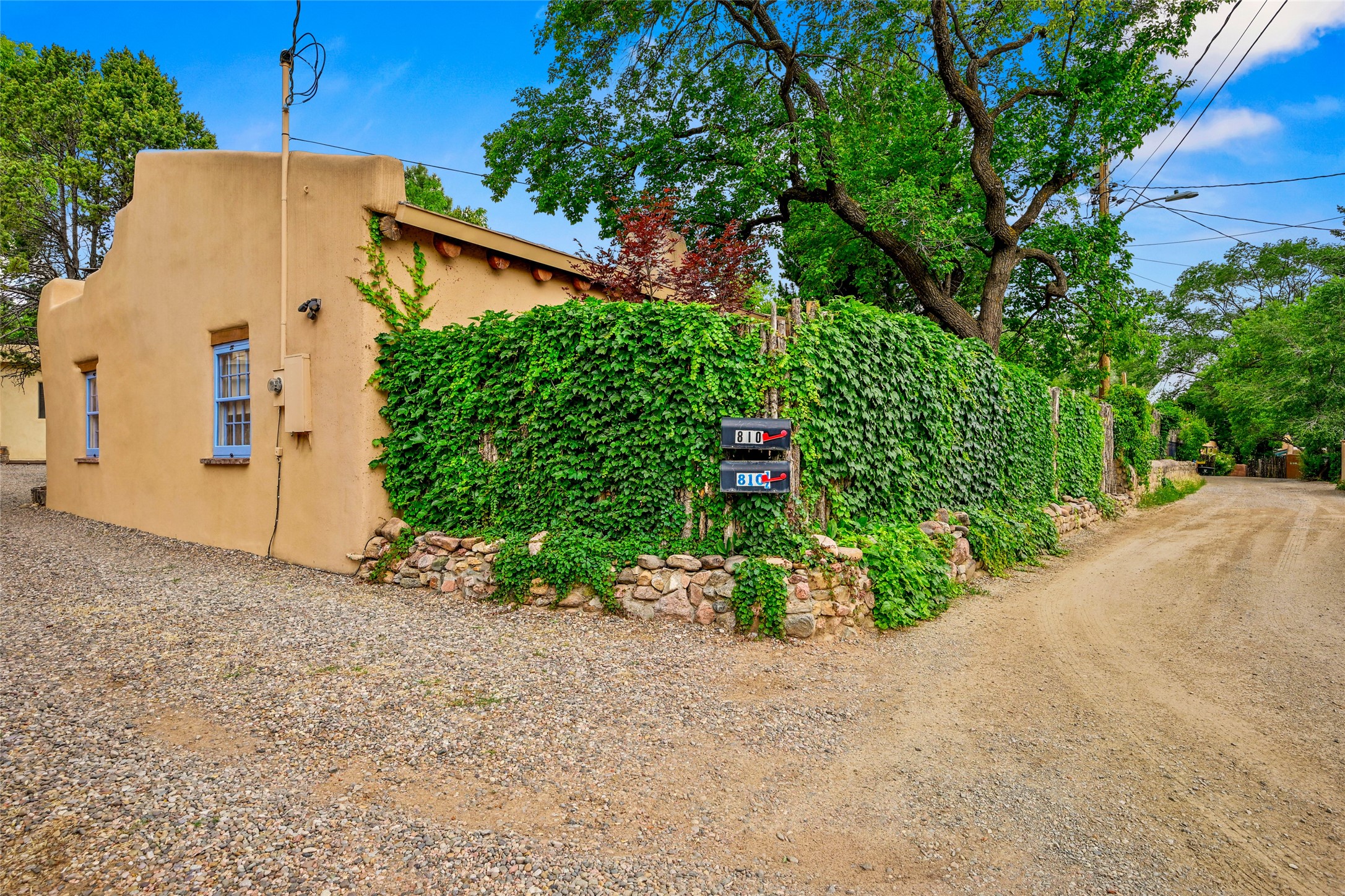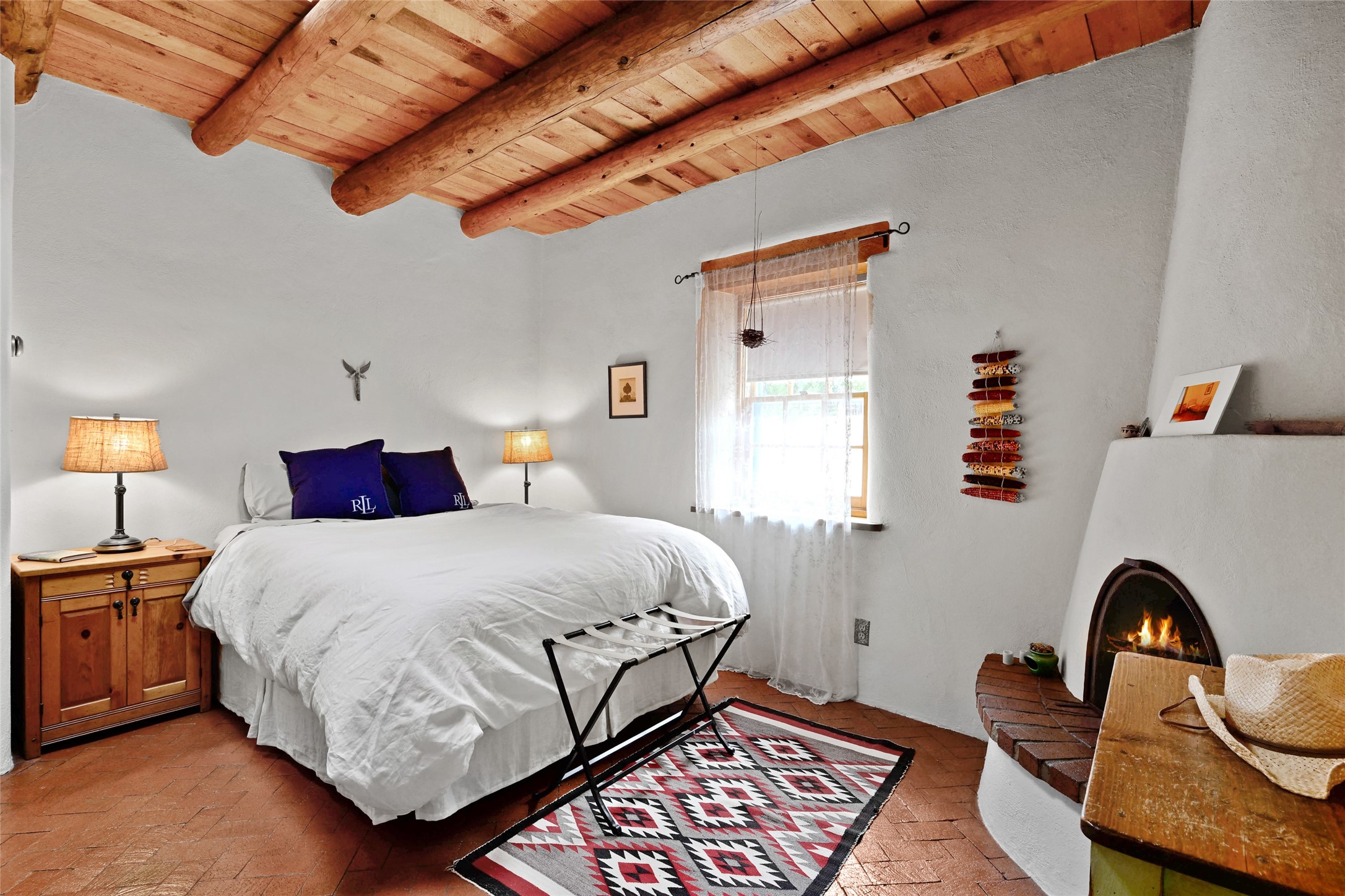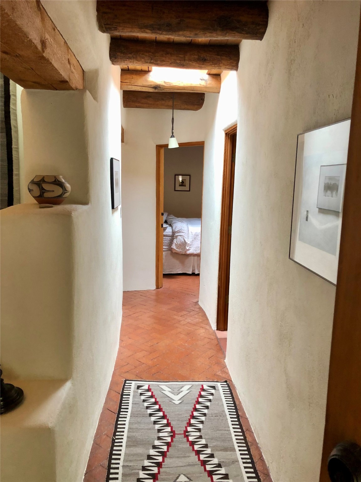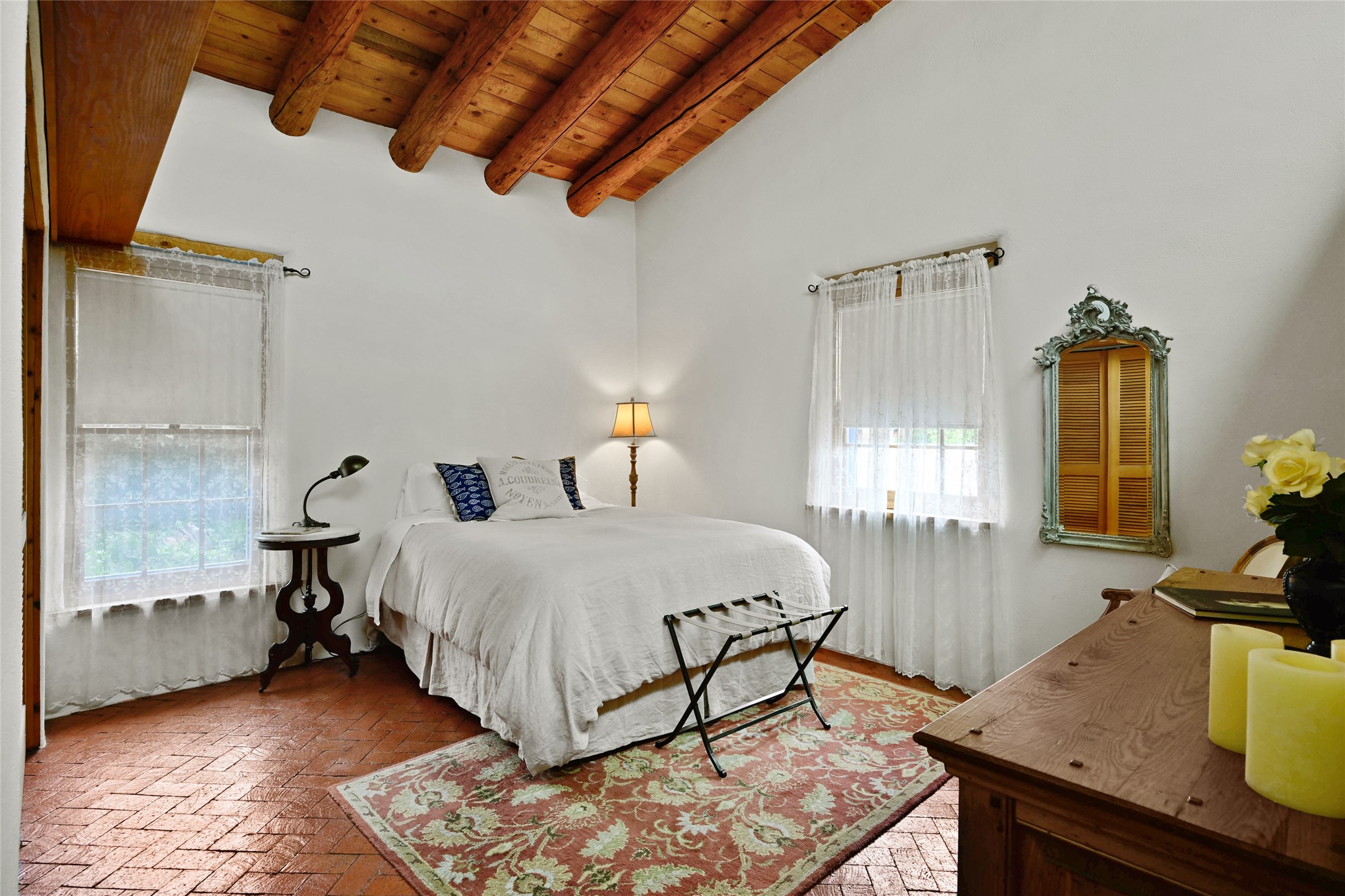 Authentic adobe and serene gardens tucked away on one of Santa Fe's most historic Eastside lanes. This private 2 bed / 1 bath home features classic territorial details--brick floors, high viga ceilings, and two traditional kiva fireplaces. The open living area includes a cozy sitting room, dining area, and warm kitchen. One bedroom has exterior access and a second kiva; the second offers flexible use. A full bath with adjacent laundry serves both rooms. A half-lite door leads to a landscaped courtyard with a beautiful, mature apricot tree and drip irrigation--ideal for outdoor living or gardening. Front courtyard with portal and dining area connects home to a 1-car carport with storage. On-demand boiler for radiant heat and domestic water. Single-level, no interior steps. Minutes to Canyon Road and the Plaza. A true Eastside gem offering history, privacy, and timeless charm.