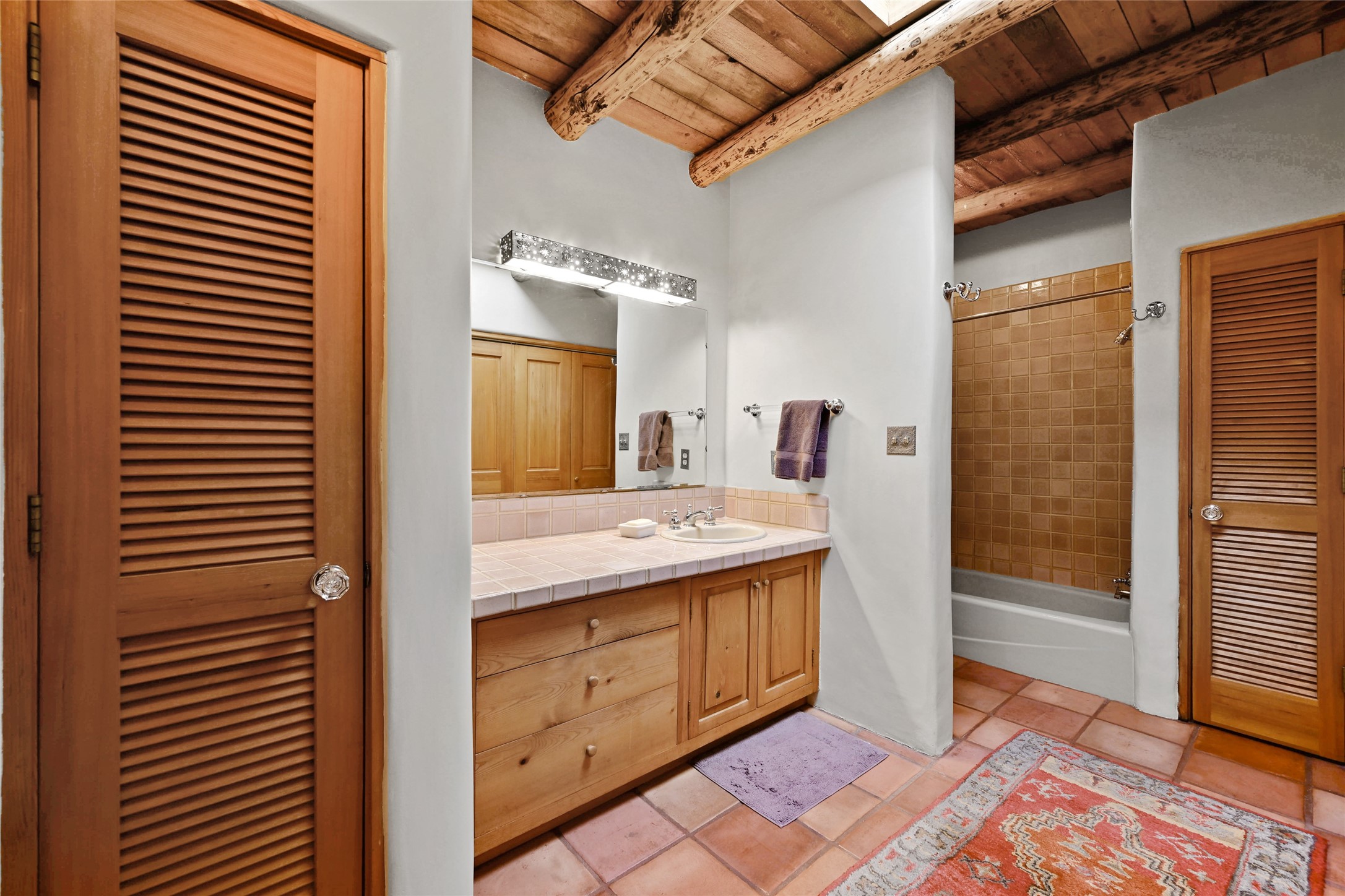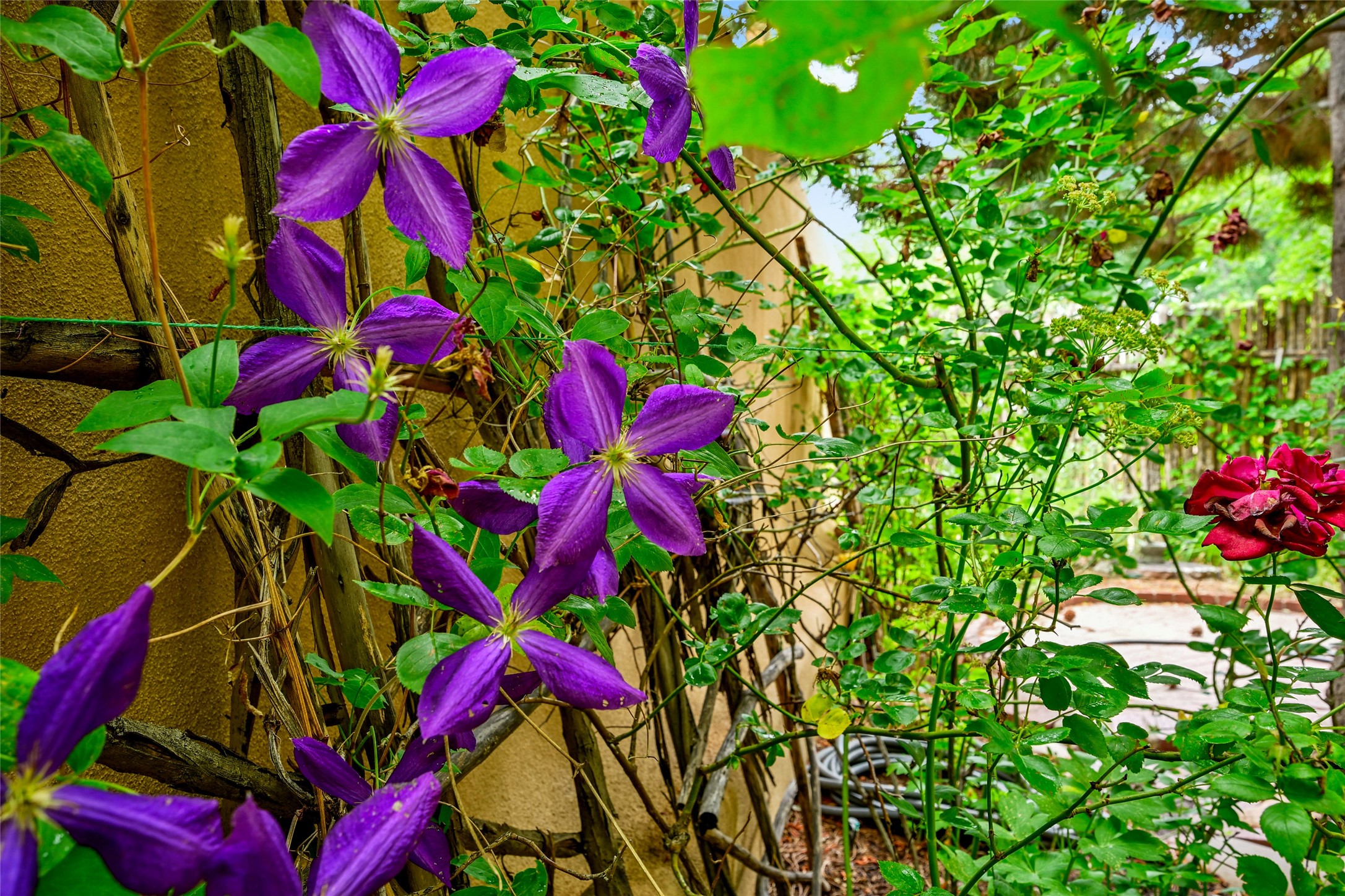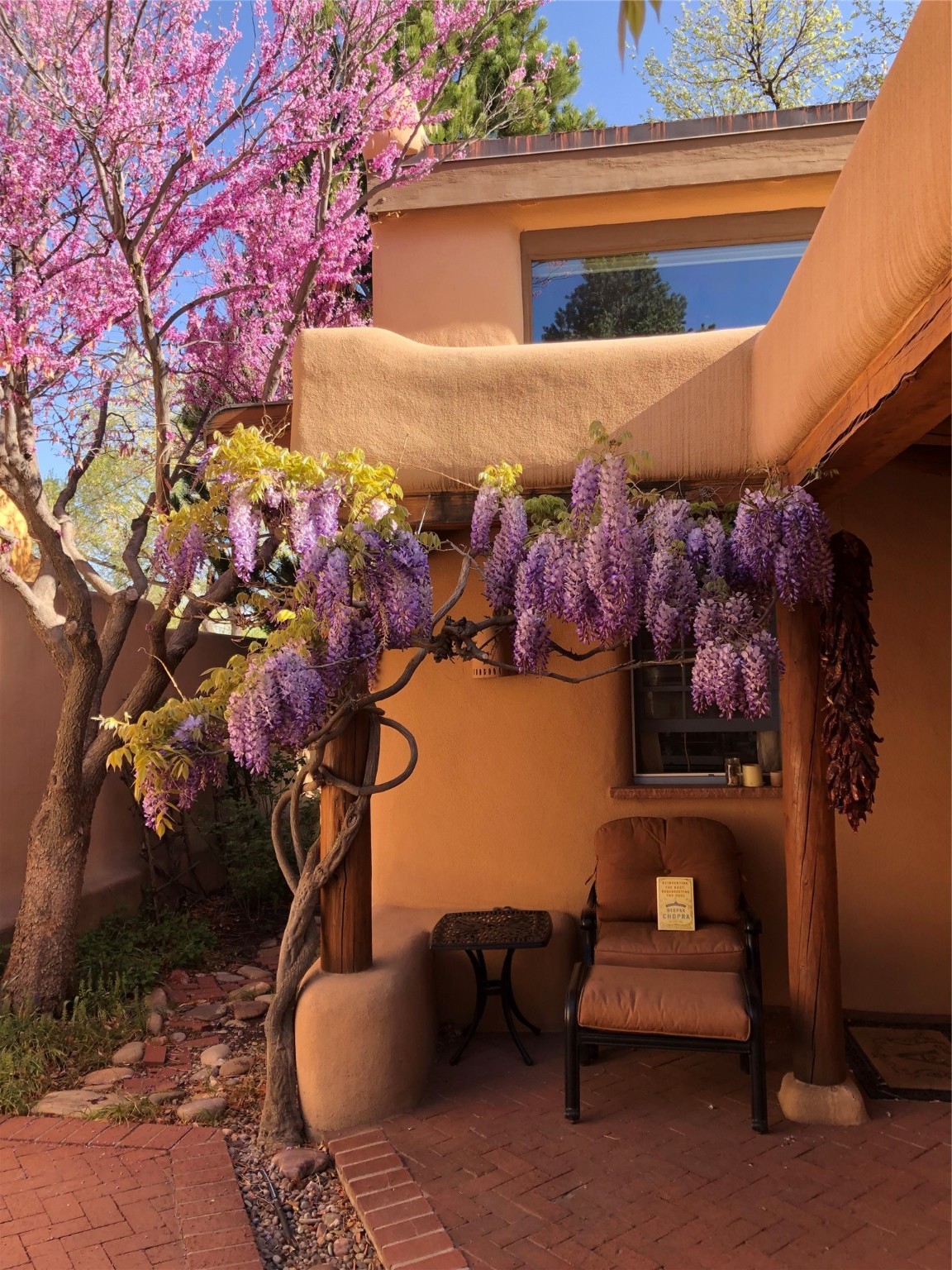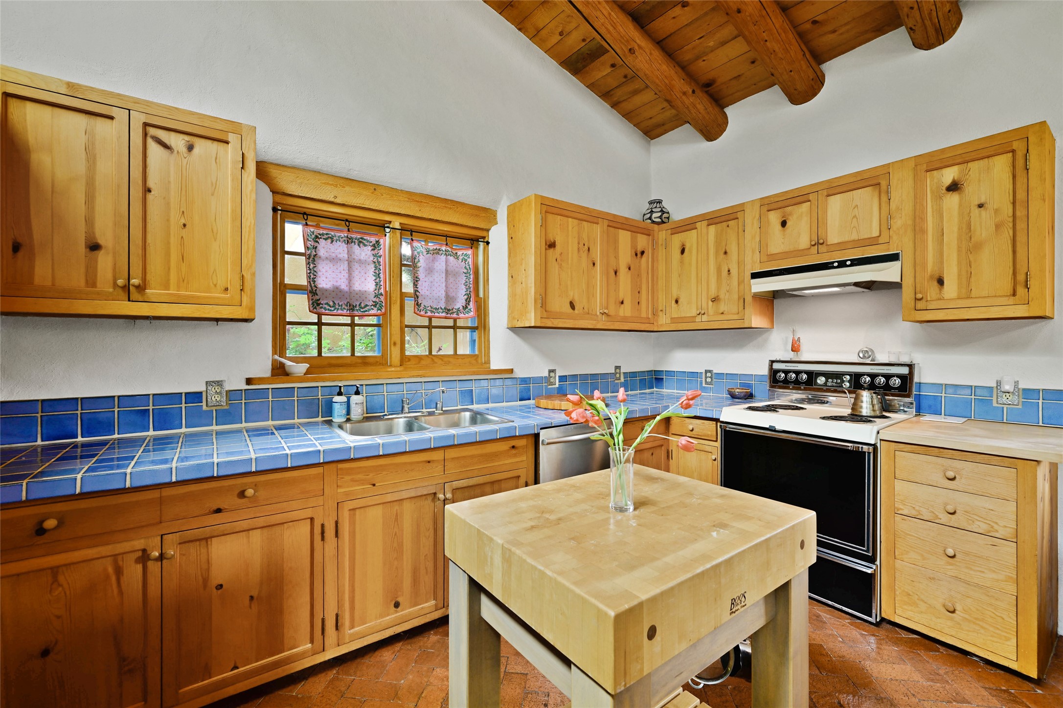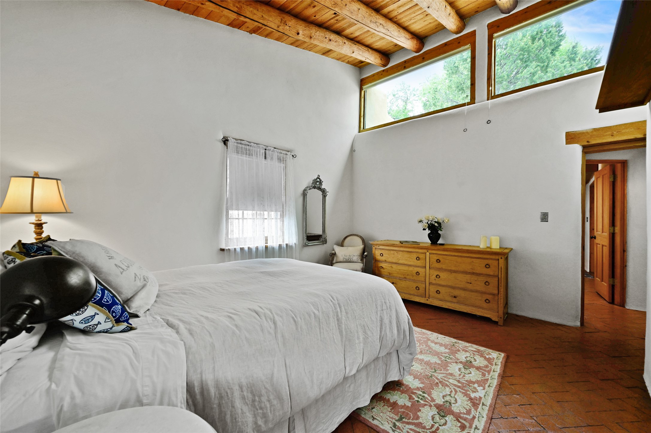 Authentic adobe and serene gardens tucked away on one of Santa Fe's most historic Eastside lanes. This private 2 bed / 1 bath home features classic territorial details--brick floors, high viga ceilings, and two traditional kiva fireplaces. The open living area includes a cozy sitting room, dining area, and warm kitchen. One bedroom has exterior access and a second kiva; the second offers flexible use. A full bath with adjacent laundry serves both rooms. A half-lite door leads to a landscaped courtyard with a beautiful, mature apricot tree and drip irrigation--ideal for outdoor living or gardening. Front courtyard with portal and dining area connects home to a 1-car carport with storage. On-demand boiler for radiant heat and domestic water. Single-level, no interior steps. Minutes to Canyon Road and the Plaza. A true Eastside gem offering history, privacy, and timeless charm.