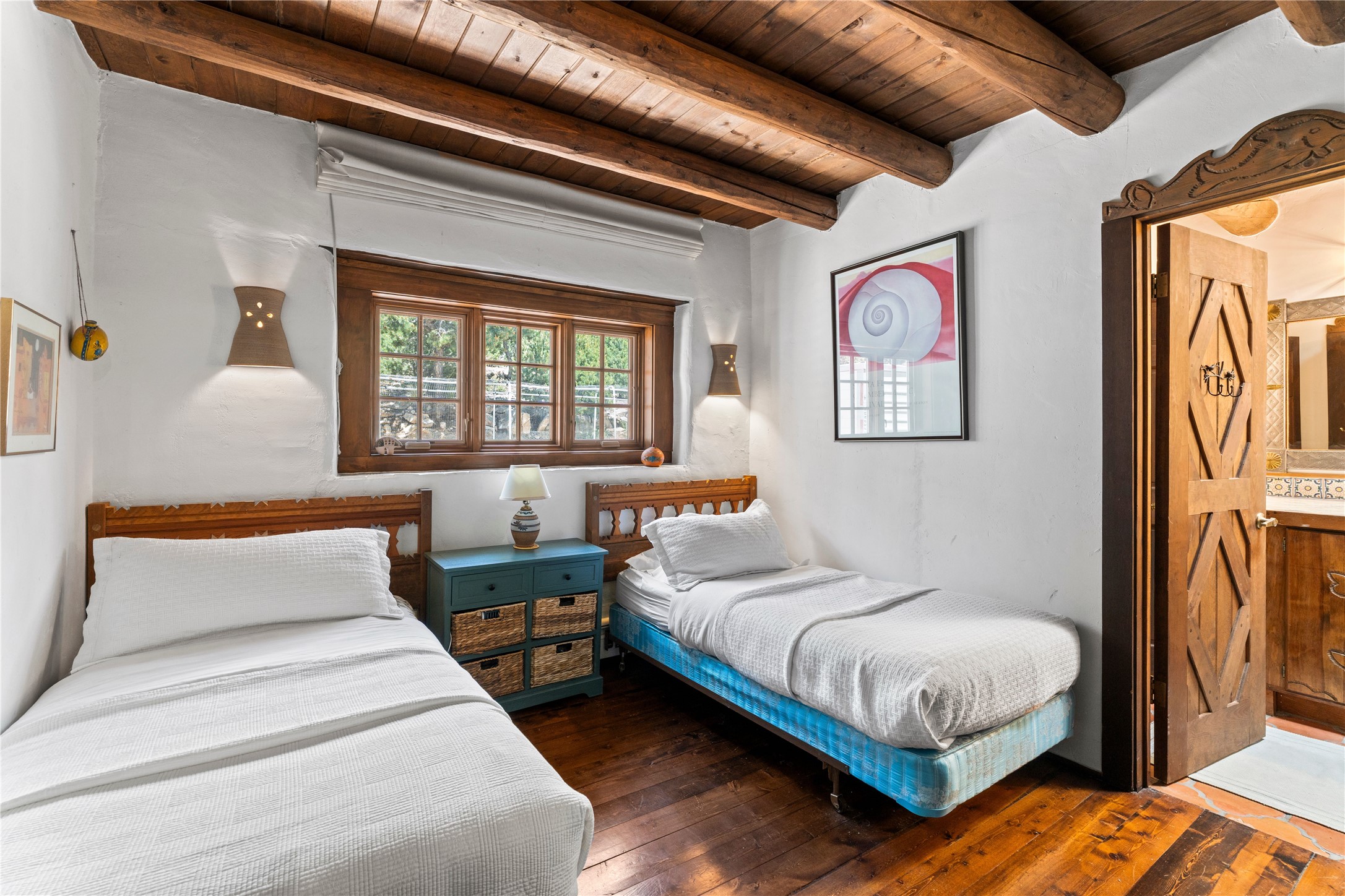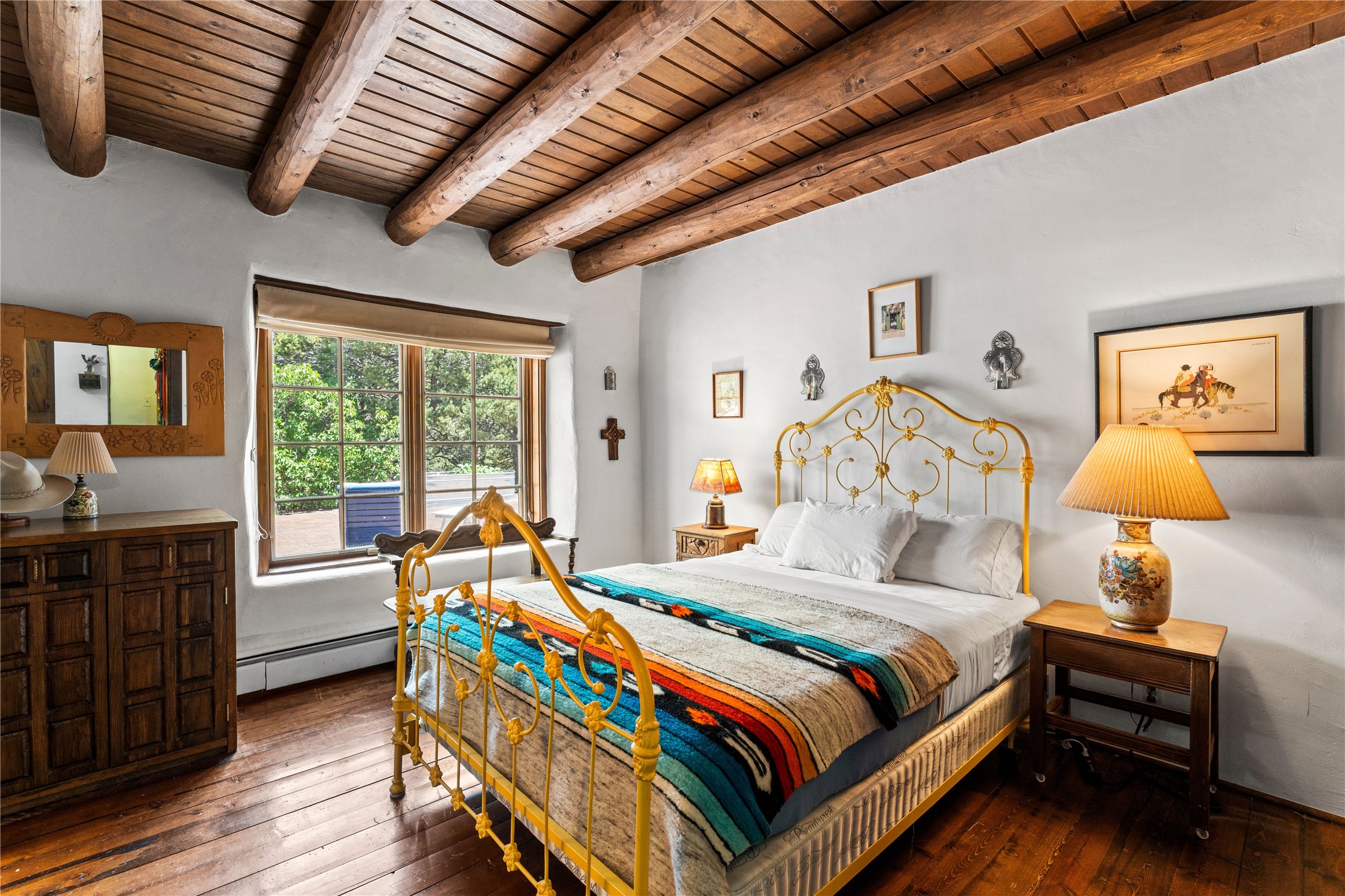 Authentic Vintage Santa Fe with gigantic views of the Sandia mountains all the way north to the Jemez mountains and up to nearly Colorado. | Ideal Short-Term Rental or Mountain Escape. Perched high in the Sangre de Cristo foothills, above and across from 10,000 Waves, this charming Santa Fe mountain home captures the magic of a Santa Fe lodge with all the feel-good vibes in sought-after Hyde Park Estates, perfectly situated between downtown Santa Fe and Ski Santa Fe--an ideal base for outdoor adventures, summer camp-style gatherings, or cozy winter lodge getaways.The best views in Hyde Park Estates, classic thick adobe walls, arched doorways, and hand-carved woodwork create an experiential ambiance. Expansive windows and multiple decks open to panoramic mountain views stretching to Colorado. Watch dramatic storms roll in or unwind to vibrant sunsets. Inside, the flexible floor plan features four bedrooms and three baths, designed for both privacy and connection. Multiple kiva fireplaces, a formal living and dining area, and a penthouse-style owner's suite with sweeping northern views make this home a true mountain sanctuary. Nearly every room opens to outdoor spaces, inviting a seamless indoor-outdoor lifestyle--perfect for entertaining, yoga mornings, or quiet reflection by the fire.The spacious brick patio sets the scene for outdoor dining, stargazing, or a future outdoor kitchen. Mature native landscaping, and stone walls abound. La Casa de la Familia is a paradise. Mature pion trees yield fresh pine nuts, while the automatic irrigation system keeps it all flourishing with ease. With updated appliances, disciplined maintenance, and solar electricity, whether you're looking for a well maintained short-term rental investment, a private family retreat, or a base camp for adventure, 2137 Paseo Ponderosa offers an opportunity to own a piece of Santa Fe's mountain magic. Consistently maintained and in great shape. Check out the video tour!
