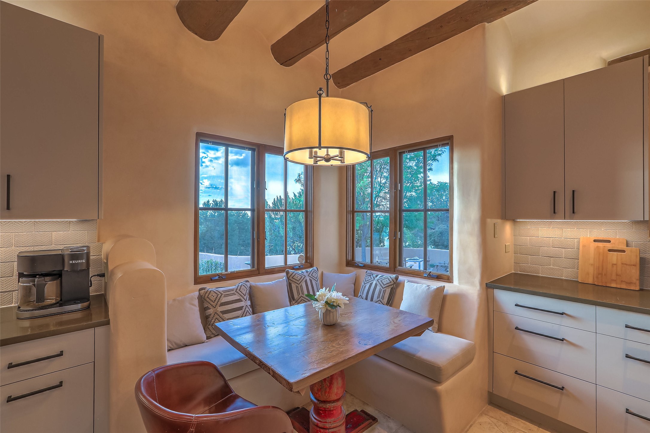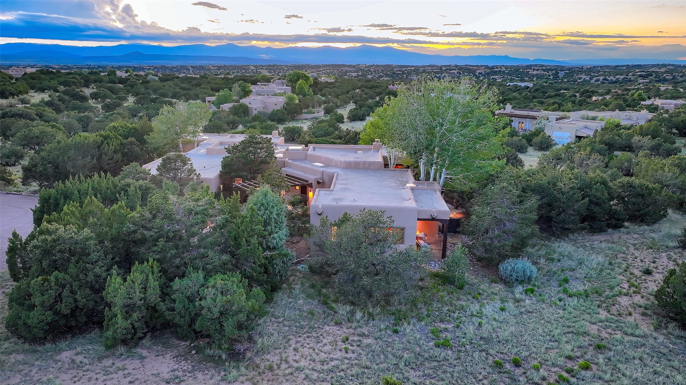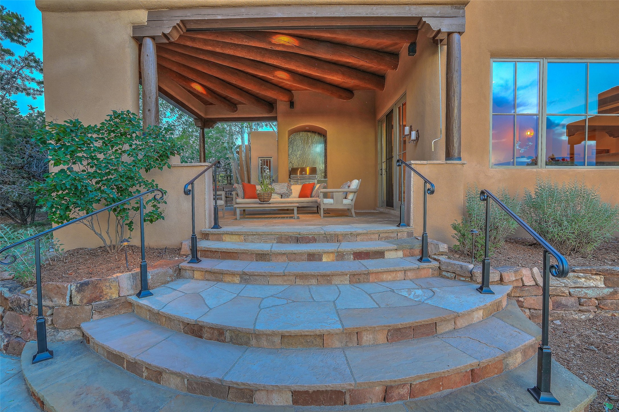 A past Showcase winner of the Grand Haciendas Parade of Homes, this newly upgraded Las Campanas beauty is luxurious and lovingly maintained. Impeccably remodeled with elegant and thoughtful upgrades and finishes throughout. Entering on a curving driveway this home is set back from the road and is extremely private. Mature trees and lovingly cared for yard and grounds. The views of Los Alamos and of the Jemez mountains and sunset views are breathtaking and always unique. This split 3 bedroom suite home has the Master Bedroom in a private wing with an adjacent den. Each bedroom has access to a private outdoor sitting area. The newer, beautiful contemporary kitchen with breakfast nook, has newer Thermador appliances. Bright inside with plaster walls and high viga ceilings throughout and the home includes travertine tile floors and quartz countertops. Ready for the new owner to enjoy this breathtaking Santa Fe home oasis. The dining and living room areas have easy access to a fabulous portal for outdoor al fresco enjoyment and relaxation with a fireplace and built-in outdoor gas grill. Adjacent areas thoughtfully designed outside patio spaces for additional enjoyment of Santa Fe's lovely starry night skies. Fountains and carefully cared for landscaping also surround the home. High quality Sonas sound technology system. About 866sf 3 car garage with cedar storage closet. Approximately 612sf total outdoor portal spaces which are comprised of 5 covered portals. On demand hot water system with a newer Kinetico whole house water softener system. About 10 minutes to town. We look forward to showing you this home, and we welcome you to come and see this distinguished home soon!