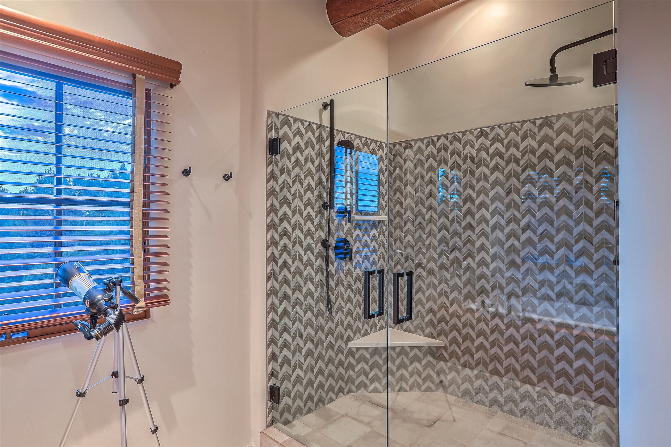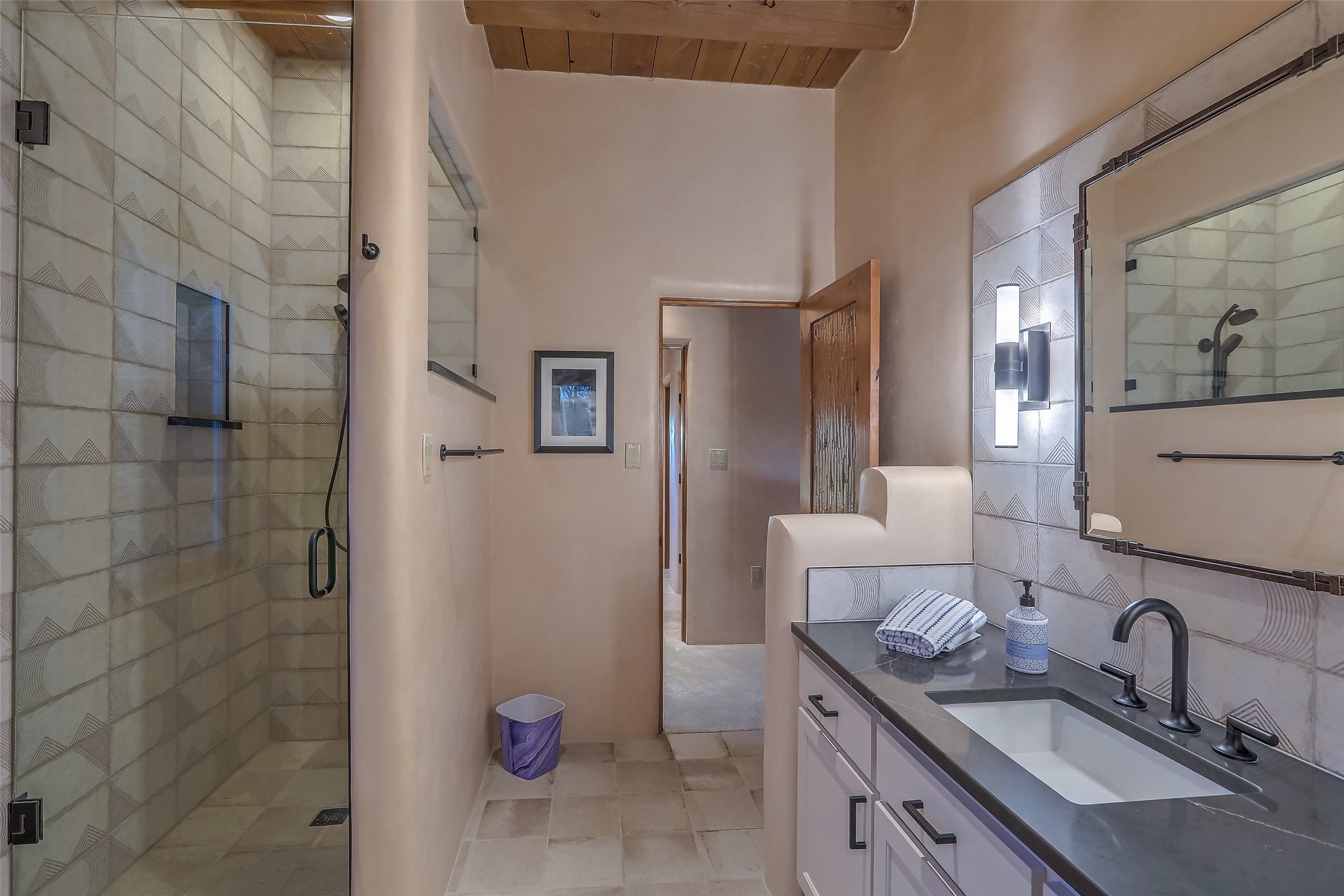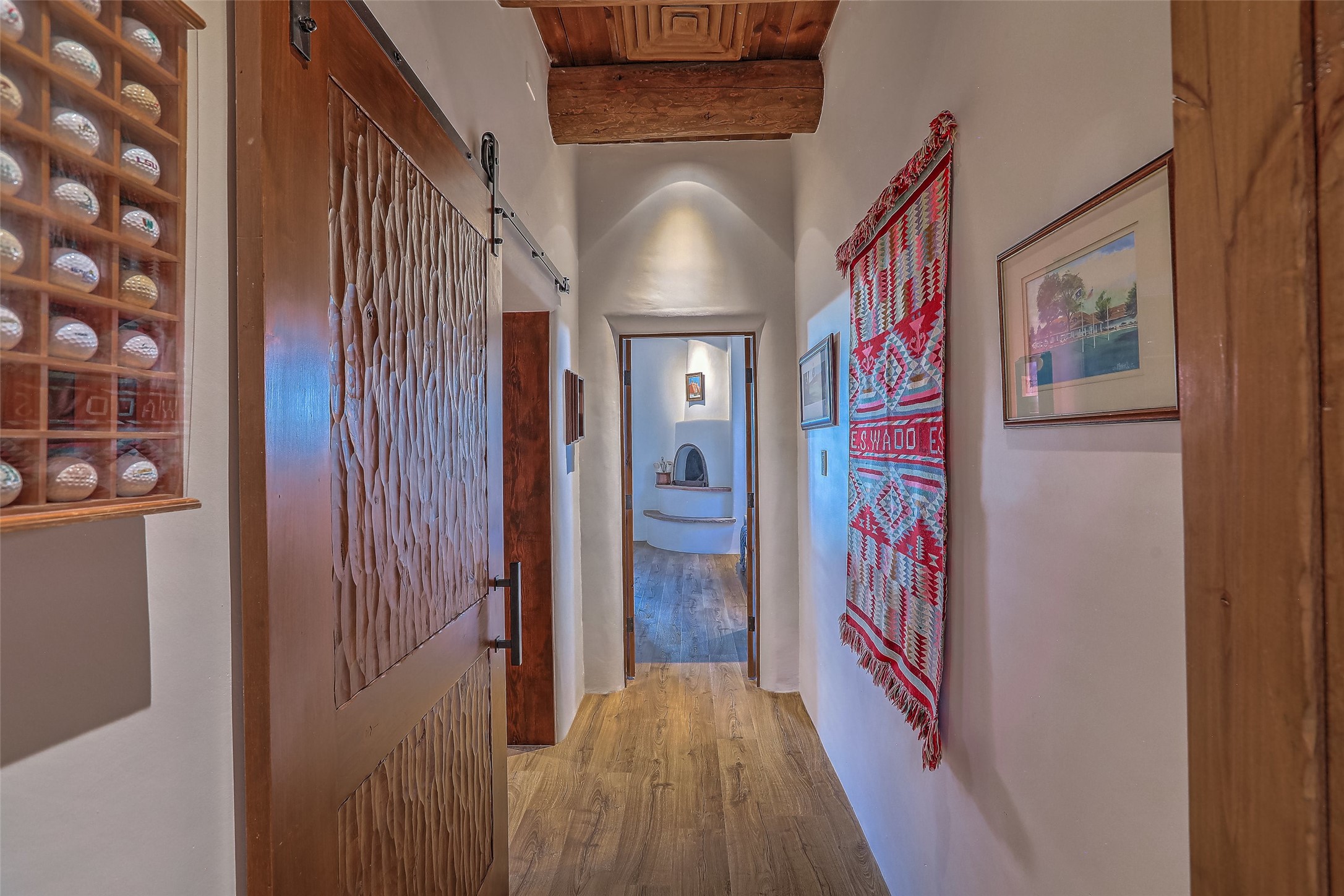 A past Showcase winner of the Grand Haciendas Parade of Homes, this newly upgraded Las Campanas beauty is luxurious and lovingly maintained. Impeccably remodeled with elegant and thoughtful upgrades and finishes throughout. Entering on a curving driveway this home is set back from the road and is extremely private. Mature trees and lovingly cared for yard and grounds. The views of Los Alamos and of the Jemez mountains and sunset views are breathtaking and always unique. This split 3 bedroom suite home has the Master Bedroom in a private wing with an adjacent den. Each bedroom has access to a private outdoor sitting area. The newer, beautiful contemporary kitchen with breakfast nook, has newer Thermador appliances. Bright inside with plaster walls and high viga ceilings throughout and the home includes travertine tile floors and quartz countertops. Ready for the new owner to enjoy this breathtaking Santa Fe home oasis. The dining and living room areas have easy access to a fabulous portal for outdoor al fresco enjoyment and relaxation with a fireplace and built-in outdoor gas grill. Adjacent areas thoughtfully designed outside patio spaces for additional enjoyment of Santa Fe's lovely starry night skies. Fountains and carefully cared for landscaping also surround the home. High quality Sonas sound technology system. About 866sf 3 car garage with cedar storage closet. Approximately 612sf total outdoor portal spaces which are comprised of 5 covered portals. On demand hot water system with a newer Kinetico whole house water softener system. About 10 minutes to town. We look forward to showing you this home, and we welcome you to come and see this distinguished home soon!