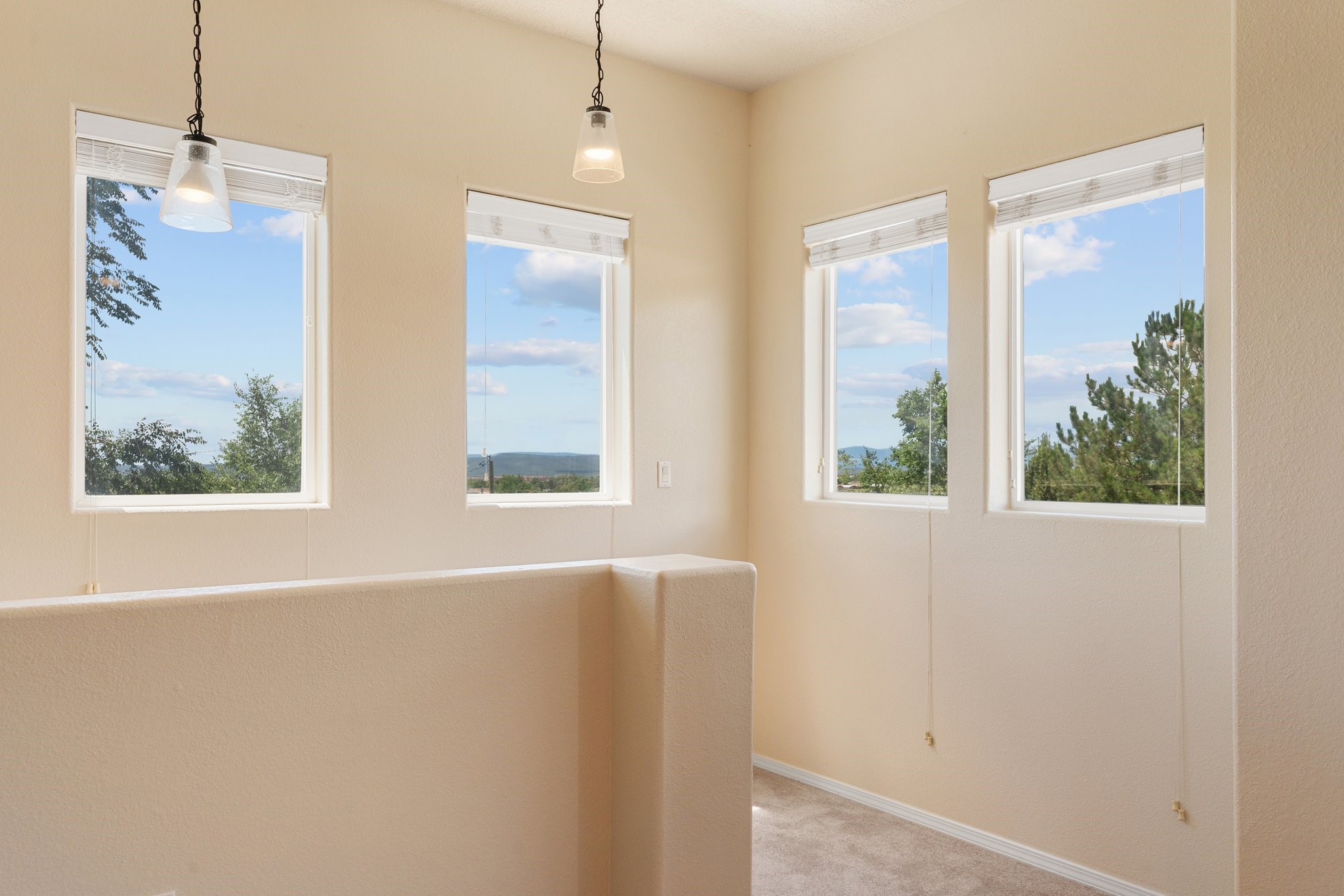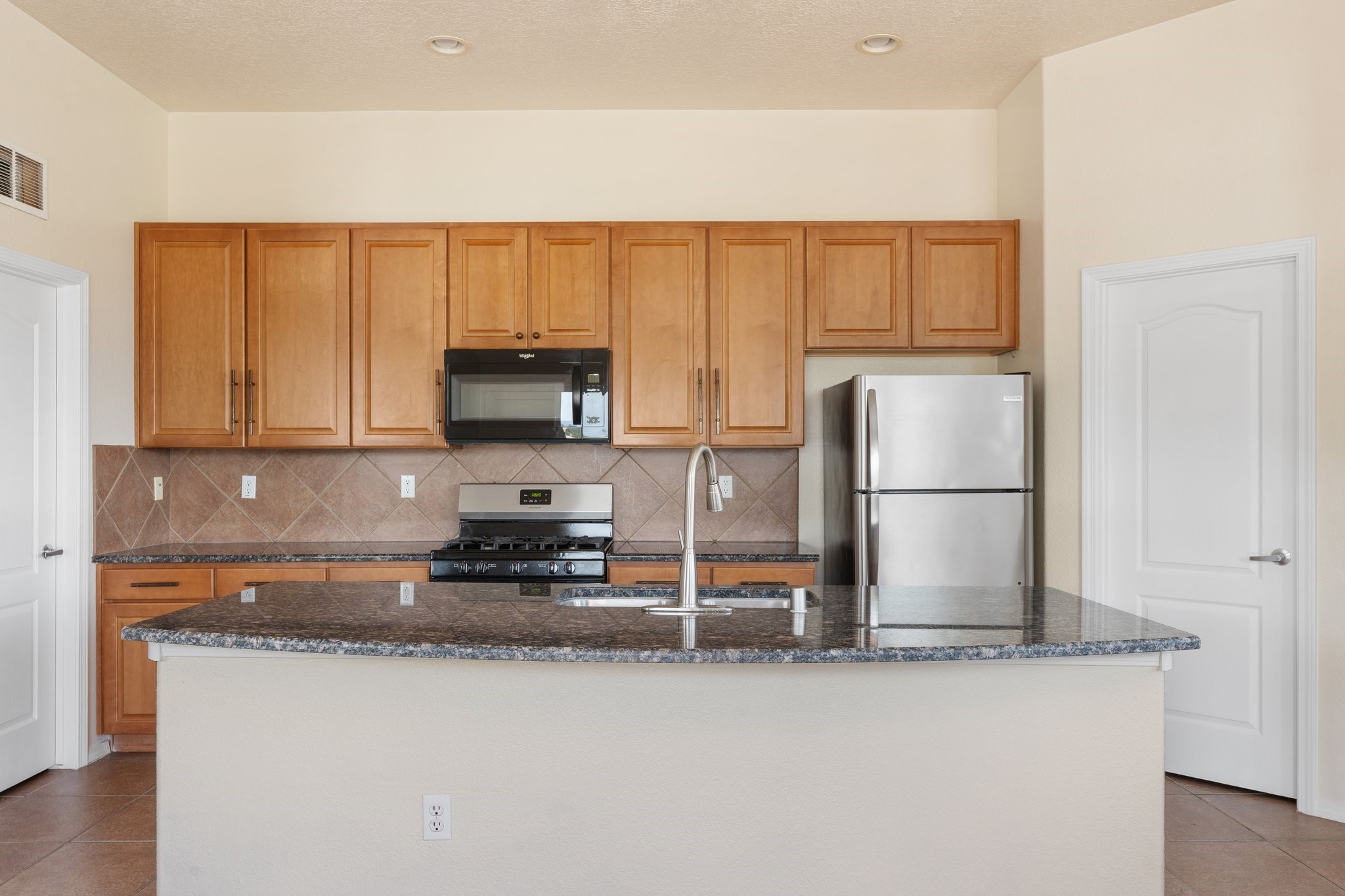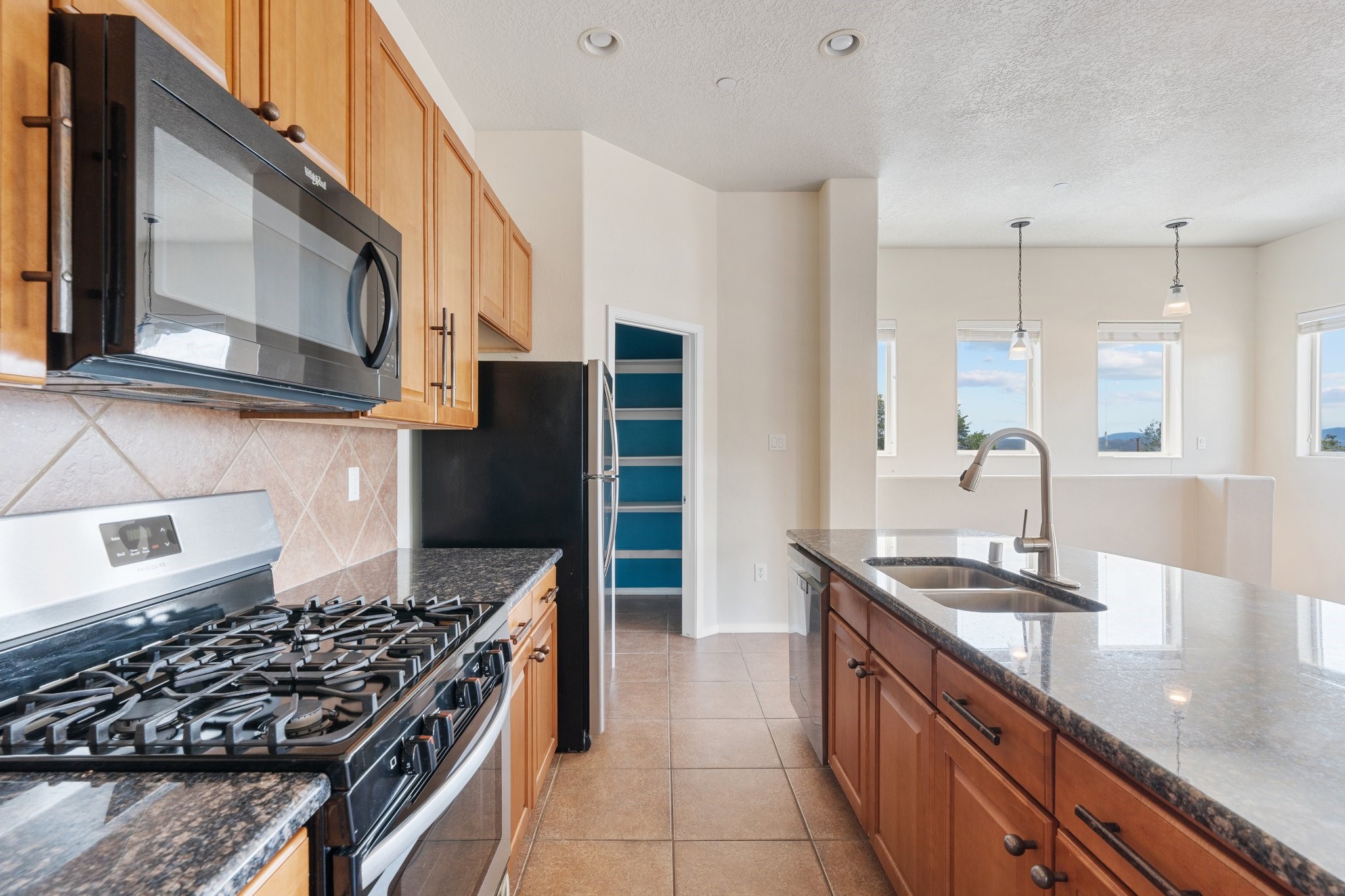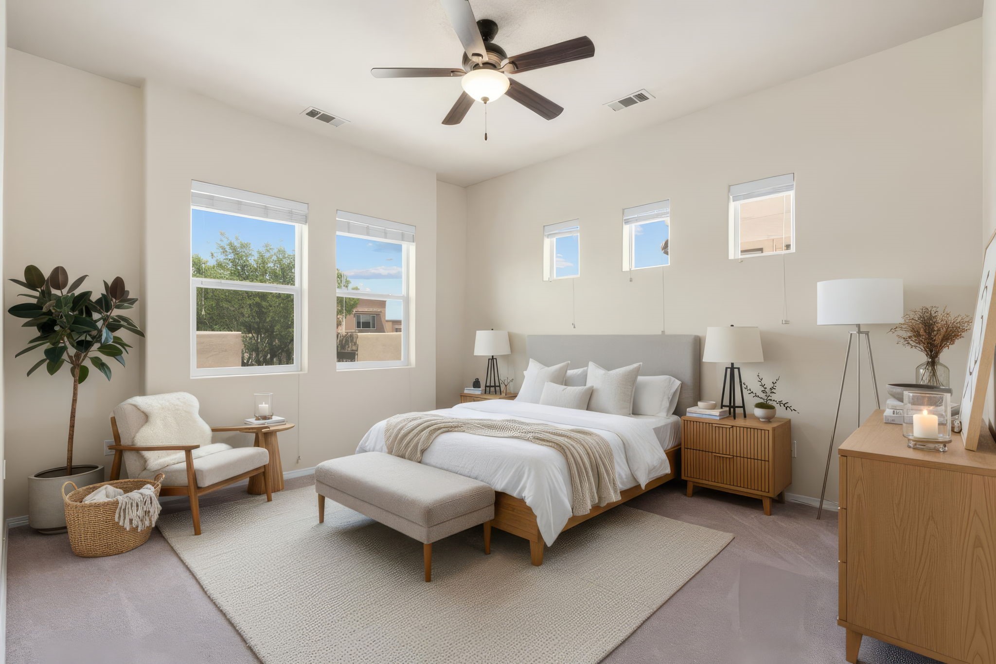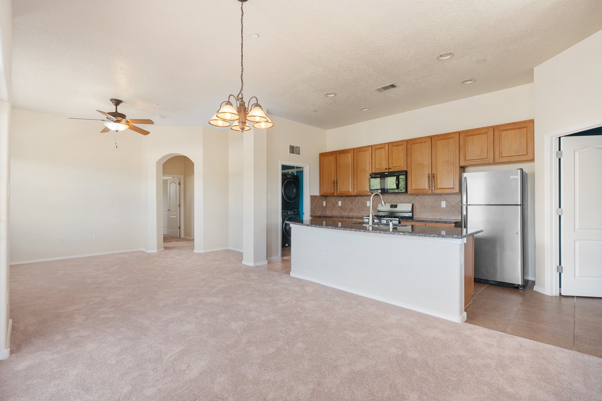 Bright, Spacious Condo with Park Access & Sunset Views! This beautifully maintained 2-bedroom, 2-bath upstairs condo offers stylish comfort, thoughtful design, and a prime location. Once upstairs, you'll find a spacious single-level layout with soaring ceilings and an abundance of natural light throughout. The heart of the home is the open-concept living, dining, and kitchen area, perfect for everyday living and entertaining. The kitchen features generous counter space, a large walk-in pantry, and an adjacent laundry room for added convenience.The primary suite is a peaceful retreat, complete with a walk-in closet and an ensuite bath that includes a soaking tub and double vanity. The guest bedroom is also nicely sized with large closets, ideal for visitors, home office use, or extra storage. Step on to the private balcony and enjoy sunset views, or explore the adjacent San Isidro Village Park, offering a jogging trail, basketball court, and playground--right next door. Additional features include new carpet, fresh paint, new HVAC (2023), updated appliances, and an attached 1-car garage with brand new opener. With a central location close to shopping and easy access to Santa Fe, Albuquerque, and Los Alamos, this turnkey home checks all the boxes for convenience, comfort, and lifestyle.