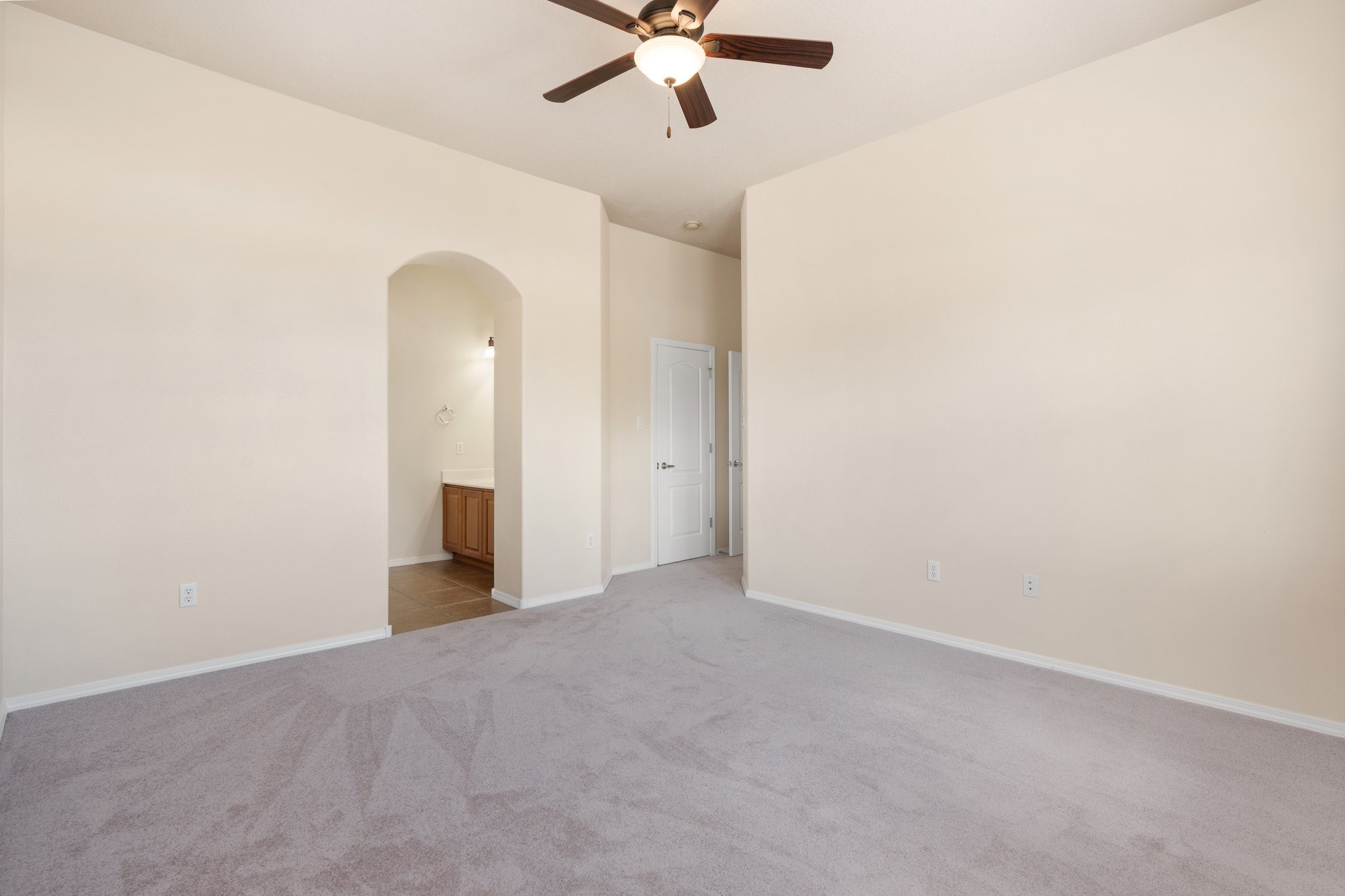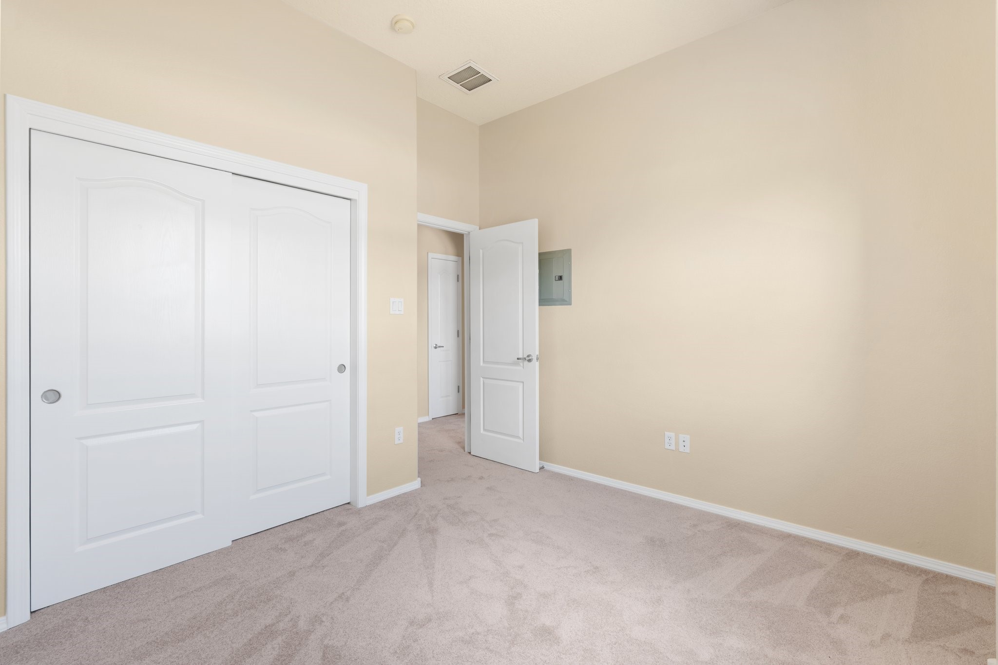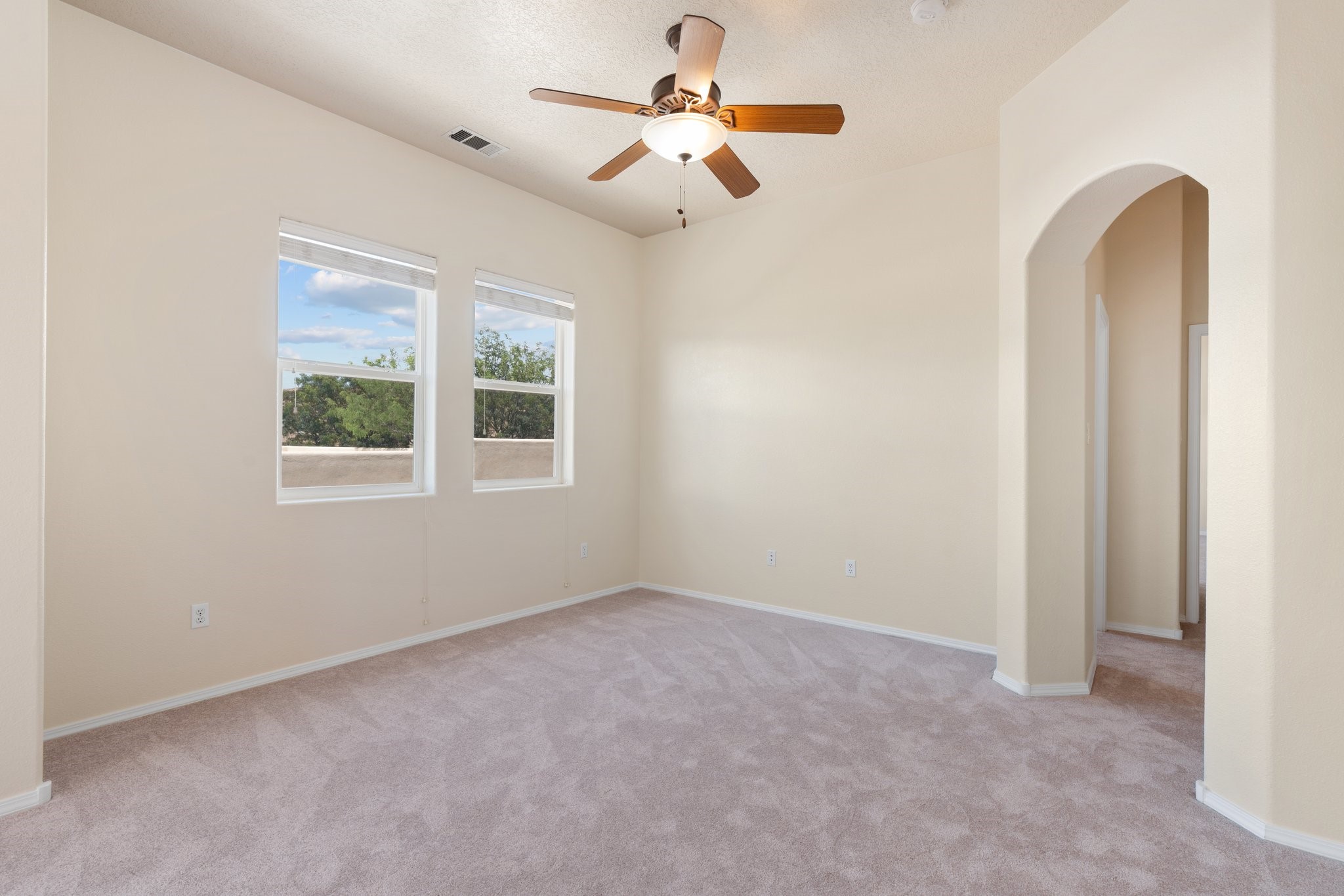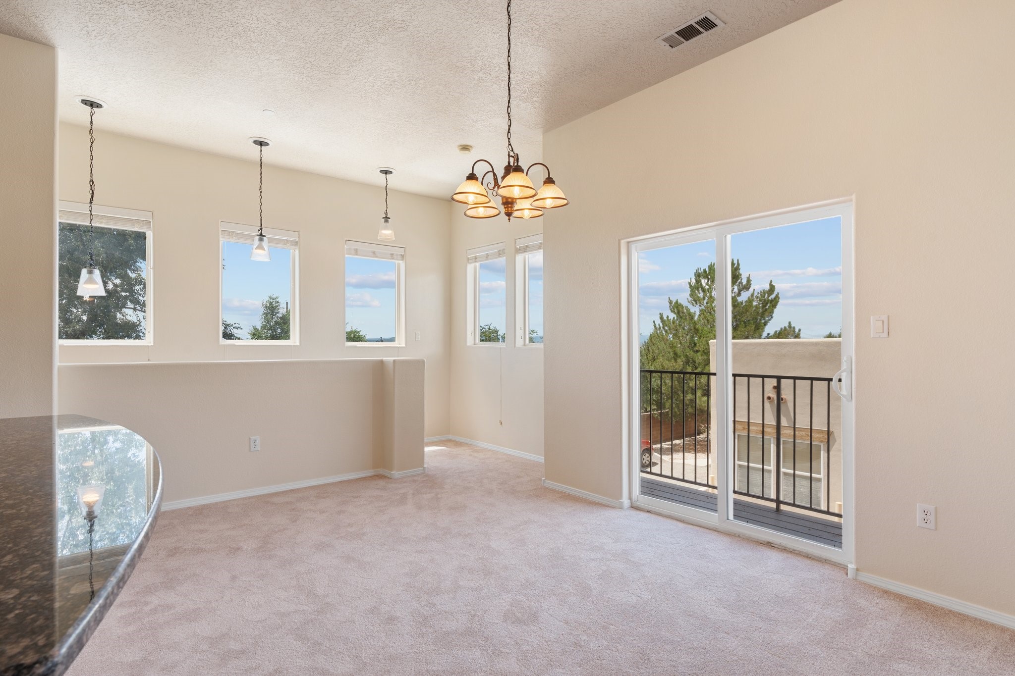 Bright, Spacious Condo with Park Access & Sunset Views! This beautifully maintained 2-bedroom, 2-bath upstairs condo offers stylish comfort, thoughtful design, and a prime location. Once upstairs, you'll find a spacious single-level layout with soaring ceilings and an abundance of natural light throughout. The heart of the home is the open-concept living, dining, and kitchen area, perfect for everyday living and entertaining. The kitchen features generous counter space, a large walk-in pantry, and an adjacent laundry room for added convenience.The primary suite is a peaceful retreat, complete with a walk-in closet and an ensuite bath that includes a soaking tub and double vanity. The guest bedroom is also nicely sized with large closets, ideal for visitors, home office use, or extra storage. Step on to the private balcony and enjoy sunset views, or explore the adjacent San Isidro Village Park, offering a jogging trail, basketball court, and playground--right next door. Additional features include new carpet, fresh paint, new HVAC (2023), updated appliances, and an attached 1-car garage with brand new opener. With a central location close to shopping and easy access to Santa Fe, Albuquerque, and Los Alamos, this turnkey home checks all the boxes for convenience, comfort, and lifestyle.