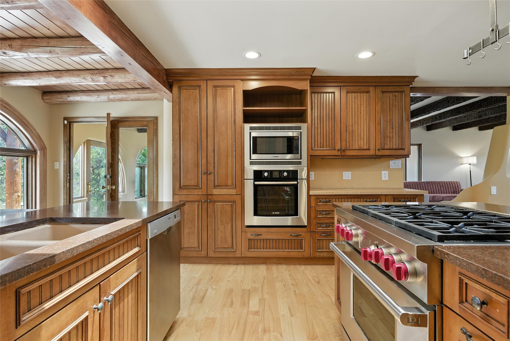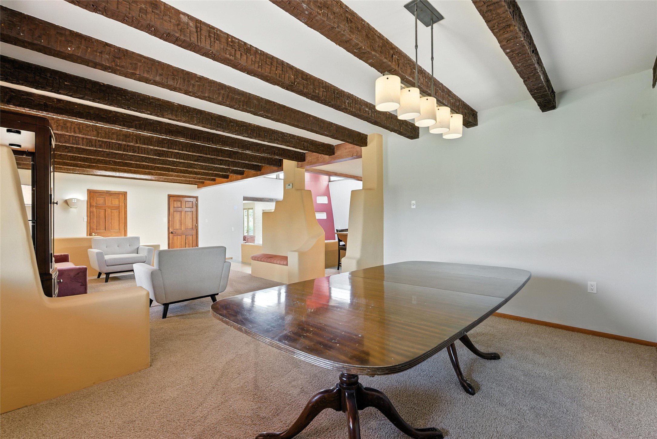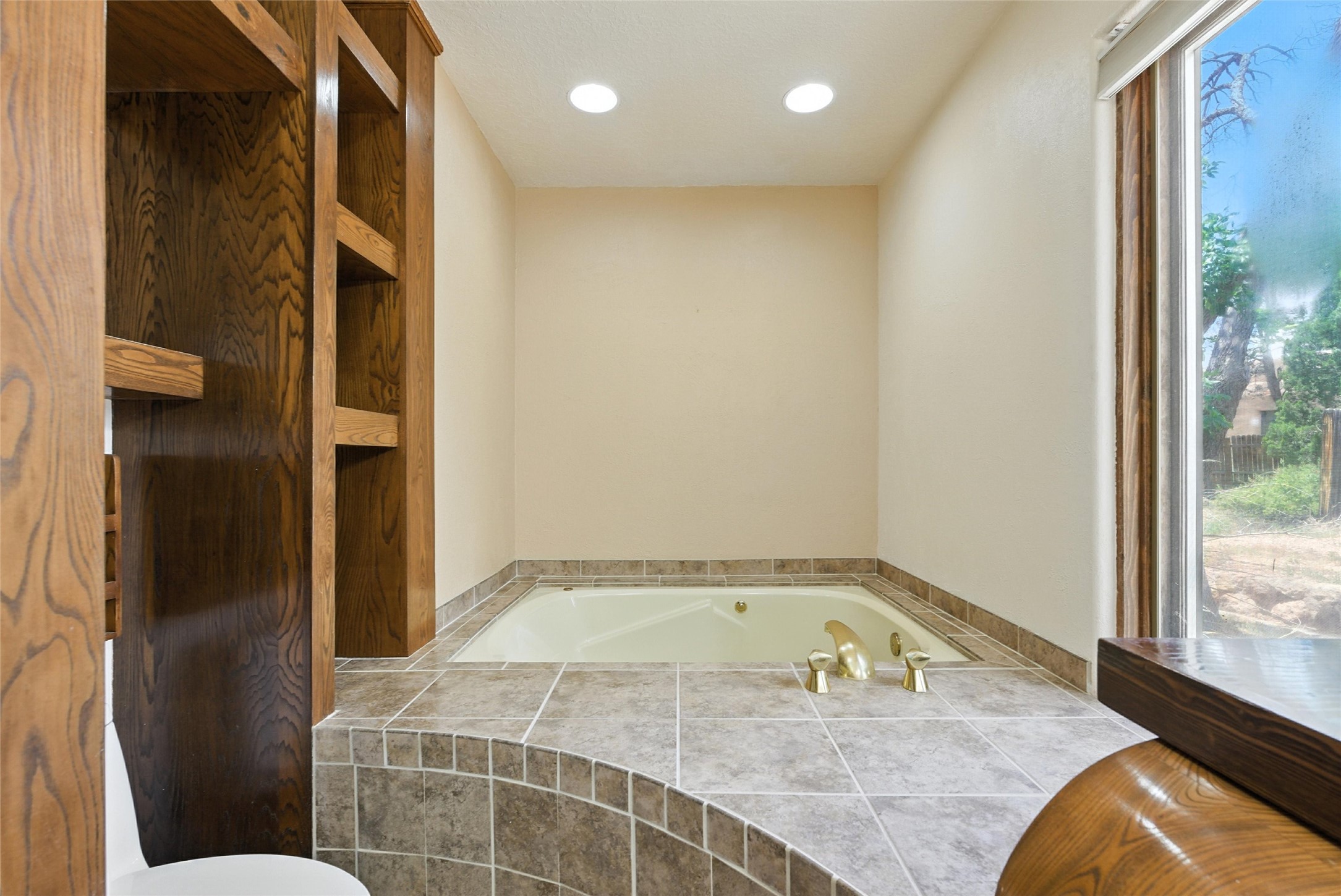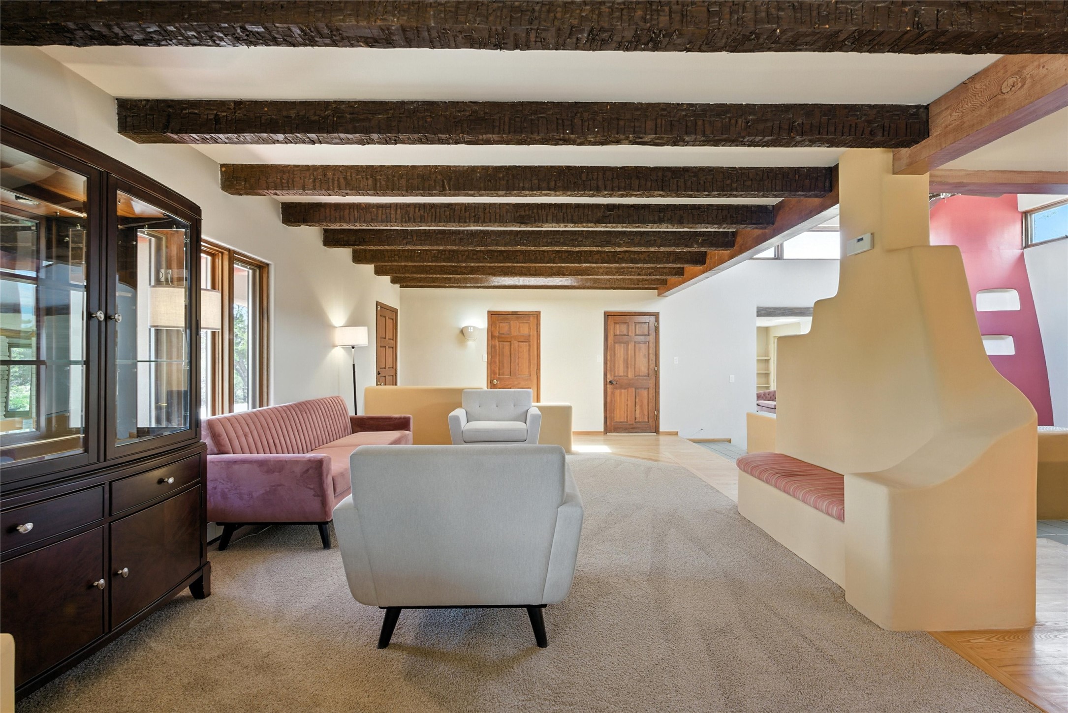 Tucked away on 2.18 peaceful, horse-zoned acres in the heart of White Rock, 123 La Senda is more than a home--it's a private retreat designed for those who value beauty, space, and connection to the land. With graceful portals wrapping three sides, lush gardens, and a tranquil backyard pond, this residence invites you to slow down and savor every season. Beyond the adobe-walled yard, native pion and juniper trees stretch across the landscape, and equine trails wind through the neighborhood--perfect for morning rides, afternoon hikes, or sunset strolls under open skies.A composite-decked pergola creates a shaded outdoor lounge ideal for entertaining or unwinding in the fresh air. Whether dining alfresco or soaking in the hot tub, the outdoor living experience is both refined and serene.Inside, over 3,200 square feet of thoughtfully designed space showcases vaulted rough-hewn viga ceilings , 12 skylights, a classic kiva fireplace, and handcrafted bancos and nichos. Fresh paint in the common areas, new carpet, tile floors, and wood-framed windows enhance the sense of comfort and quality throughout.The custom kitchen features Brookhaven cabinetry, Bosch wall oven and microwave, Wolf 6-burner range, beverage fridge, dual pantries, two islands, and a matching tiled table. A bright sunroom offers additional space to relax year-round and a great greenhouse.The spacious primary suite includes private portal access, generous closet space, and a five-piece bath with jetted tub and dual-head walk-in shower beneath a skylight. Built-ins throughout the home include window seats and a curved living room couch that stays with the home--along with the spa-style hot tub.Additional highlights include a newer septic tank (installed in 2021), a two-car garage, detached RV carport, and direct access to neighborhood trails. Blending timeless style with modern comfort, 123 La Senda is a rare offering in one of White Rock's most peaceful and sought-after settings.