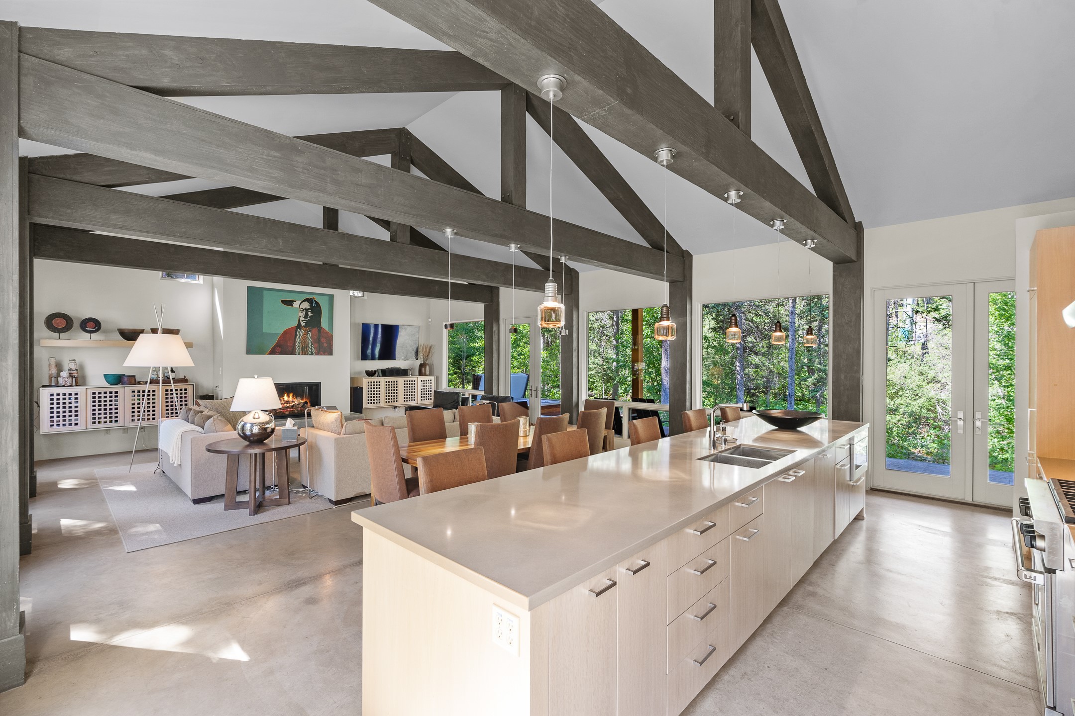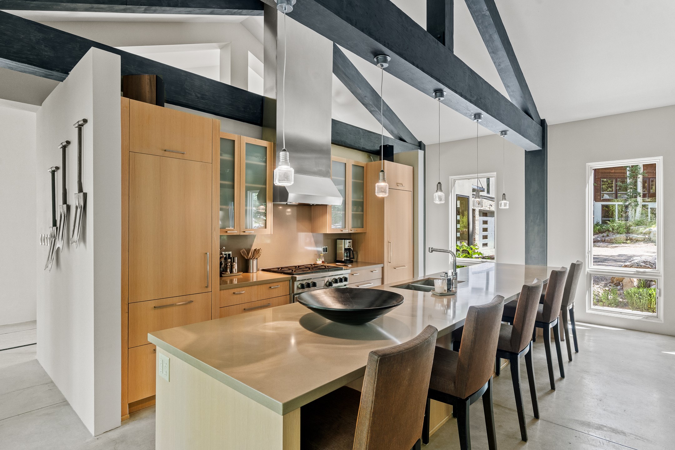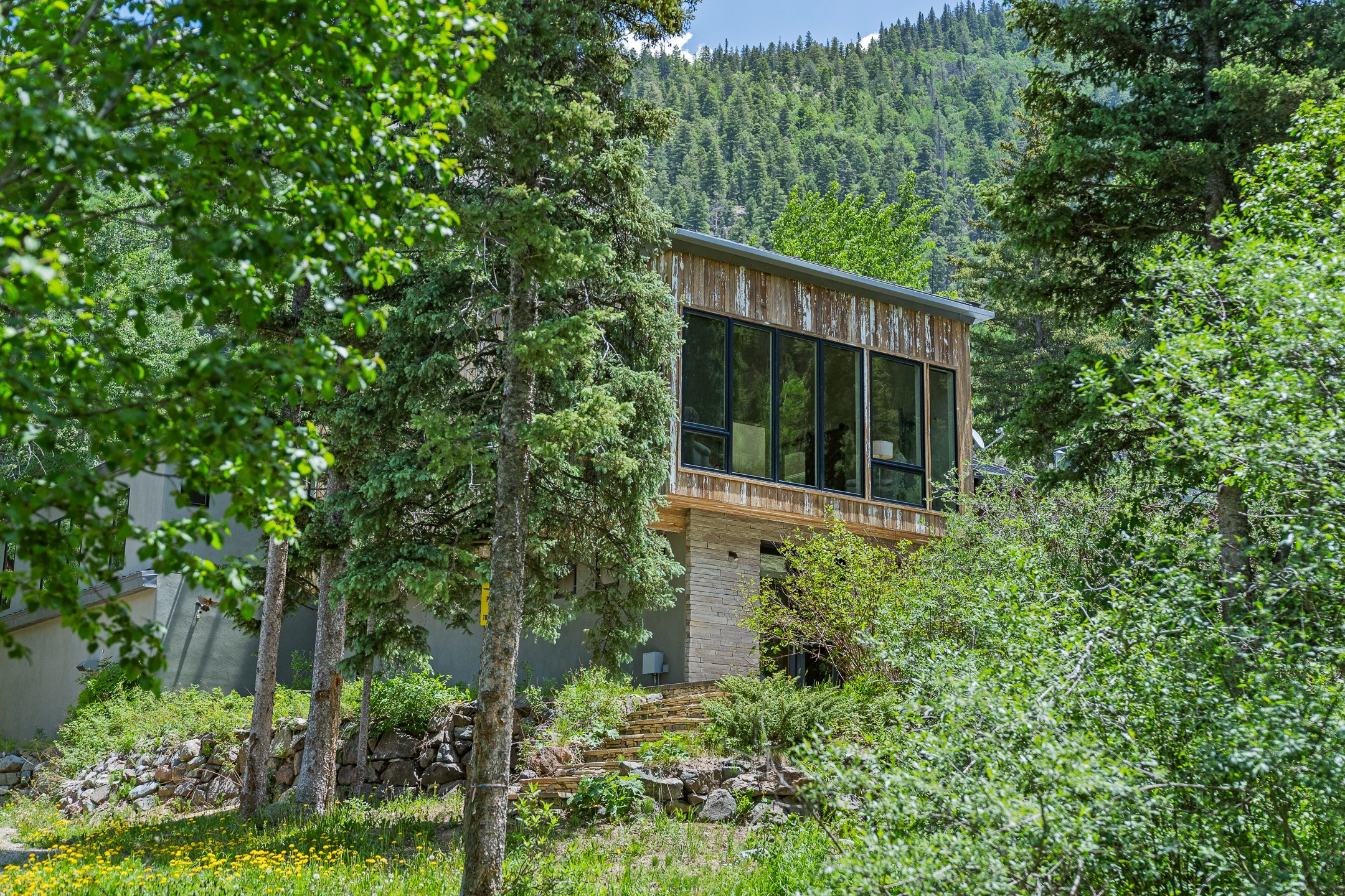 Situated in the heart of Taos Ski Valley, this one-of-a-kind Contemporary Modern Mountain Home redefines alpine luxury. Set on a rare corner lot spanning over one-third of an acre, the property is graced with more than 150 feet of the Rio Hondo River, flowing beneath two custom-built bridges that provide direct ski-in/ski-out access. Just a short walk to the base area's two main lifts, the location is simply unmatched. Every detail of this stunning home exudes sophistication and modern elegance. Designed for both comfort and performance, it features high-end finishes throughout, including automated sun shades, radiant in-floor heating, a chef's kitchen with premium appliances, and a luxurious steam shower in the primary suite. A dramatic zinc standing seam roof--engineered to last 80 to 100years--crowns the home, while a natural gas standby generator ensures seamless year-round living. Step outside to the elevated hot tub perched above the river and enjoy serene mountain ambiance like no other. The heated driveway and stone paver walkways offer effortless winter access, while the oversized 3-car garage--with one bay currently transformed into a game room--adds versatility and comfort. A dedicated ski storage room with private locker space and a separate entrance completes the alpine lifestyle experience. The home's thoughtful floor plan offers exceptional privacy and flow. The primary suite features a private office, steam shower, and complete separation from the guest quarters, which are adjacent to a spacious family lounge. A guest suite on the lower level provides additional convenience and flexibility. From its unparalleled riverfront setting to its extraordinary finishes and amenities, there is simply no other home of this caliber in Taos Ski Valley. This is more than a residence--it's an elevated mountain sanctuary. Home is being sold fully furnished, including most artwork.