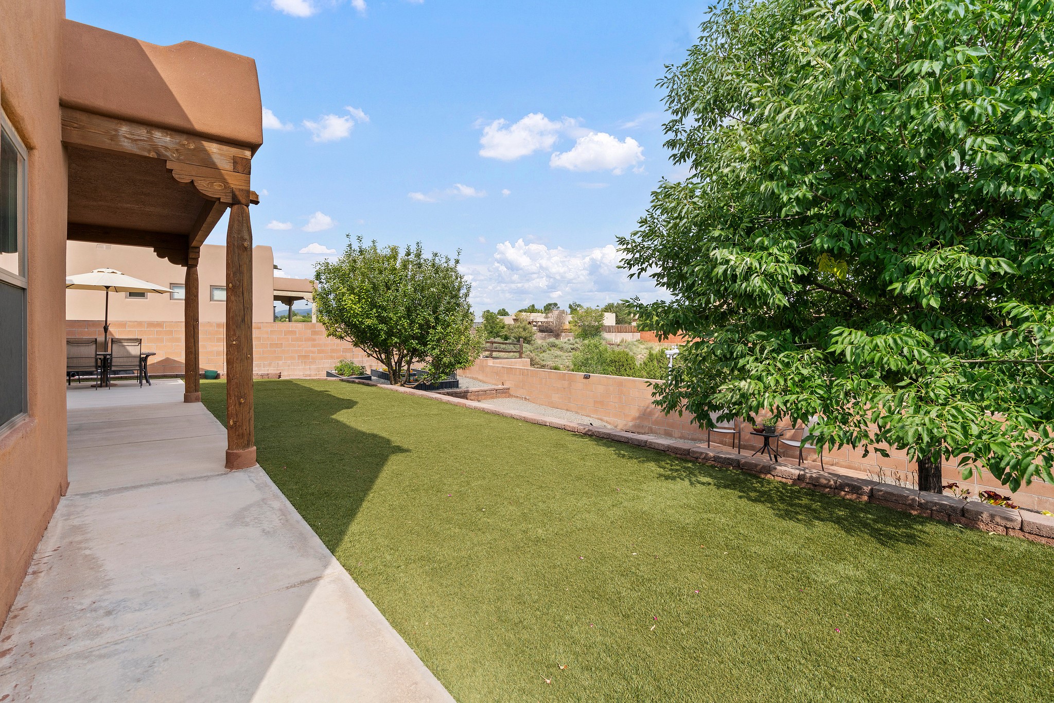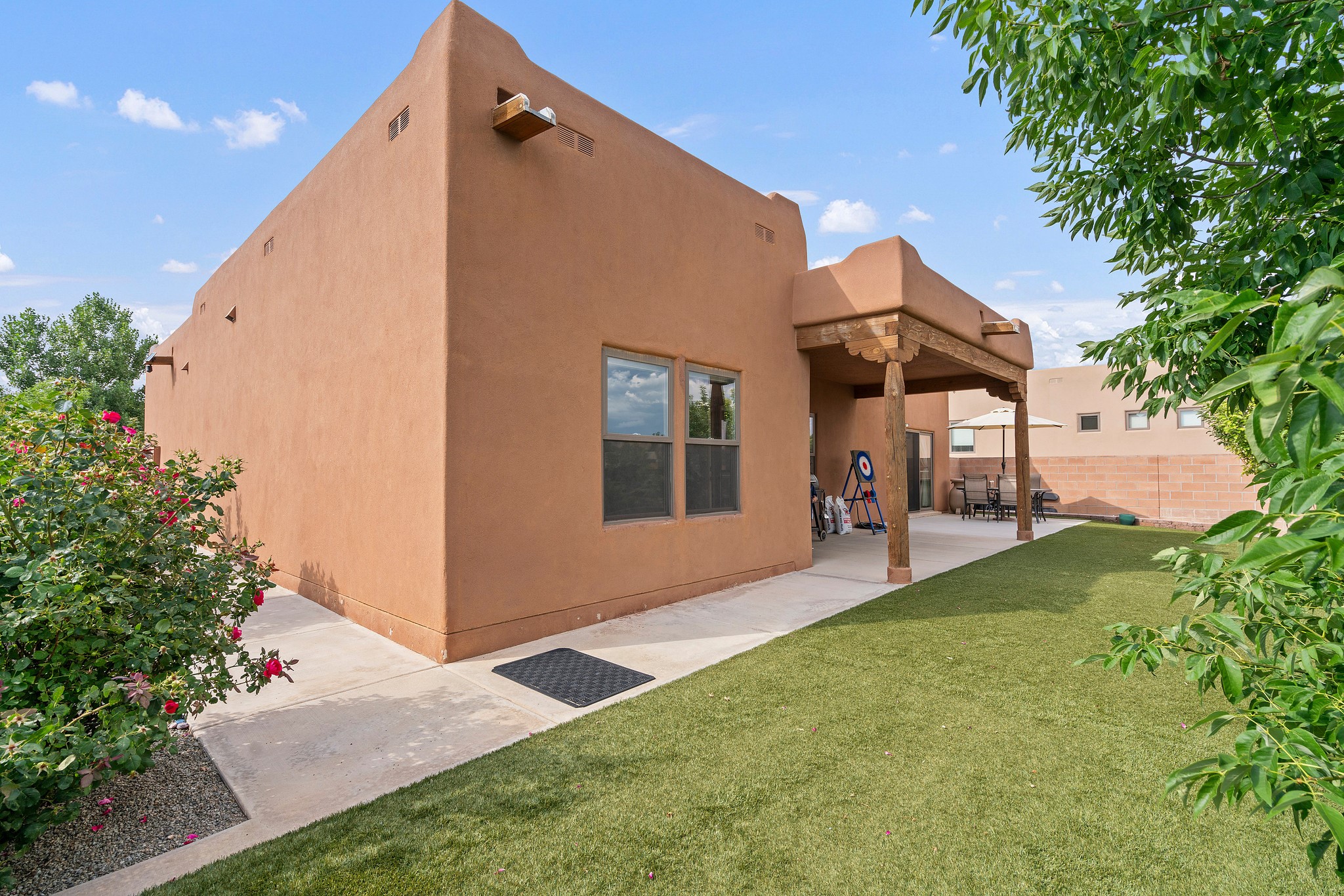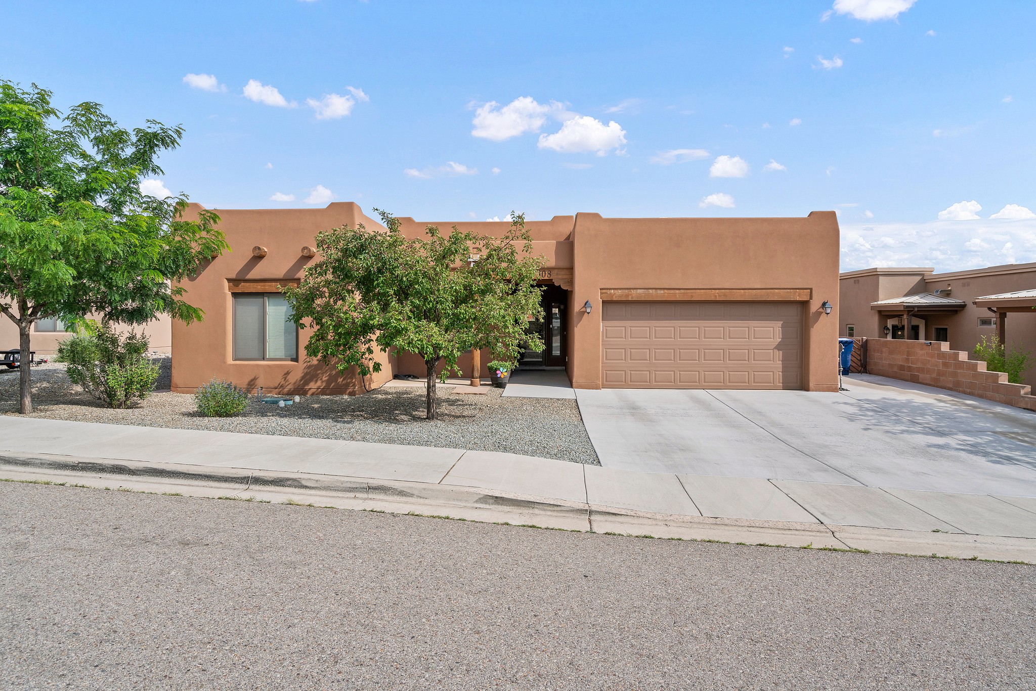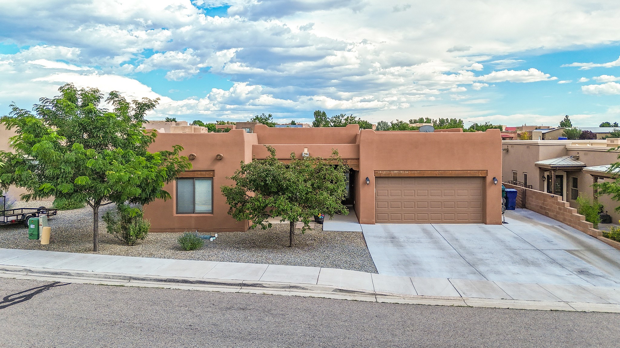 Immaculately Maintained 3-Bedroom, Energy-Efficient Green Home on a Well-Established, Low-Traffic StreetThis beautifully maintained 3-bedroom, 2-bath home features a two-car garage and a newly paved three-car driveway with a custom gate to the backyard. Located in a peaceful neighborhood with easy access to NM-599, the home offers radiant heat and recent upgrades including new tile, carpeted bedrooms, and updated appliances.The spacious, landscaped backyard is perfect for relaxing or entertaining, with a covered portal, extended porch, fire pit, fruit tree, and irrigated raised garden beds. Enjoy added privacy with a natural arroyo located directly behind the home.