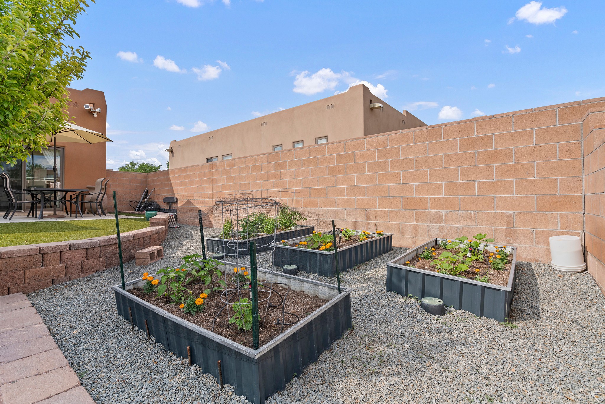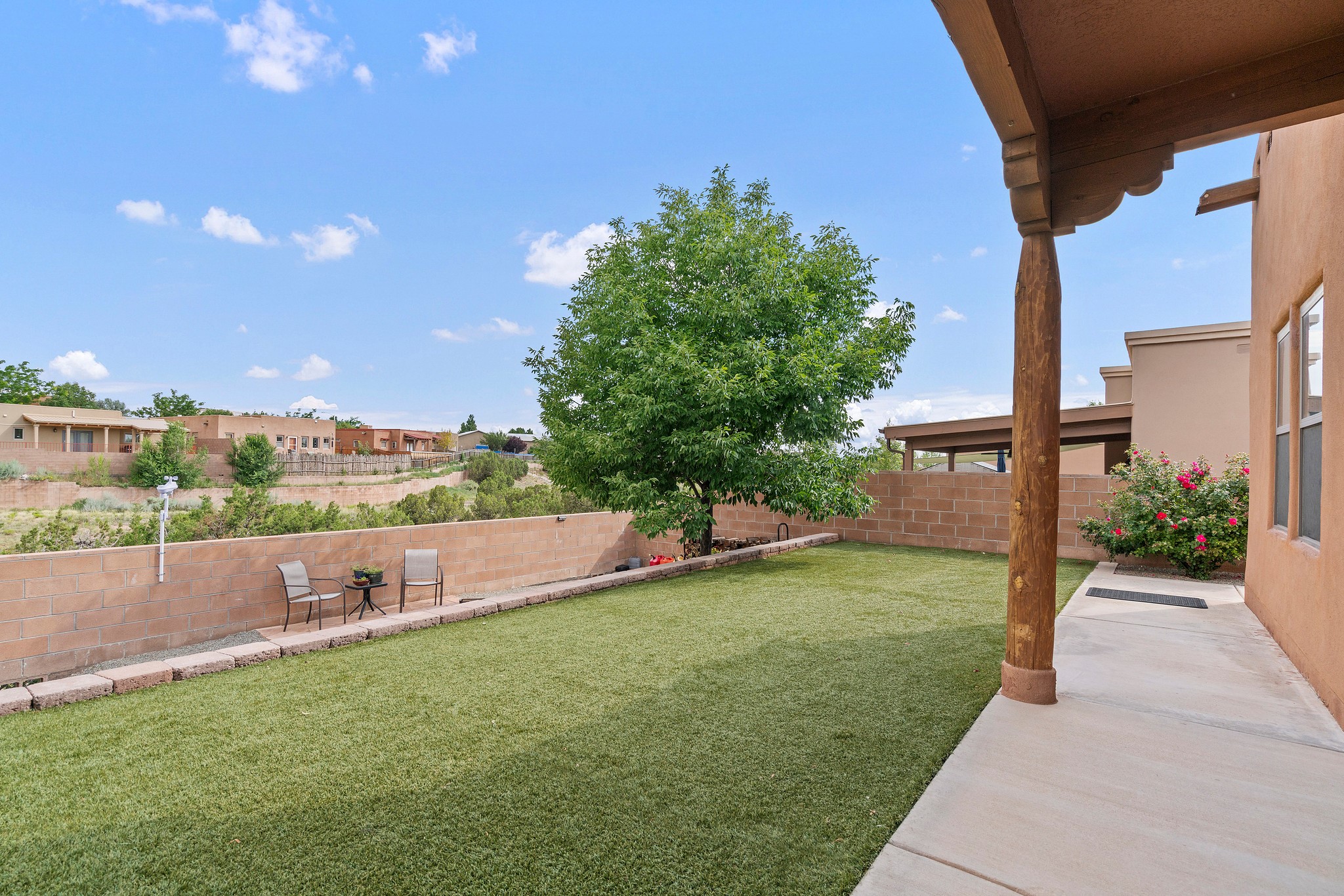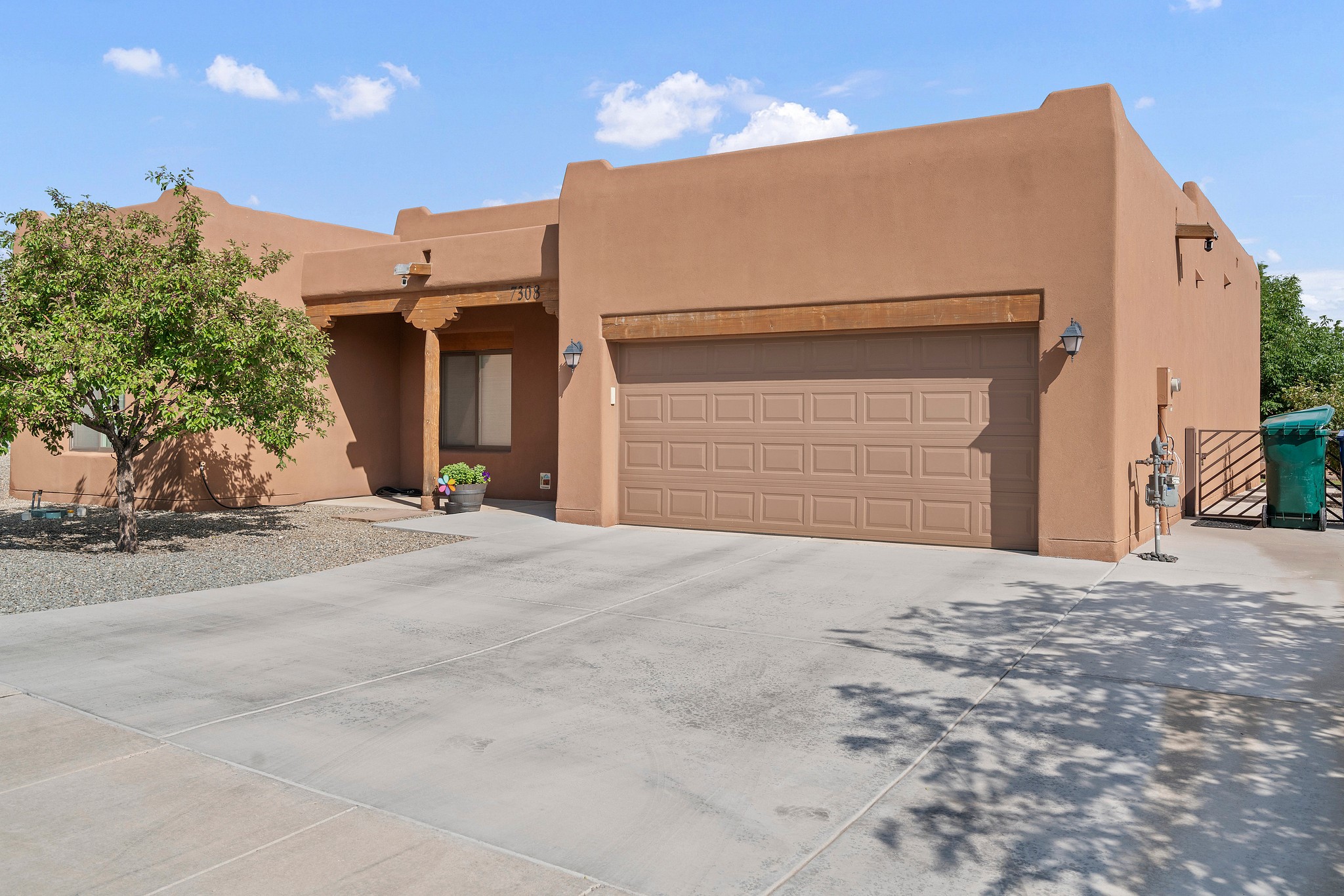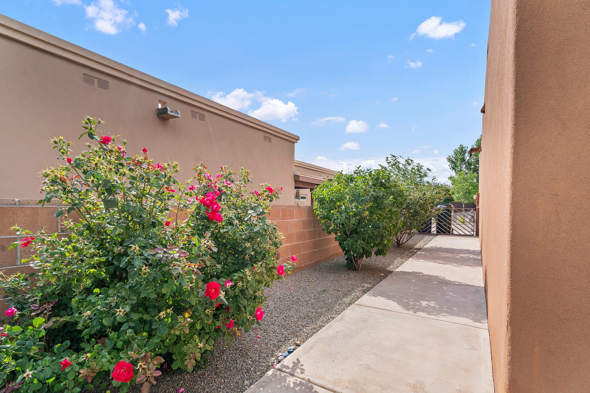 Immaculately Maintained 3-Bedroom, Energy-Efficient Green Home on a Well-Established, Low-Traffic StreetThis beautifully maintained 3-bedroom, 2-bath home features a two-car garage and a newly paved three-car driveway with a custom gate to the backyard. Located in a peaceful neighborhood with easy access to NM-599, the home offers radiant heat and recent upgrades including new tile, carpeted bedrooms, and updated appliances.The spacious, landscaped backyard is perfect for relaxing or entertaining, with a covered portal, extended porch, fire pit, fruit tree, and irrigated raised garden beds. Enjoy added privacy with a natural arroyo located directly behind the home.