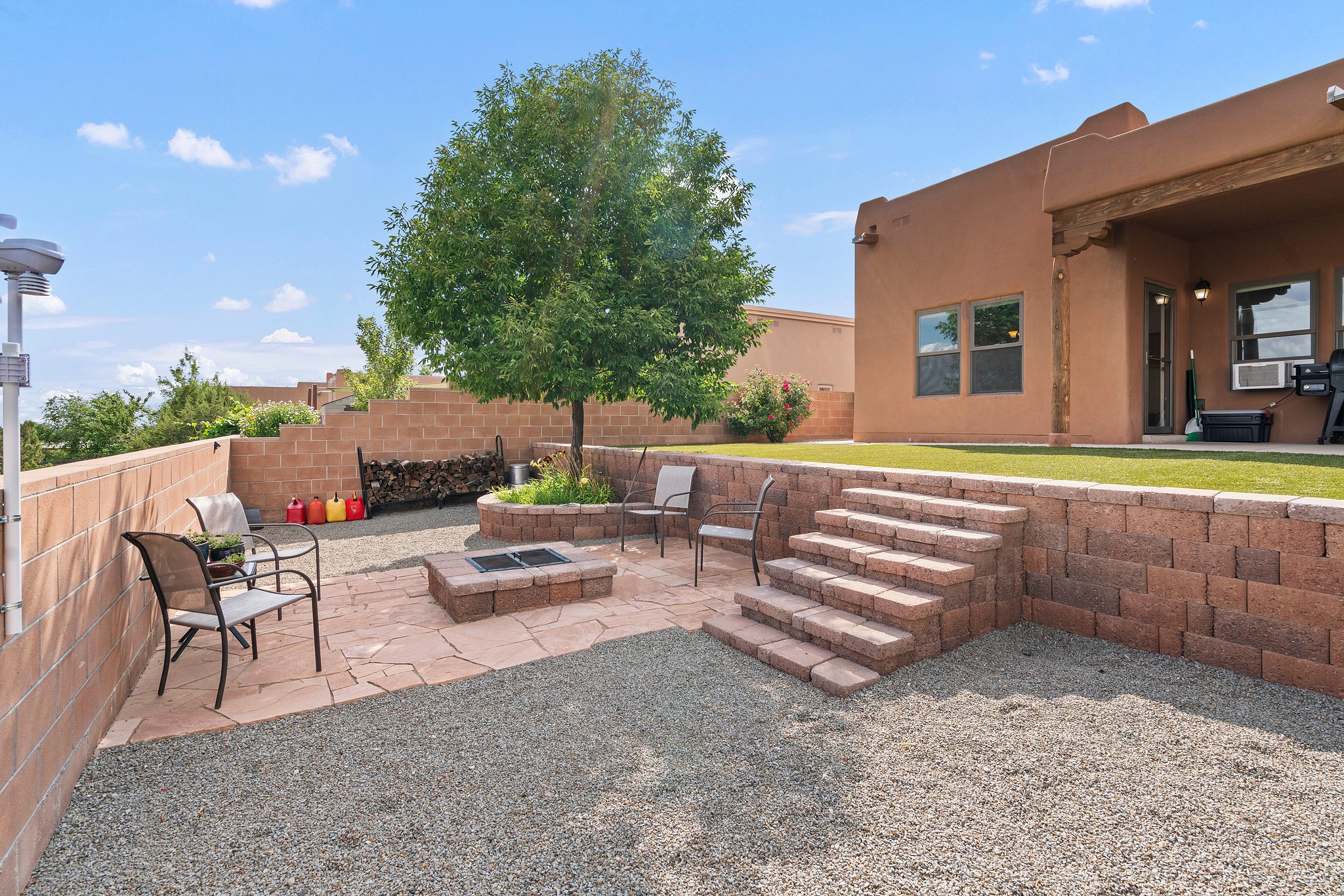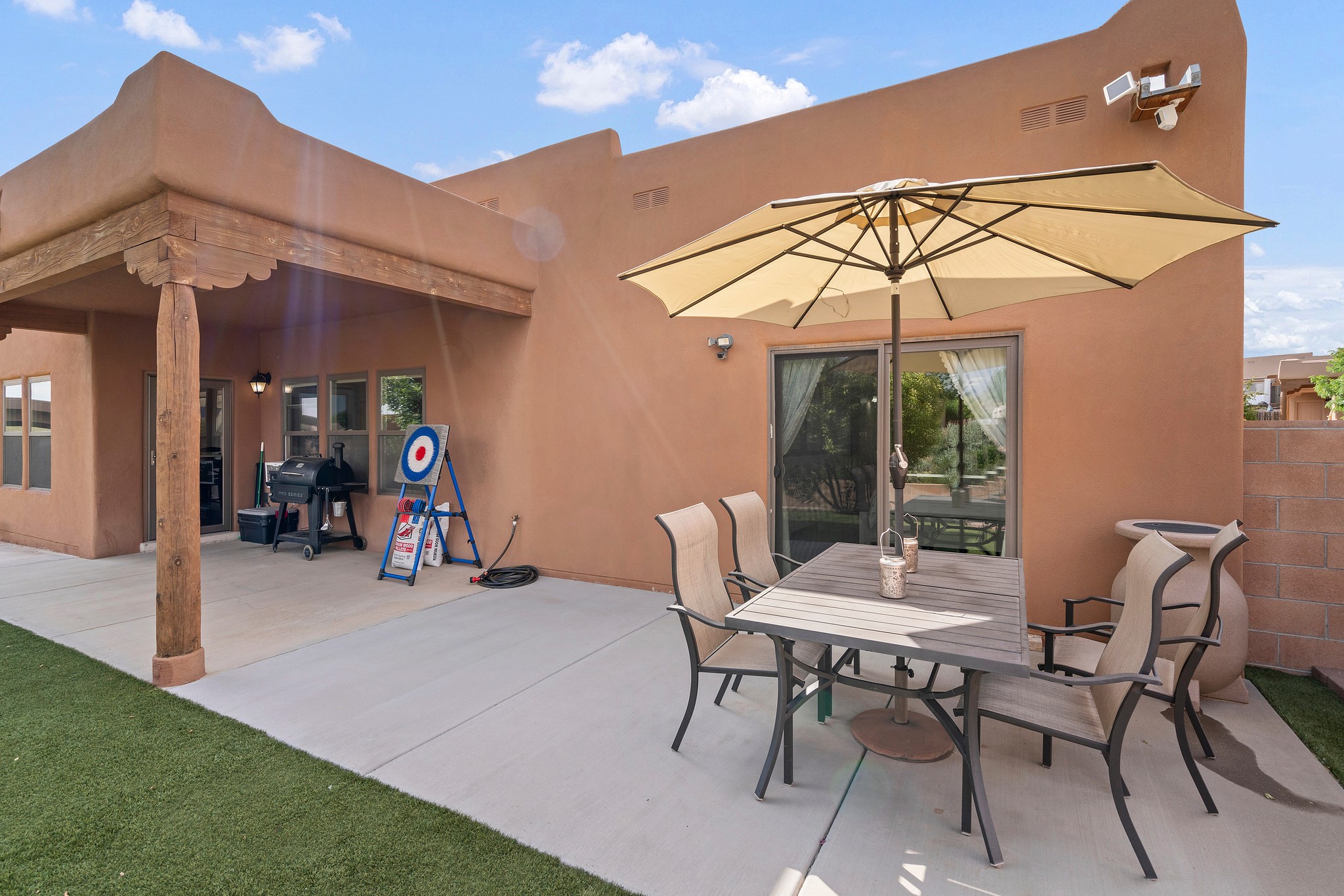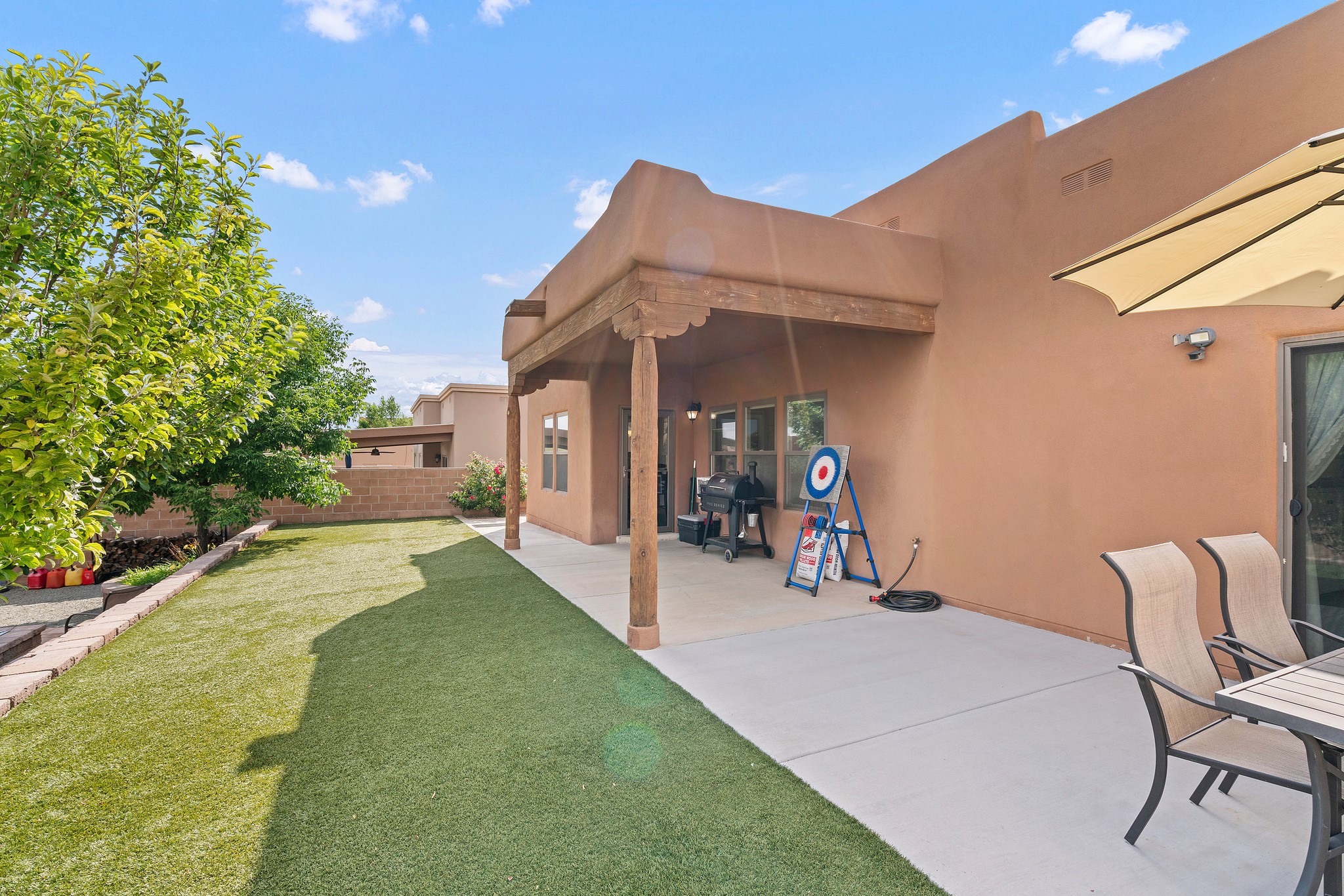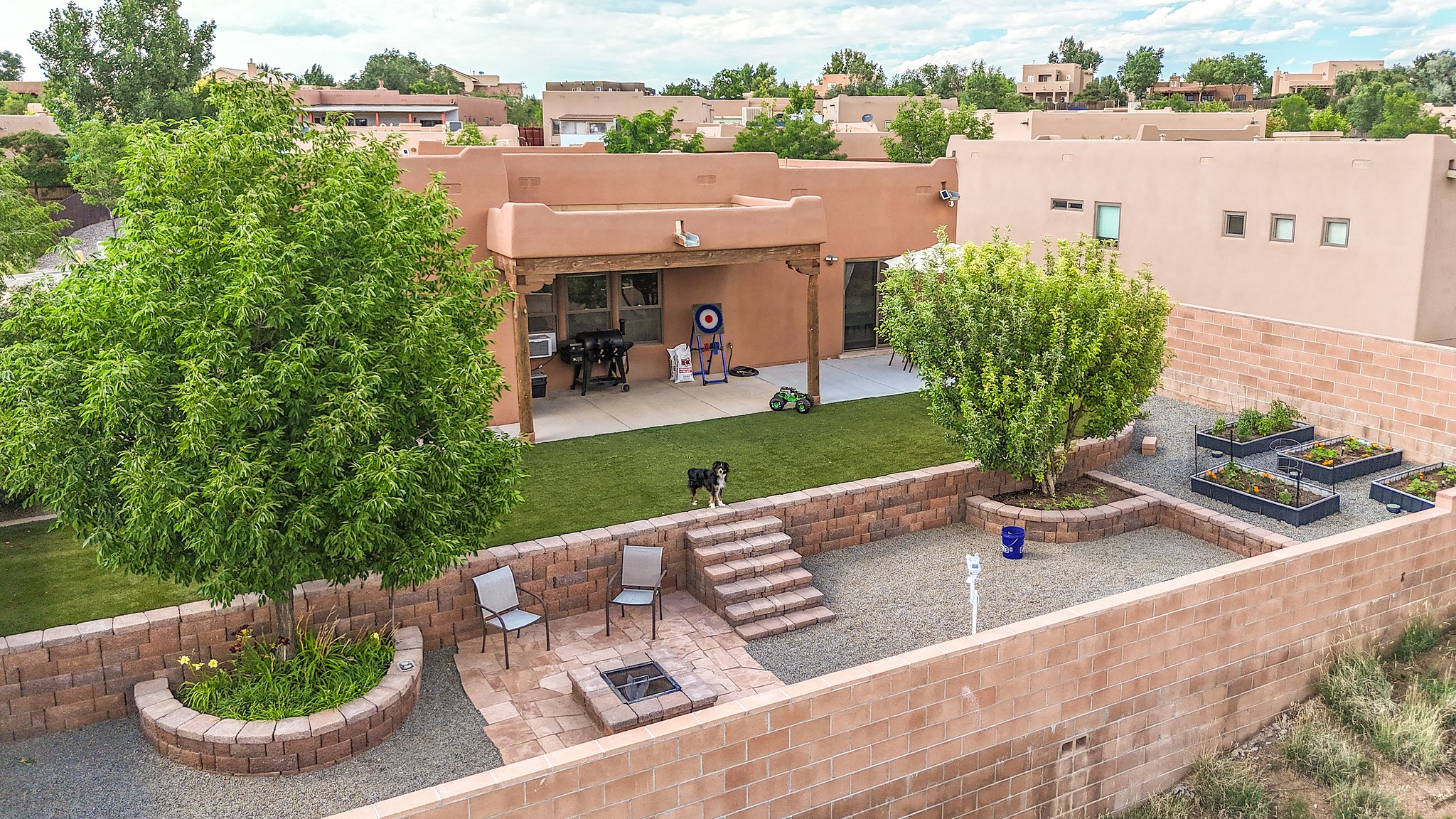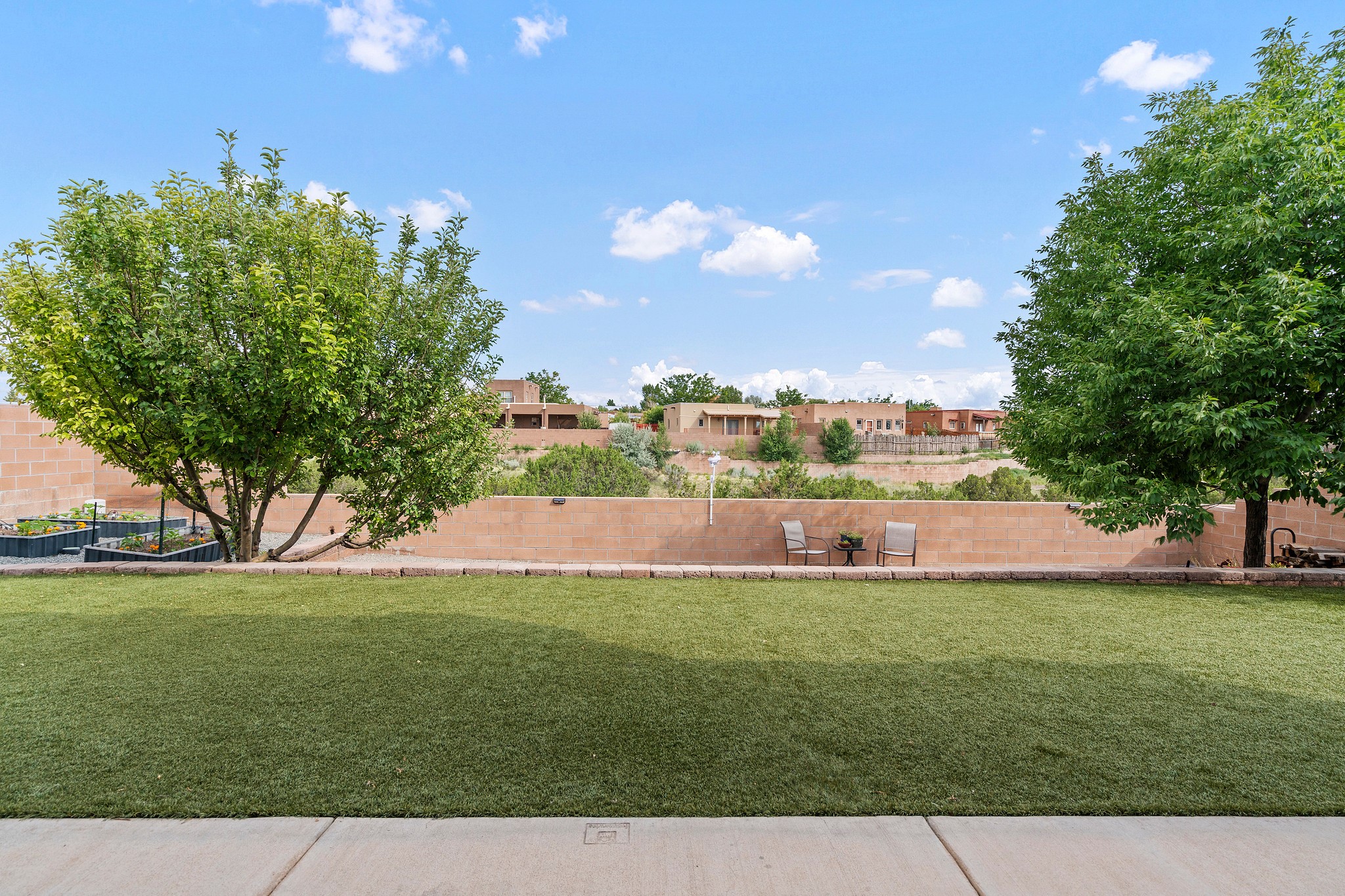 Immaculately Maintained 3-Bedroom, Energy-Efficient Green Home on a Well-Established, Low-Traffic StreetThis beautifully maintained 3-bedroom, 2-bath home features a two-car garage and a newly paved three-car driveway with a custom gate to the backyard. Located in a peaceful neighborhood with easy access to NM-599, the home offers radiant heat and recent upgrades including new tile, carpeted bedrooms, and updated appliances.The spacious, landscaped backyard is perfect for relaxing or entertaining, with a covered portal, extended porch, fire pit, fruit tree, and irrigated raised garden beds. Enjoy added privacy with a natural arroyo located directly behind the home.