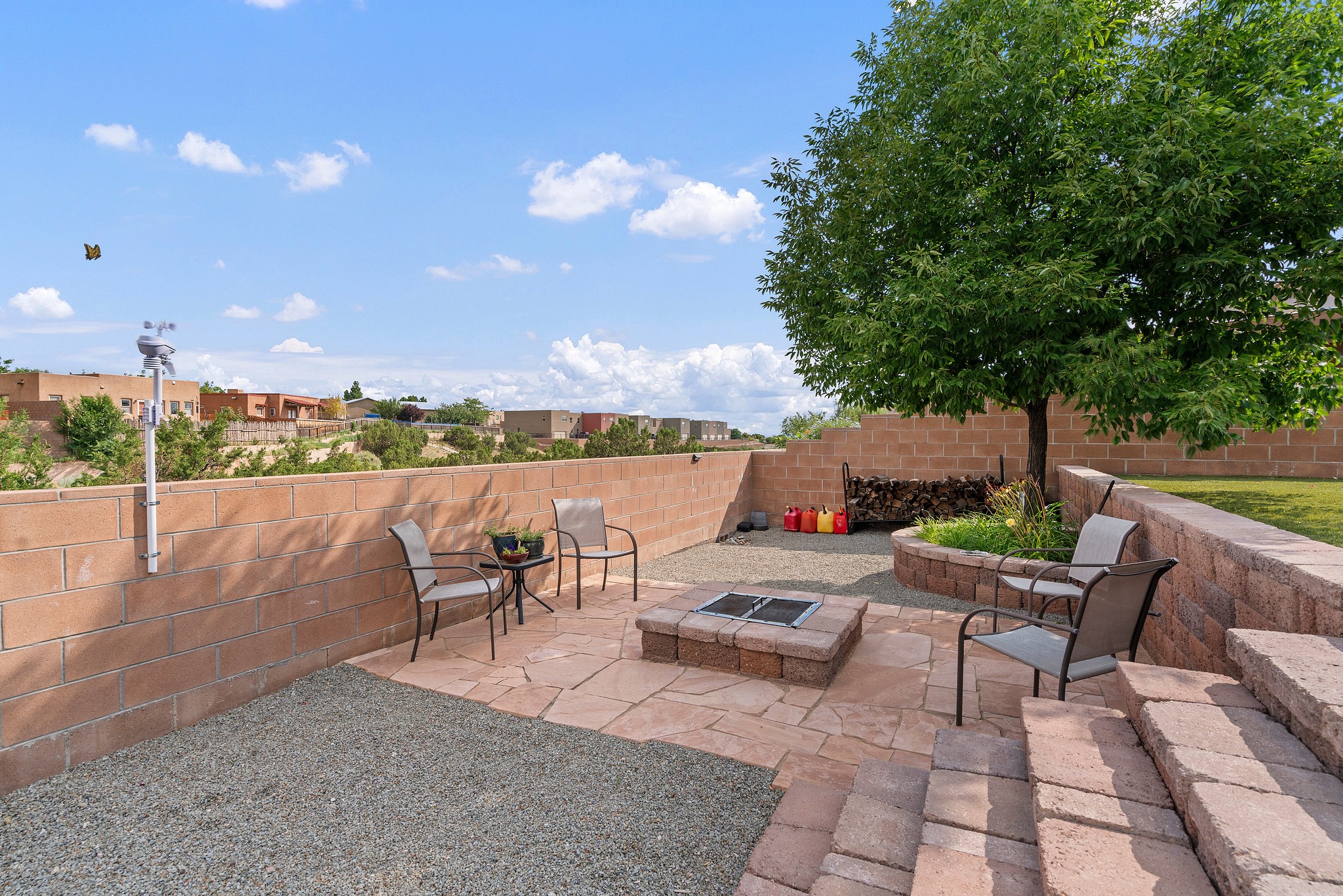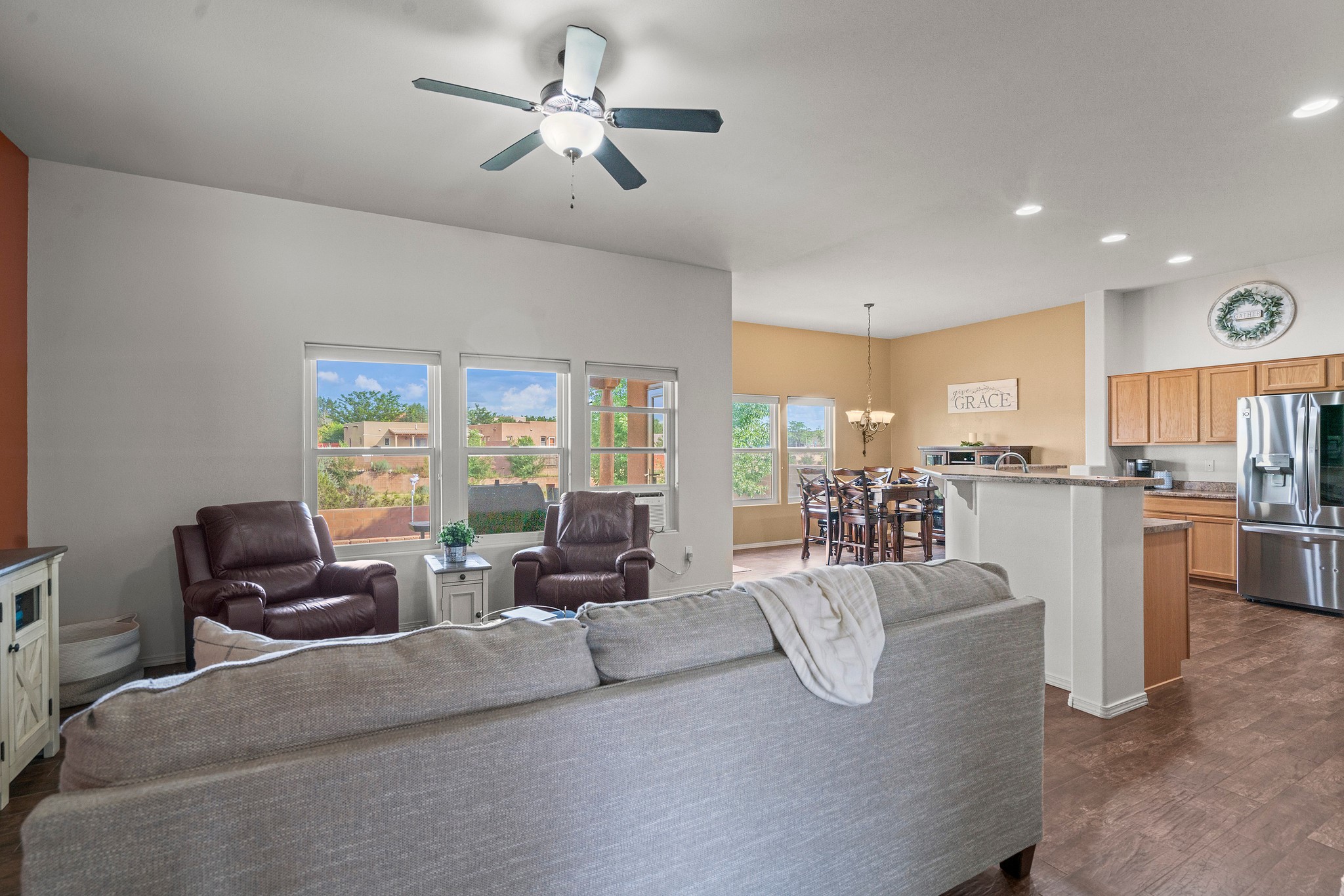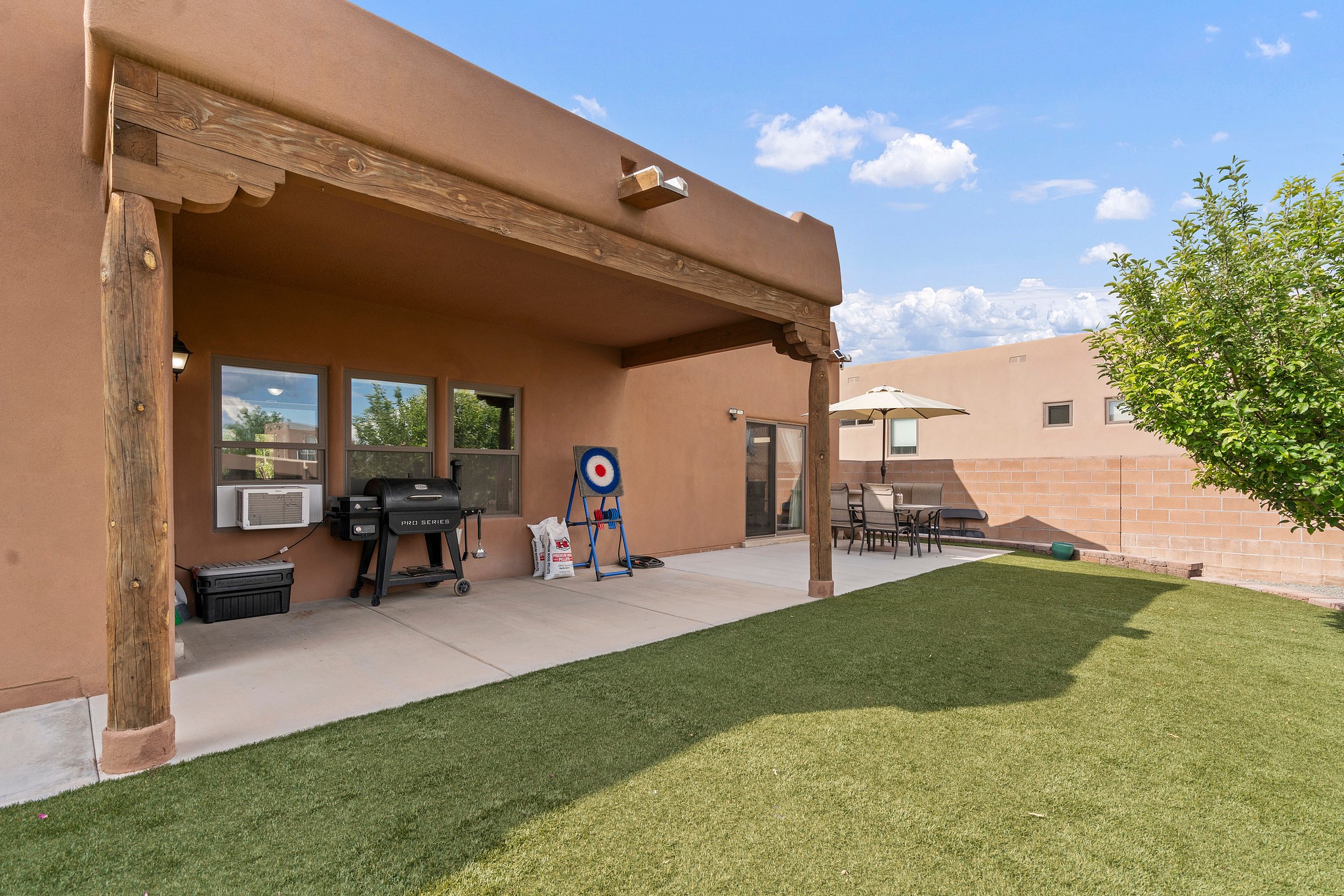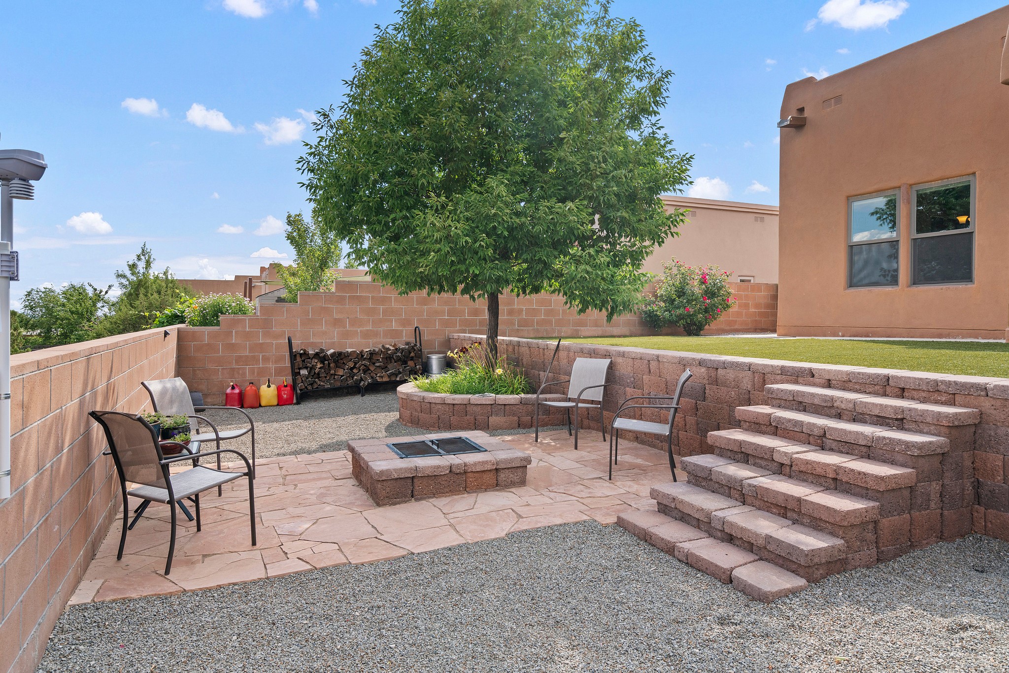 Immaculately Maintained 3-Bedroom, Energy-Efficient Green Home on a Well-Established, Low-Traffic StreetThis beautifully maintained 3-bedroom, 2-bath home features a two-car garage and a newly paved three-car driveway with a custom gate to the backyard. Located in a peaceful neighborhood with easy access to NM-599, the home offers radiant heat and recent upgrades including new tile, carpeted bedrooms, and updated appliances.The spacious, landscaped backyard is perfect for relaxing or entertaining, with a covered portal, extended porch, fire pit, fruit tree, and irrigated raised garden beds. Enjoy added privacy with a natural arroyo located directly behind the home.