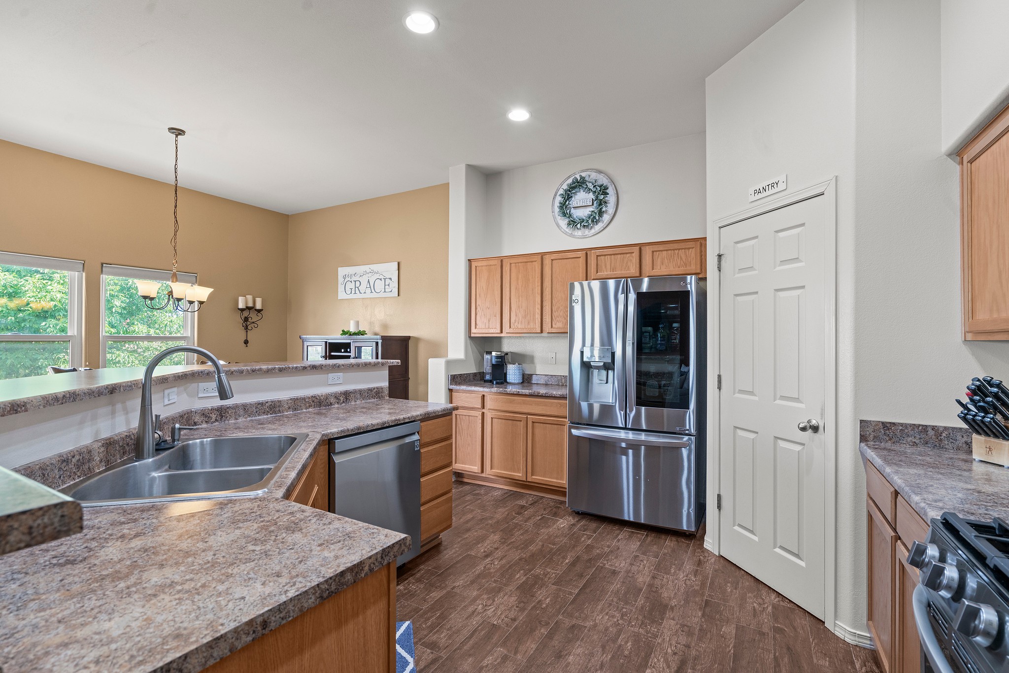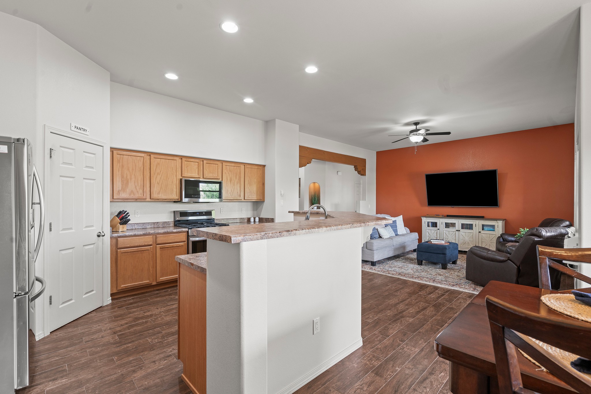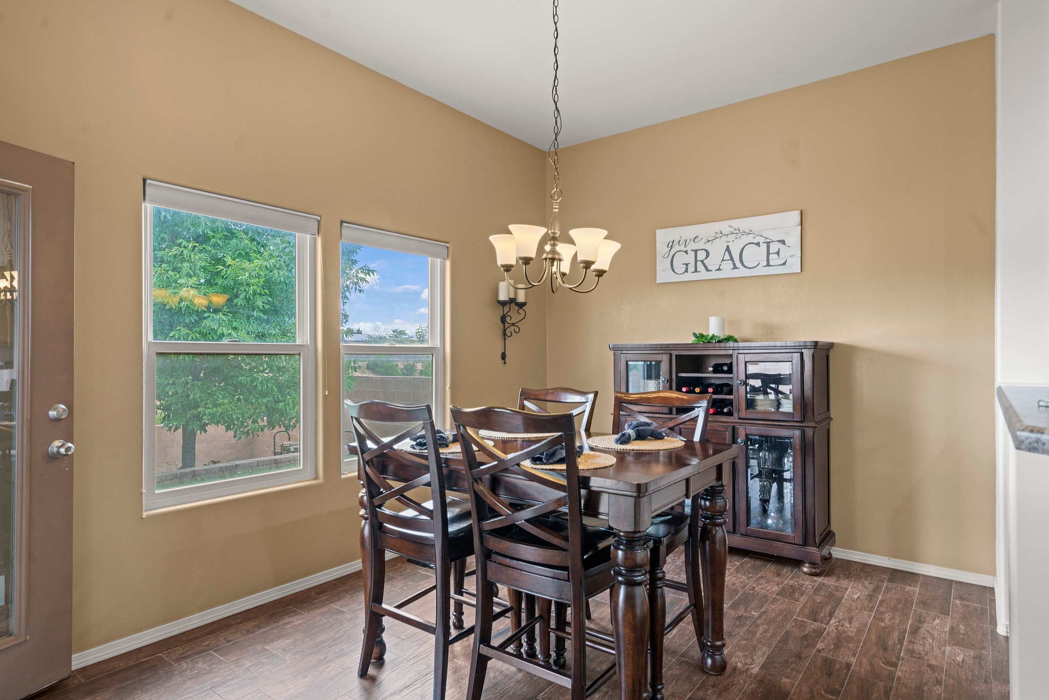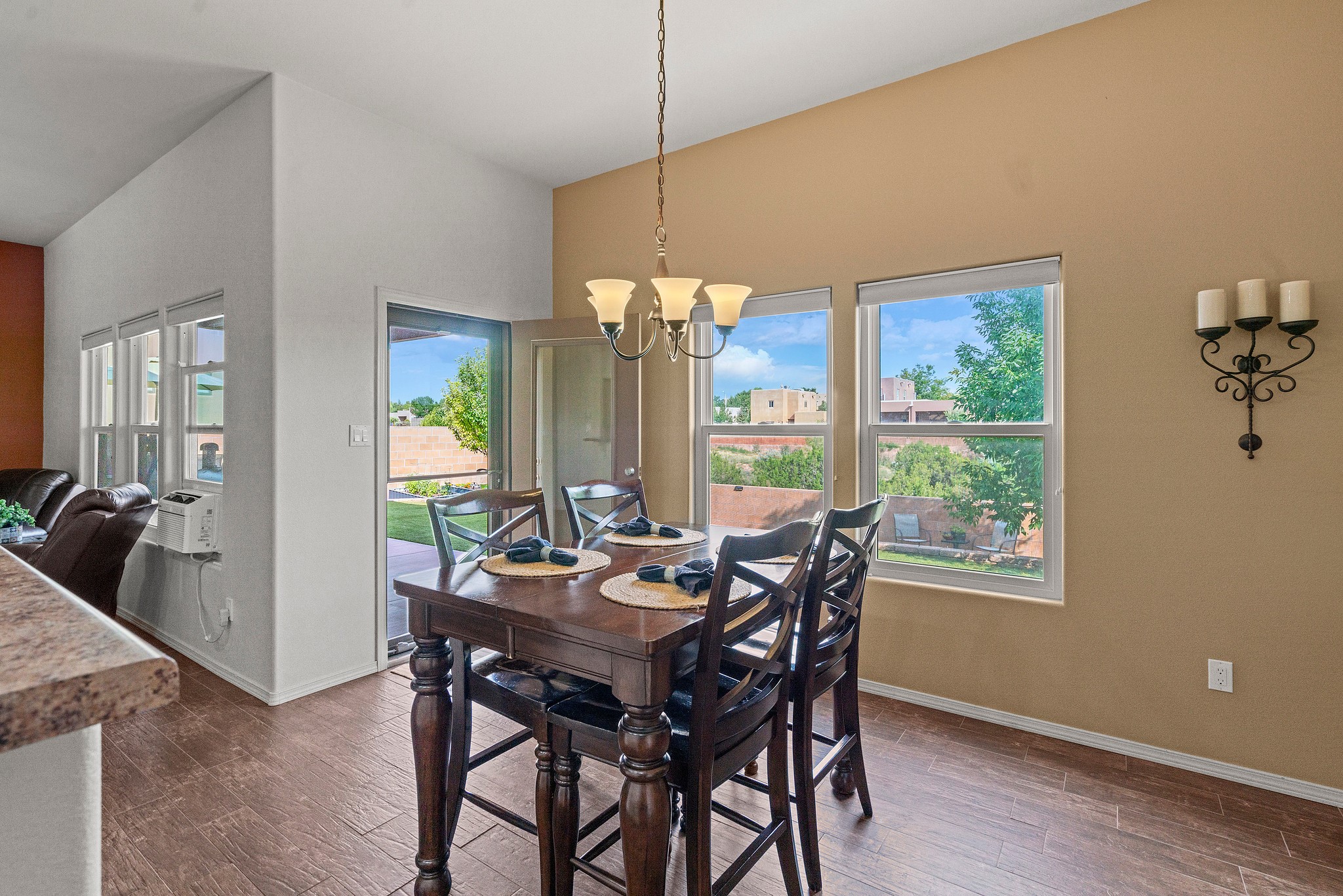 Immaculately Maintained 3-Bedroom, Energy-Efficient Green Home on a Well-Established, Low-Traffic StreetThis beautifully maintained 3-bedroom, 2-bath home features a two-car garage and a newly paved three-car driveway with a custom gate to the backyard. Located in a peaceful neighborhood with easy access to NM-599, the home offers radiant heat and recent upgrades including new tile, carpeted bedrooms, and updated appliances.The spacious, landscaped backyard is perfect for relaxing or entertaining, with a covered portal, extended porch, fire pit, fruit tree, and irrigated raised garden beds. Enjoy added privacy with a natural arroyo located directly behind the home.