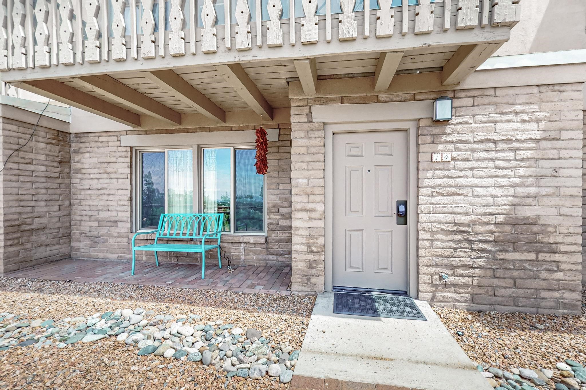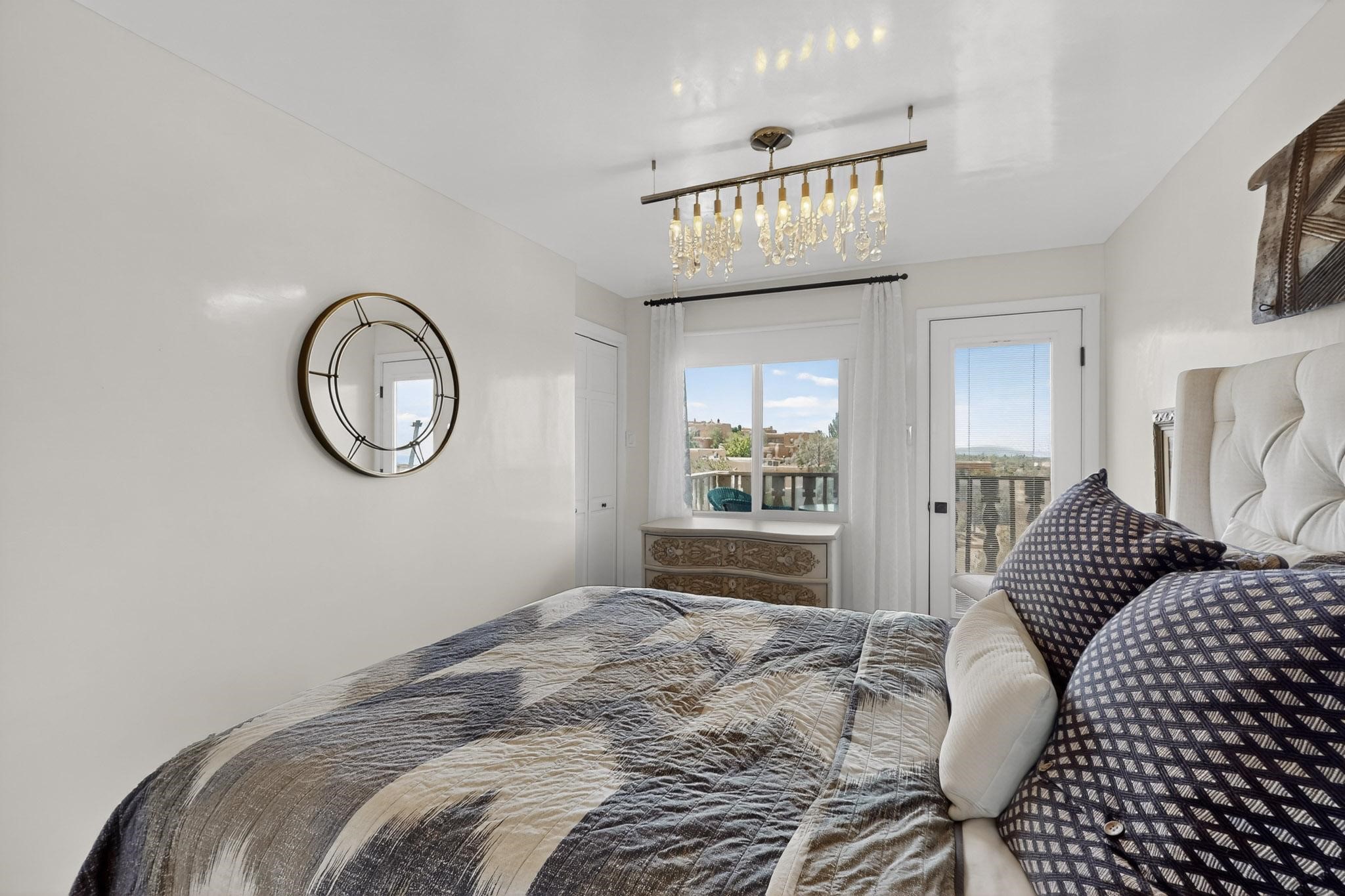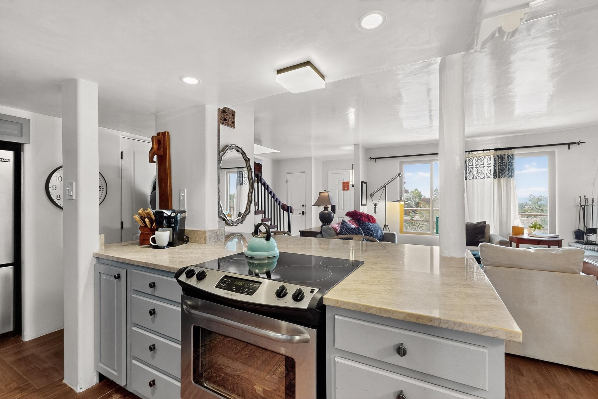 This lovely and convenient two story condo is located not far from the plaza, close to Fort Marcy, and at the bottom of the road leading up to the ski basin. The unit overlooks the green area in the center of the complex, with plenty of light. The living room has a charming kiva fireplace in the corner and views, the dining area has a full mirror to add to the space, and there are built in bookcases. The galley kitchen is convenient and a delight. Located on the main floor is a bath. Up the stairs are two bedrooms, both with access to a private balcony. There is a nicely sized primary bedroom with a private bath and a stacked laundry, and a guest bedroom with a bath in the hall. This beautiful condo complex is arranged on a hill with lovely views, a heated indoor swimming pool, hot tub, storage, rv parking, and on-site management. This particular unit has new heating, air conditioning, roof, and hot water on demand. All furnishings can be included.