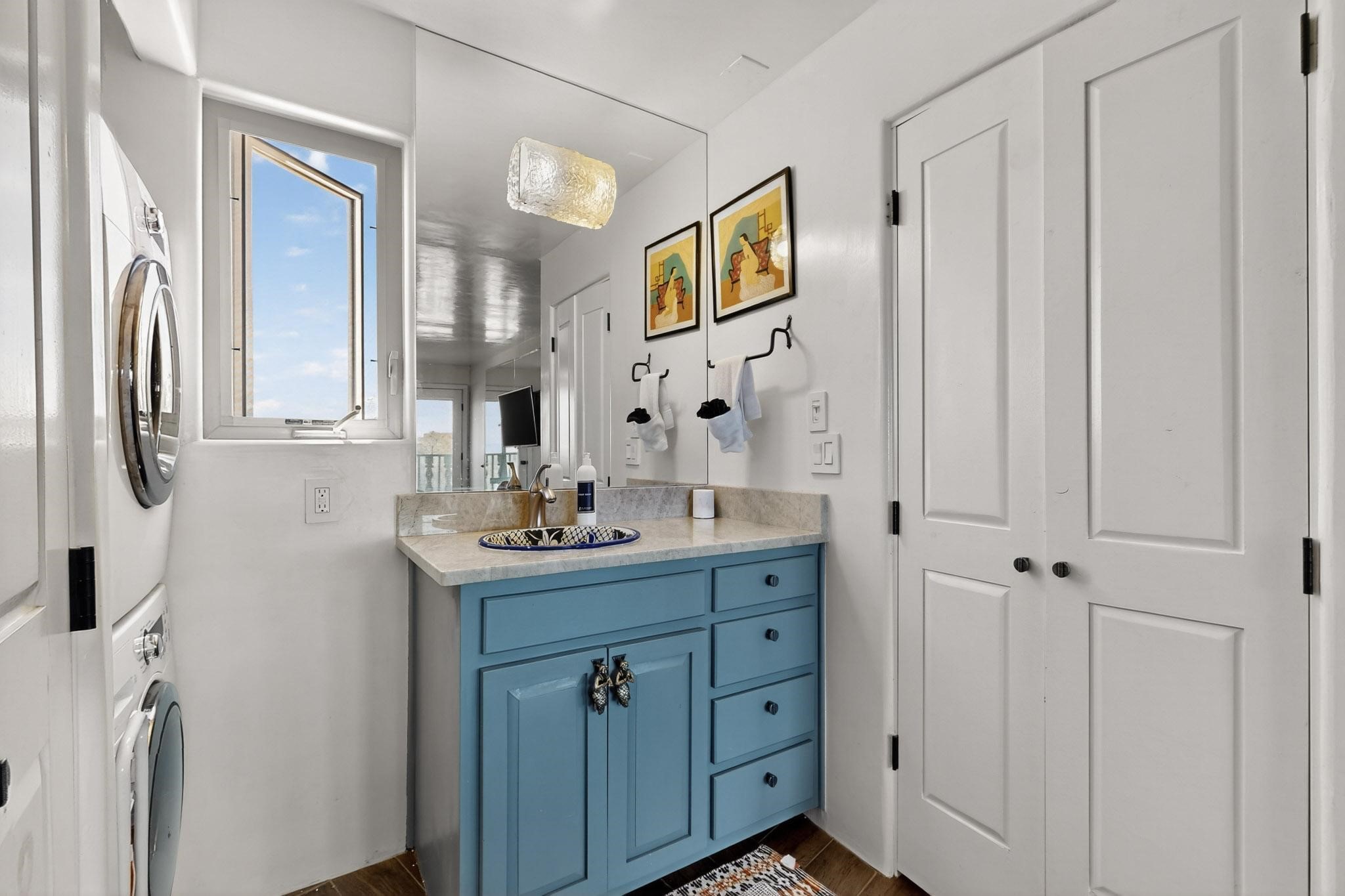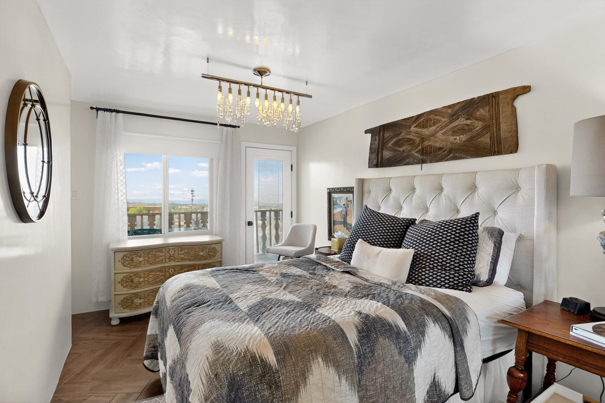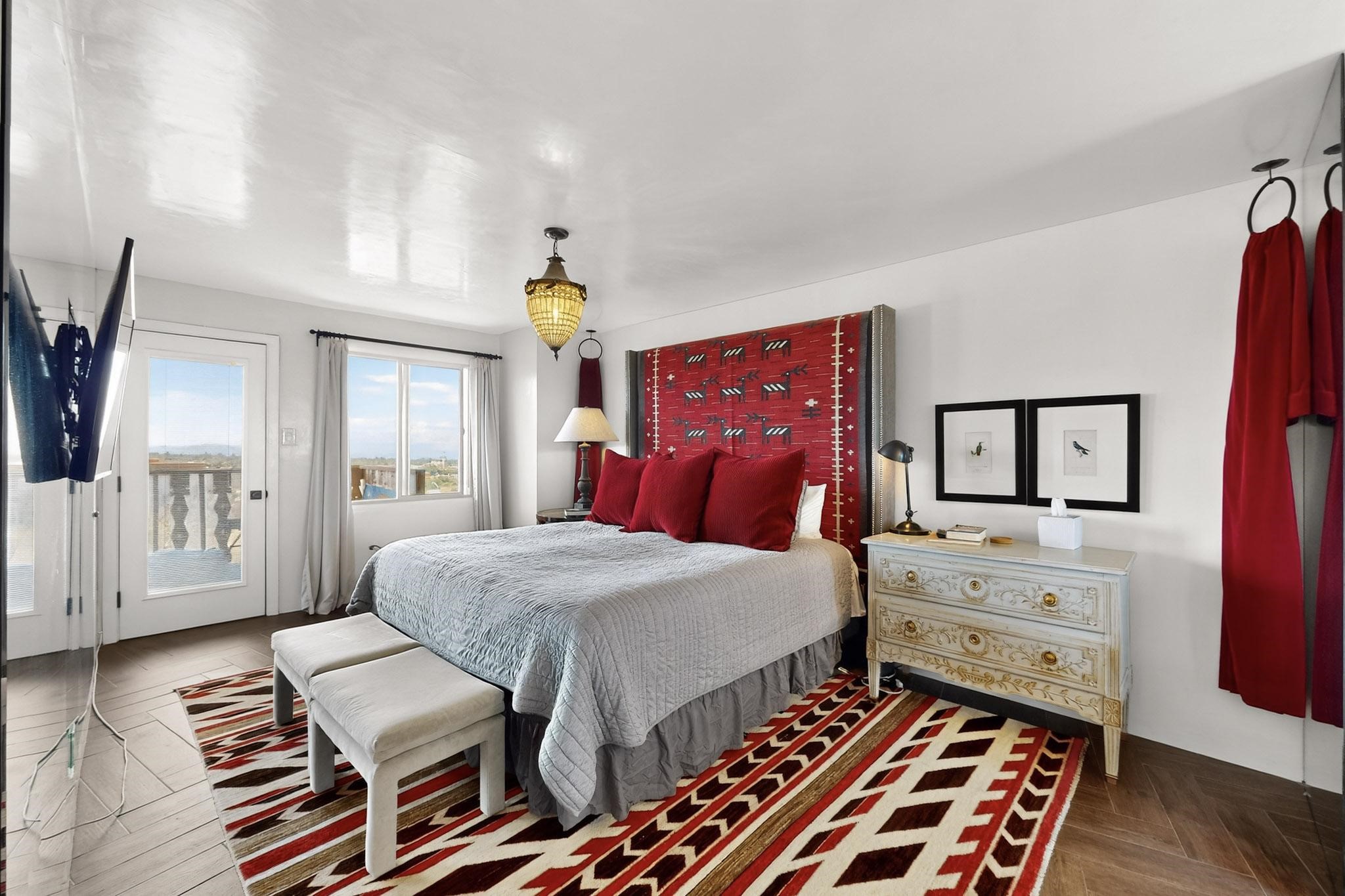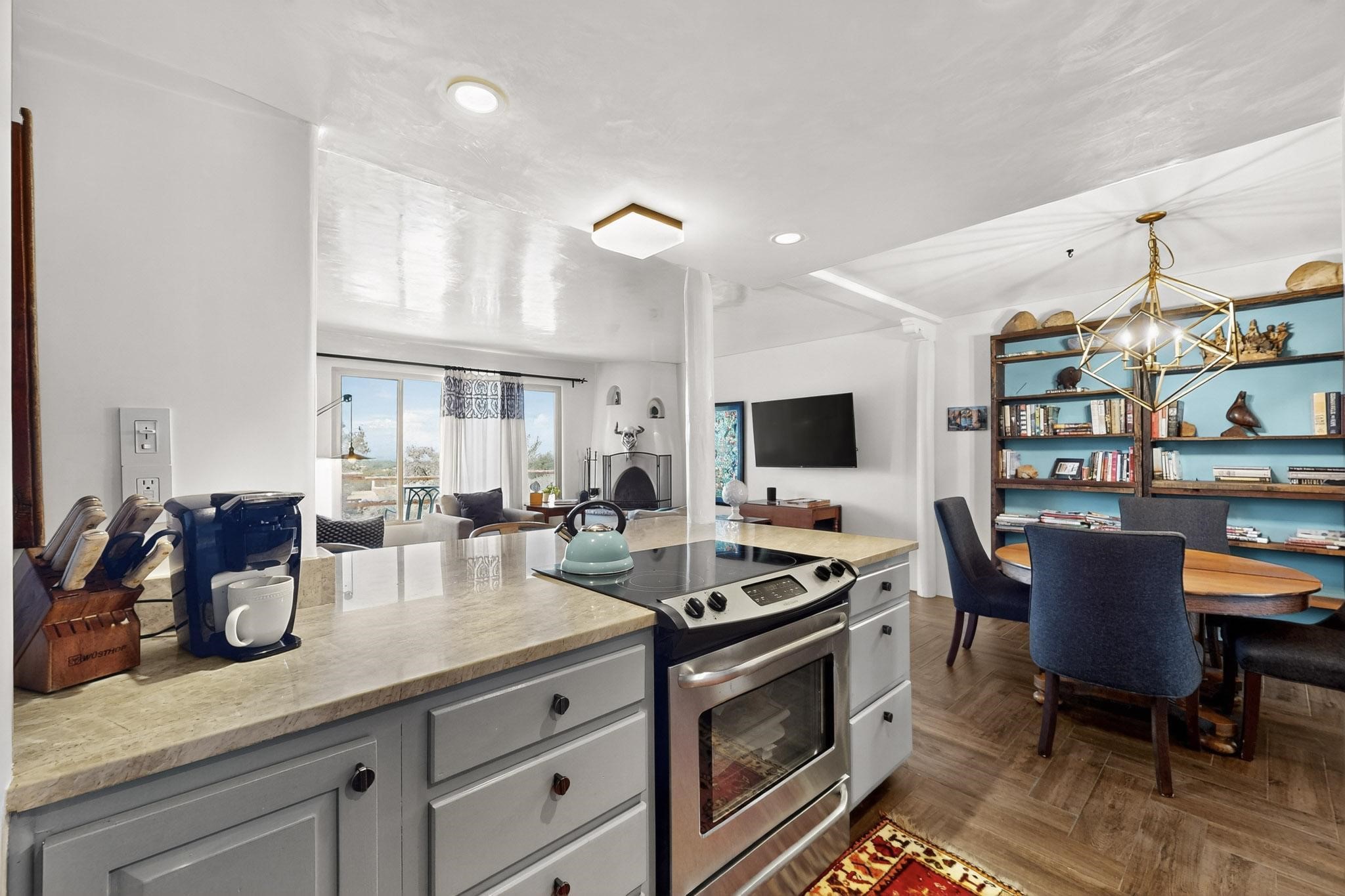 This lovely and convenient two story condo is located not far from the plaza, close to Fort Marcy, and at the bottom of the road leading up to the ski basin. The unit overlooks the green area in the center of the complex, with plenty of light. The living room has a charming kiva fireplace in the corner and views, the dining area has a full mirror to add to the space, and there are built in bookcases. The galley kitchen is convenient and a delight. Located on the main floor is a bath. Up the stairs are two bedrooms, both with access to a private balcony. There is a nicely sized primary bedroom with a private bath and a stacked laundry, and a guest bedroom with a bath in the hall. This beautiful condo complex is arranged on a hill with lovely views, a heated indoor swimming pool, hot tub, storage, rv parking, and on-site management. This particular unit has new heating, air conditioning, roof, and hot water on demand. All furnishings can be included.