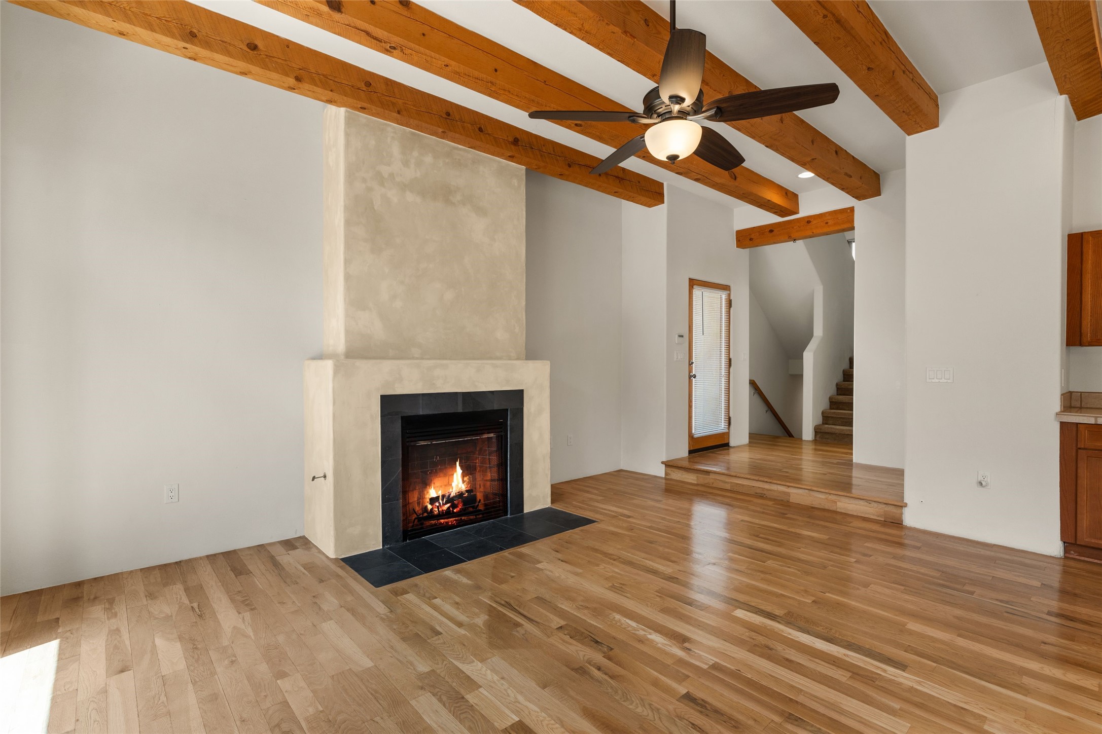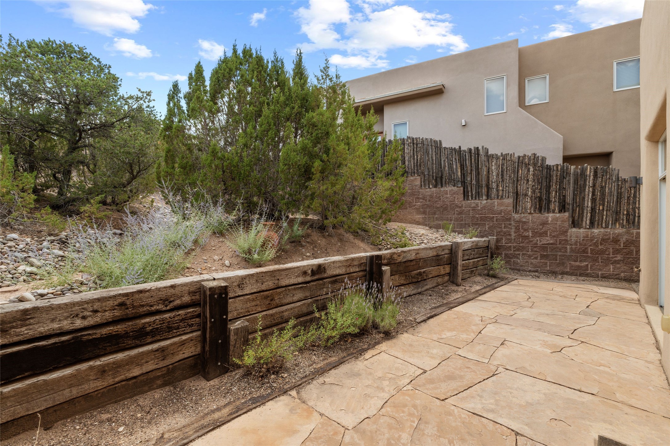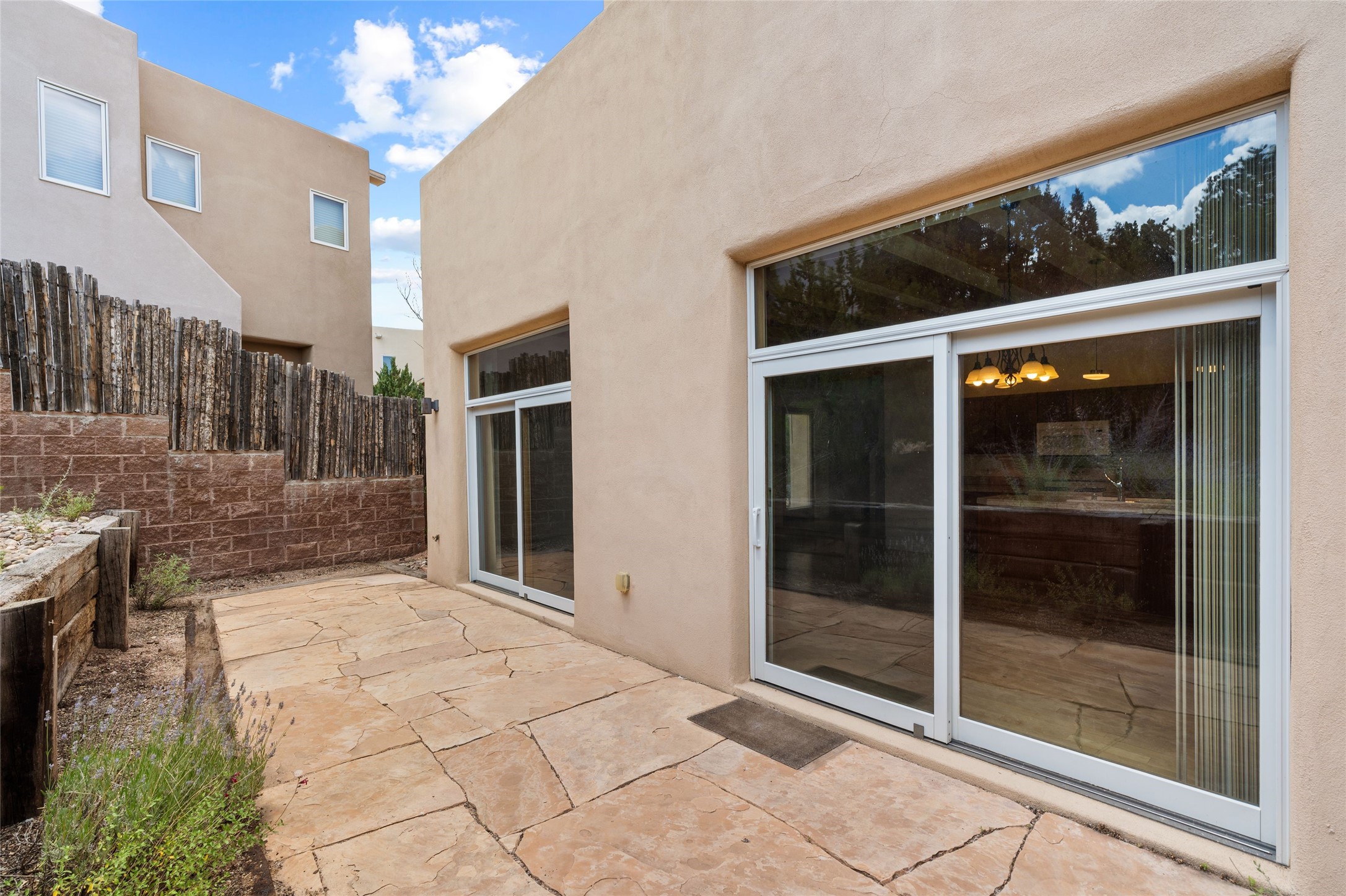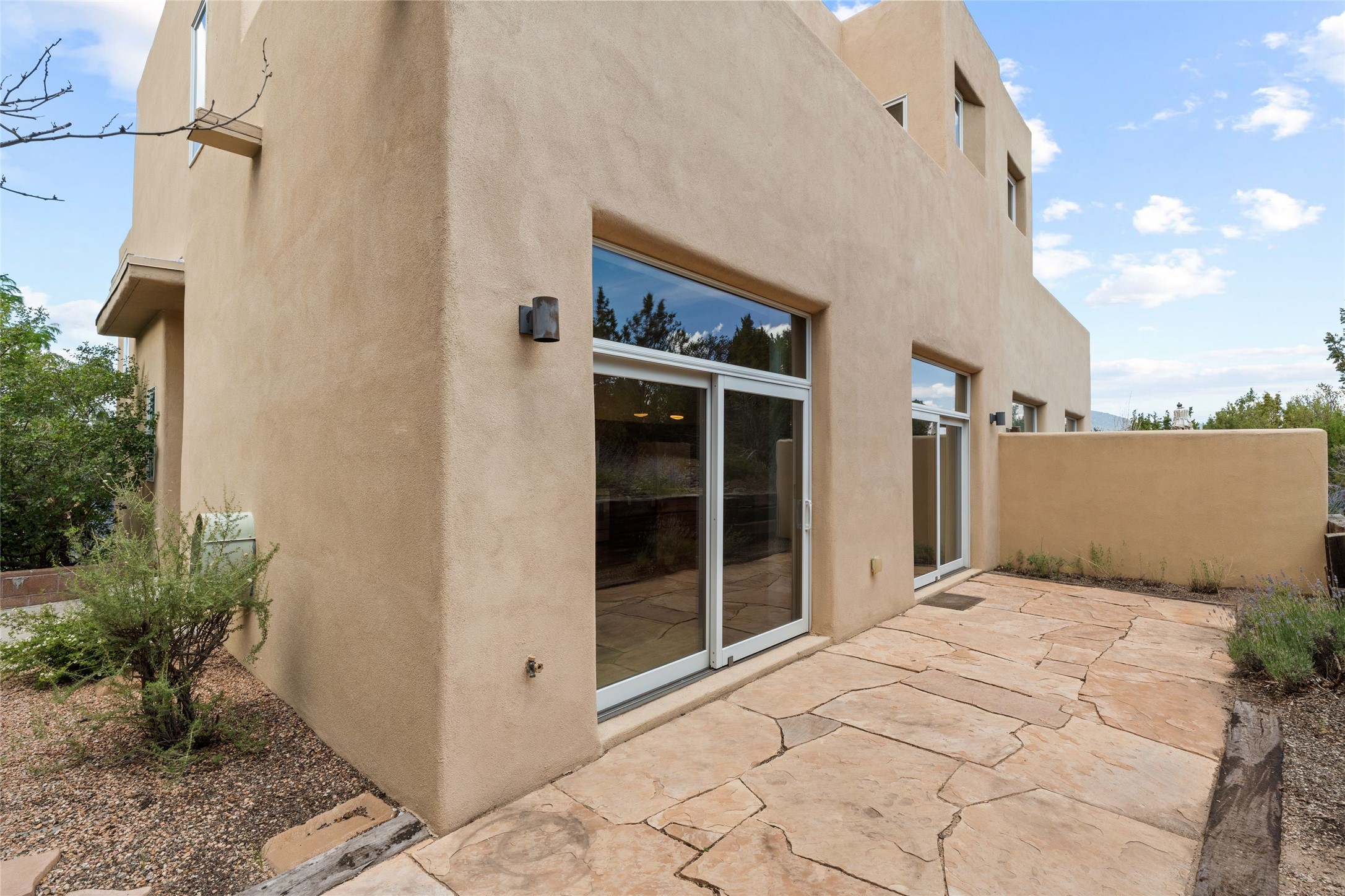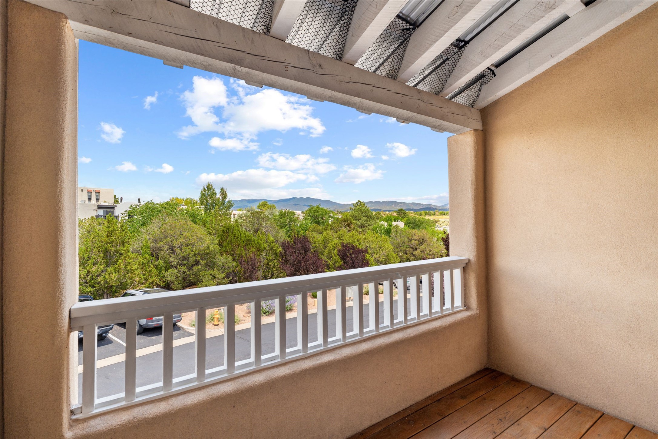 Tucked away on a quiet dead-end street just minutes from downtown Santa Fe, this meticulously maintained 3-bed, 2.5-bath, 2-car garage corner-unit condo offers privacy, comfort, and classic Santa Fe charm. With 1,775 sq. ft. of light-filled space, the open-concept main level features a well-equipped kitchen with abundant cabinetry and center island. The adjoining dining and living areas boast wood floors, high ceilings with wood beams, and a plastered gas fireplace. Sliding doors off the dining and living areas opens to a private patio. Upstairs, the spacious primary suite includes a walk-in closet, private office nook, dual-sink vanity, and its own inviting wrap around balcony. Two guest bedrooms--one with a covered balcony with mountain views--share a full bath. Laundry closet is nearby secondary bedrooms. Additional highlights: radiant in-floor heat, ceiling fans, and newer water heater, boiler, washer/dryer, microwave. Backing to green space and part of a peaceful 20-home enclave, this move-in-ready home offers low-maintenance living with architectural character. Just 0.4 miles from the Park & Ride on Calle Mejia near the Santa Fe Spa and offering quick access to Hwy 285, this location is ideal for commuters--especially those traveling to Los Alamos National Labs.