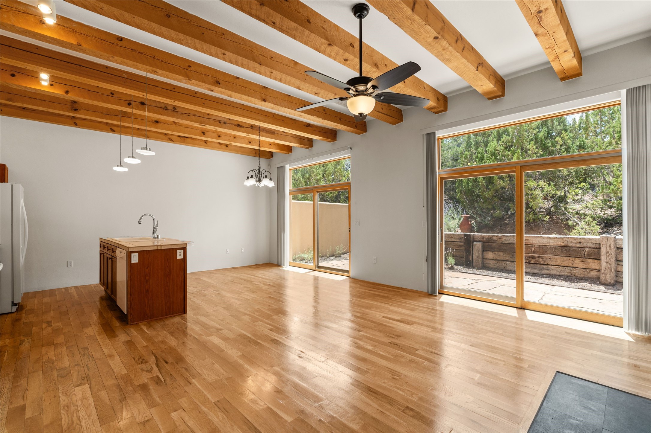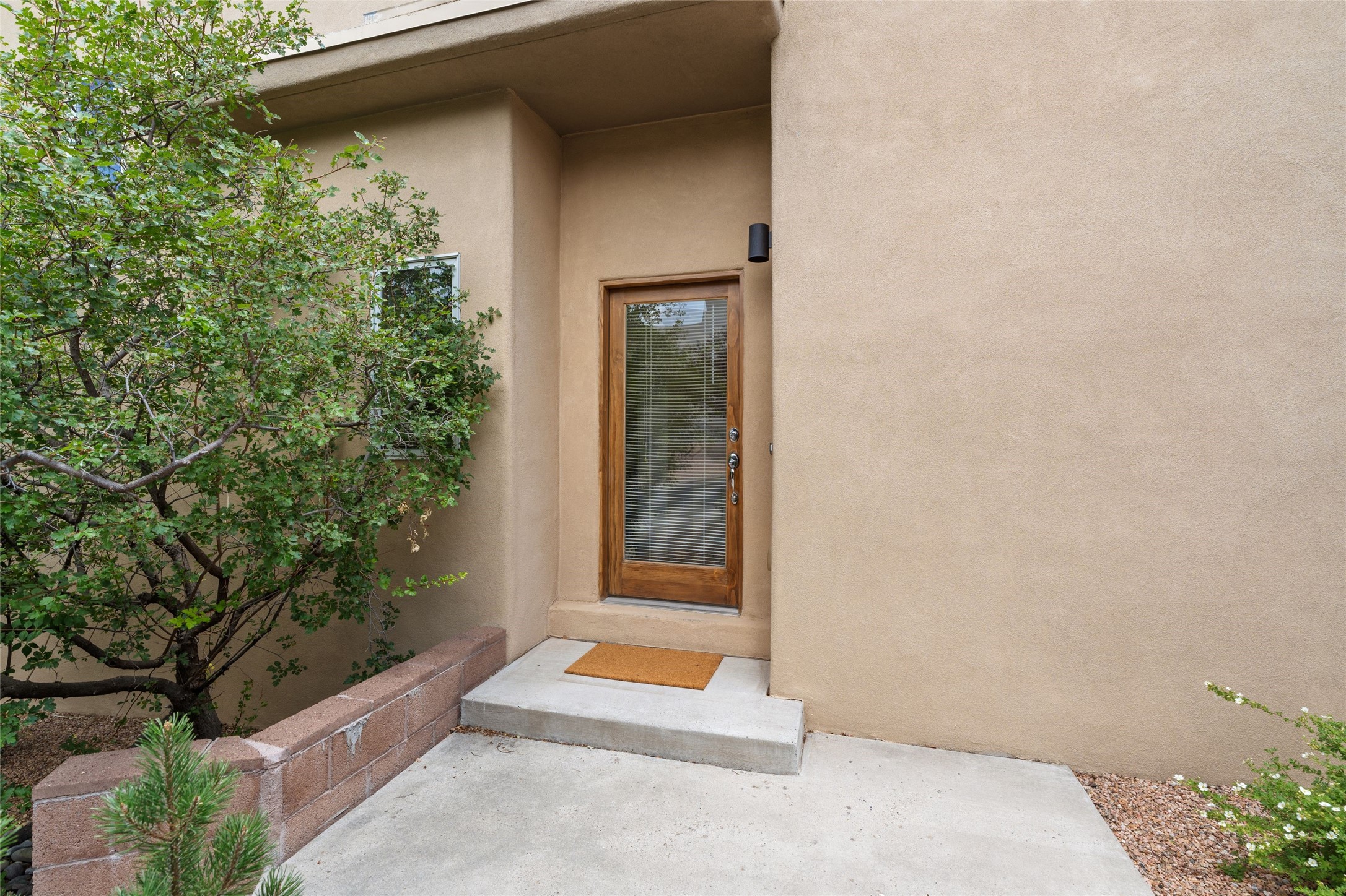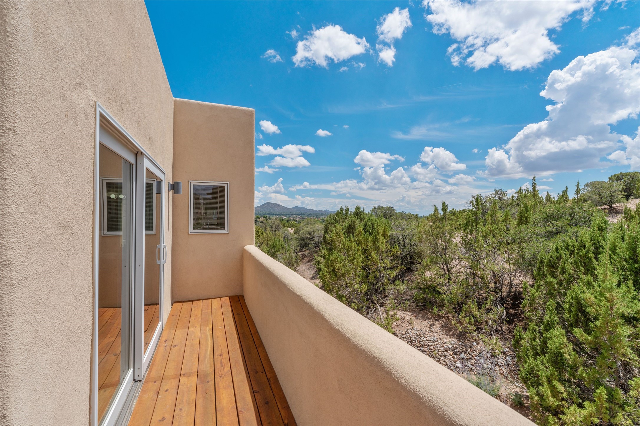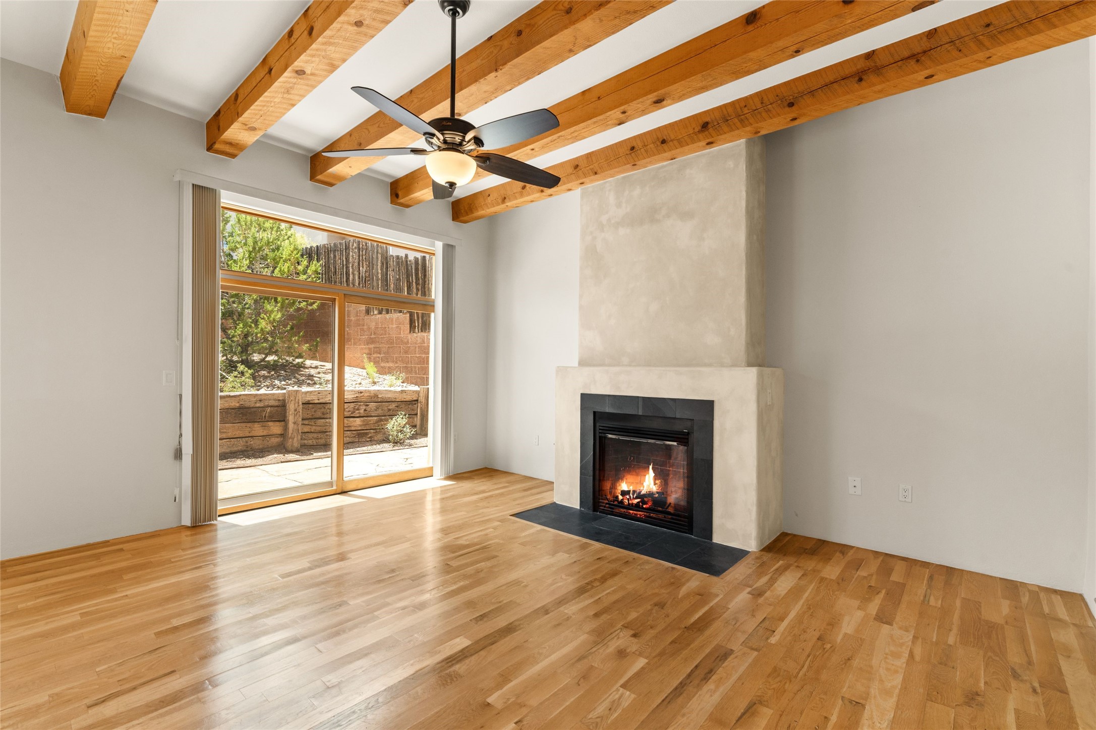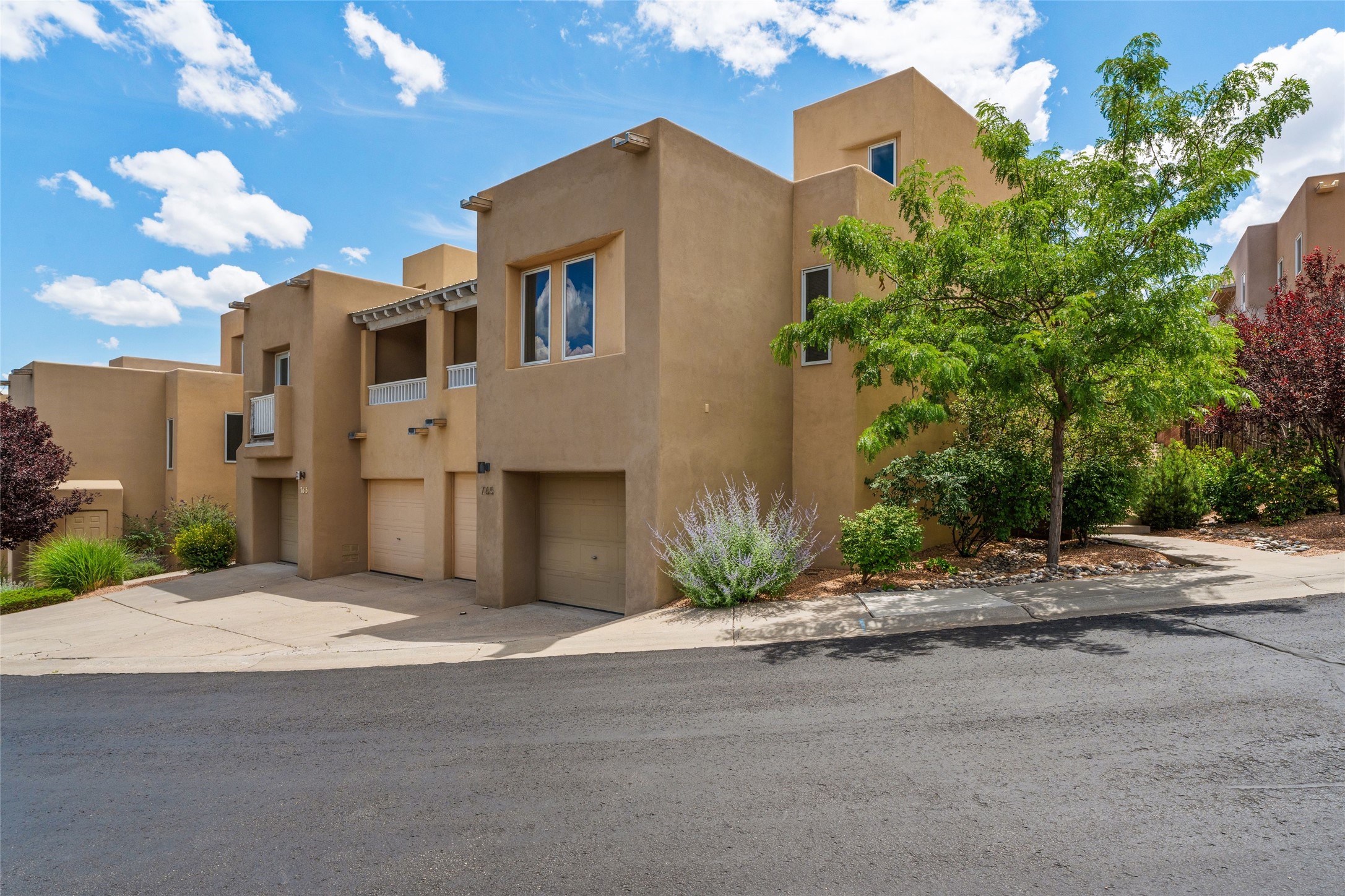 Tucked away on a quiet dead-end street just minutes from downtown Santa Fe, this meticulously maintained 3-bed, 2.5-bath, 2-car garage corner-unit condo offers privacy, comfort, and classic Santa Fe charm. With 1,775 sq. ft. of light-filled space, the open-concept main level features a well-equipped kitchen with abundant cabinetry and center island. The adjoining dining and living areas boast wood floors, high ceilings with wood beams, and a plastered gas fireplace. Sliding doors off the dining and living areas opens to a private patio. Upstairs, the spacious primary suite includes a walk-in closet, private office nook, dual-sink vanity, and its own inviting wrap around balcony. Two guest bedrooms--one with a covered balcony with mountain views--share a full bath. Laundry closet is nearby secondary bedrooms. Additional highlights: radiant in-floor heat, ceiling fans, and newer water heater, boiler, washer/dryer, microwave. Backing to green space and part of a peaceful 20-home enclave, this move-in-ready home offers low-maintenance living with architectural character. Just 0.4 miles from the Park & Ride on Calle Mejia near the Santa Fe Spa and offering quick access to Hwy 285, this location is ideal for commuters--especially those traveling to Los Alamos National Labs.