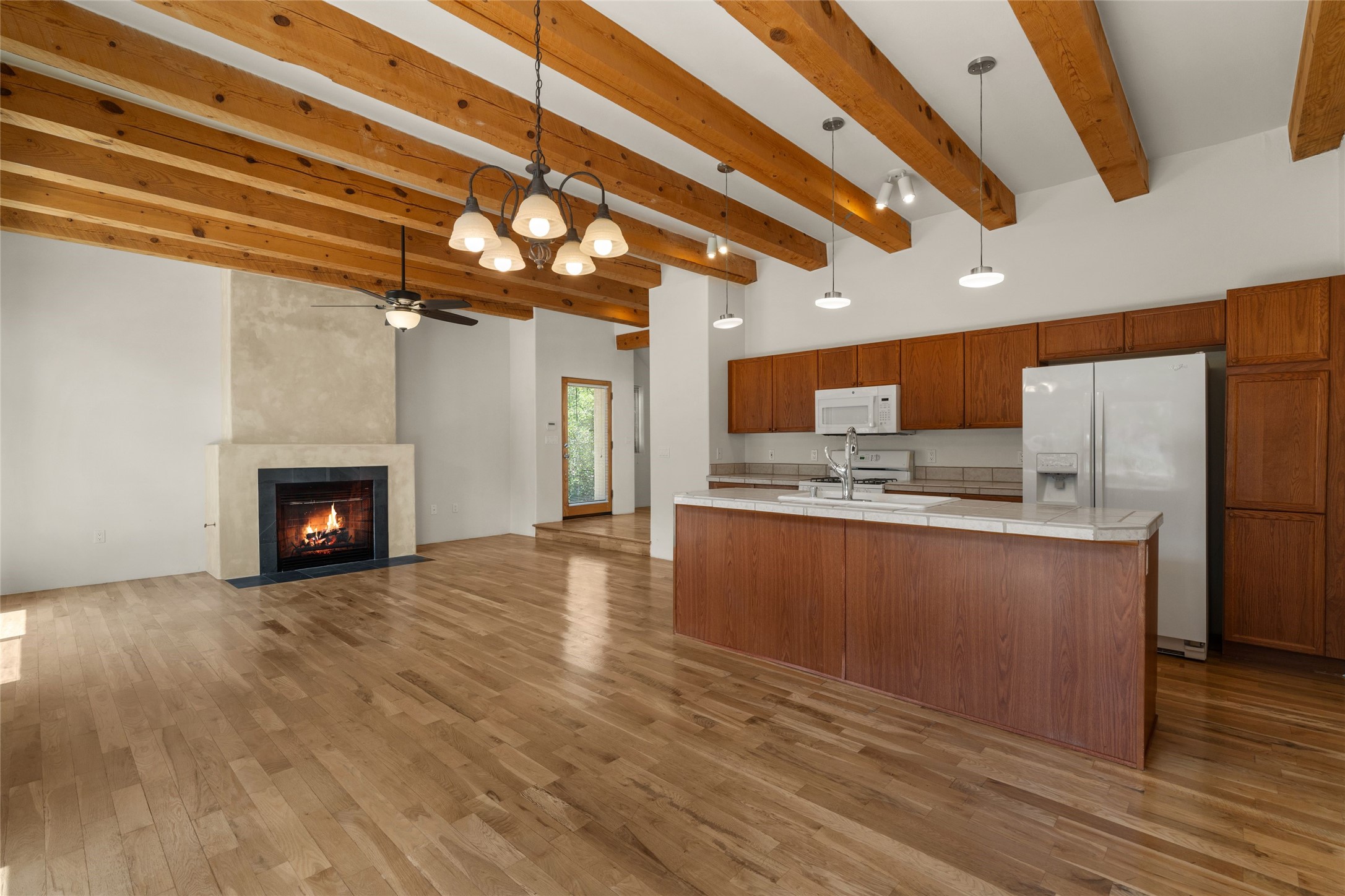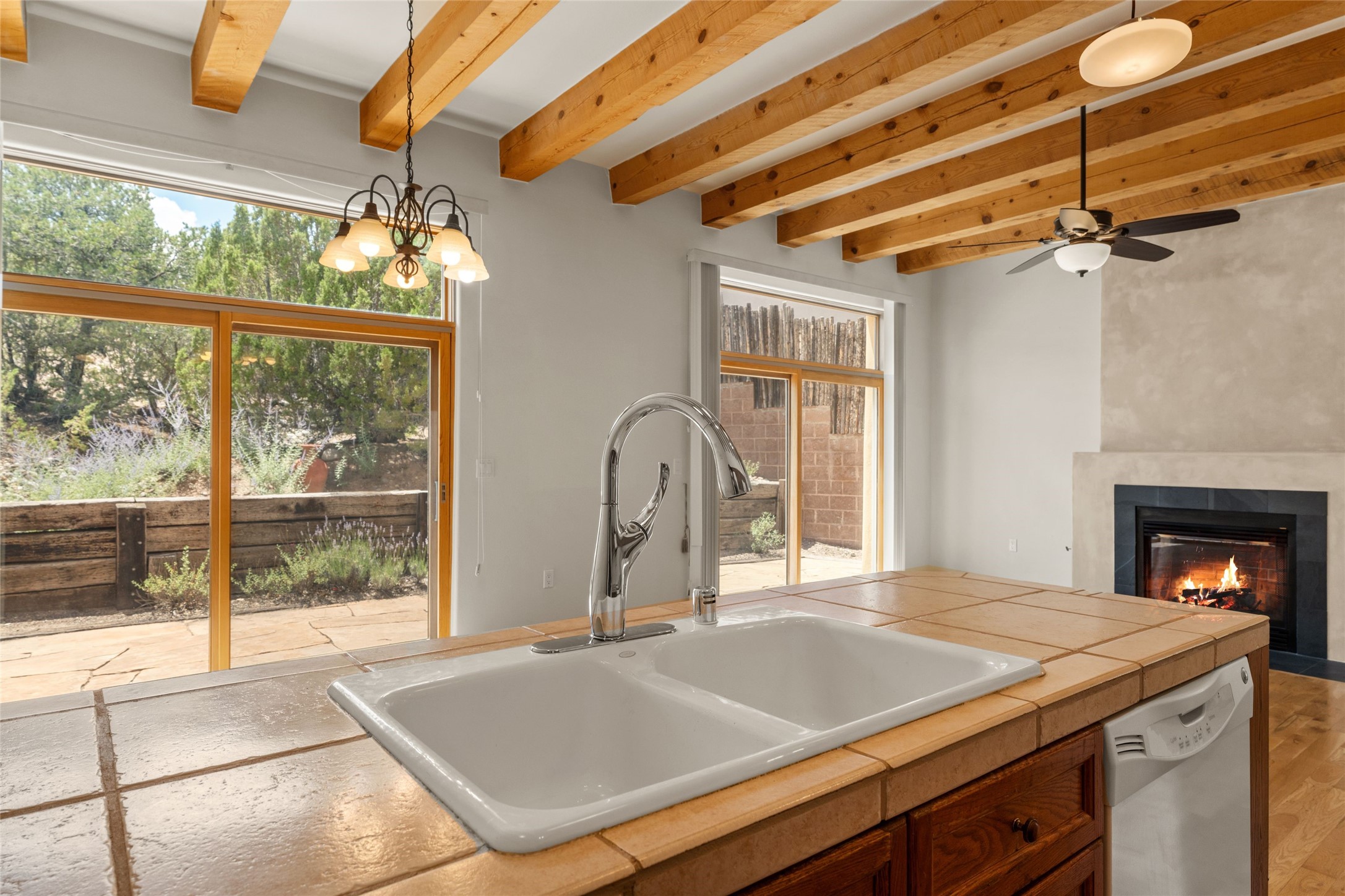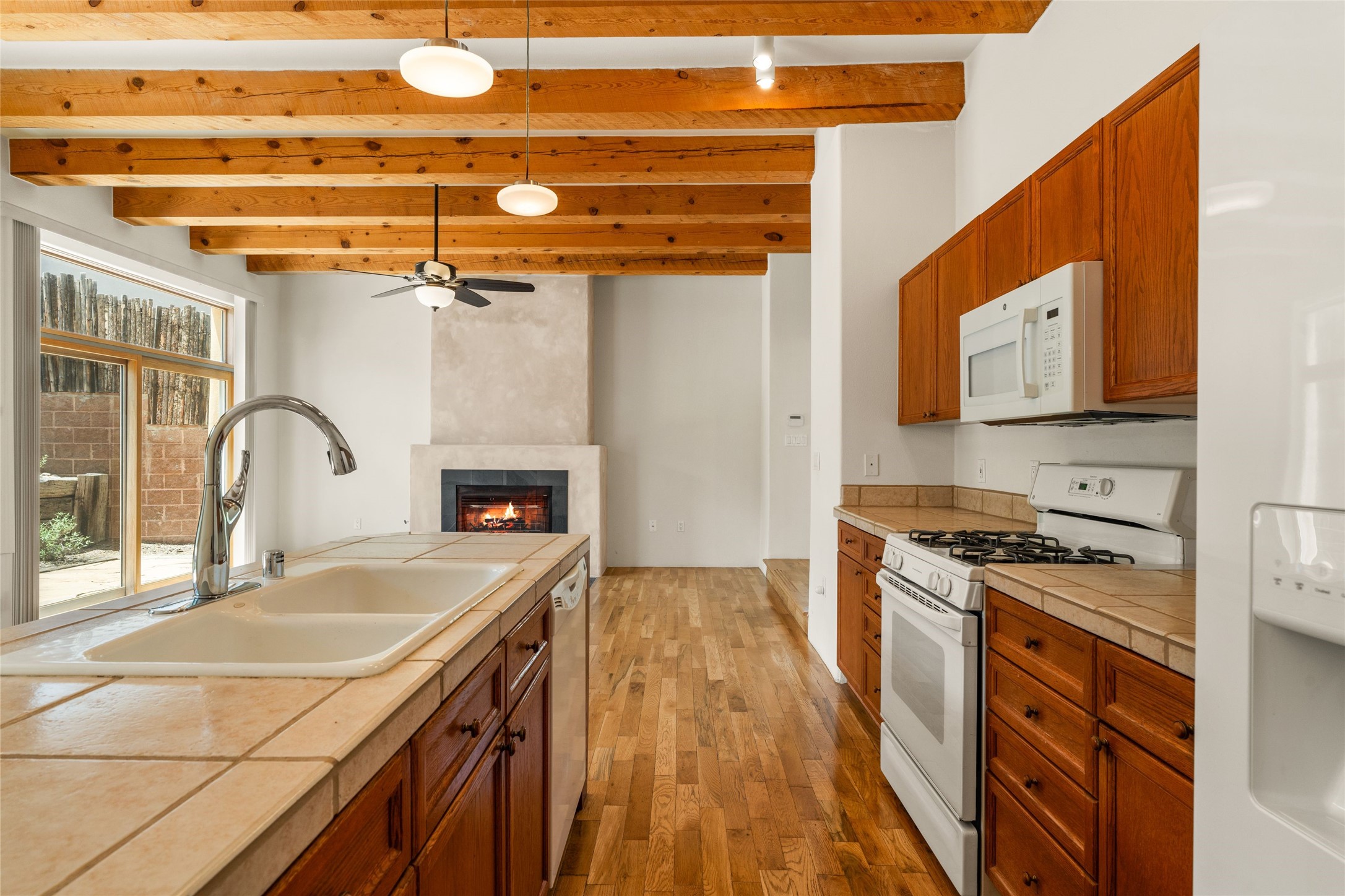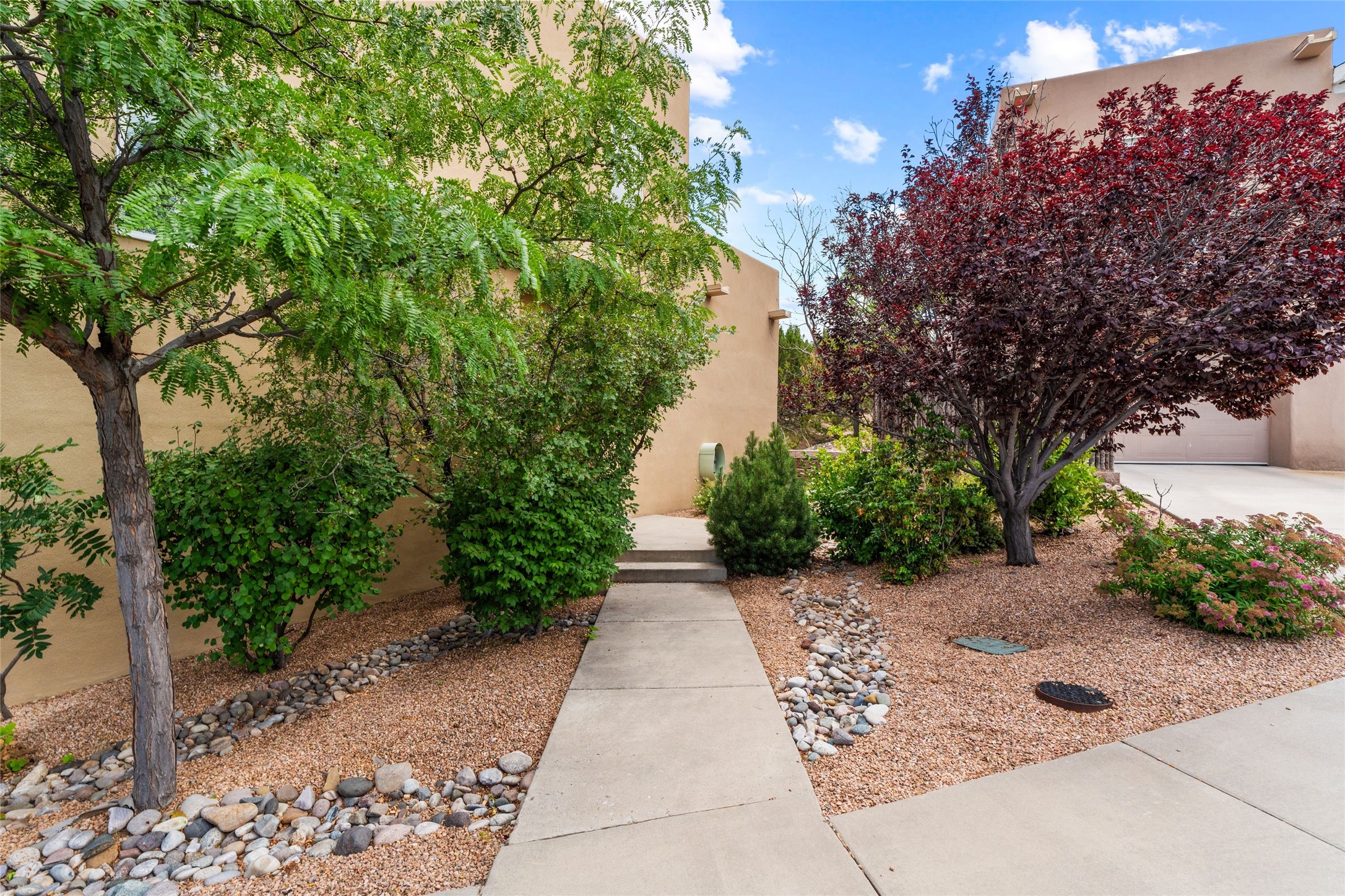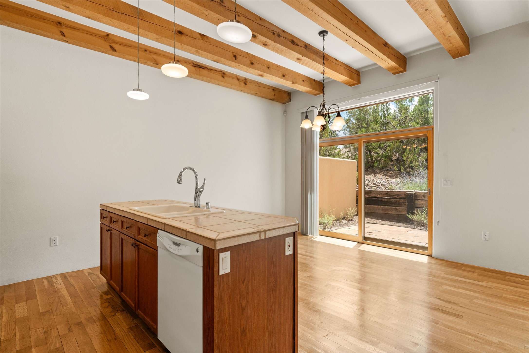 Tucked away on a quiet dead-end street just minutes from downtown Santa Fe, this meticulously maintained 3-bed, 2.5-bath, 2-car garage corner-unit condo offers privacy, comfort, and classic Santa Fe charm. With 1,775 sq. ft. of light-filled space, the open-concept main level features a well-equipped kitchen with abundant cabinetry and center island. The adjoining dining and living areas boast wood floors, high ceilings with wood beams, and a plastered gas fireplace. Sliding doors off the dining and living areas opens to a private patio. Upstairs, the spacious primary suite includes a walk-in closet, private office nook, dual-sink vanity, and its own inviting wrap around balcony. Two guest bedrooms--one with a covered balcony with mountain views--share a full bath. Laundry closet is nearby secondary bedrooms. Additional highlights: radiant in-floor heat, ceiling fans, and newer water heater, boiler, washer/dryer, microwave. Backing to green space and part of a peaceful 20-home enclave, this move-in-ready home offers low-maintenance living with architectural character. Just 0.4 miles from the Park & Ride on Calle Mejia near the Santa Fe Spa and offering quick access to Hwy 285, this location is ideal for commuters--especially those traveling to Los Alamos National Labs.