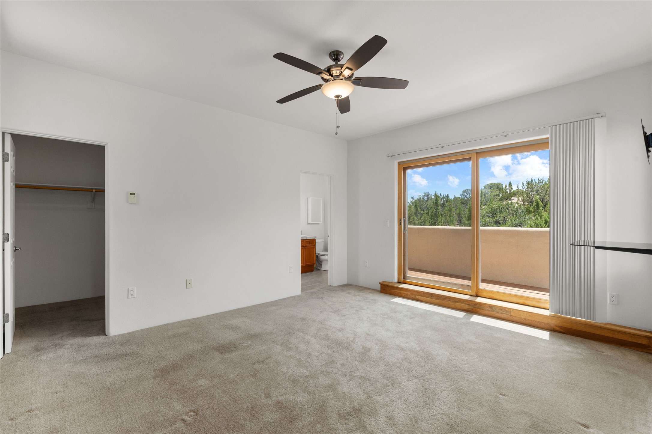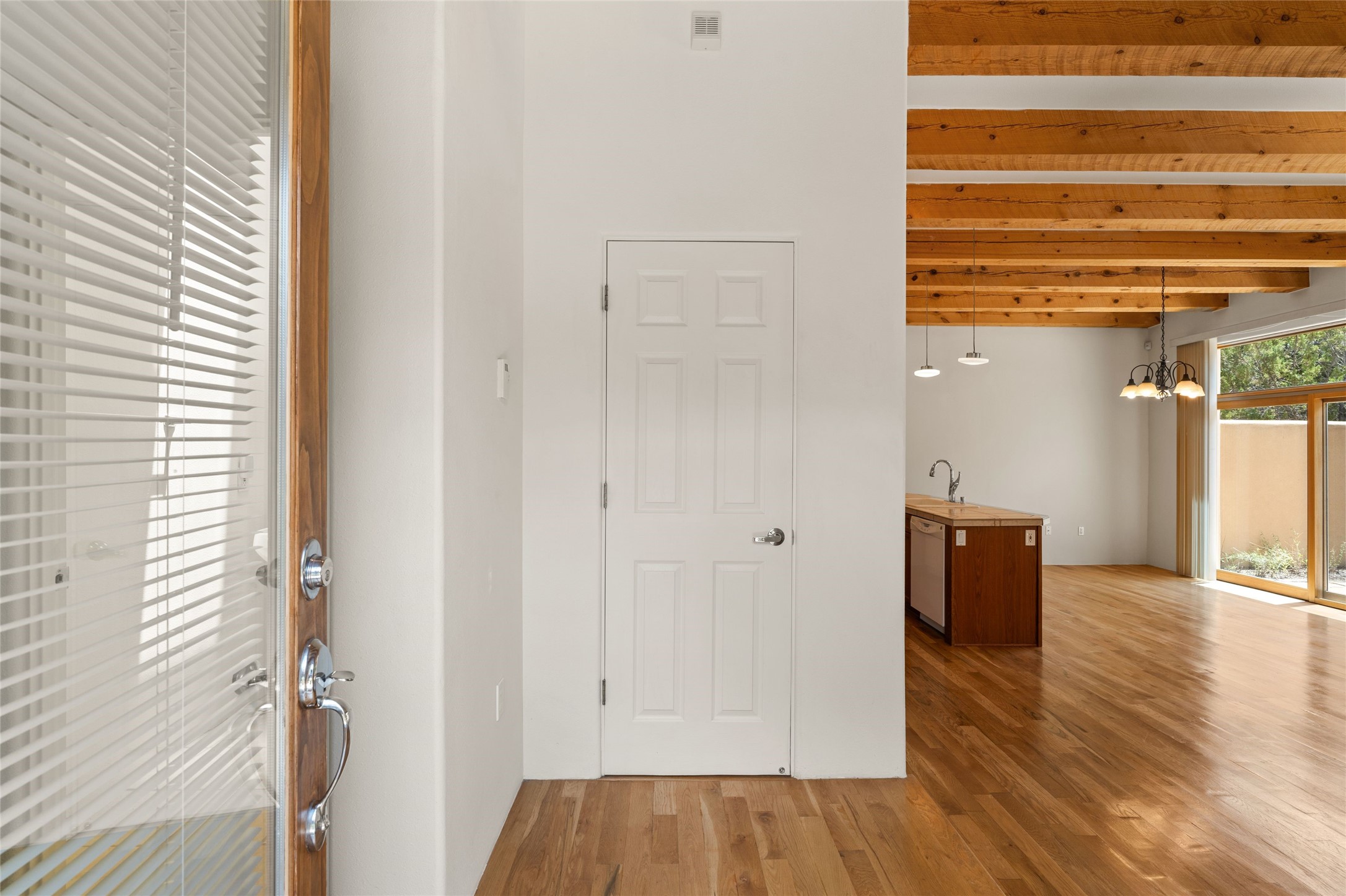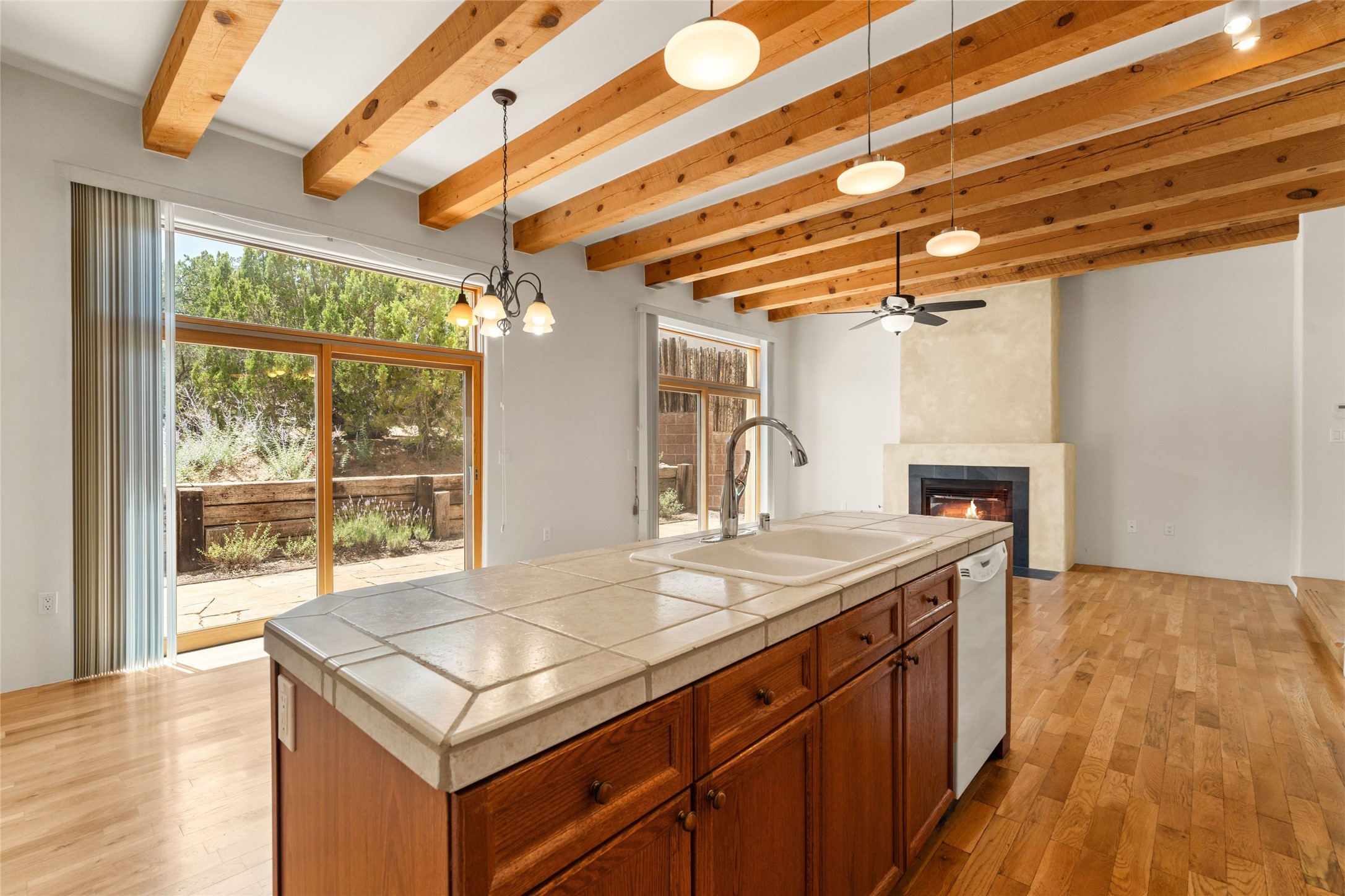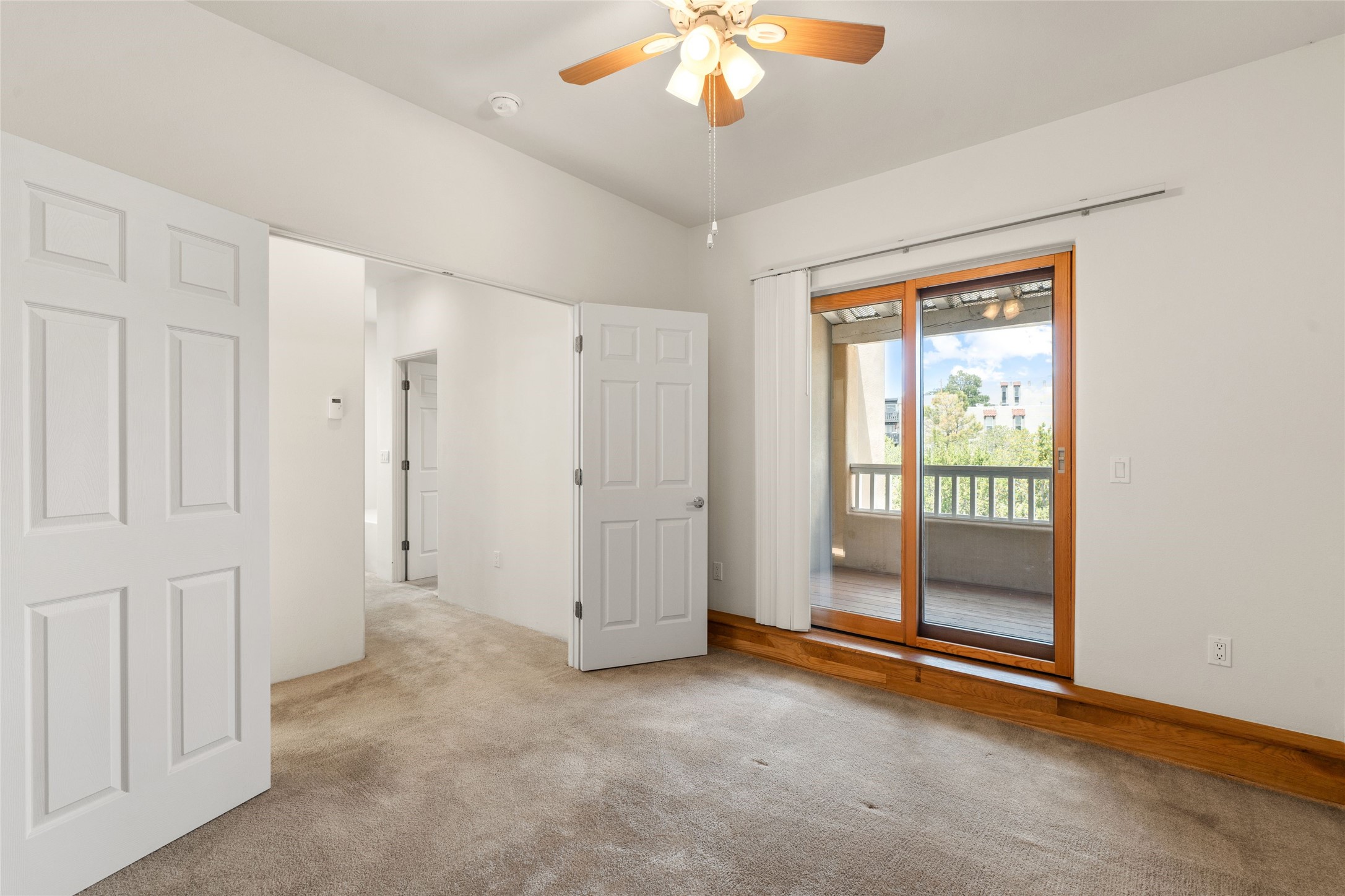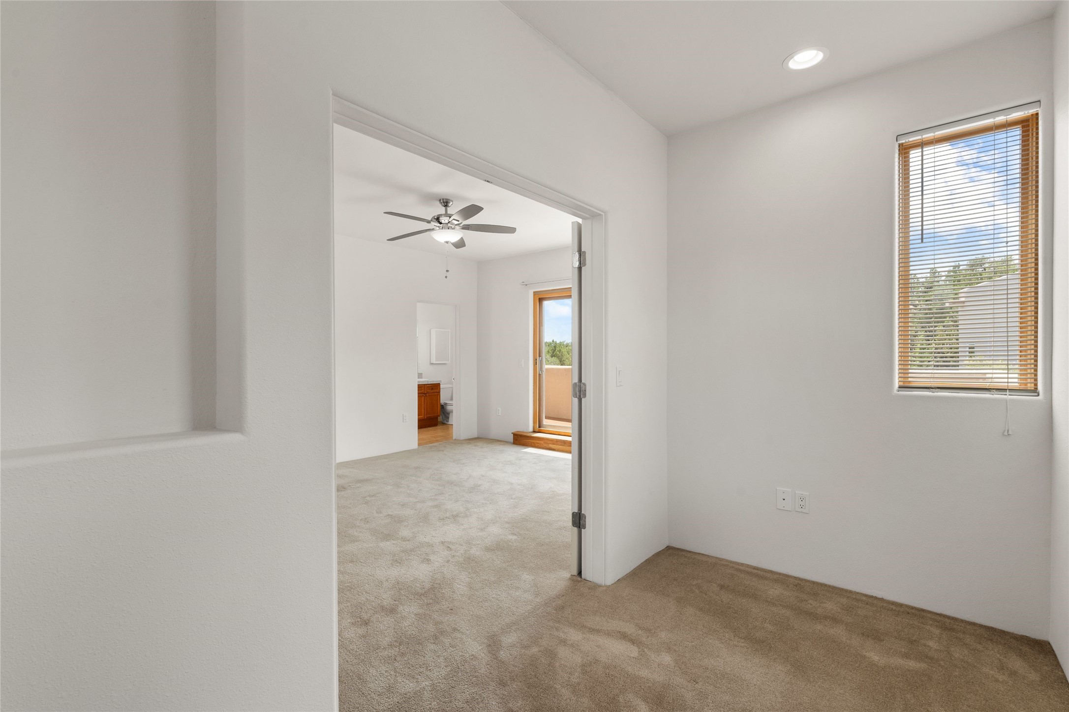 Tucked away on a quiet dead-end street just minutes from downtown Santa Fe, this meticulously maintained 3-bed, 2.5-bath, 2-car garage corner-unit condo offers privacy, comfort, and classic Santa Fe charm. With 1,775 sq. ft. of light-filled space, the open-concept main level features a well-equipped kitchen with abundant cabinetry and center island. The adjoining dining and living areas boast wood floors, high ceilings with wood beams, and a plastered gas fireplace. Sliding doors off the dining and living areas opens to a private patio. Upstairs, the spacious primary suite includes a walk-in closet, private office nook, dual-sink vanity, and its own inviting wrap around balcony. Two guest bedrooms--one with a covered balcony with mountain views--share a full bath. Laundry closet is nearby secondary bedrooms. Additional highlights: radiant in-floor heat, ceiling fans, and newer water heater, boiler, washer/dryer, microwave. Backing to green space and part of a peaceful 20-home enclave, this move-in-ready home offers low-maintenance living with architectural character. Just 0.4 miles from the Park & Ride on Calle Mejia near the Santa Fe Spa and offering quick access to Hwy 285, this location is ideal for commuters--especially those traveling to Los Alamos National Labs.