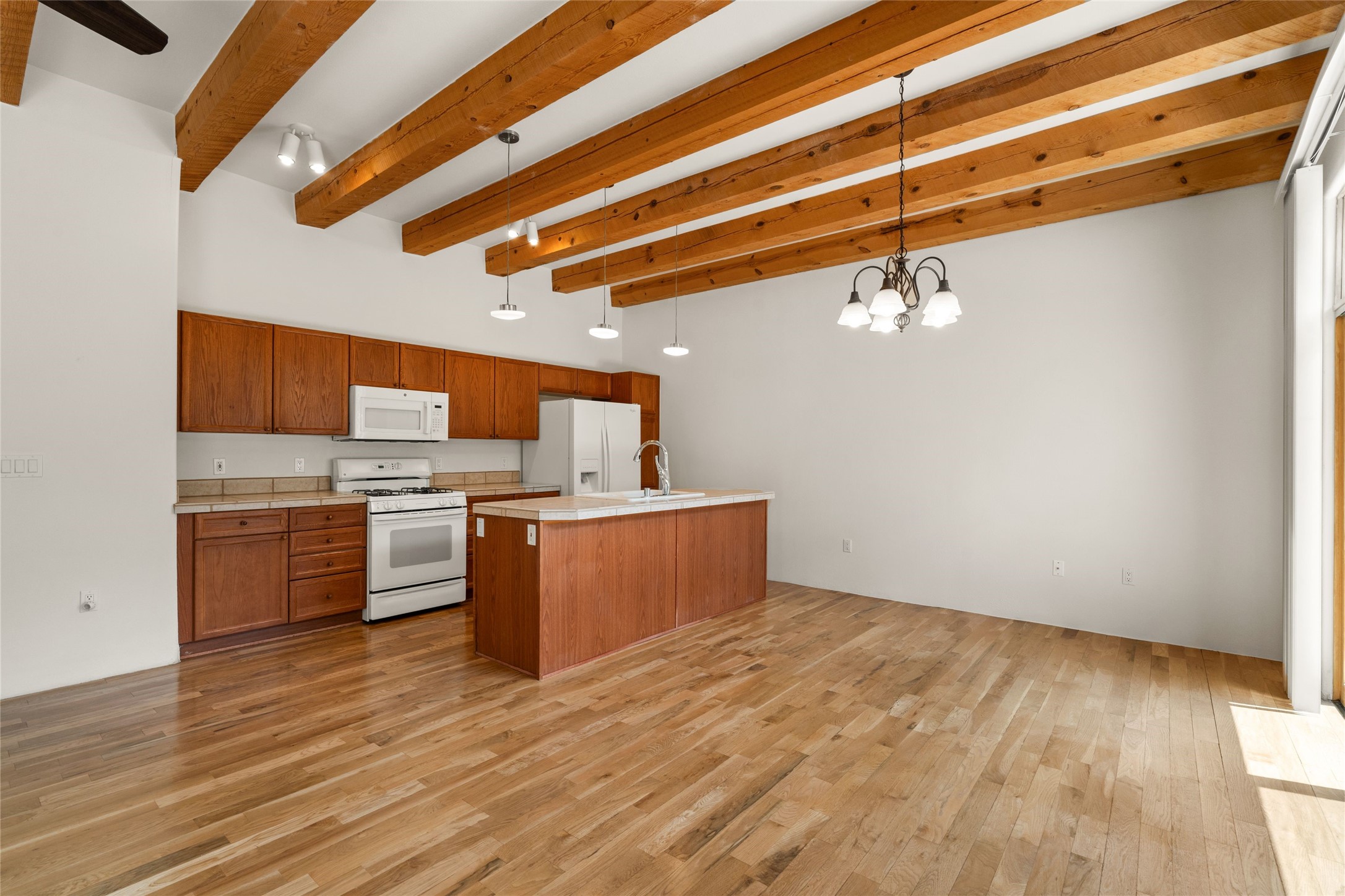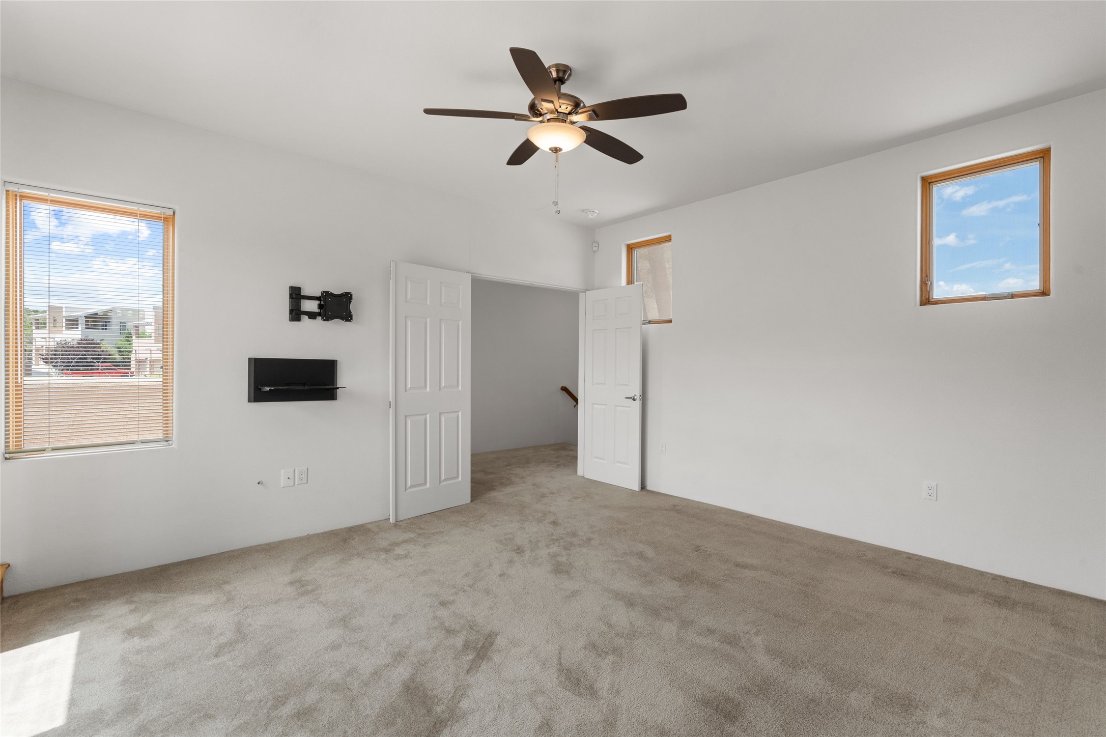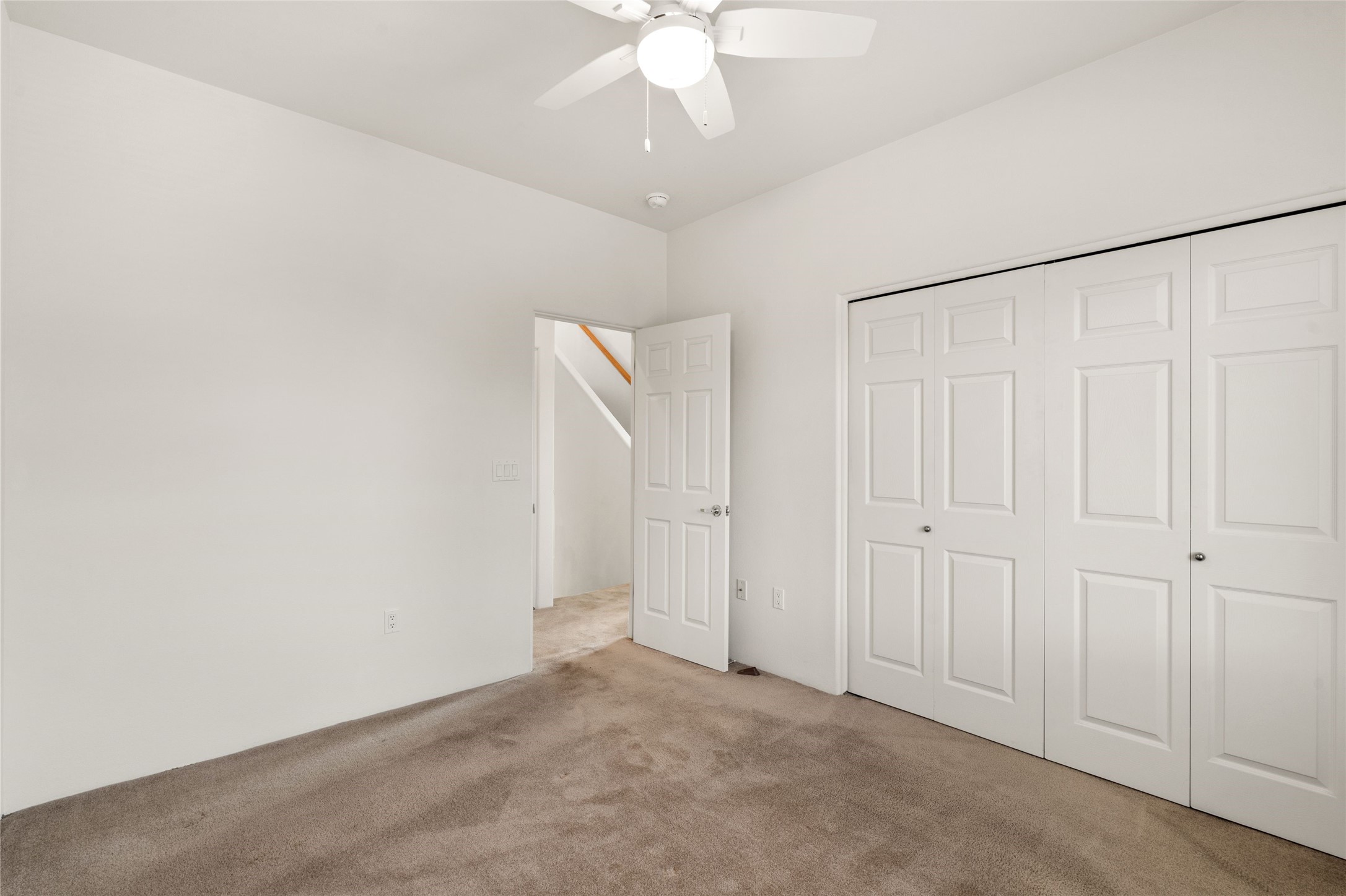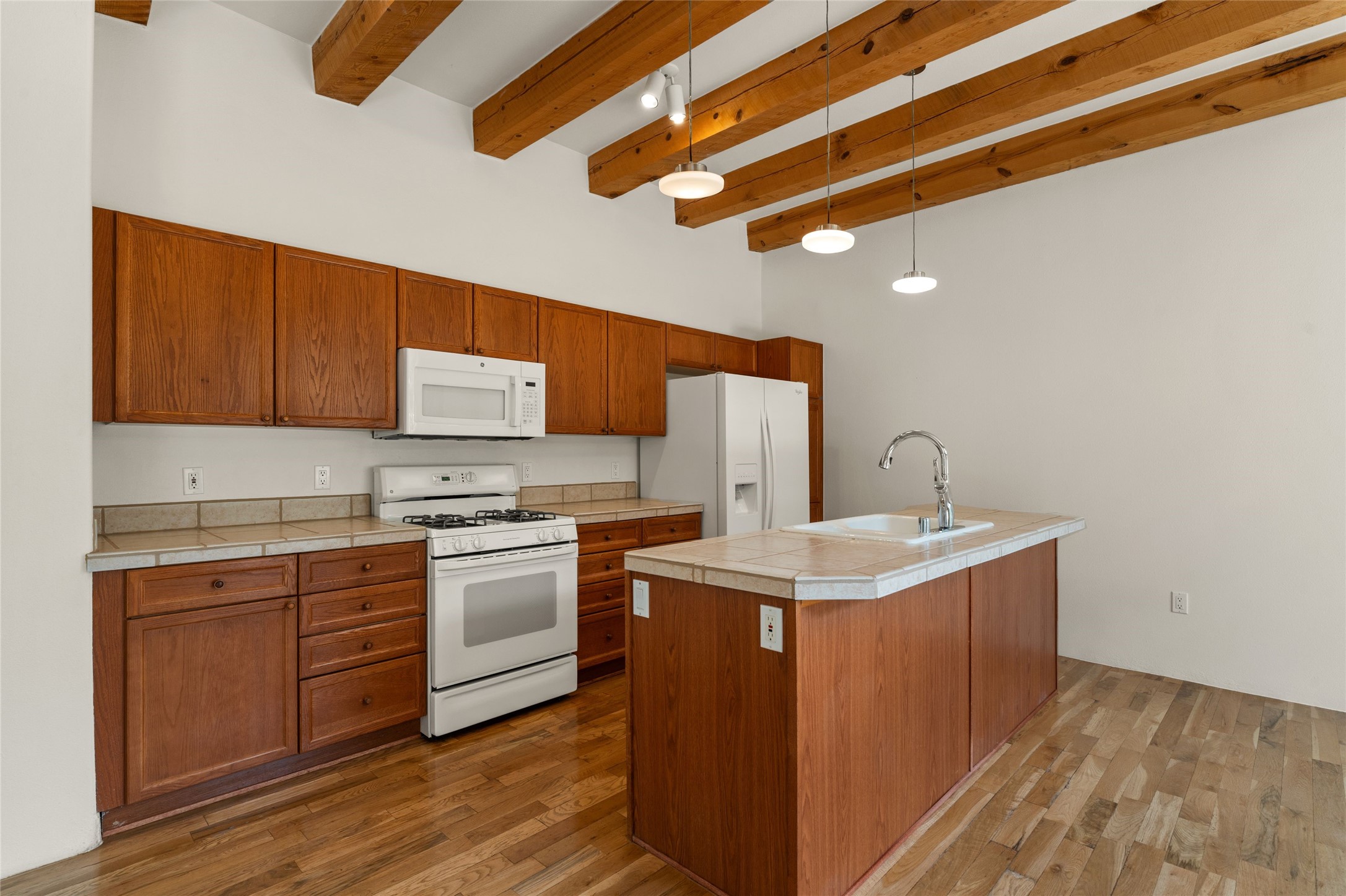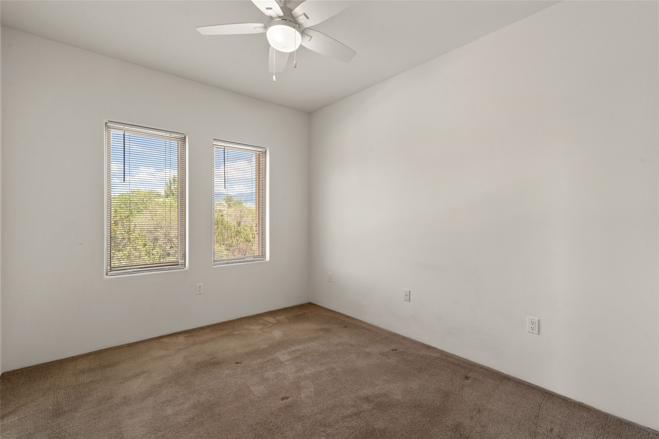 Tucked away on a quiet dead-end street just minutes from downtown Santa Fe, this meticulously maintained 3-bed, 2.5-bath, 2-car garage corner-unit condo offers privacy, comfort, and classic Santa Fe charm. With 1,775 sq. ft. of light-filled space, the open-concept main level features a well-equipped kitchen with abundant cabinetry and center island. The adjoining dining and living areas boast wood floors, high ceilings with wood beams, and a plastered gas fireplace. Sliding doors off the dining and living areas opens to a private patio. Upstairs, the spacious primary suite includes a walk-in closet, private office nook, dual-sink vanity, and its own inviting wrap around balcony. Two guest bedrooms--one with a covered balcony with mountain views--share a full bath. Laundry closet is nearby secondary bedrooms. Additional highlights: radiant in-floor heat, ceiling fans, and newer water heater, boiler, washer/dryer, microwave. Backing to green space and part of a peaceful 20-home enclave, this move-in-ready home offers low-maintenance living with architectural character. Just 0.4 miles from the Park & Ride on Calle Mejia near the Santa Fe Spa and offering quick access to Hwy 285, this location is ideal for commuters--especially those traveling to Los Alamos National Labs.