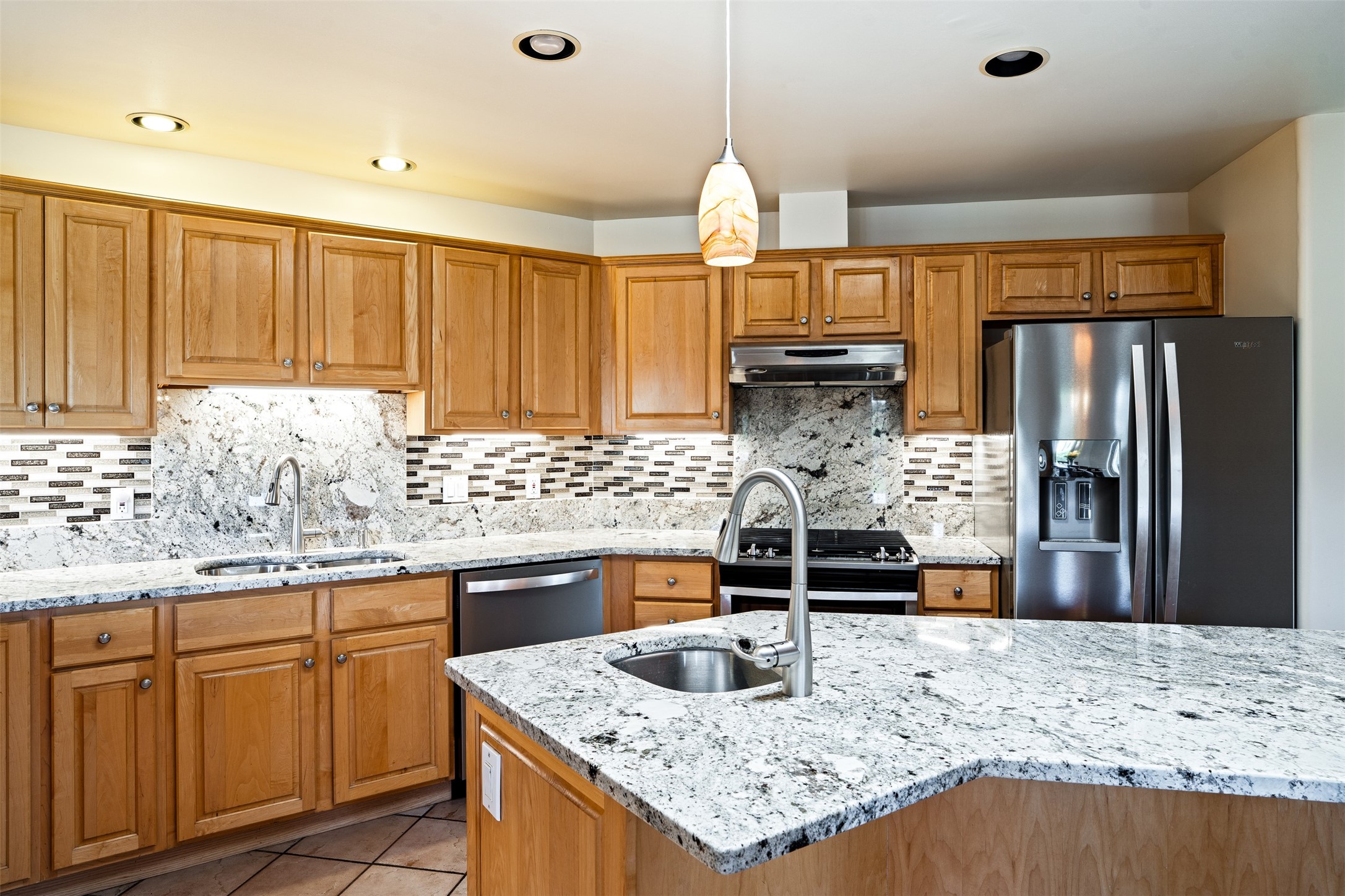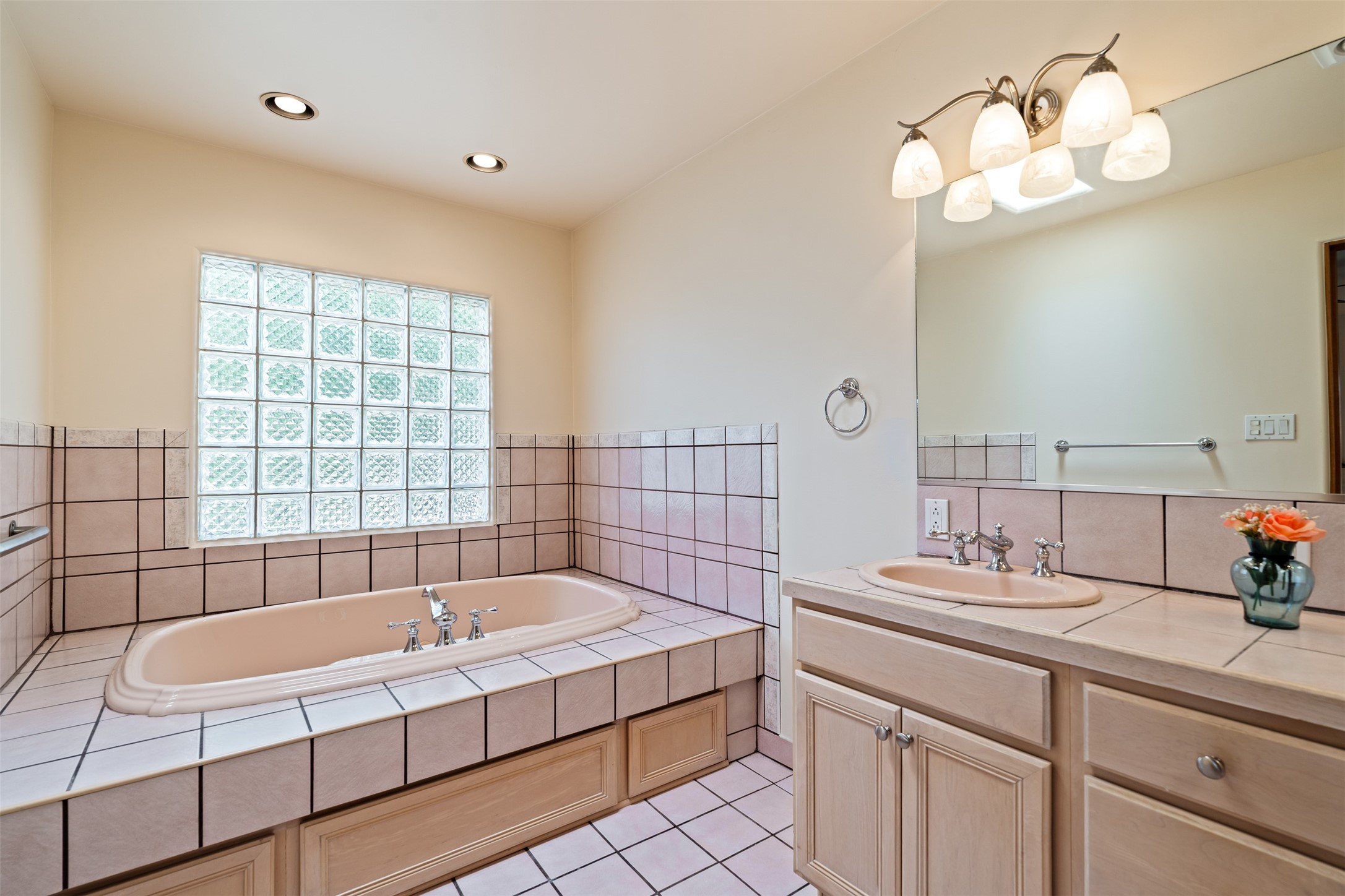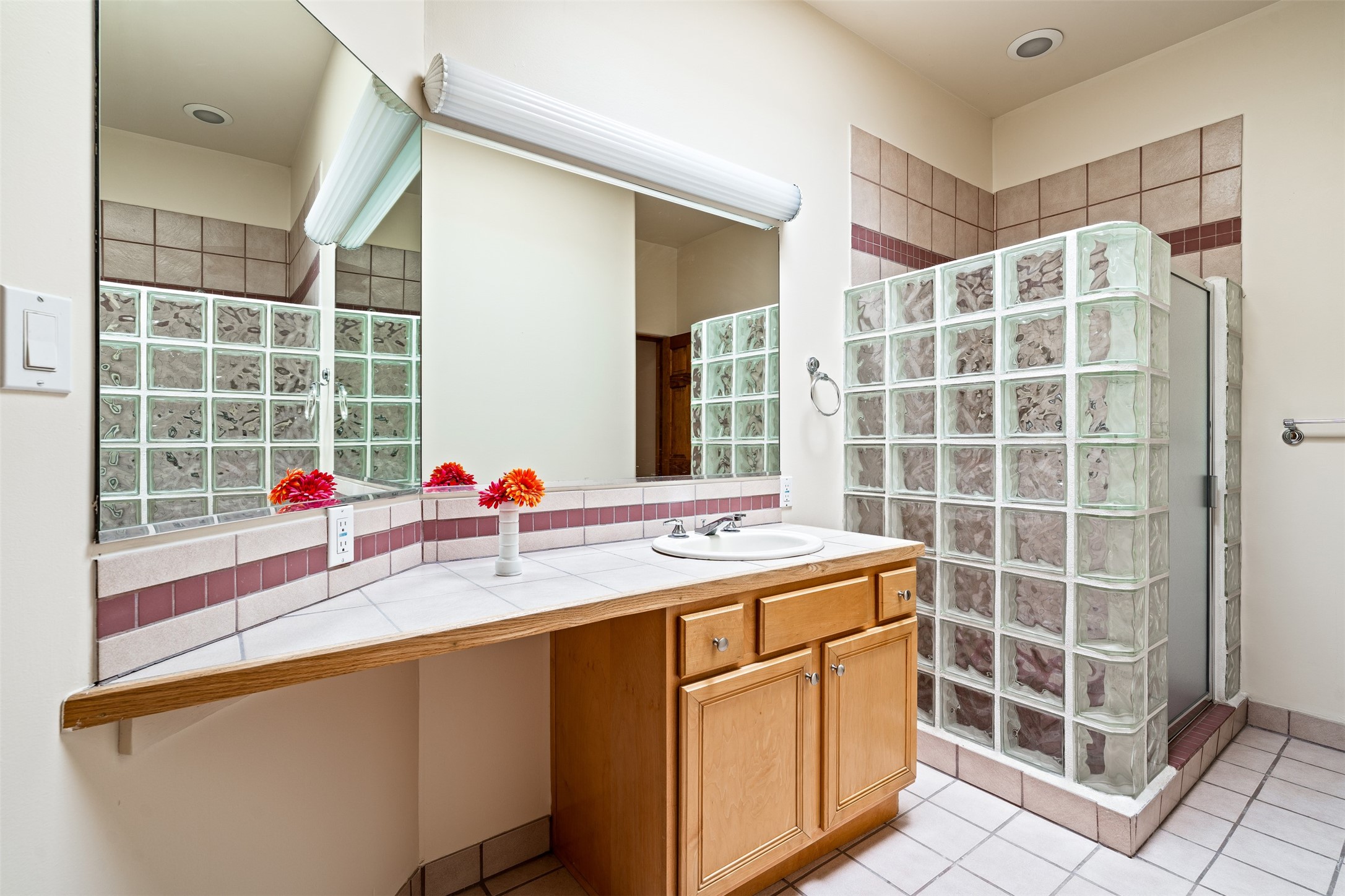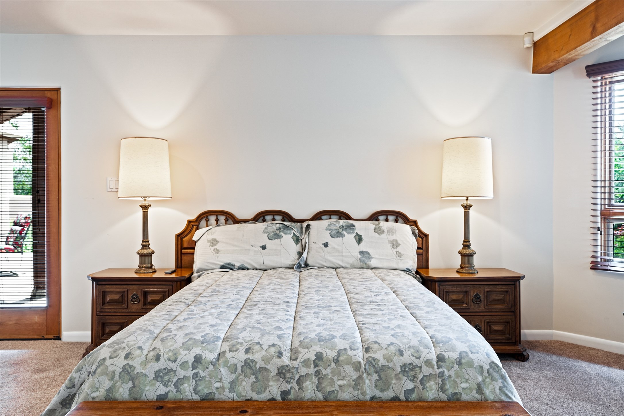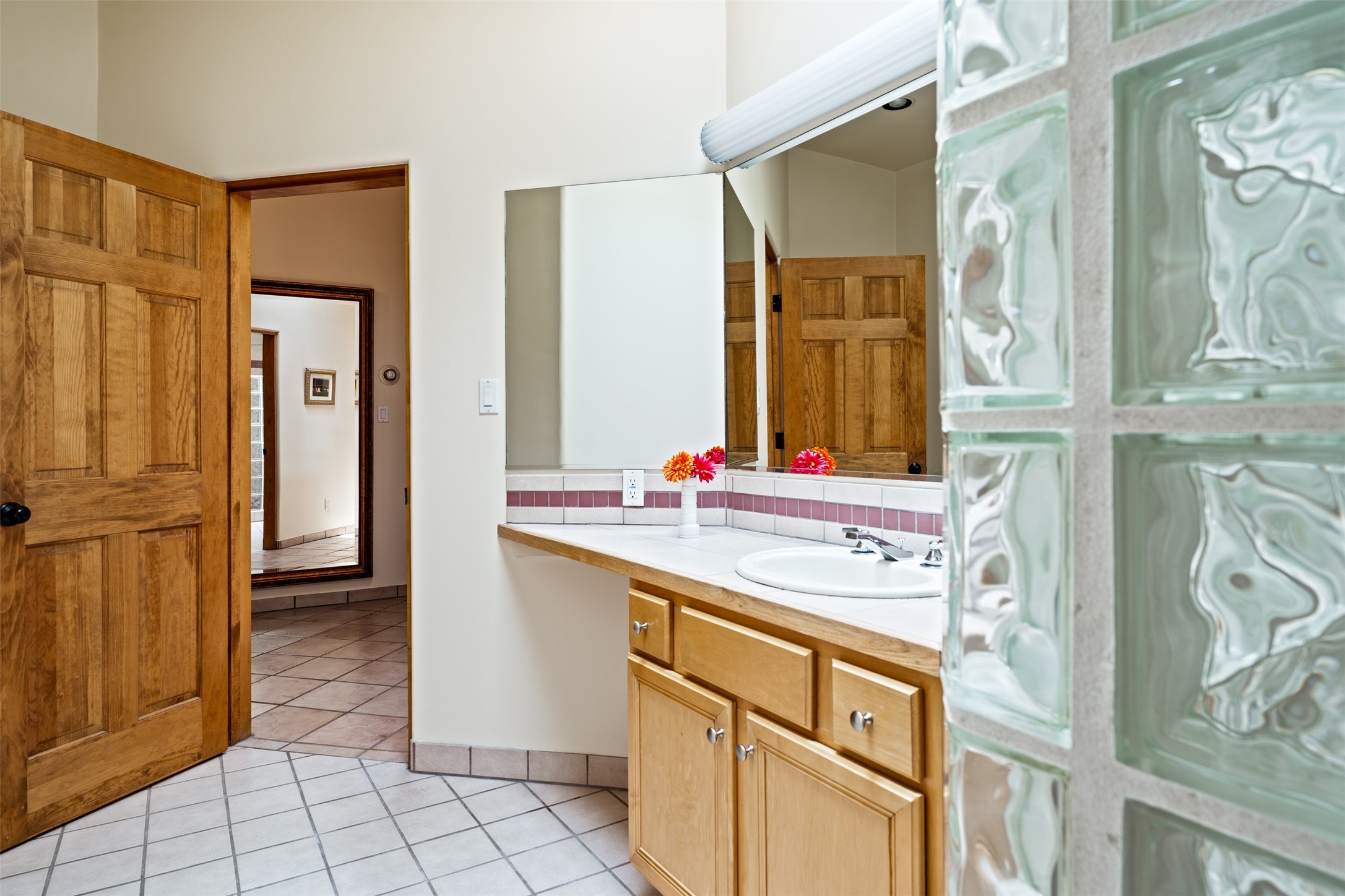 This one owner well maintained home is nestled on a quiet cul de sac street in an established neighborhood and offers an oasis of tranquility. It offers unparalleled charm and every detail has been thoughtfully crafted for luxurious living. From the moment you step into the spacious entry, you'll be captivated by the high ceilings throughout and the unique architectural elements. Enjoy the timeless Santa Fe charm vigas bring and especially when they are topped with split cedar as the grand hallway has been. Gather around the beautifully designed wood fireplace in the cozy living room, or enjoy morning coffee in the circular breakfast area with its enchanting wood-coned ceiling. The heart of the home, an updated kitchen with an island flows seamlessly into a formal dining area, perfect for entertaining. Retreat to the roomy primary bedroom or one of two spacious secondary bedrooms, each boasting an en-suite bathroom and generous closets. Outside, discover a private haven with established, irrigated front and back landscaping with a beautiful rose garden, and an enclosed backyard. Practical amenities such as an extra-long driveway, an oversized 1100 square foot 2-car garage with a 10-foot high double door. The garage is finished and has high ceilings and can accommodate many uses and greatly adds to the home's appeal. Bask in abundant natural light and enjoy the peace of mind that comes with living in an elegantly crafted home.