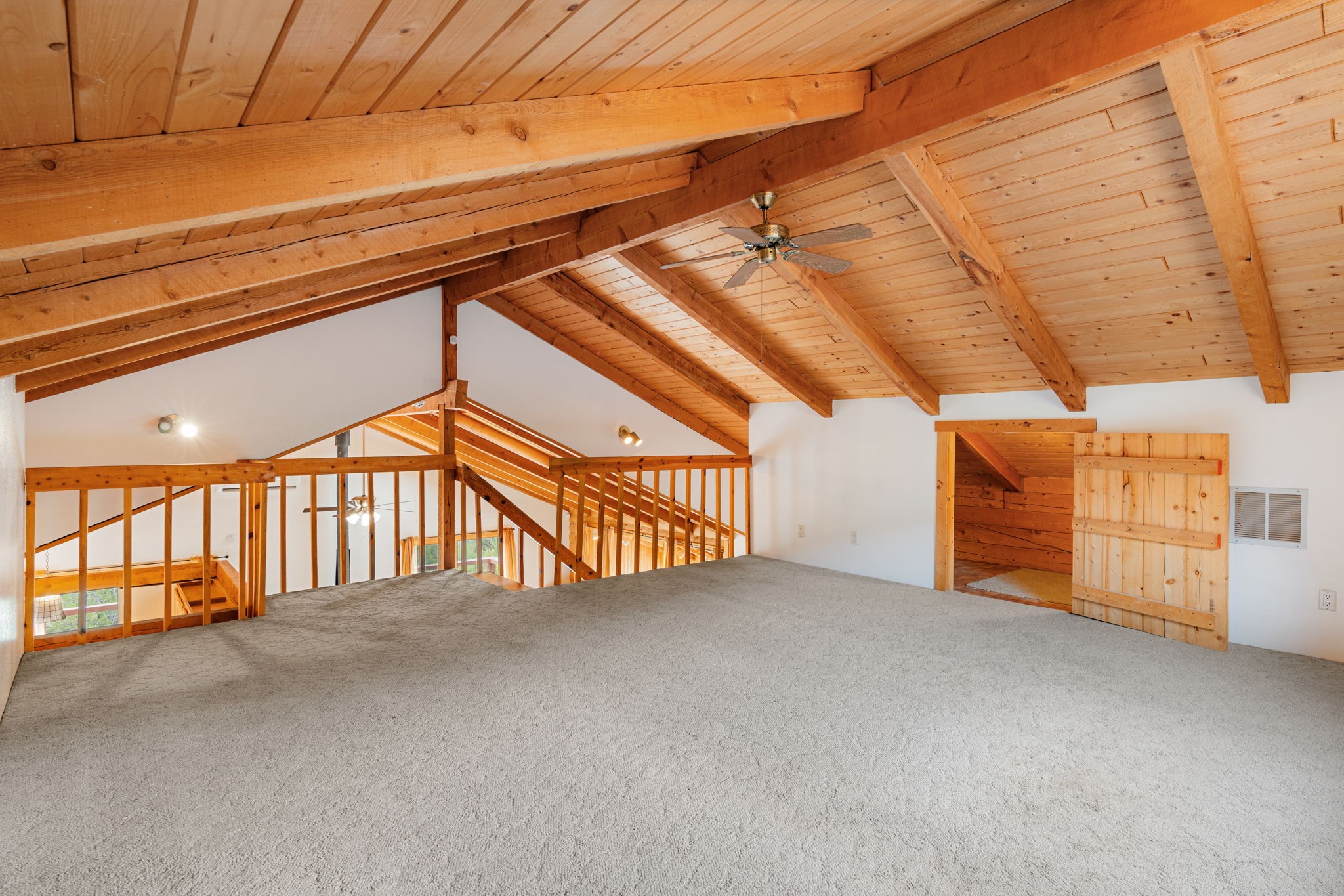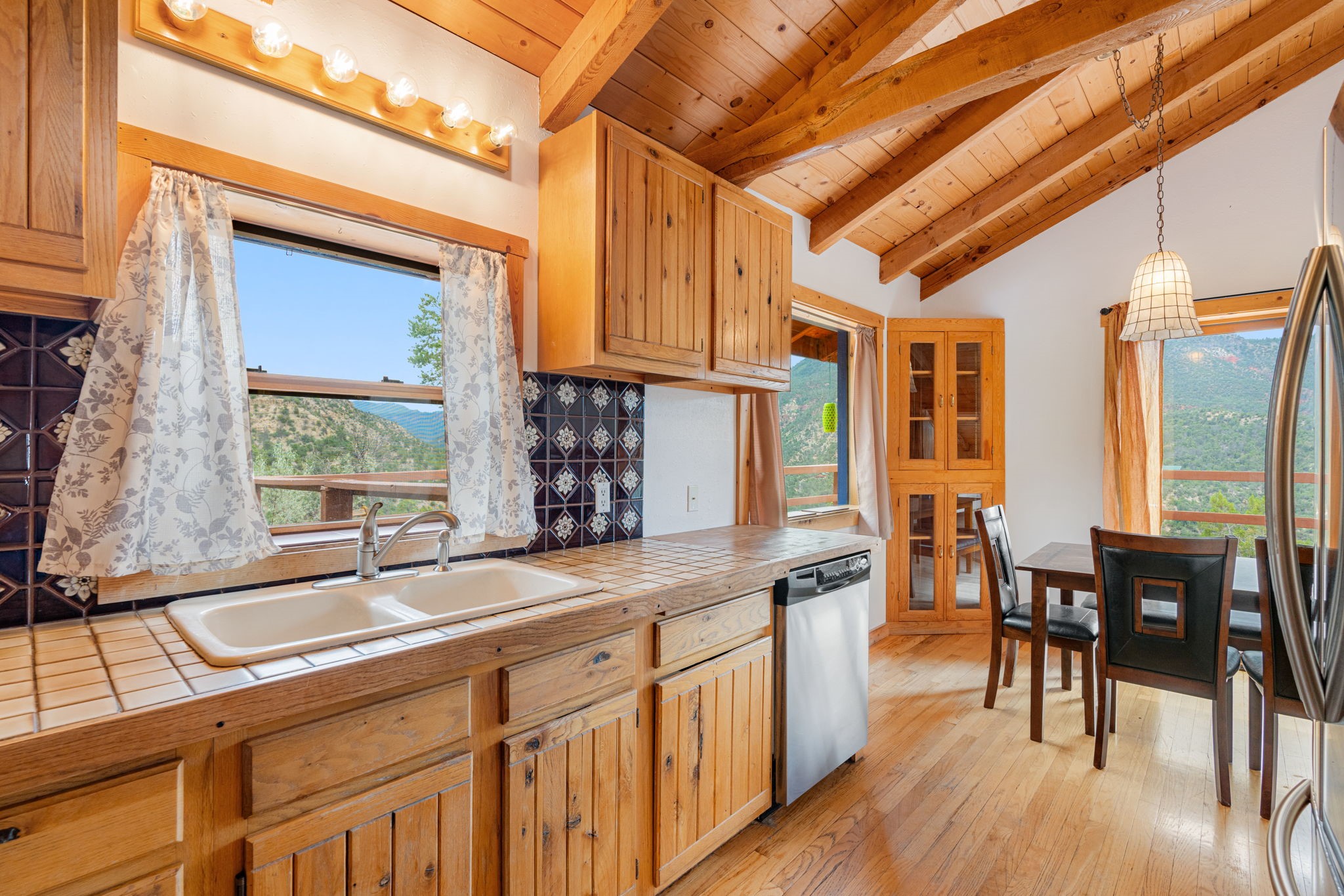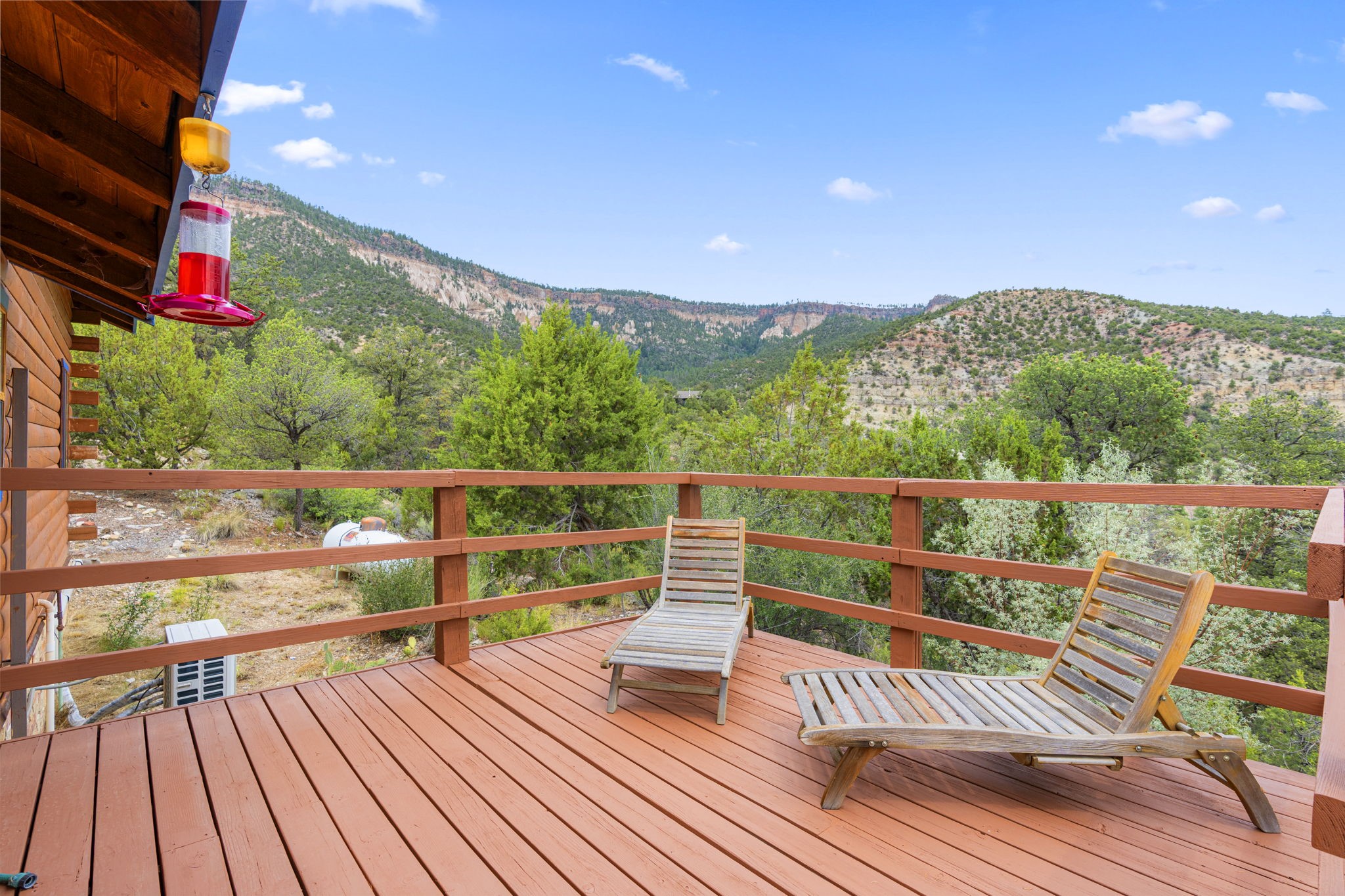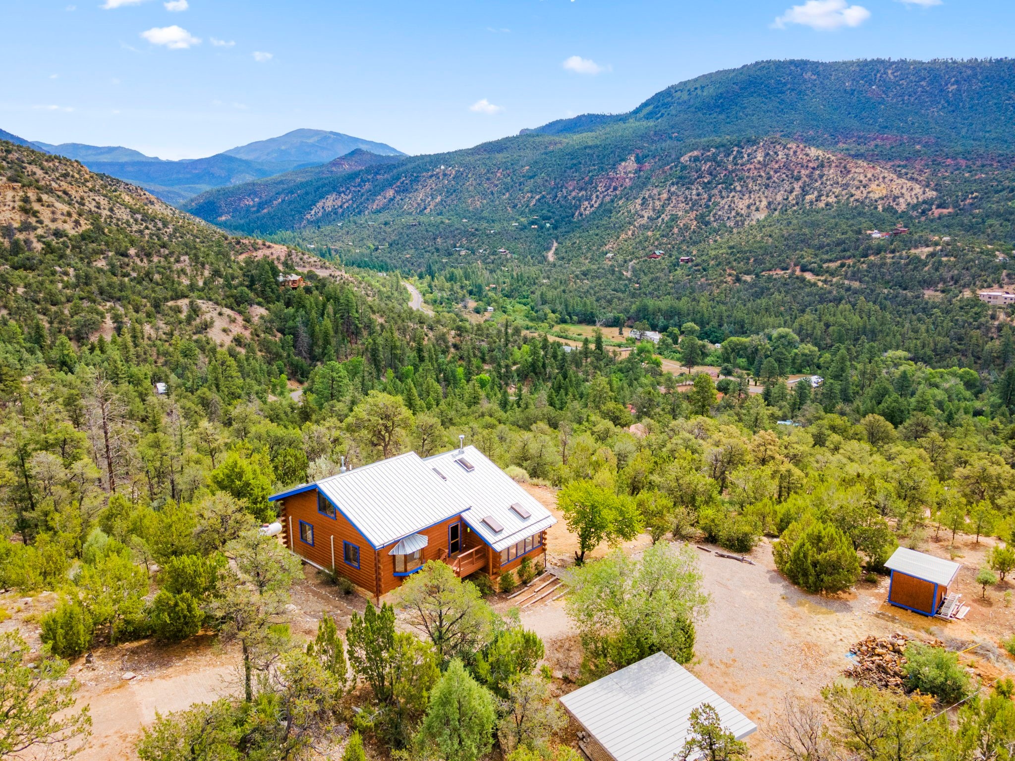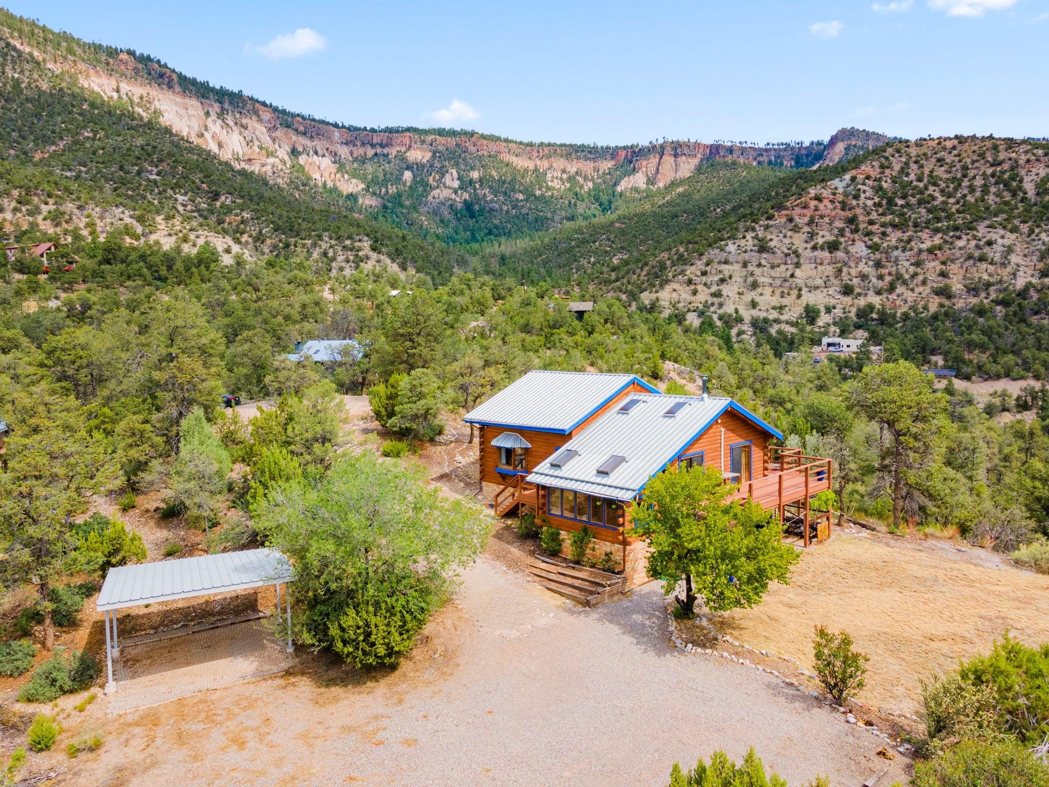 Breathtaking setting for this home in Jemez Springs perched among soaring mountain views. This spacious home has soaring beamed ceilings, wood floors, light-filled rooms, & loft with ample storage. Open floor plan with inviting living & dining area that expands to sunroom. Ideal for cozy reading rm, yoga/meditation or artist studio. Wood stove & mini splits making it comfortable all year long. Newer appliances in the kitchen. Access to expansive deck to enjoy mountain views and cool breezes. Lower level includes 2 flex spaces, a laundry room & full bathroom. Entry to an oversized one car garage. Could be used for a workshop. Property has a detached shed & covered carport, room for 2 vehicles. Home is on a very private lot at the end of cul-de-sac. Easy commute to LANL, Albuquerque, Fenton Lake. Buyer to confirm square footage.