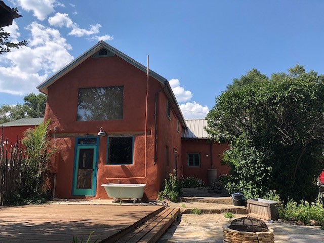 This one-of-a-kind adobe house has a fascinating history. It was built as a "bounty house" after the Civil War: soldiers could have a piece of land for free if they built a certain minimum size house on it. The bounty house is the living room of this house - a large room with wood floor and high ceiling made of vigas and latillas. With a red enamel gas stove at the far end, a built-in bookcase near the front door, and Mexican light fixtures, it is a charming entry to the house. The rest of the house was built onto this structure later and includes a bathroom with walk-in tub, a laundry area, and a large homey kitchen downstairs. The kitchen has a large 5-burner gas stove and large matching refrigerator and freezer. A spiral staircase leads upstairs to the bedroom, which has bathroom facilities in it (sink, toilet, and claw-foot tub), and a walk-in closet. The lot is 0.29 acres, green and lush and graced with large old trees. There is a large storage shed with slab floor and a couple of patios off the house. The whole property is walled or fenced, and there is an electric gate. Truly a special property.