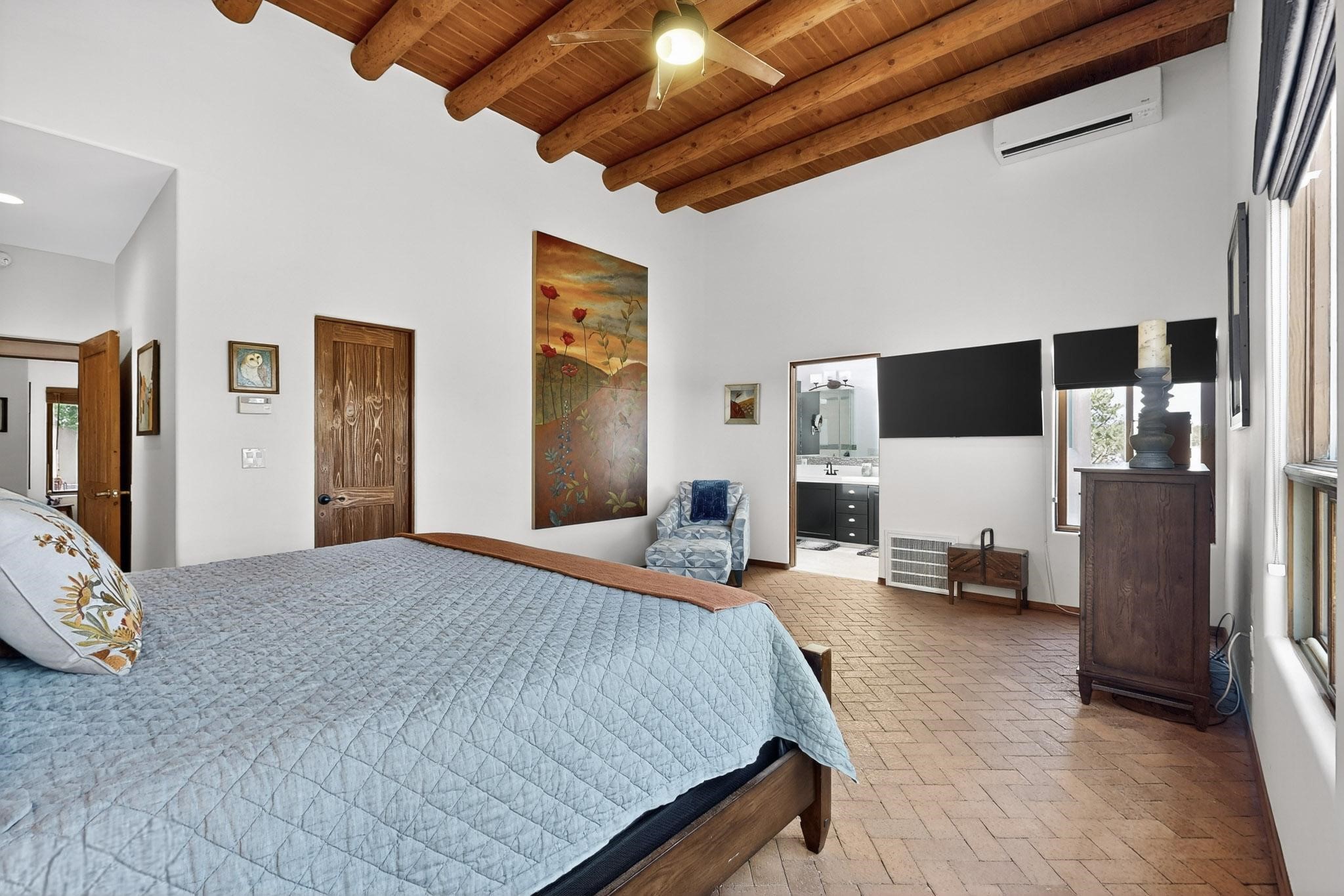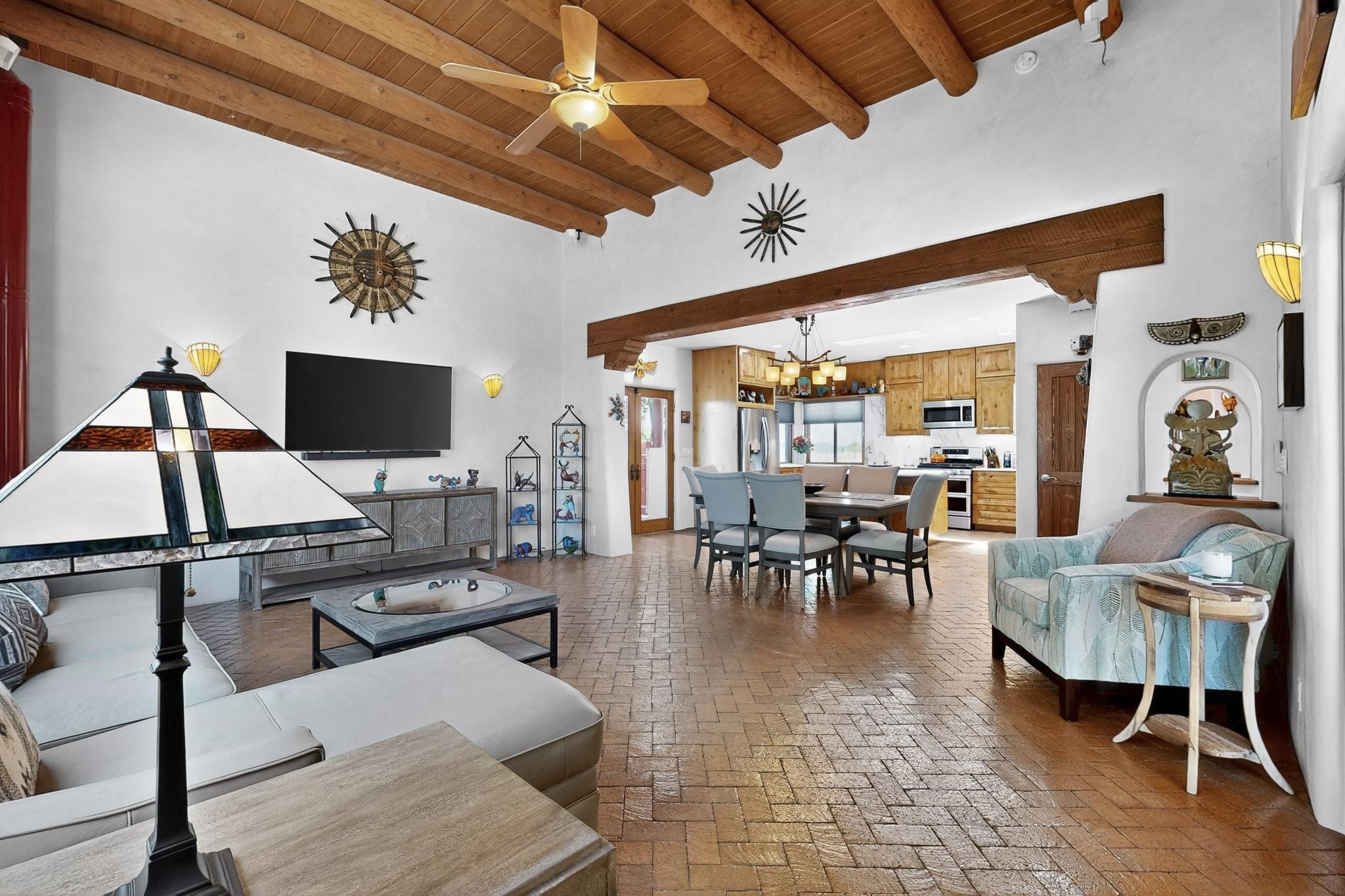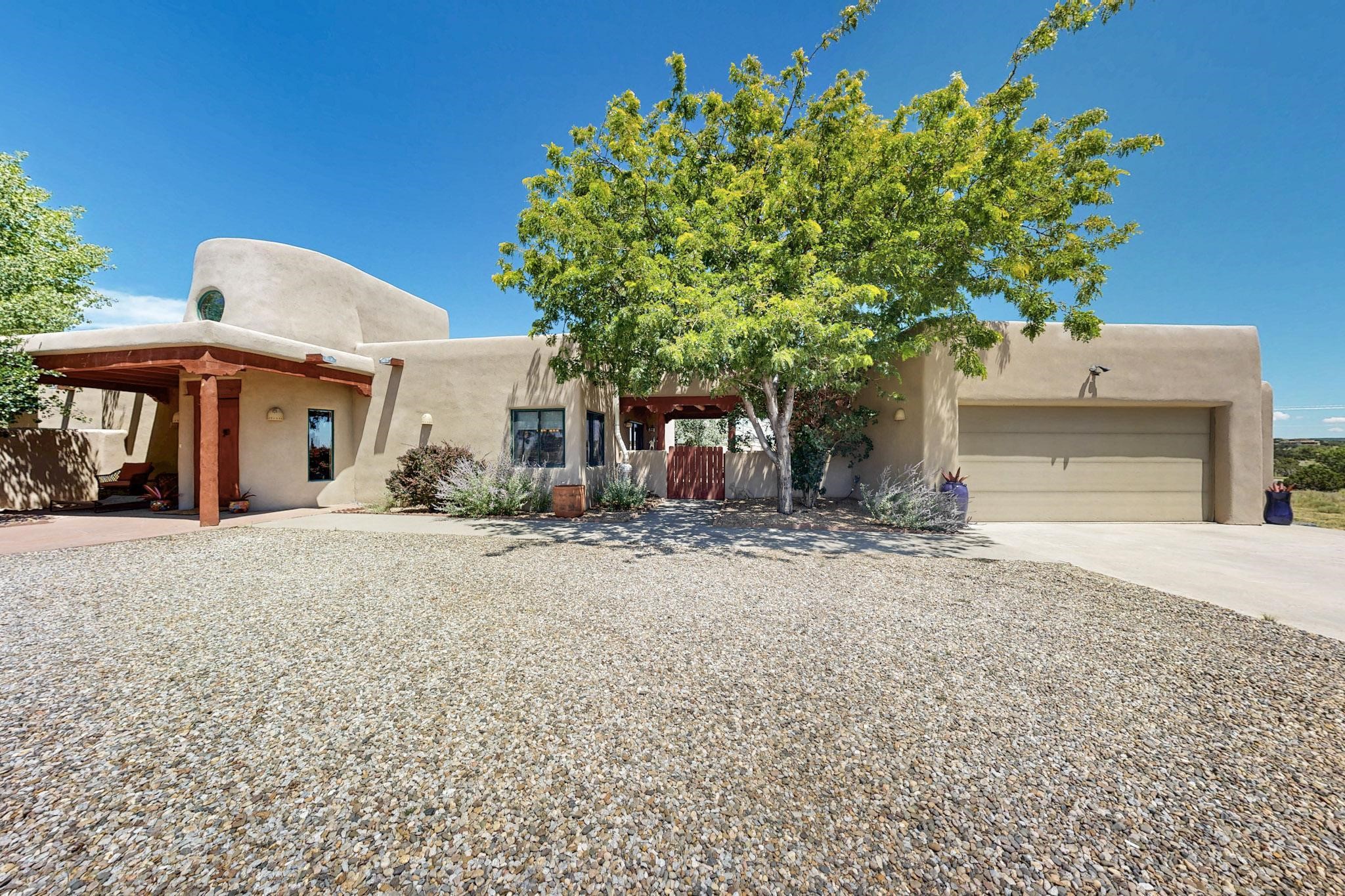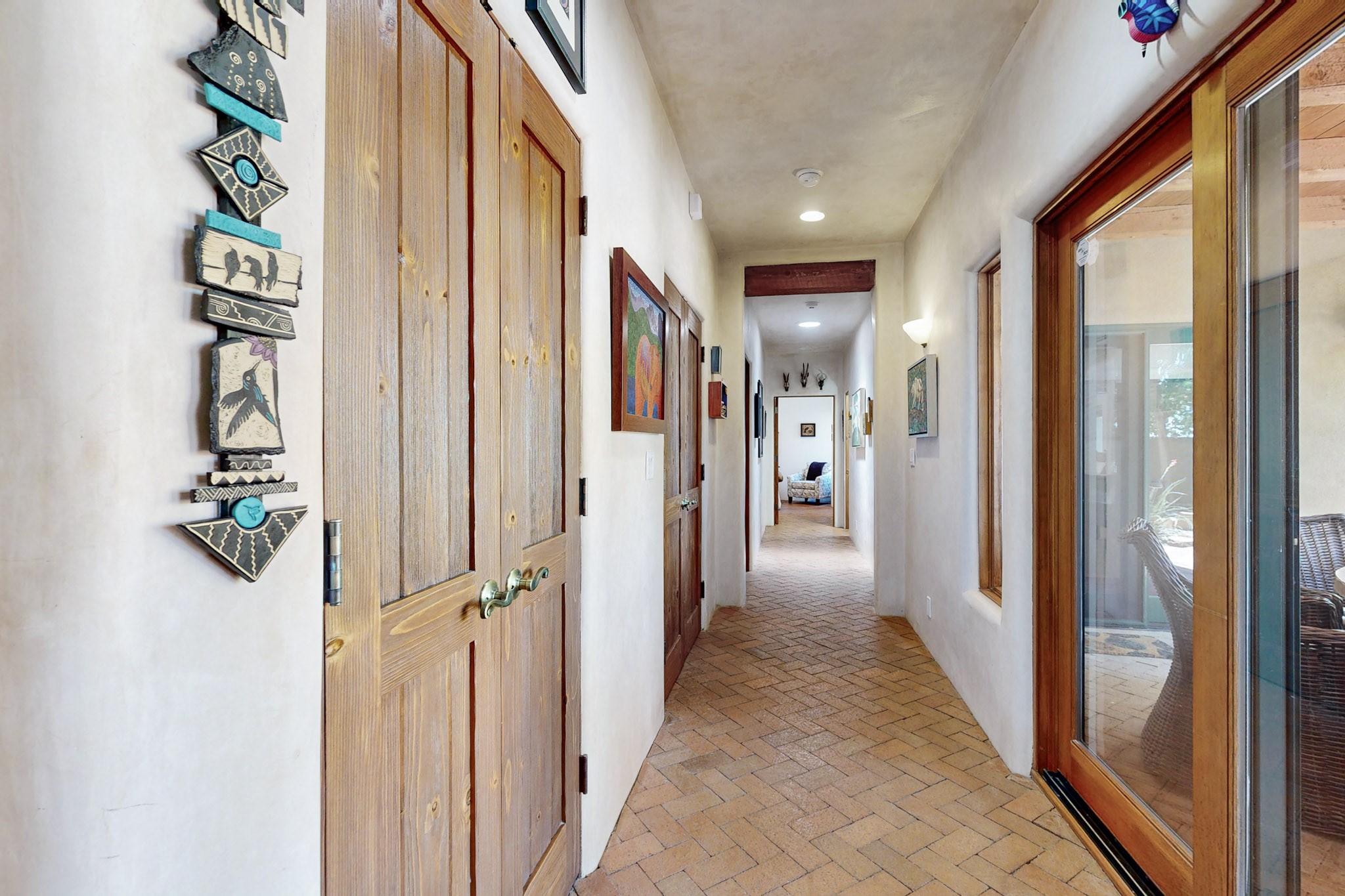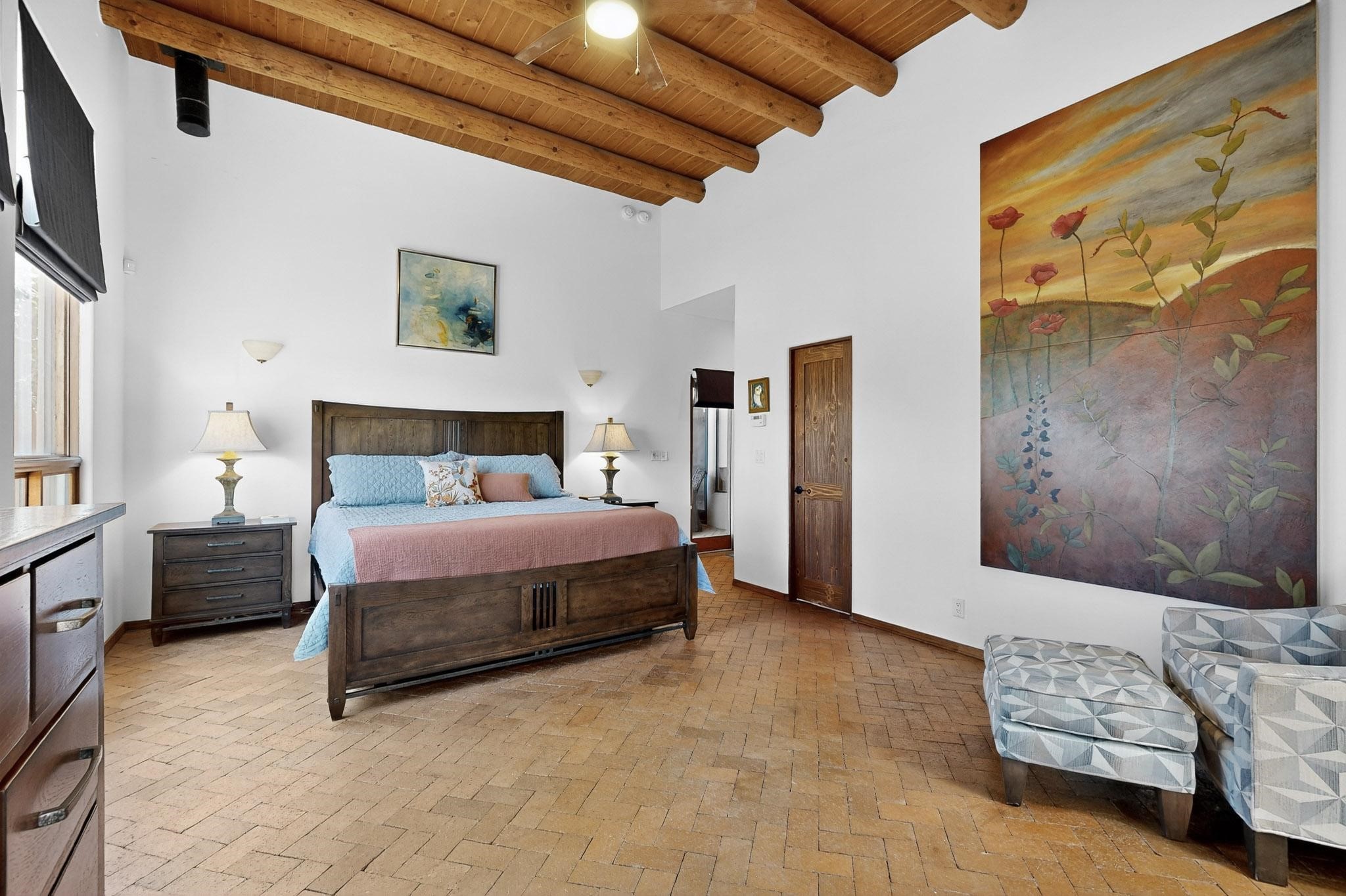 -Set on an expansive 2.73-acre lot in the highly coveted La Paz neighborhood, this exceptional Santa Fe residence offers refined living with timeless Southwestern style. Surrounded by mature aspens and beautifully landscaped grounds, the property welcomes you with a circular driveway and a sense of tranquil privacy.Inside, rich plaster walls, gorgeous brick flooring, and hand-hewn vigas reflect the region's architectural heritage, while soaring high ceilings and tall windows fill the home with light and airiness. The open-concept living, dining, and kitchen space is perfect for entertaining, featuring a custom chef's kitchen with high-end finishes and creative storage solutions.Multiple outdoor living spaces invite you to enjoy Santa Fe's famous skies--ideal for relaxing, dining, or gathering with friends and family. A flexible studio/gym/bonus room with heating and cooling offers even more room to create, work, or unwind.Additional highlights include a new water softener with reverse osmosis, a spacious two-car garage with epoxy floors, and a covered breezeway connecting to the main home. The home comes with a 1-year transferrable warranty.This is truly a rare offering--where luxury meets comfort in one of Santa Fe's most desirable communities.