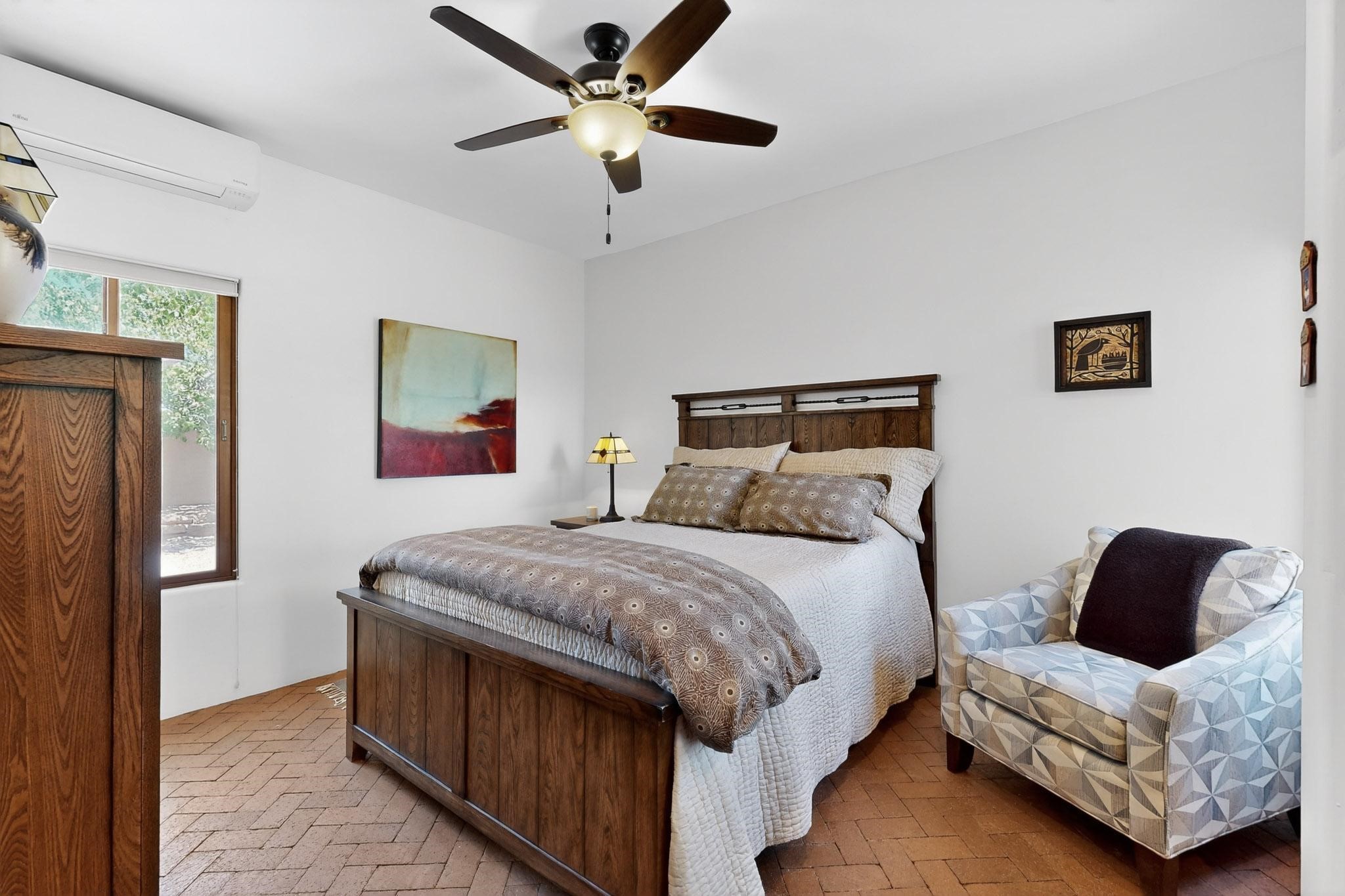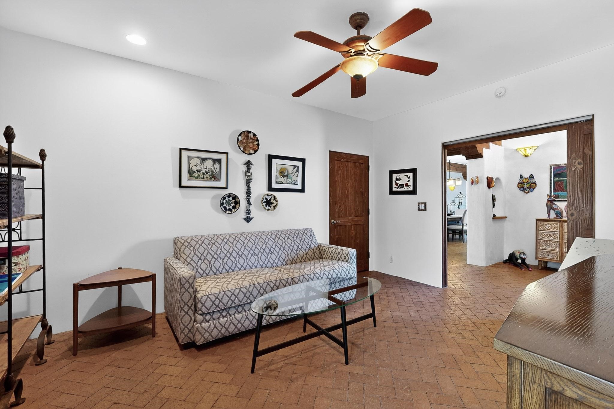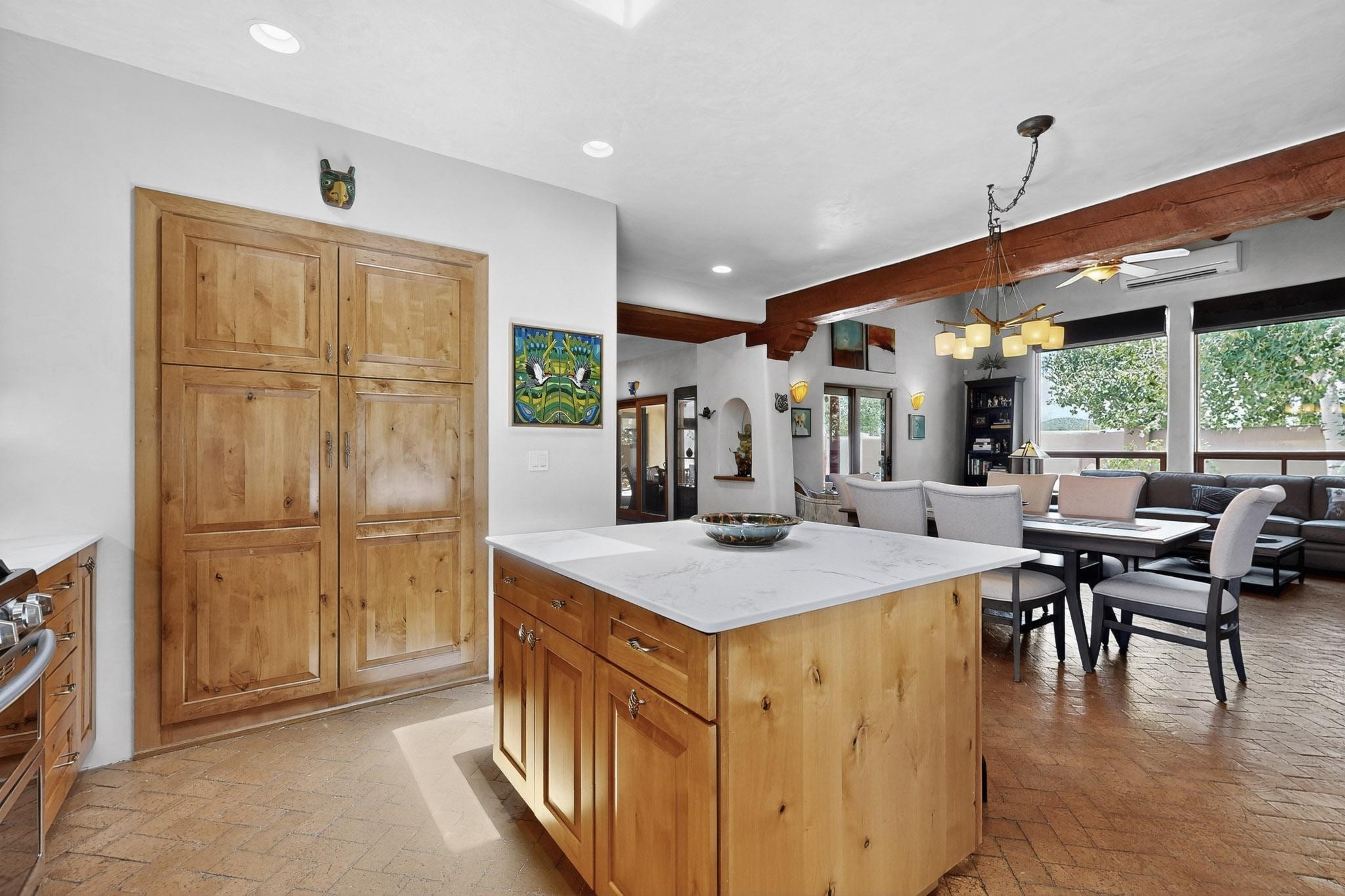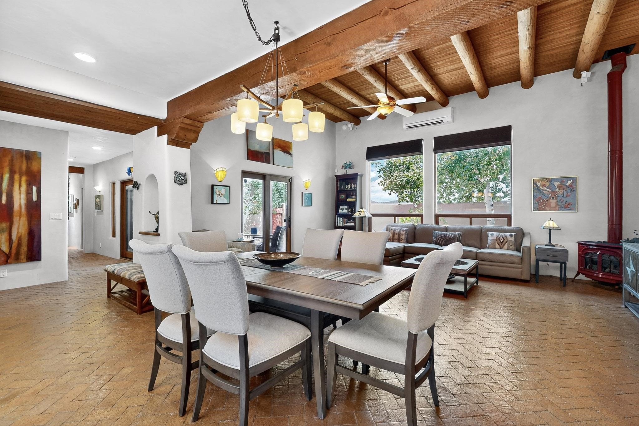 -Set on an expansive 2.73-acre lot in the highly coveted La Paz neighborhood, this exceptional Santa Fe residence offers refined living with timeless Southwestern style. Surrounded by mature aspens and beautifully landscaped grounds, the property welcomes you with a circular driveway and a sense of tranquil privacy.Inside, rich plaster walls, gorgeous brick flooring, and hand-hewn vigas reflect the region's architectural heritage, while soaring high ceilings and tall windows fill the home with light and airiness. The open-concept living, dining, and kitchen space is perfect for entertaining, featuring a custom chef's kitchen with high-end finishes and creative storage solutions.Multiple outdoor living spaces invite you to enjoy Santa Fe's famous skies--ideal for relaxing, dining, or gathering with friends and family. A flexible studio/gym/bonus room with heating and cooling offers even more room to create, work, or unwind.Additional highlights include a new water softener with reverse osmosis, a spacious two-car garage with epoxy floors, and a covered breezeway connecting to the main home. The home comes with a 1-year transferrable warranty.This is truly a rare offering--where luxury meets comfort in one of Santa Fe's most desirable communities.