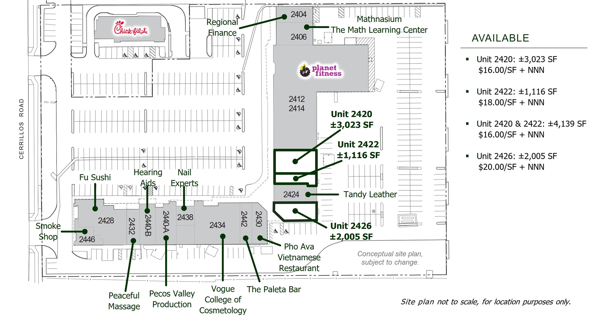 AVAILABLE: Unit 2420: 3,023 SF, $16.00/SF + NNN (Space comes with an overhead door in the back), Unit 2422: 1,116 SF, $18.00/SF + NNN, Units 2420 & 2422: 4,139 SF, $16.00/SF, Unit 2426: 2,005 SF, $20.00/SF + NNN | ZONING: C-2, General Commercial | HIGHLIGHTS: Establish shopping center - great for new business, Grocery anchored by Smith's Food & Drug and Planet Fitness, Ample parking (back and front), More than 45,000 cars per day, Competitive lease rates in a busy retail corridor, Co tenants include: Smith's, Chick fil A, Planet Fitness, The Paleta Bar, Hearing Aid Center and more