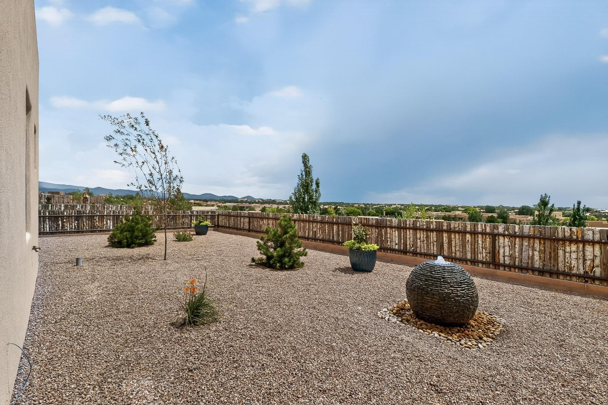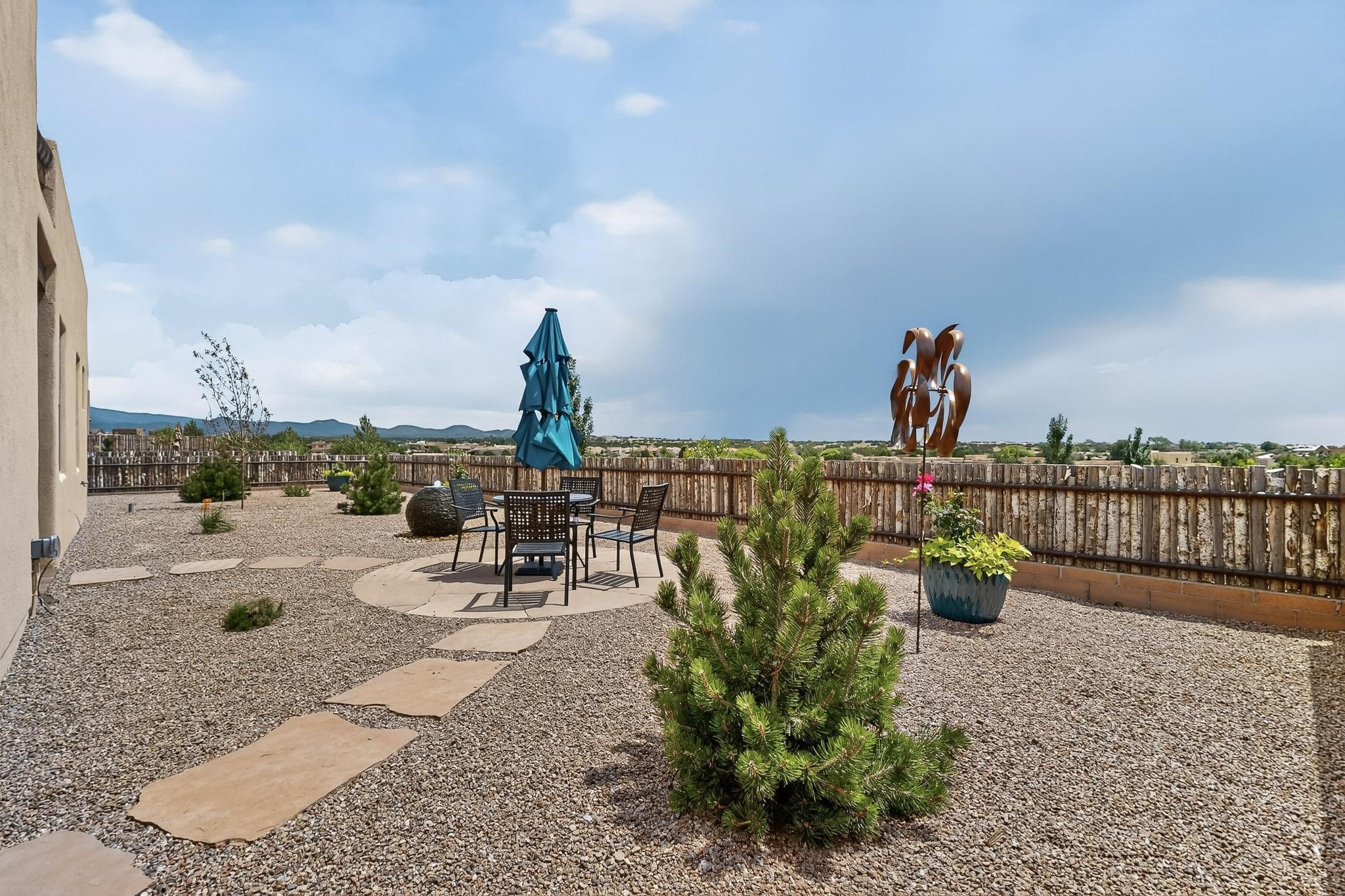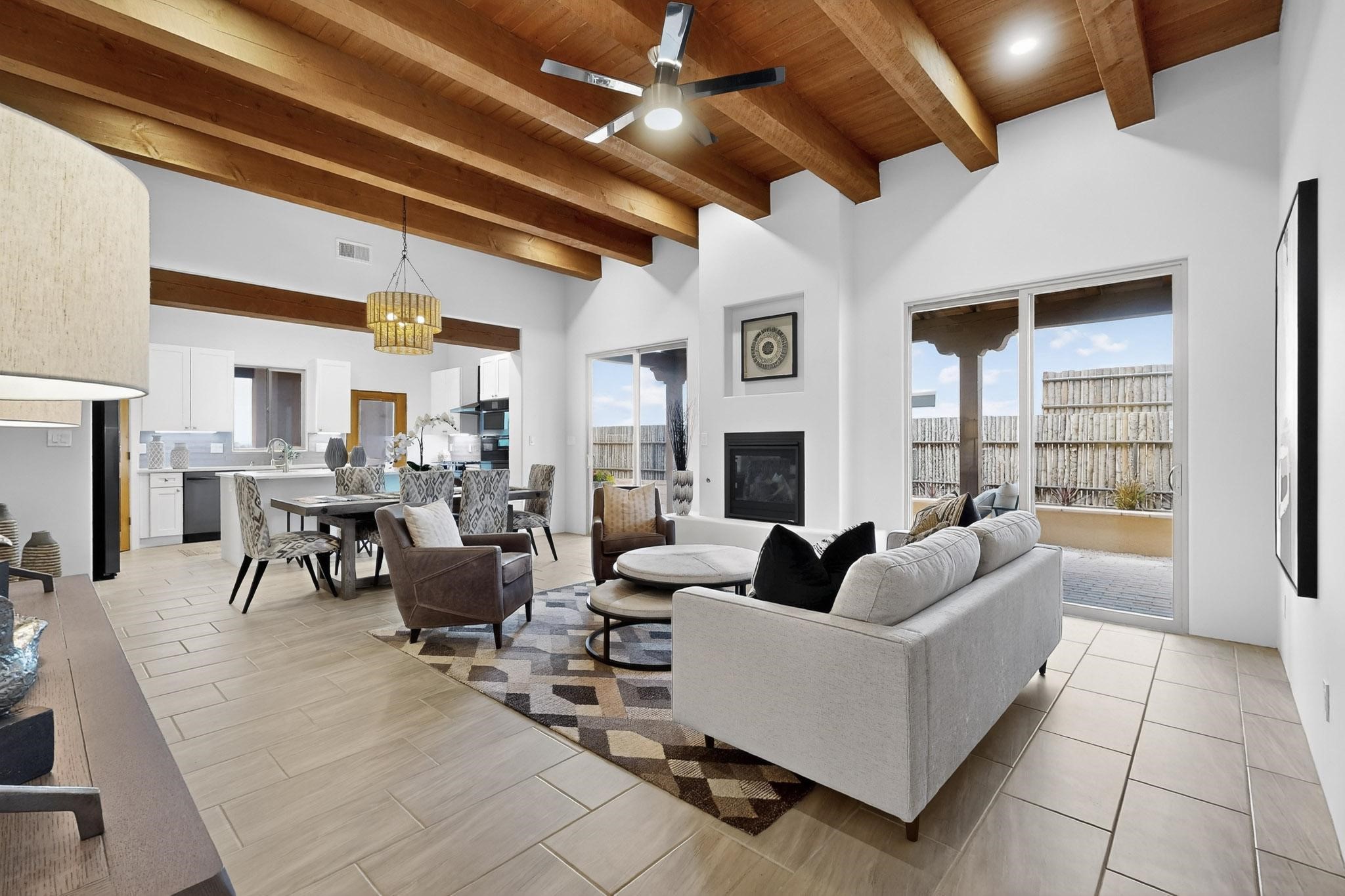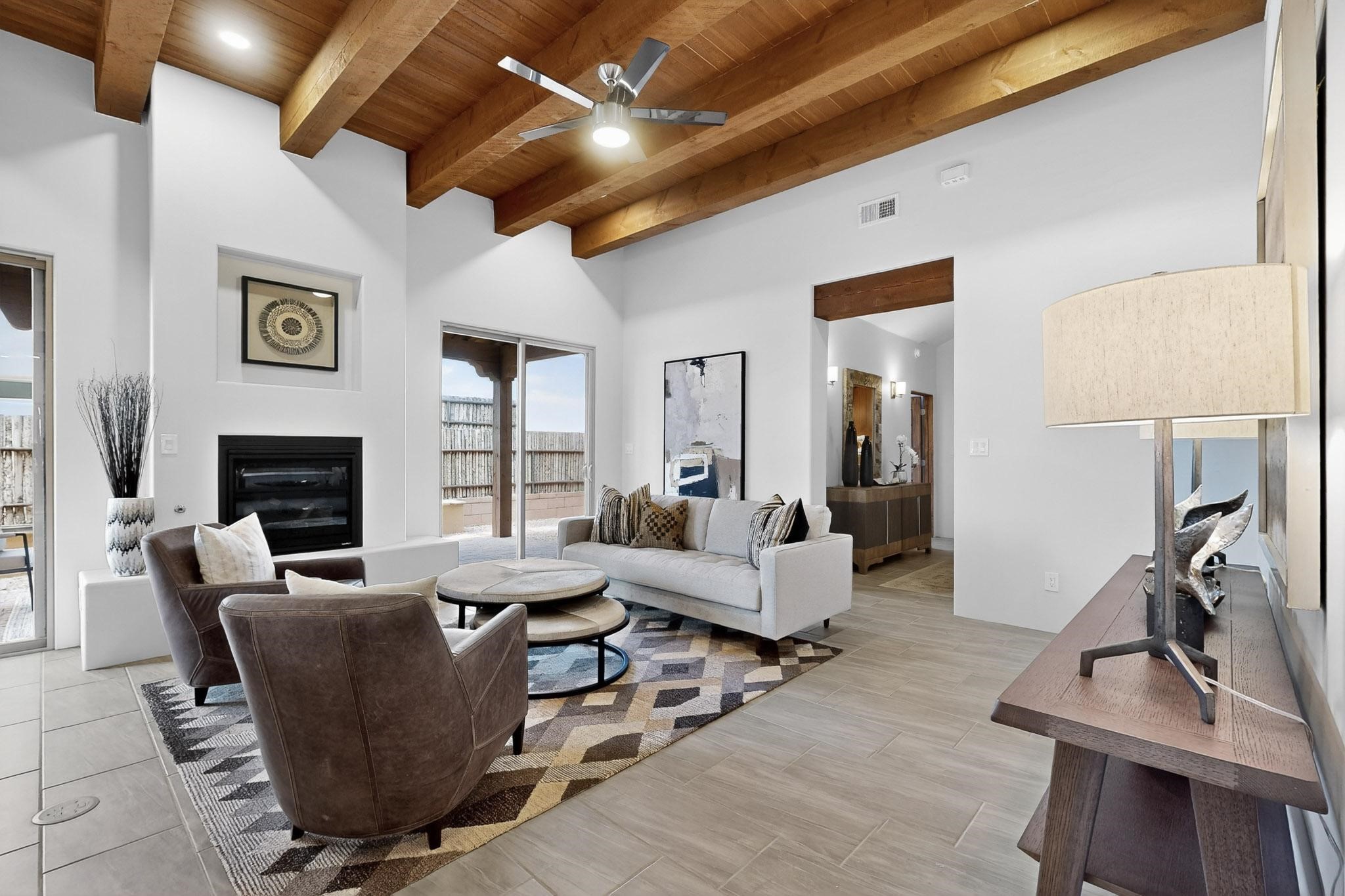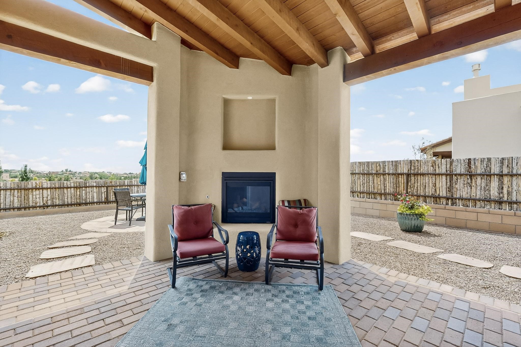 Enjoy breathtaking 180-degree scenic views from this distinctive Santiago Plan with 2239 sq. ft. Located in the La Pradera Subdivision. The property backs up to open space. This residence features three bedrooms and three and a half bathrooms. Each bedroom includes its own ensuite bath. There are three fireplaces throughout the home.Arrive through an impressive 8-foot-tall entry door, stepping into a foyer highlighted by a 13-foot boveda ceiling. To the left, a powder room and an adjacent closet provide convenience, while to the right, a versatile study or bedroom features a cozy gas-fired kiva fireplace. The spacious living room is distinguished by a 12-foot ceiling, rich brown-stained wood beams with tongue-and-groove trim. Porcelain floor tiles in a Bianco-White wood-like style add elegance throughout the home. The open kitchen is equipped with Shaker-White cabinets. The kitchen and the guest bedroom open out to a covered portal with a gas-fireplace and brick pavers, perfect for entertaining or relaxation. The owner's suite features an expansive walk-in closet of approximately 100 square feet. The luxurious bathroom offers a skylight, a spacious walk-in shower with Euro-style fixtures, and an overhead rain shower head. Designed in a classic Spanish style, the home showcases a pitched roof with clay-concrete tiles, covered portals with substantial wood beams, and brick paver accents. The colored stamped concrete driveway enhances the property's curb appeal. The property also boasts a three-car insulated garage with two storage closets and an epoxy-coated floor.