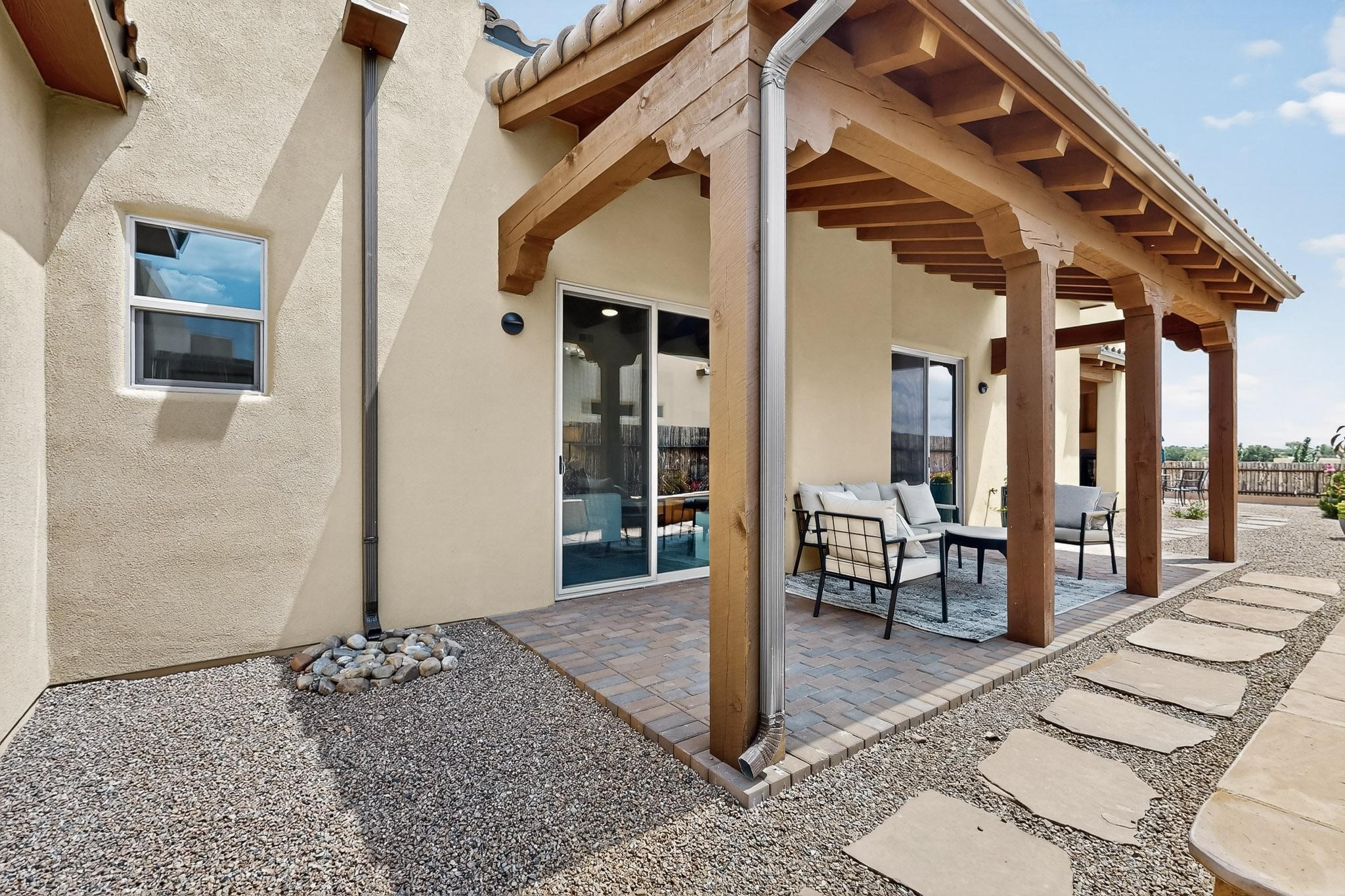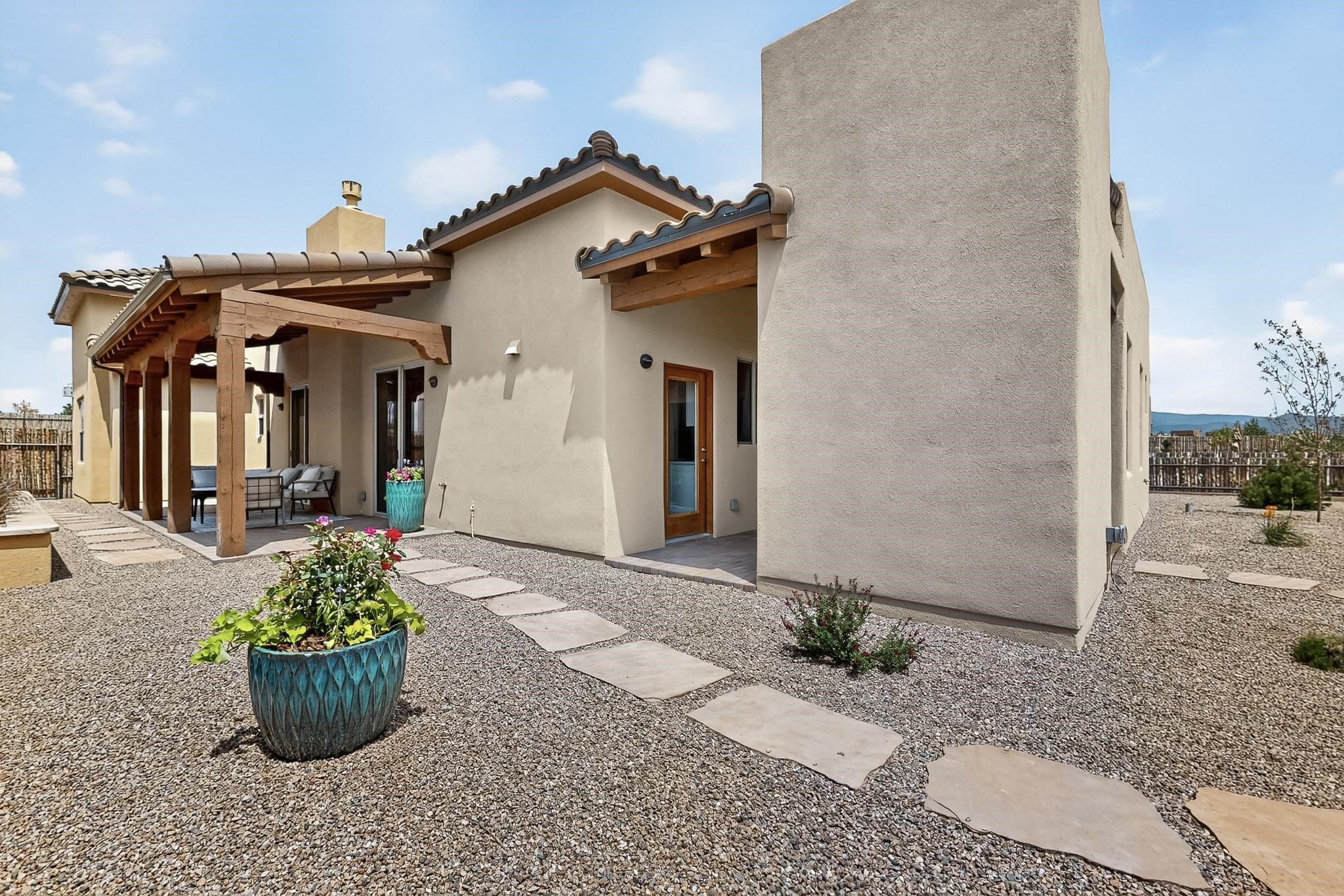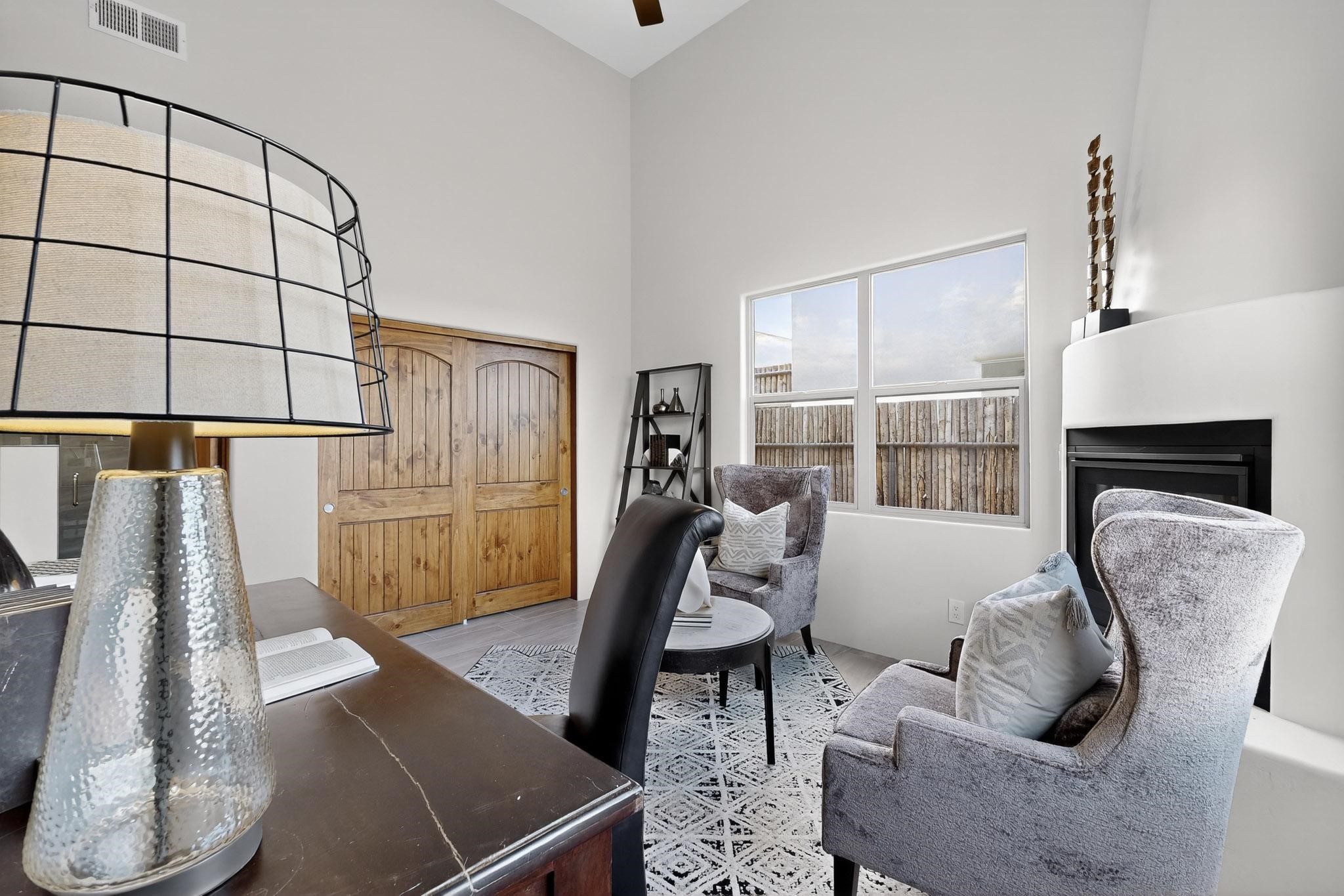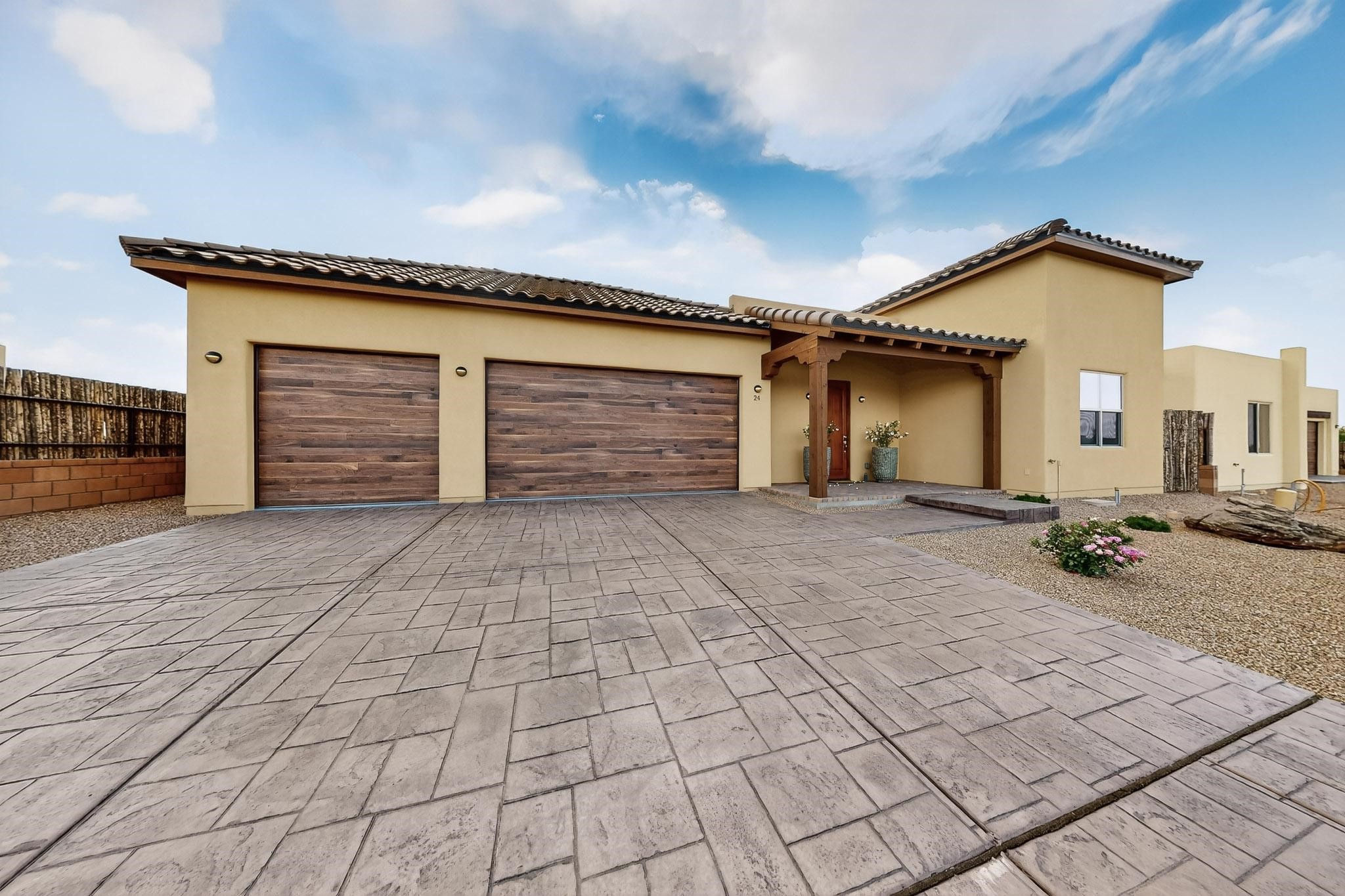 Enjoy breathtaking 180-degree scenic views from this distinctive Santiago Plan with 2239 sq. ft. Located in the La Pradera Subdivision. The property backs up to open space. This residence features three bedrooms and three and a half bathrooms. Each bedroom includes its own ensuite bath. There are three fireplaces throughout the home.Arrive through an impressive 8-foot-tall entry door, stepping into a foyer highlighted by a 13-foot boveda ceiling. To the left, a powder room and an adjacent closet provide convenience, while to the right, a versatile study or bedroom features a cozy gas-fired kiva fireplace. The spacious living room is distinguished by a 12-foot ceiling, rich brown-stained wood beams with tongue-and-groove trim. Porcelain floor tiles in a Bianco-White wood-like style add elegance throughout the home. The open kitchen is equipped with Shaker-White cabinets. The kitchen and the guest bedroom open out to a covered portal with a gas-fireplace and brick pavers, perfect for entertaining or relaxation. The owner's suite features an expansive walk-in closet of approximately 100 square feet. The luxurious bathroom offers a skylight, a spacious walk-in shower with Euro-style fixtures, and an overhead rain shower head. Designed in a classic Spanish style, the home showcases a pitched roof with clay-concrete tiles, covered portals with substantial wood beams, and brick paver accents. The colored stamped concrete driveway enhances the property's curb appeal. The property also boasts a three-car insulated garage with two storage closets and an epoxy-coated floor.