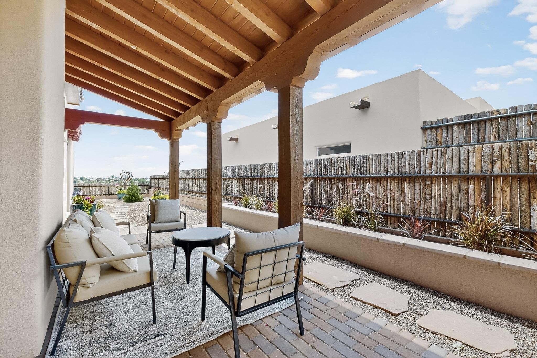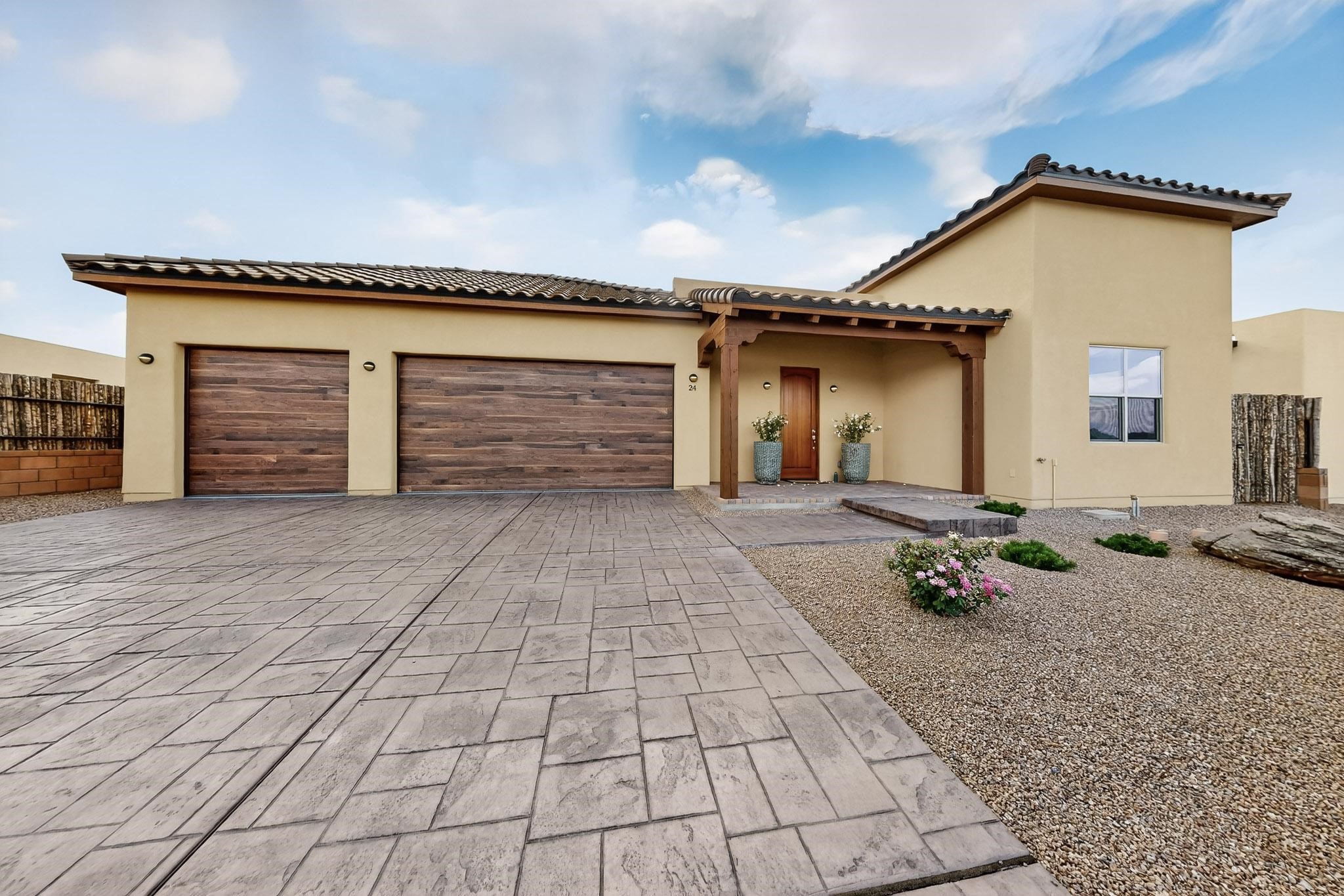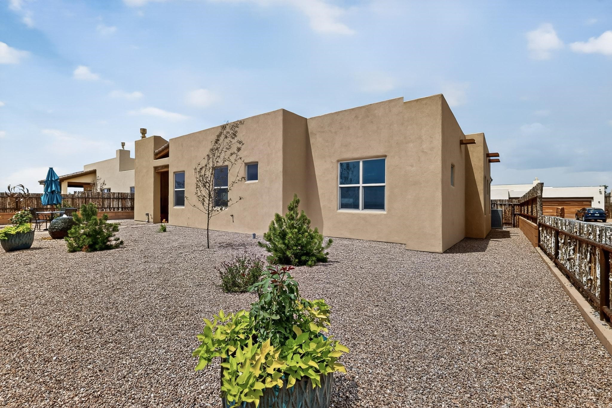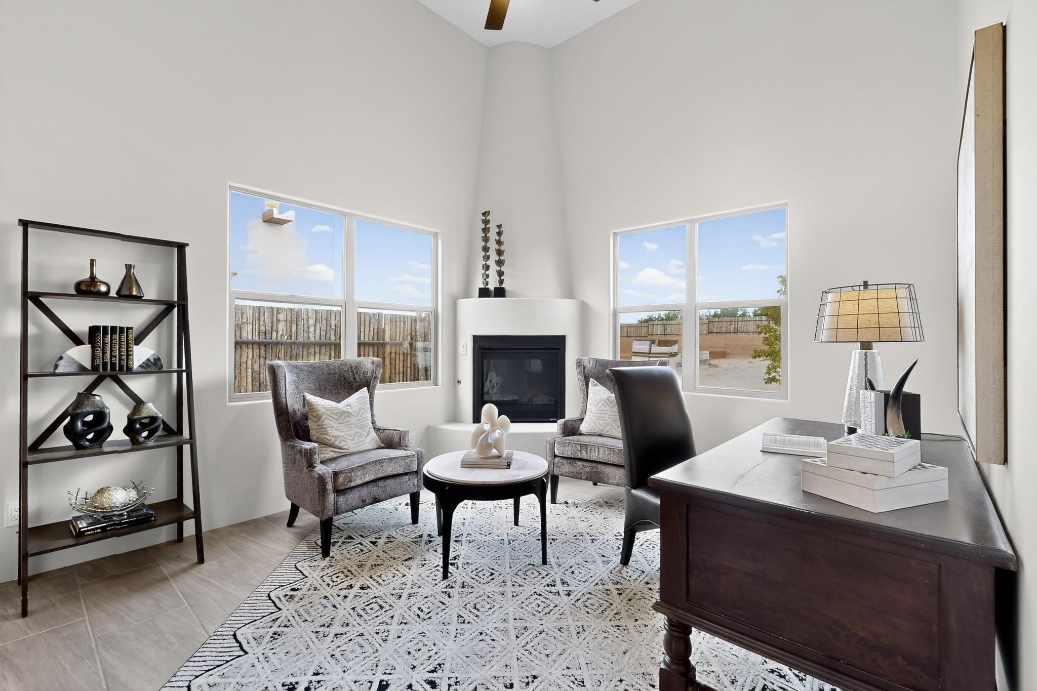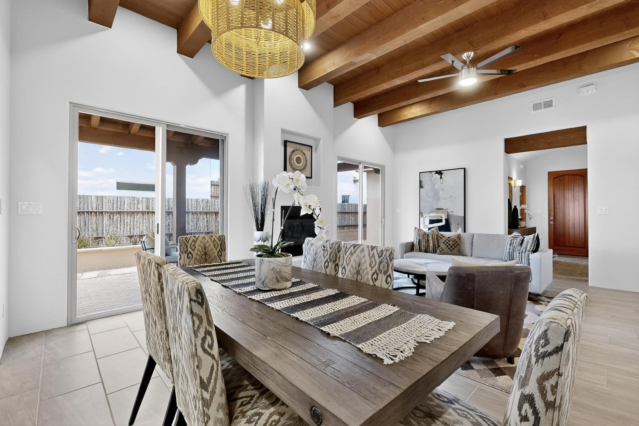 Enjoy breathtaking 180-degree scenic views from this distinctive Santiago Plan with 2239 sq. ft. Located in the La Pradera Subdivision. The property backs up to open space. This residence features three bedrooms and three and a half bathrooms. Each bedroom includes its own ensuite bath. There are three fireplaces throughout the home.Arrive through an impressive 8-foot-tall entry door, stepping into a foyer highlighted by a 13-foot boveda ceiling. To the left, a powder room and an adjacent closet provide convenience, while to the right, a versatile study or bedroom features a cozy gas-fired kiva fireplace. The spacious living room is distinguished by a 12-foot ceiling, rich brown-stained wood beams with tongue-and-groove trim. Porcelain floor tiles in a Bianco-White wood-like style add elegance throughout the home. The open kitchen is equipped with Shaker-White cabinets. The kitchen and the guest bedroom open out to a covered portal with a gas-fireplace and brick pavers, perfect for entertaining or relaxation. The owner's suite features an expansive walk-in closet of approximately 100 square feet. The luxurious bathroom offers a skylight, a spacious walk-in shower with Euro-style fixtures, and an overhead rain shower head. Designed in a classic Spanish style, the home showcases a pitched roof with clay-concrete tiles, covered portals with substantial wood beams, and brick paver accents. The colored stamped concrete driveway enhances the property's curb appeal. The property also boasts a three-car insulated garage with two storage closets and an epoxy-coated floor.