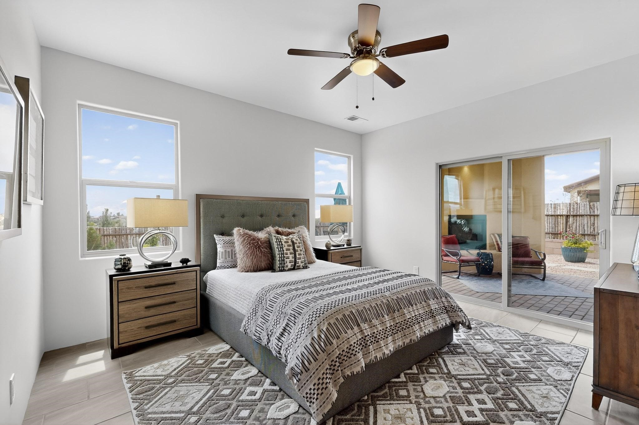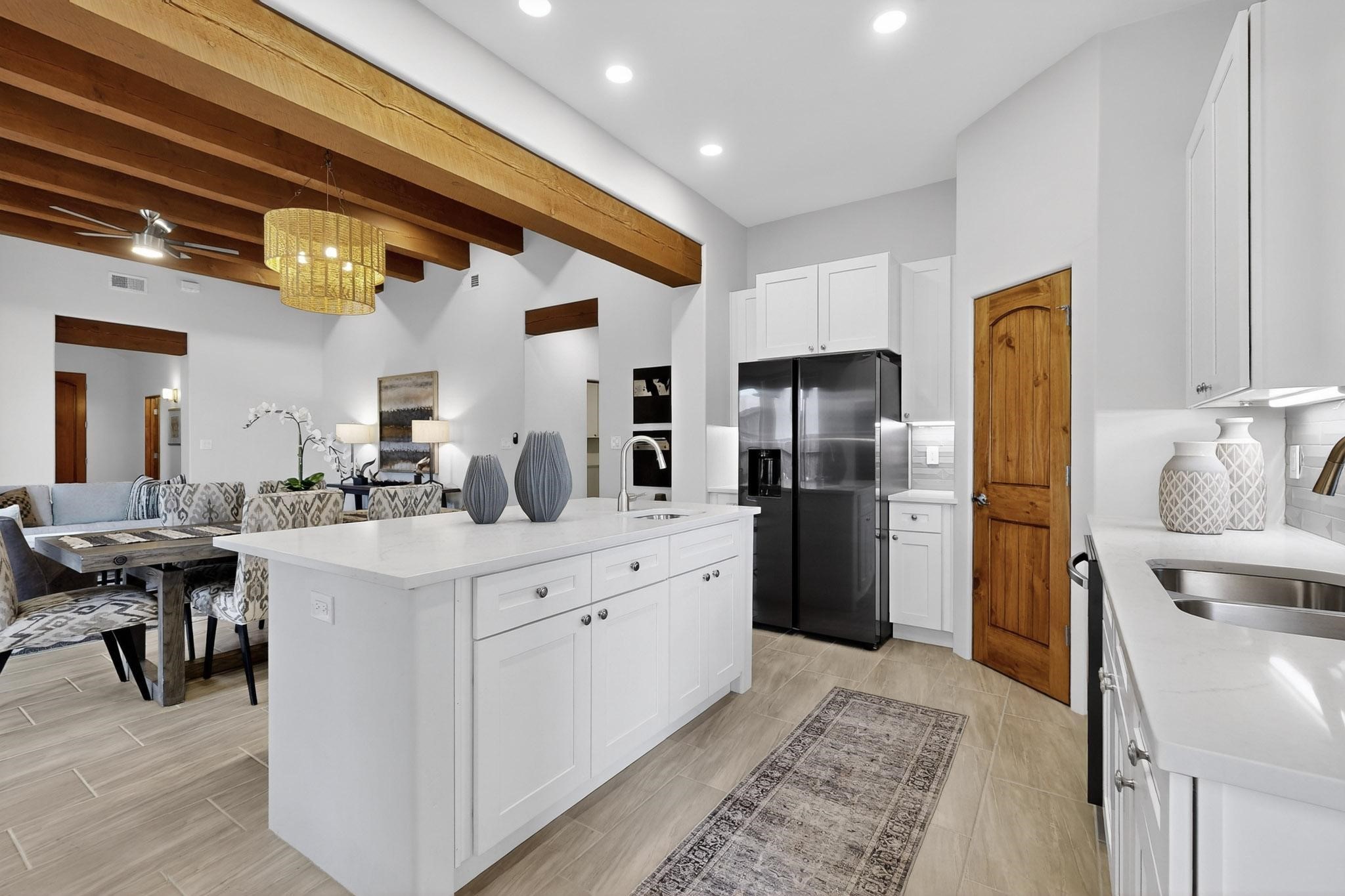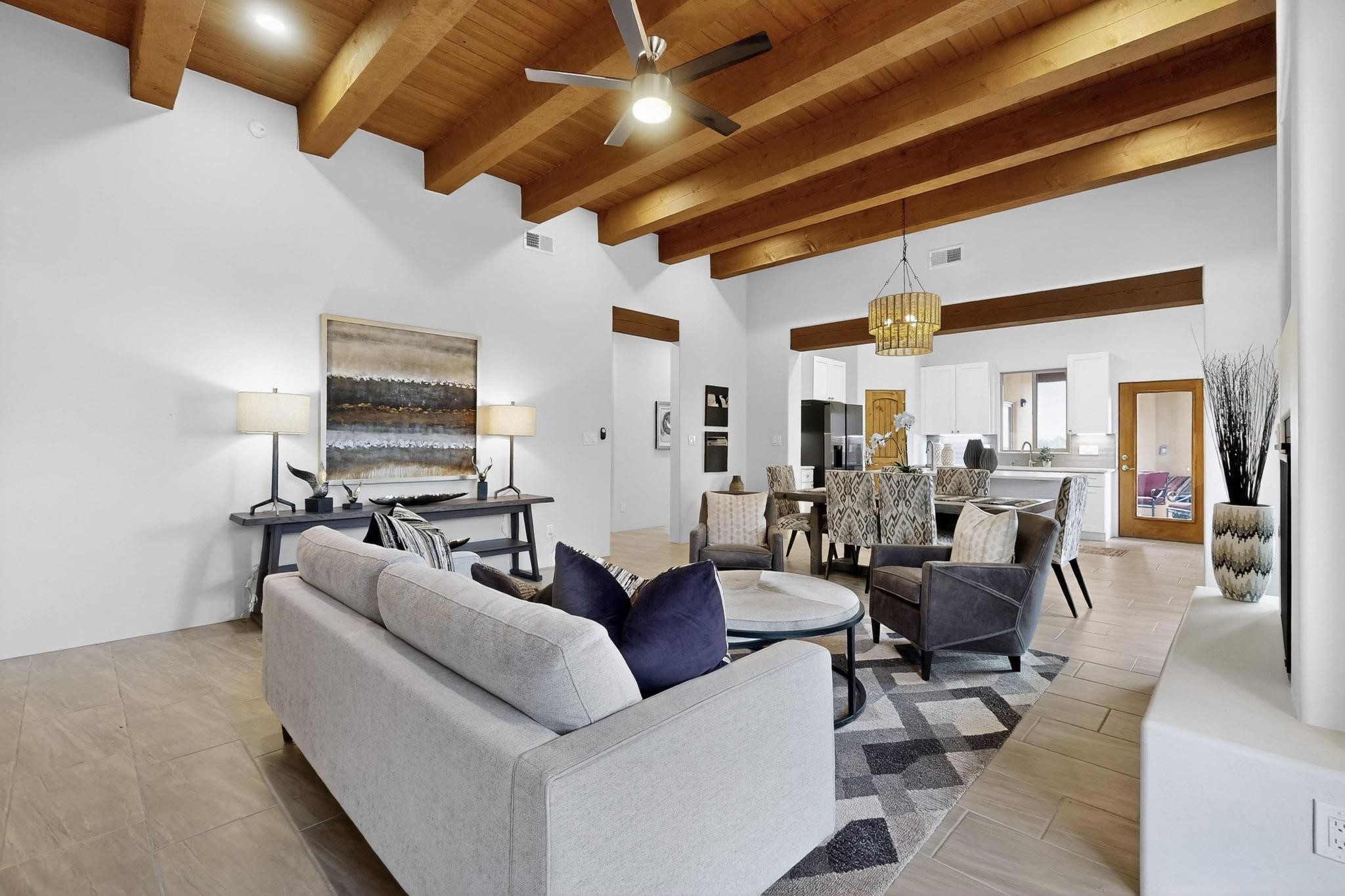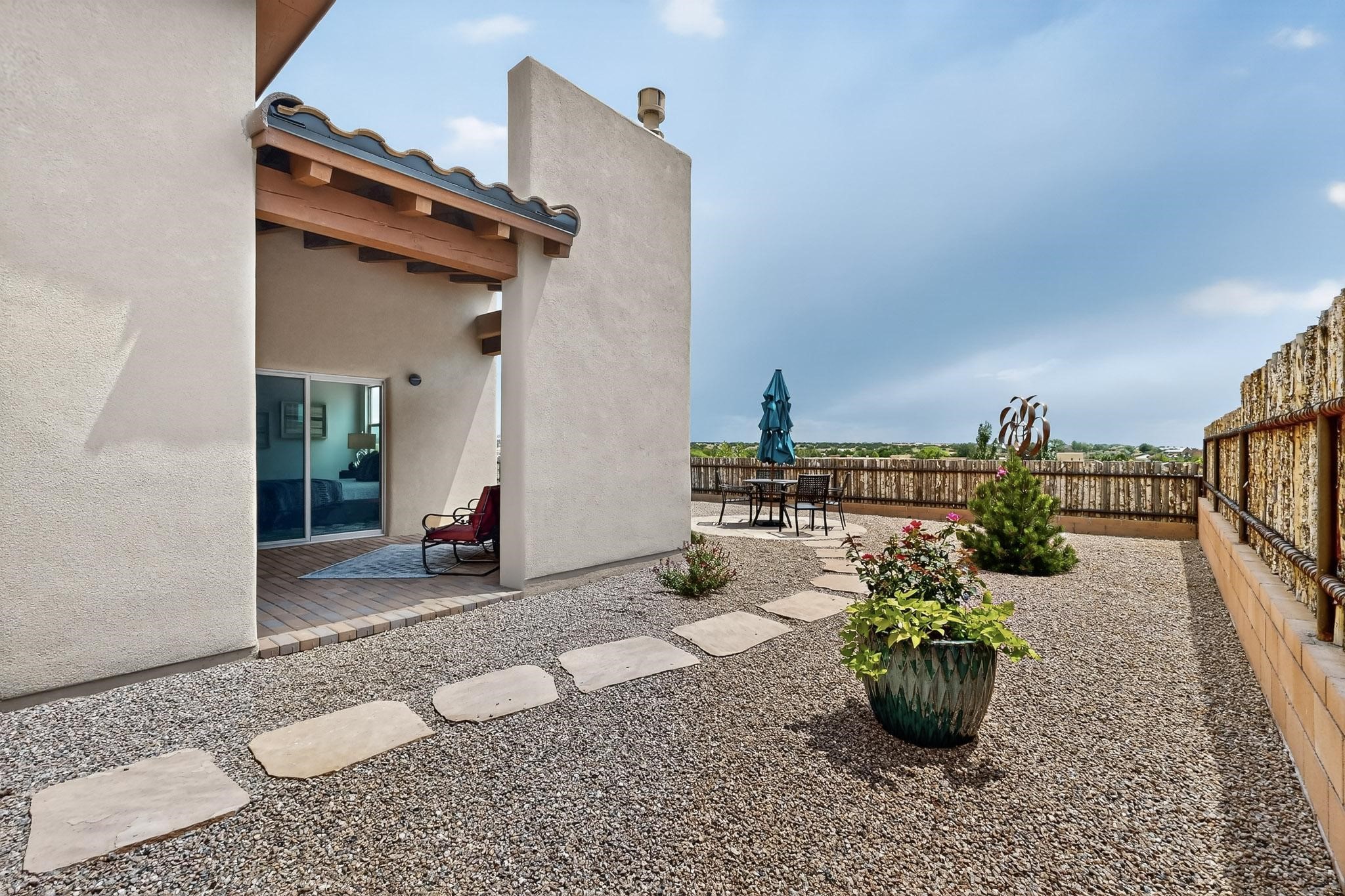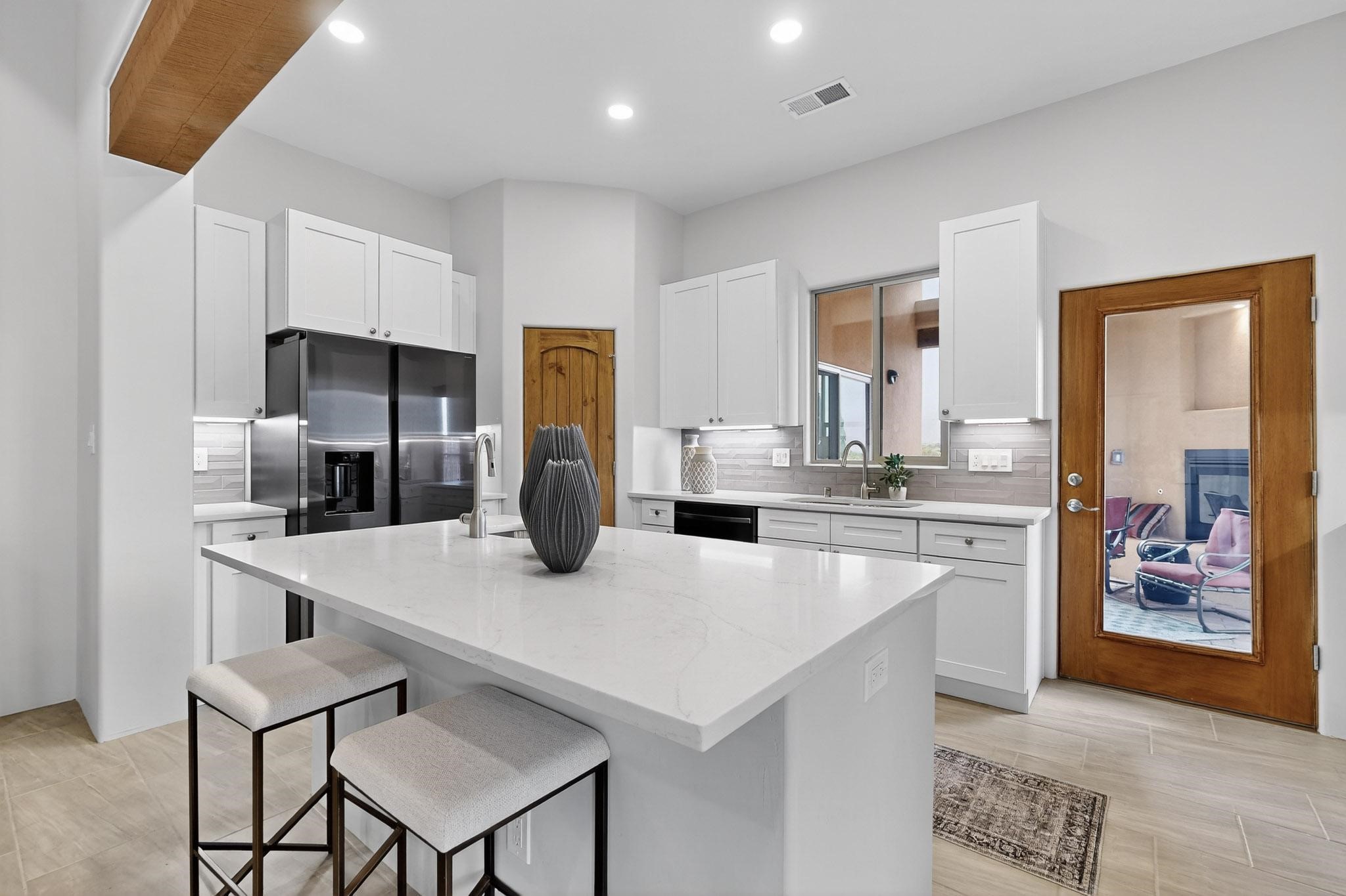 Enjoy breathtaking 180-degree scenic views from this distinctive Santiago Plan with 2239 sq. ft. Located in the La Pradera Subdivision. The property backs up to open space. This residence features three bedrooms and three and a half bathrooms. Each bedroom includes its own ensuite bath. There are three fireplaces throughout the home.Arrive through an impressive 8-foot-tall entry door, stepping into a foyer highlighted by a 13-foot boveda ceiling. To the left, a powder room and an adjacent closet provide convenience, while to the right, a versatile study or bedroom features a cozy gas-fired kiva fireplace. The spacious living room is distinguished by a 12-foot ceiling, rich brown-stained wood beams with tongue-and-groove trim. Porcelain floor tiles in a Bianco-White wood-like style add elegance throughout the home. The open kitchen is equipped with Shaker-White cabinets. The kitchen and the guest bedroom open out to a covered portal with a gas-fireplace and brick pavers, perfect for entertaining or relaxation. The owner's suite features an expansive walk-in closet of approximately 100 square feet. The luxurious bathroom offers a skylight, a spacious walk-in shower with Euro-style fixtures, and an overhead rain shower head. Designed in a classic Spanish style, the home showcases a pitched roof with clay-concrete tiles, covered portals with substantial wood beams, and brick paver accents. The colored stamped concrete driveway enhances the property's curb appeal. The property also boasts a three-car insulated garage with two storage closets and an epoxy-coated floor.