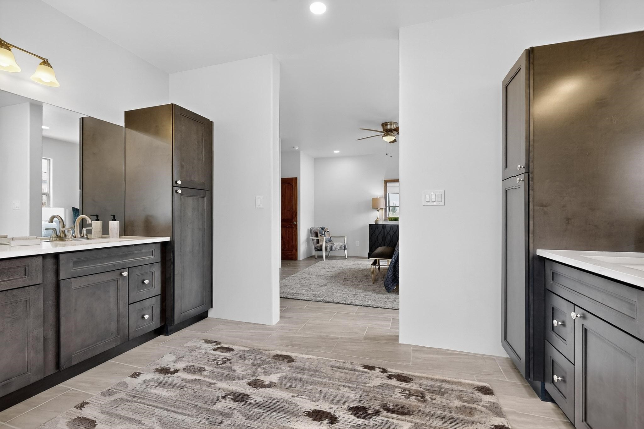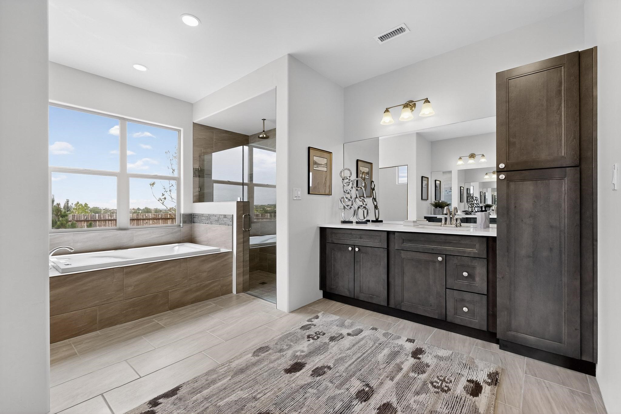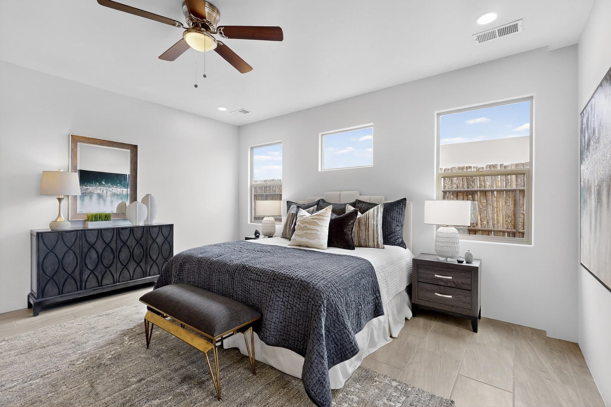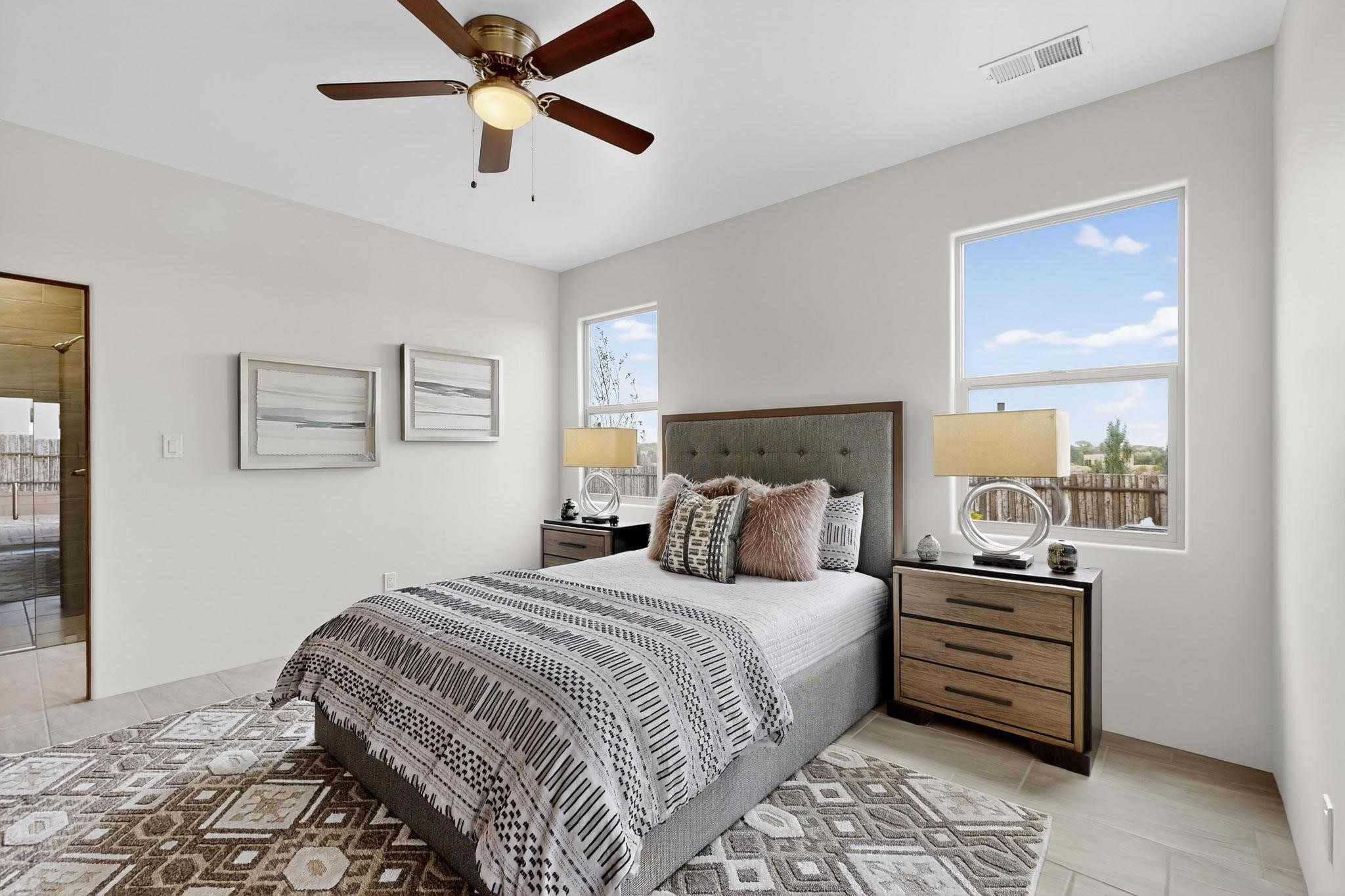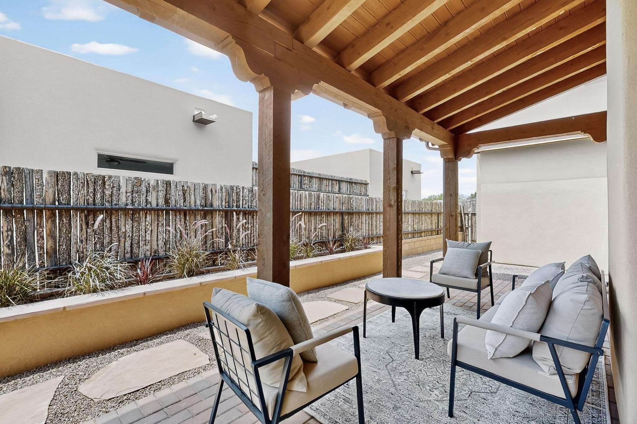 Enjoy breathtaking 180-degree scenic views from this distinctive Santiago Plan with 2239 sq. ft. Located in the La Pradera Subdivision. The property backs up to open space. This residence features three bedrooms and three and a half bathrooms. Each bedroom includes its own ensuite bath. There are three fireplaces throughout the home.Arrive through an impressive 8-foot-tall entry door, stepping into a foyer highlighted by a 13-foot boveda ceiling. To the left, a powder room and an adjacent closet provide convenience, while to the right, a versatile study or bedroom features a cozy gas-fired kiva fireplace. The spacious living room is distinguished by a 12-foot ceiling, rich brown-stained wood beams with tongue-and-groove trim. Porcelain floor tiles in a Bianco-White wood-like style add elegance throughout the home. The open kitchen is equipped with Shaker-White cabinets. The kitchen and the guest bedroom open out to a covered portal with a gas-fireplace and brick pavers, perfect for entertaining or relaxation. The owner's suite features an expansive walk-in closet of approximately 100 square feet. The luxurious bathroom offers a skylight, a spacious walk-in shower with Euro-style fixtures, and an overhead rain shower head. Designed in a classic Spanish style, the home showcases a pitched roof with clay-concrete tiles, covered portals with substantial wood beams, and brick paver accents. The colored stamped concrete driveway enhances the property's curb appeal. The property also boasts a three-car insulated garage with two storage closets and an epoxy-coated floor.